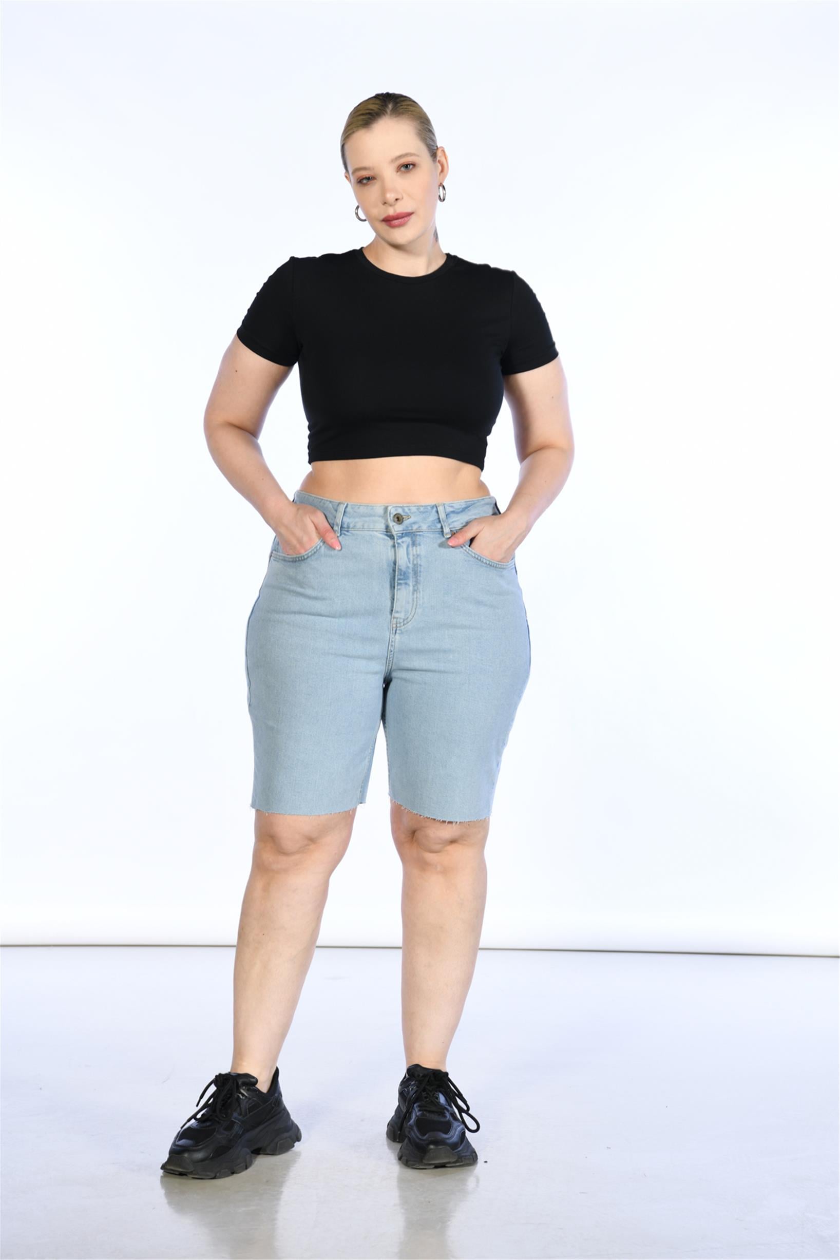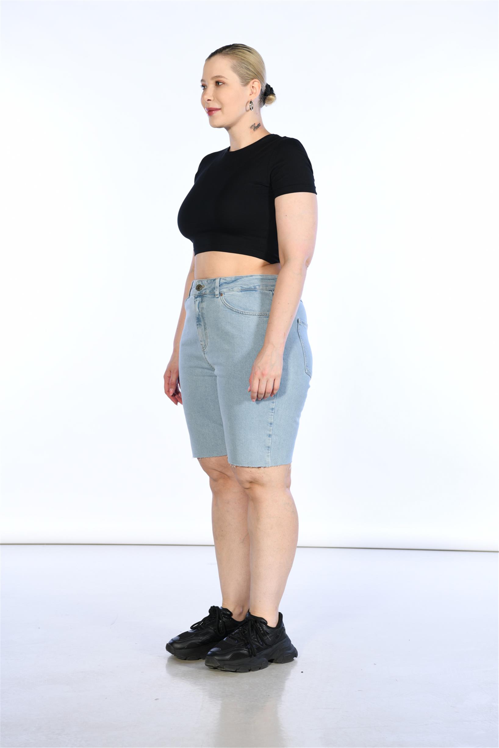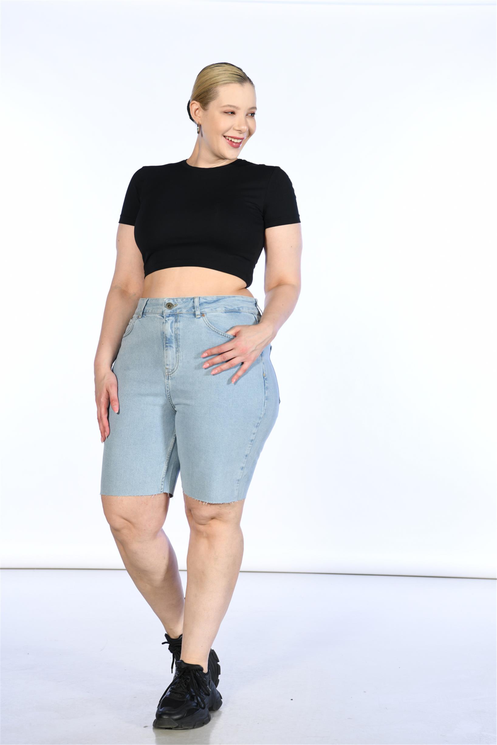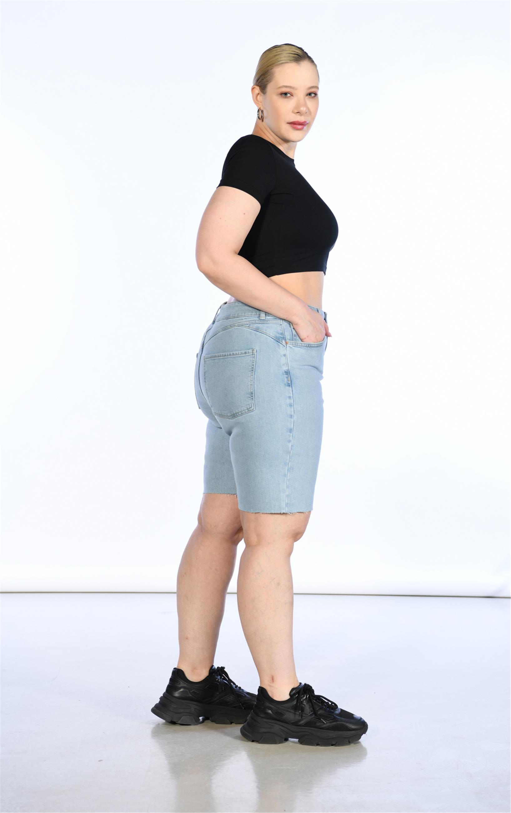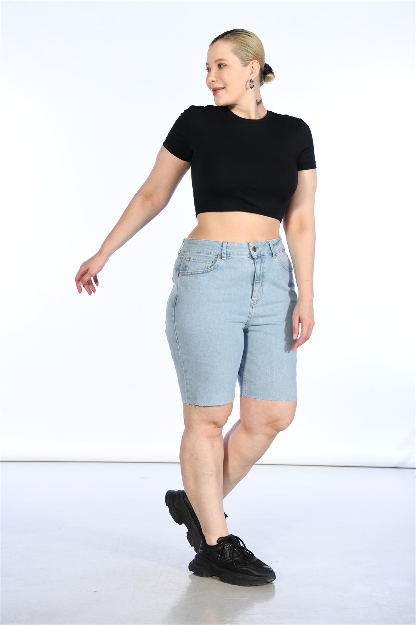 Büyük Beden Mavi Yüksek Bel Bermuda Kot Şort