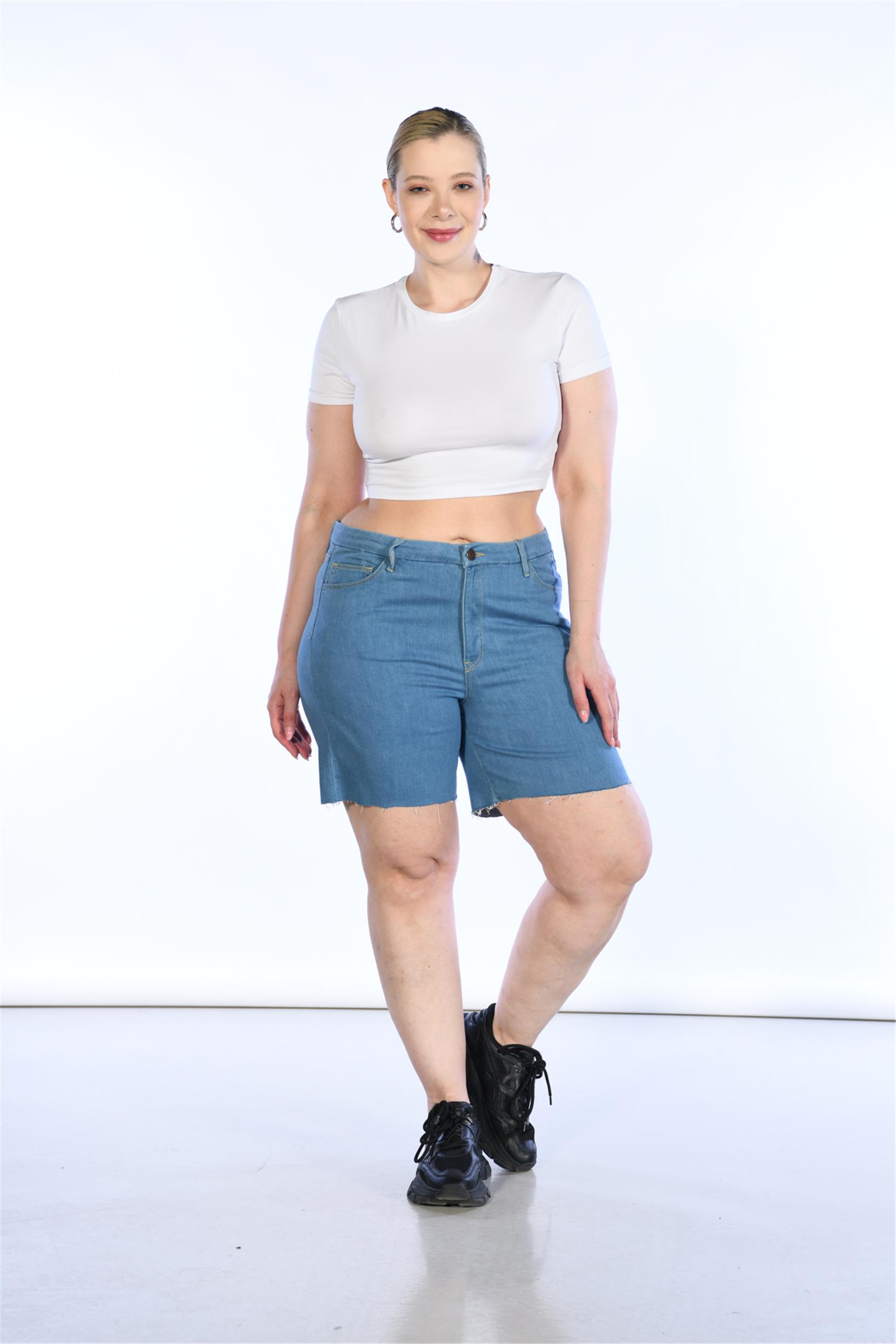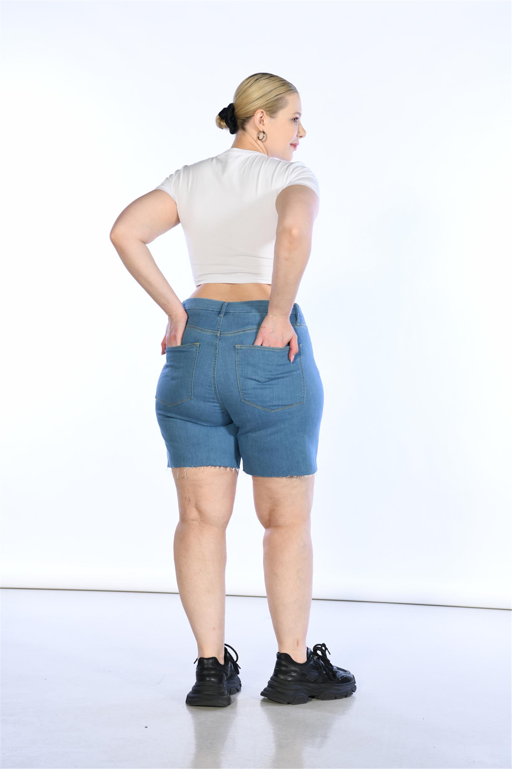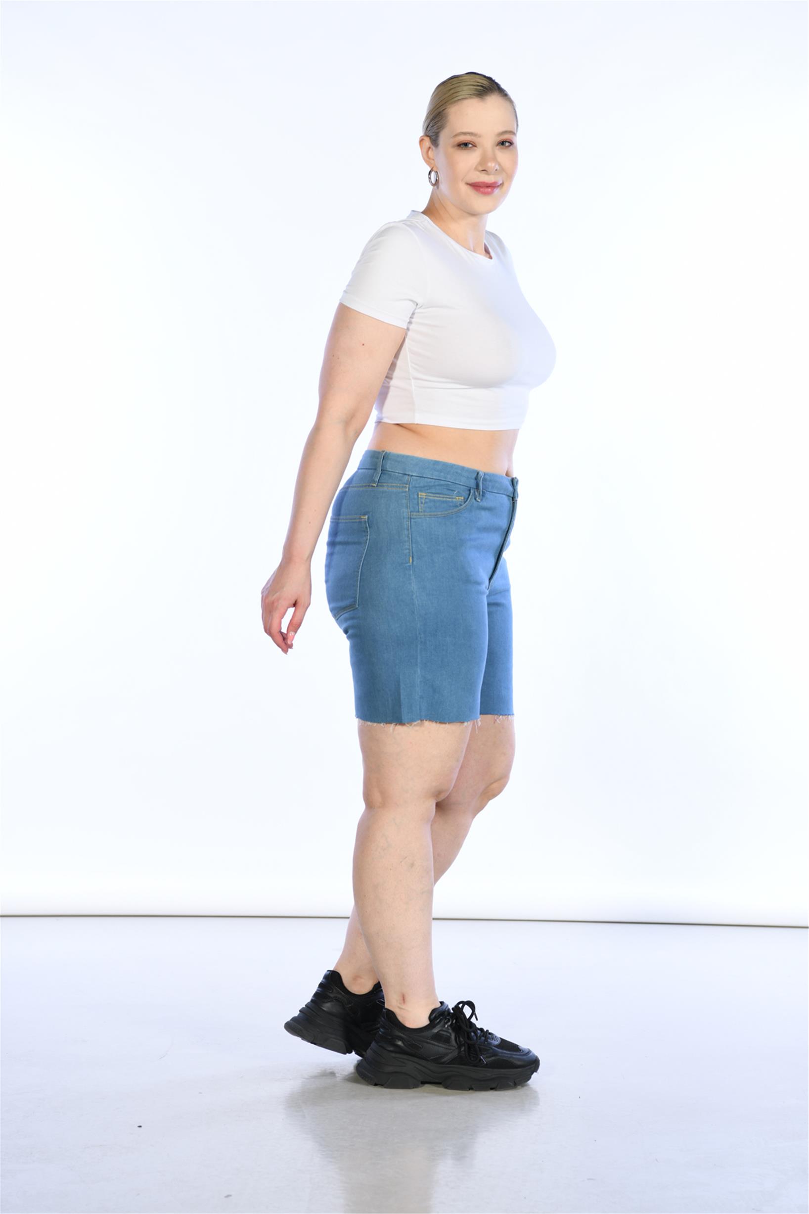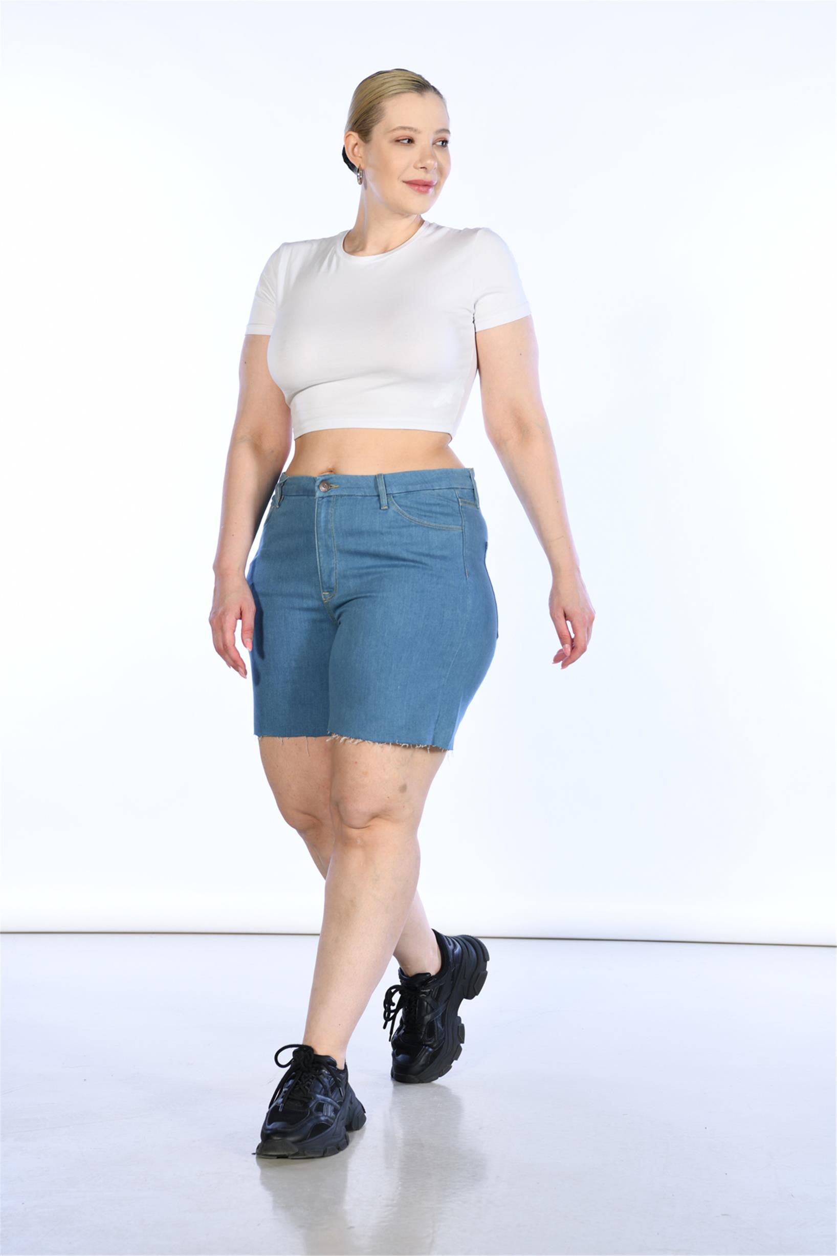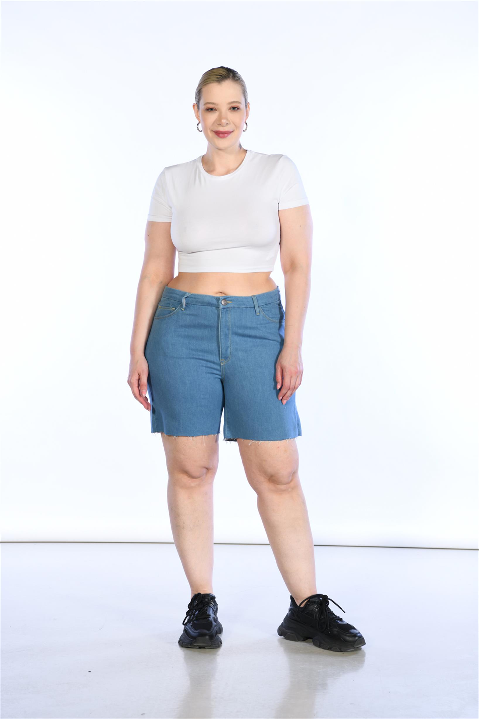 Büyük Beden Mavi Yüksek Bel Bermuda Kot Şort