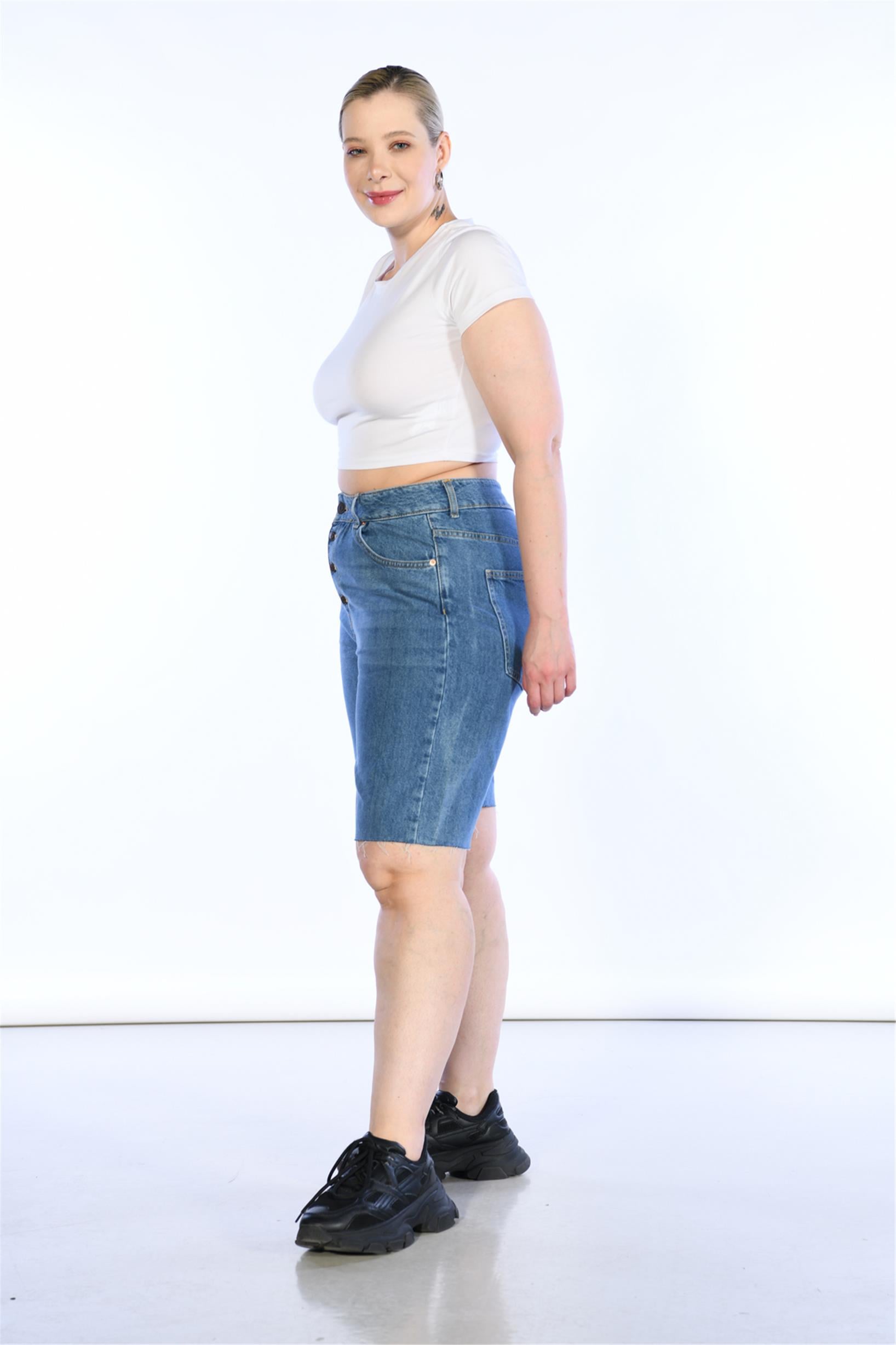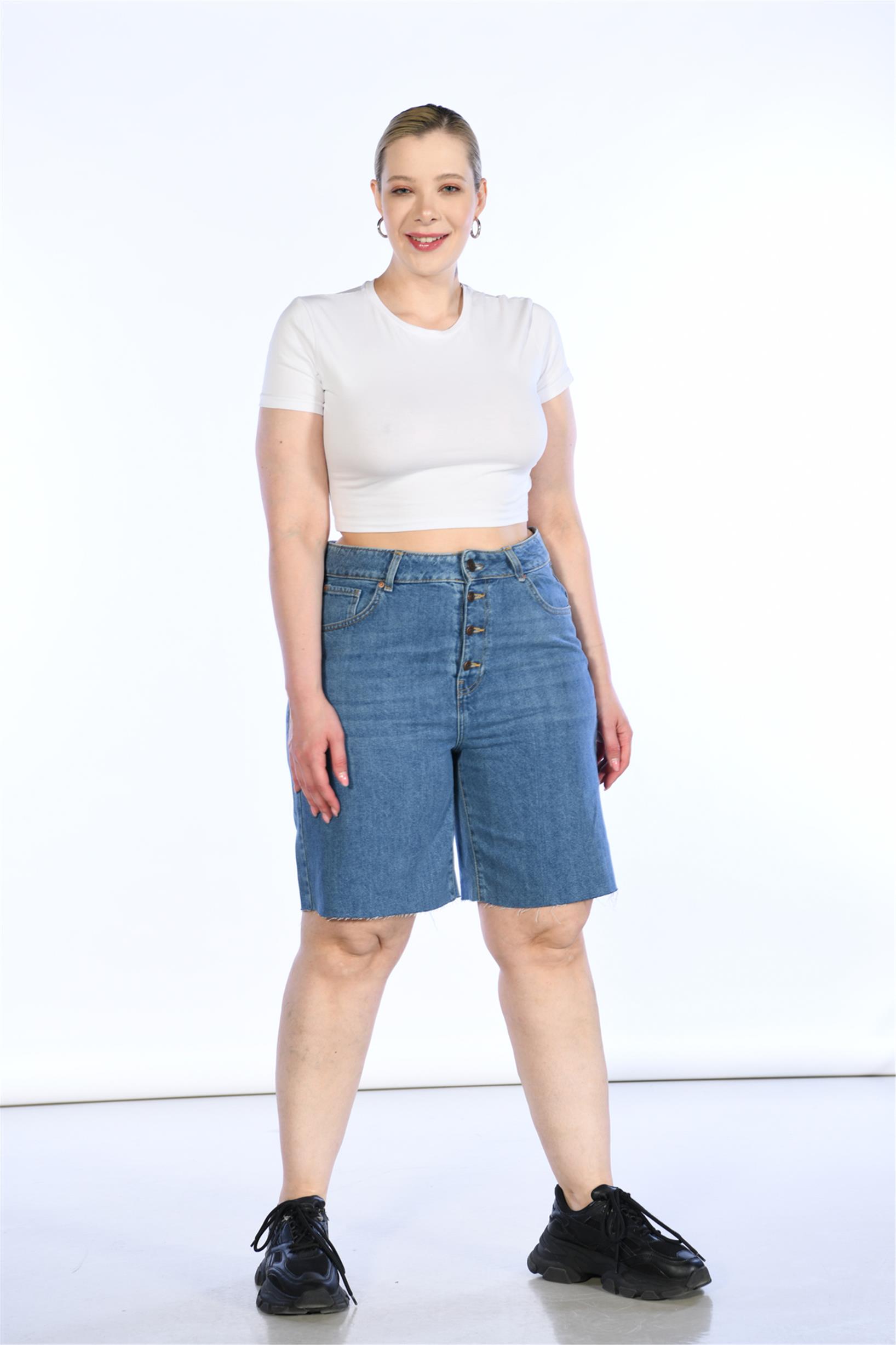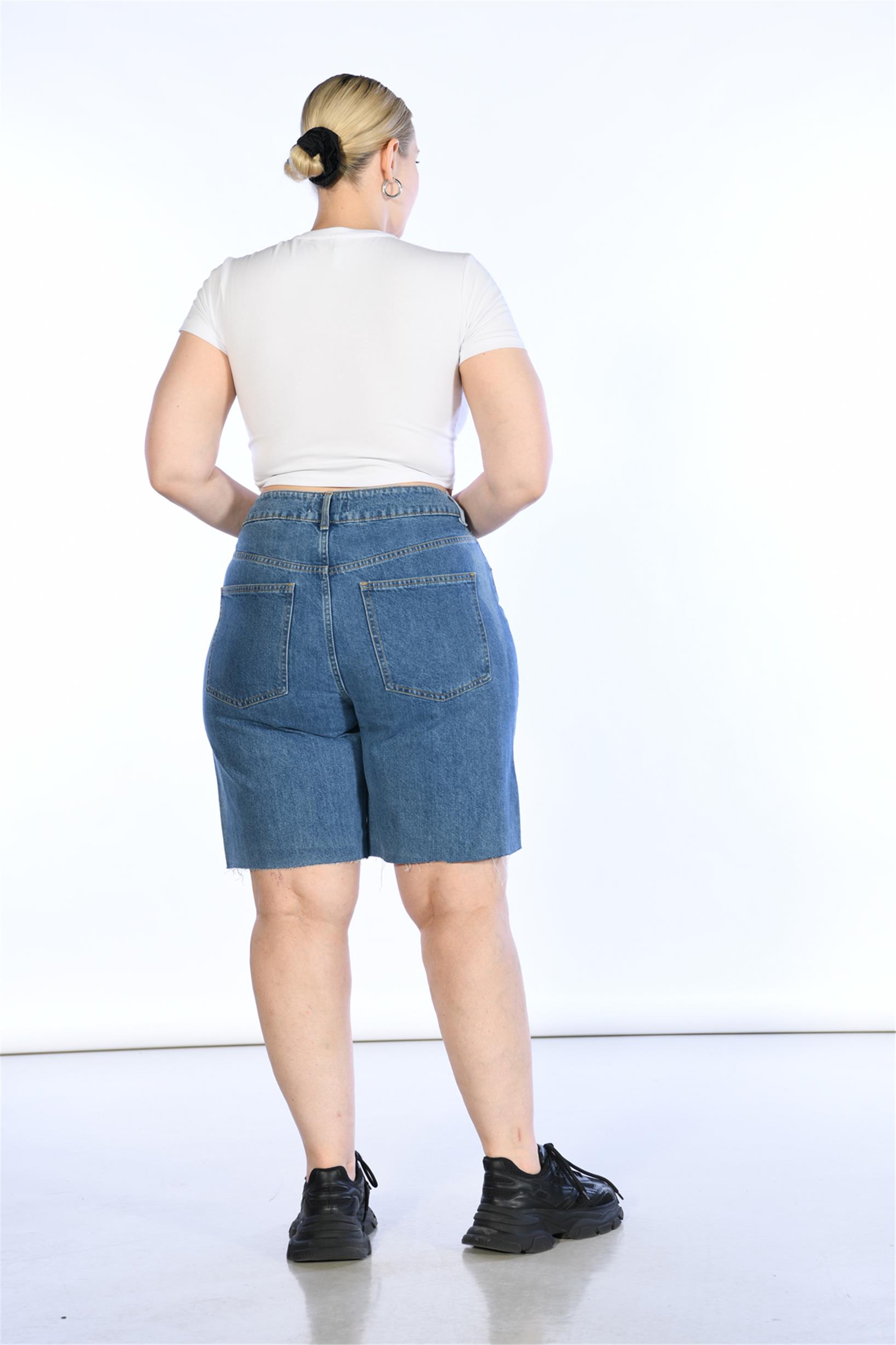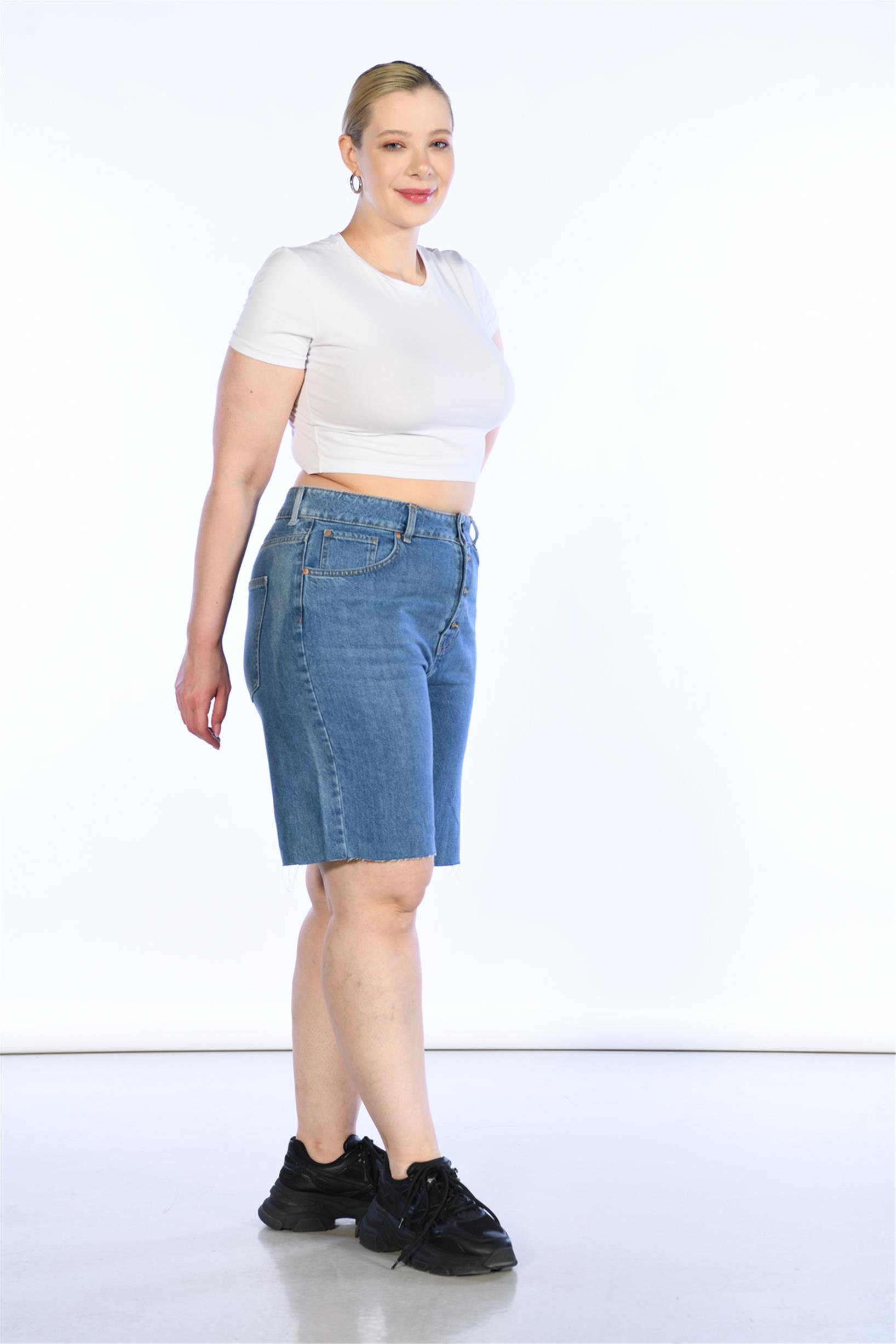 Büyük Beden Mavi Yüksek Bel Bermuda Kot Şort