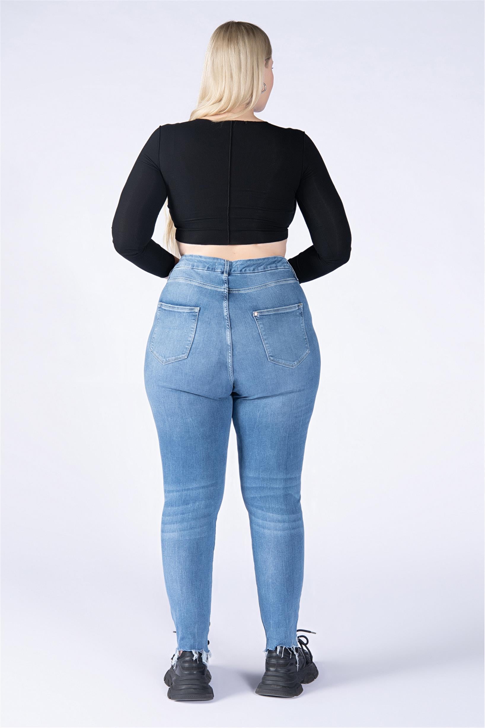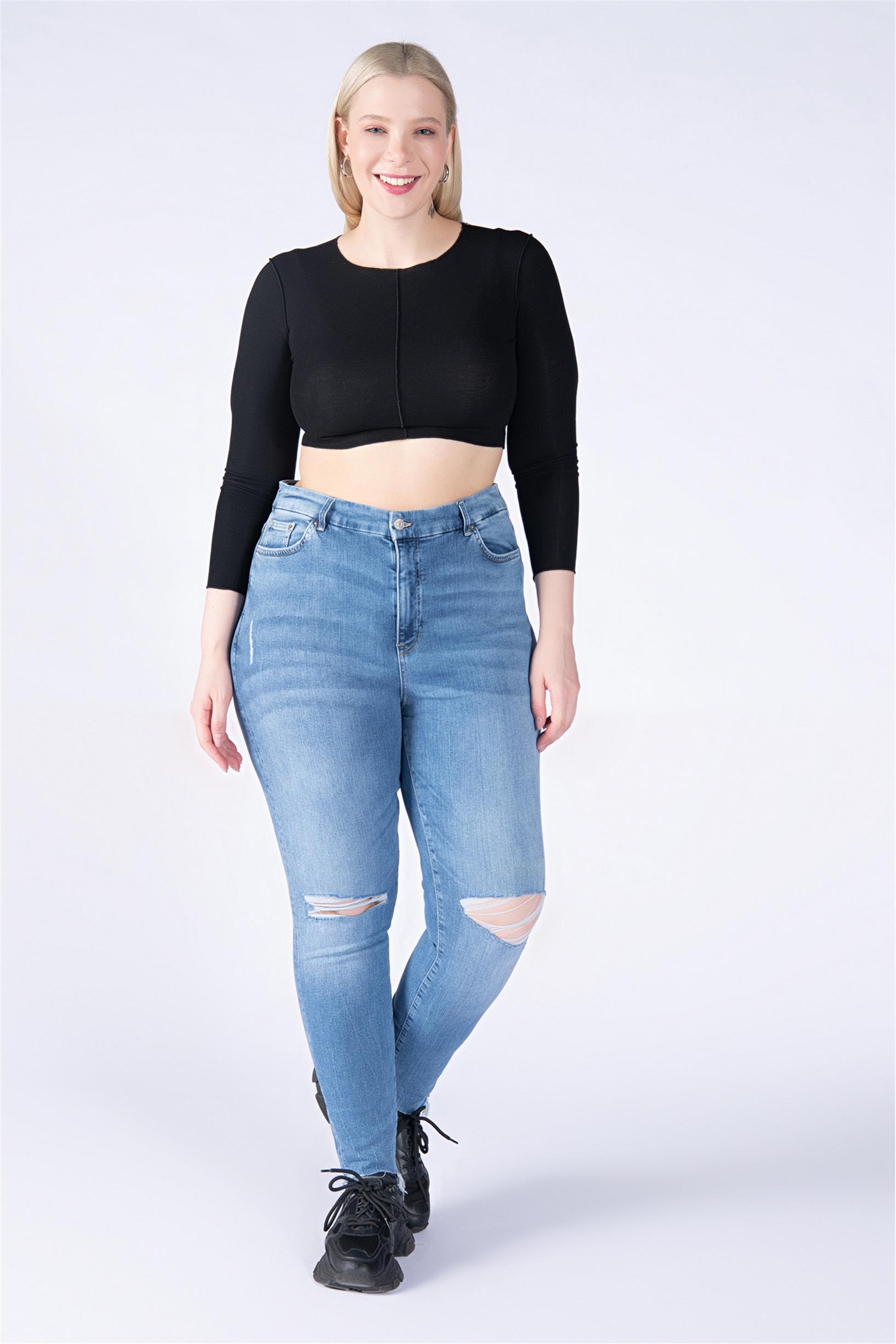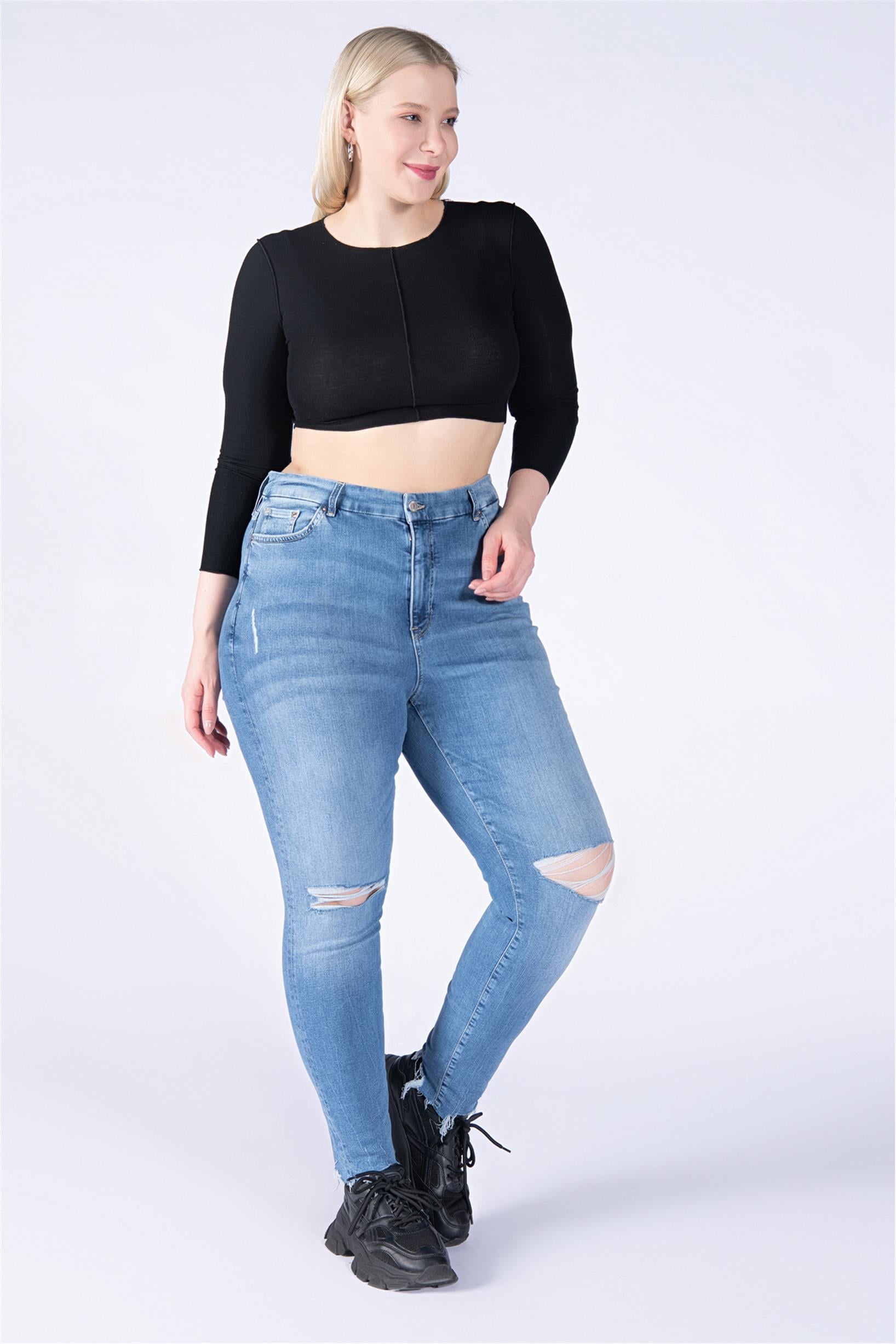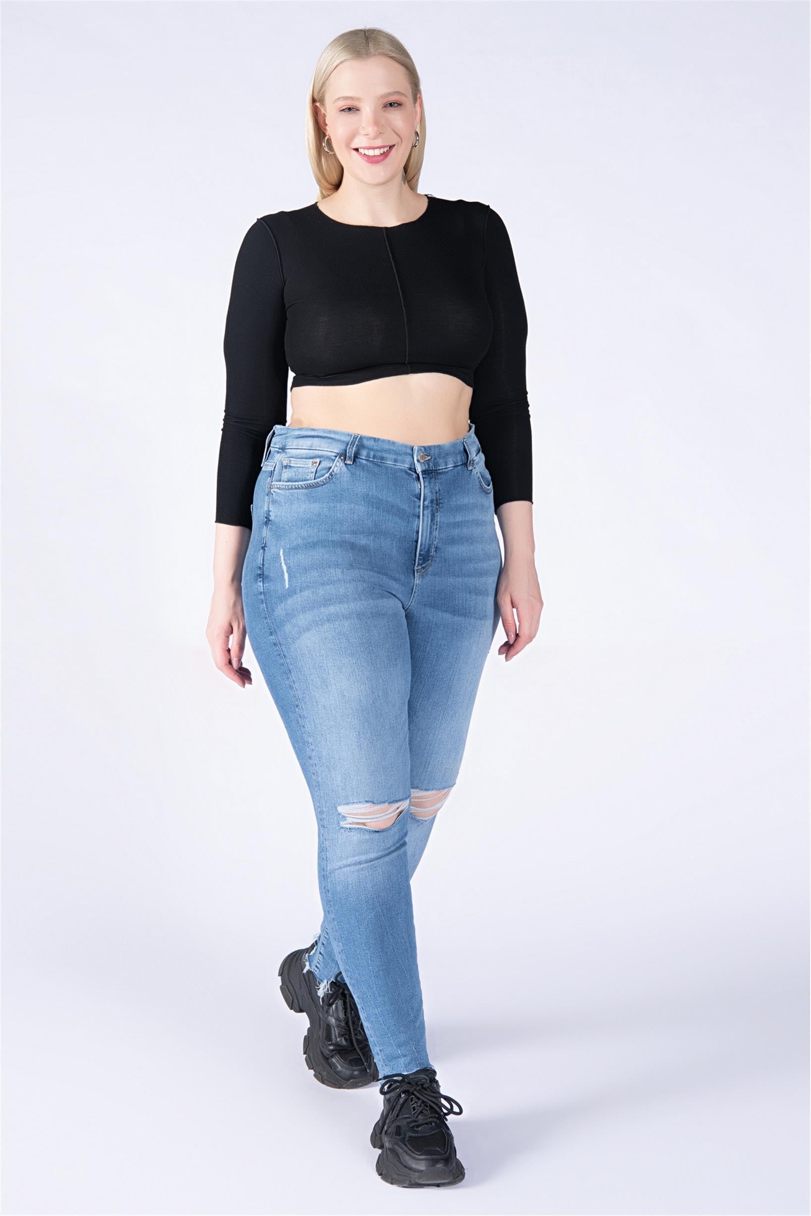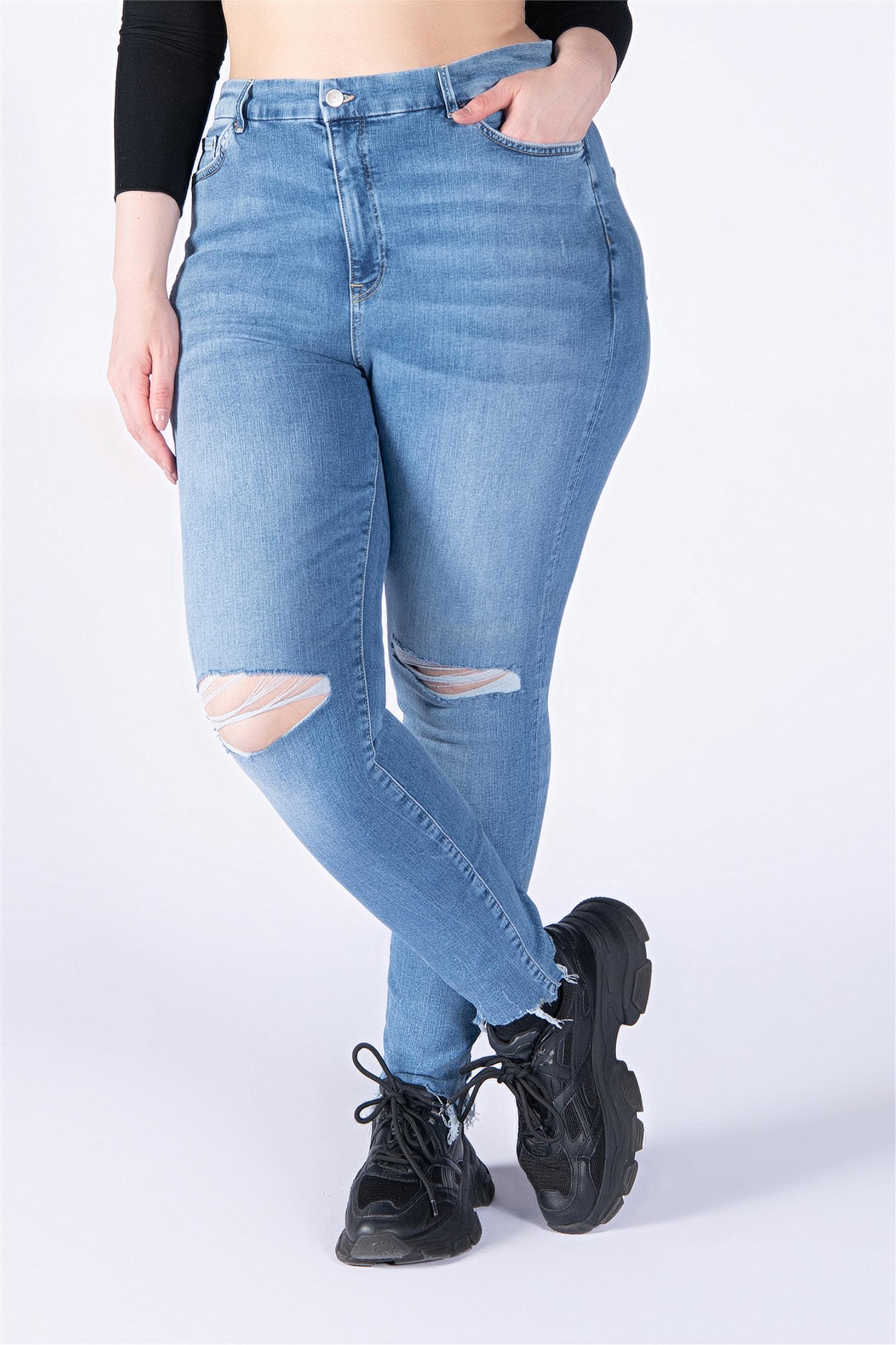 Büyük Beden Mavi Yüksek Bel Diz Lazer Skinny Jeans