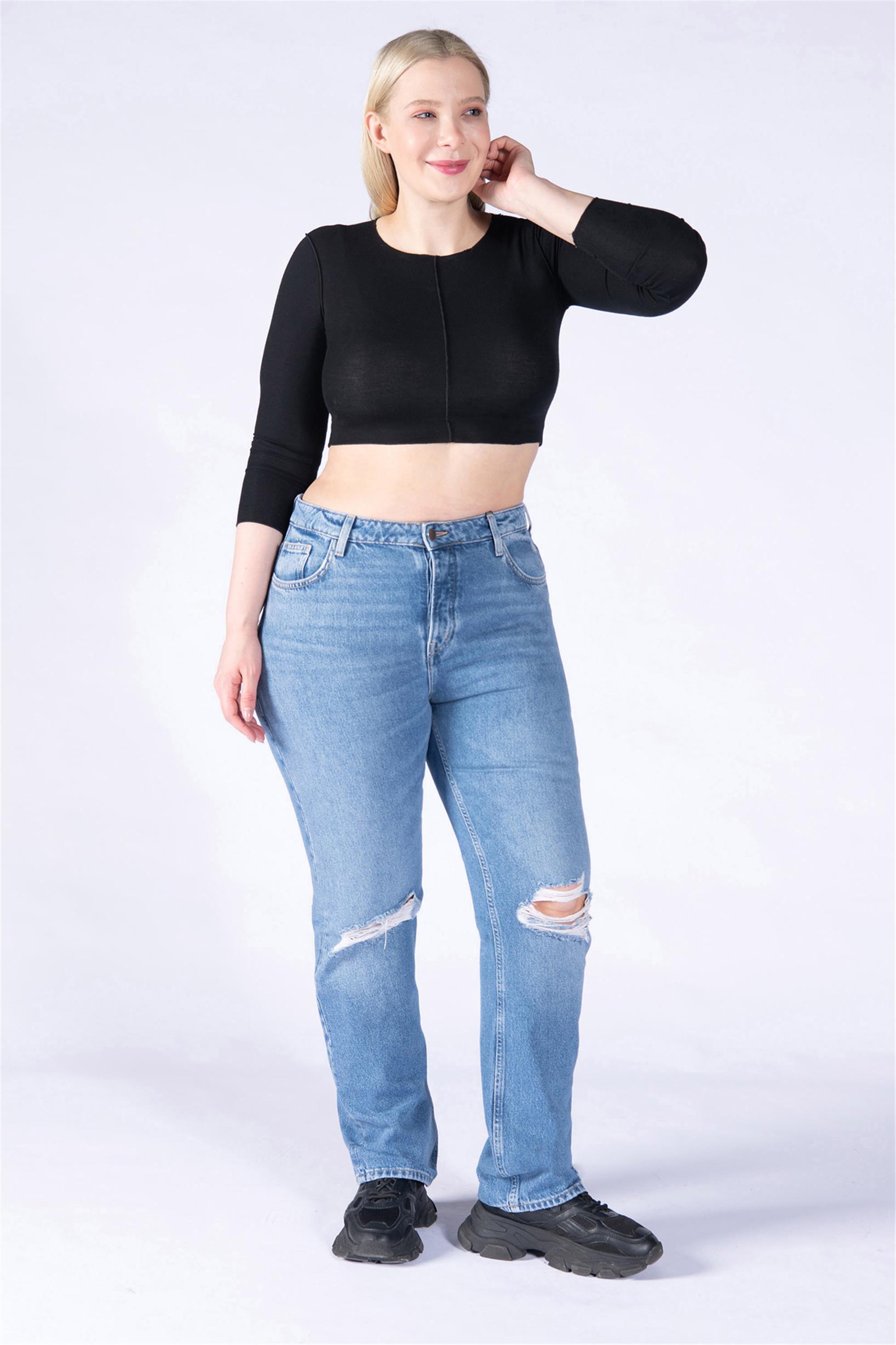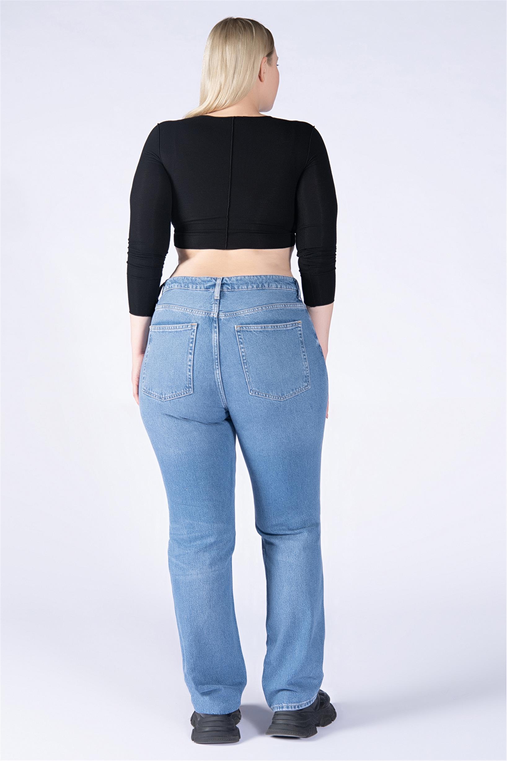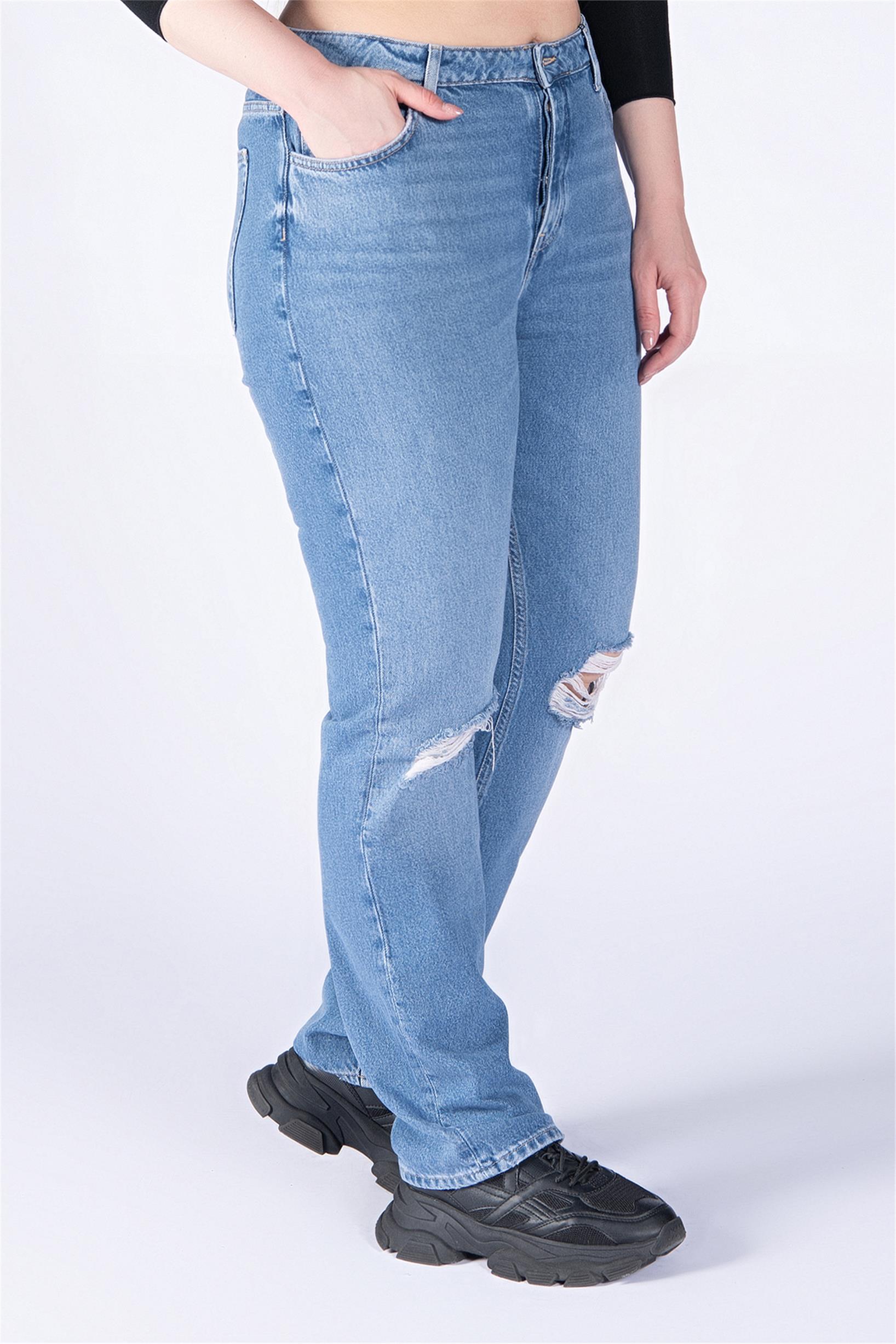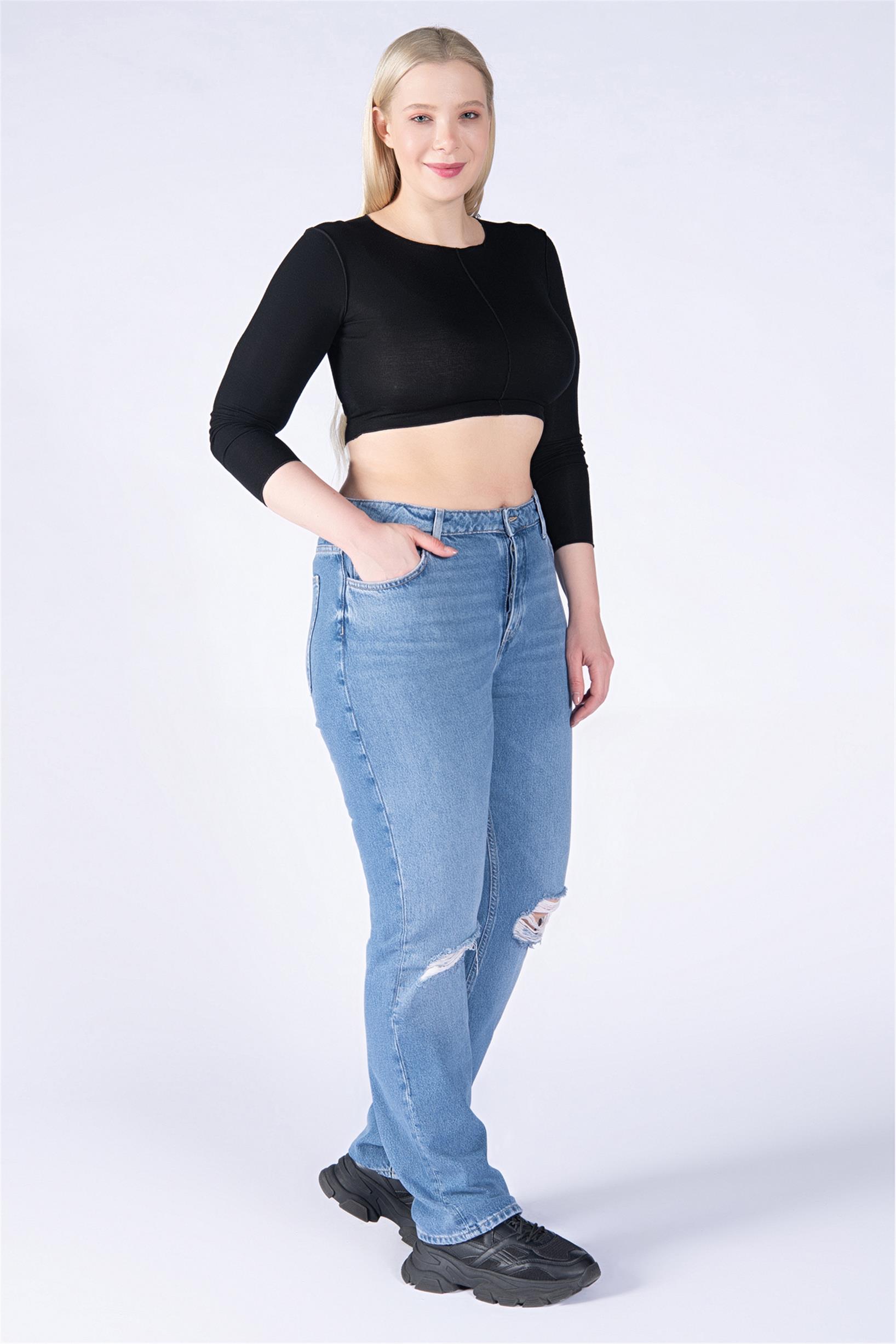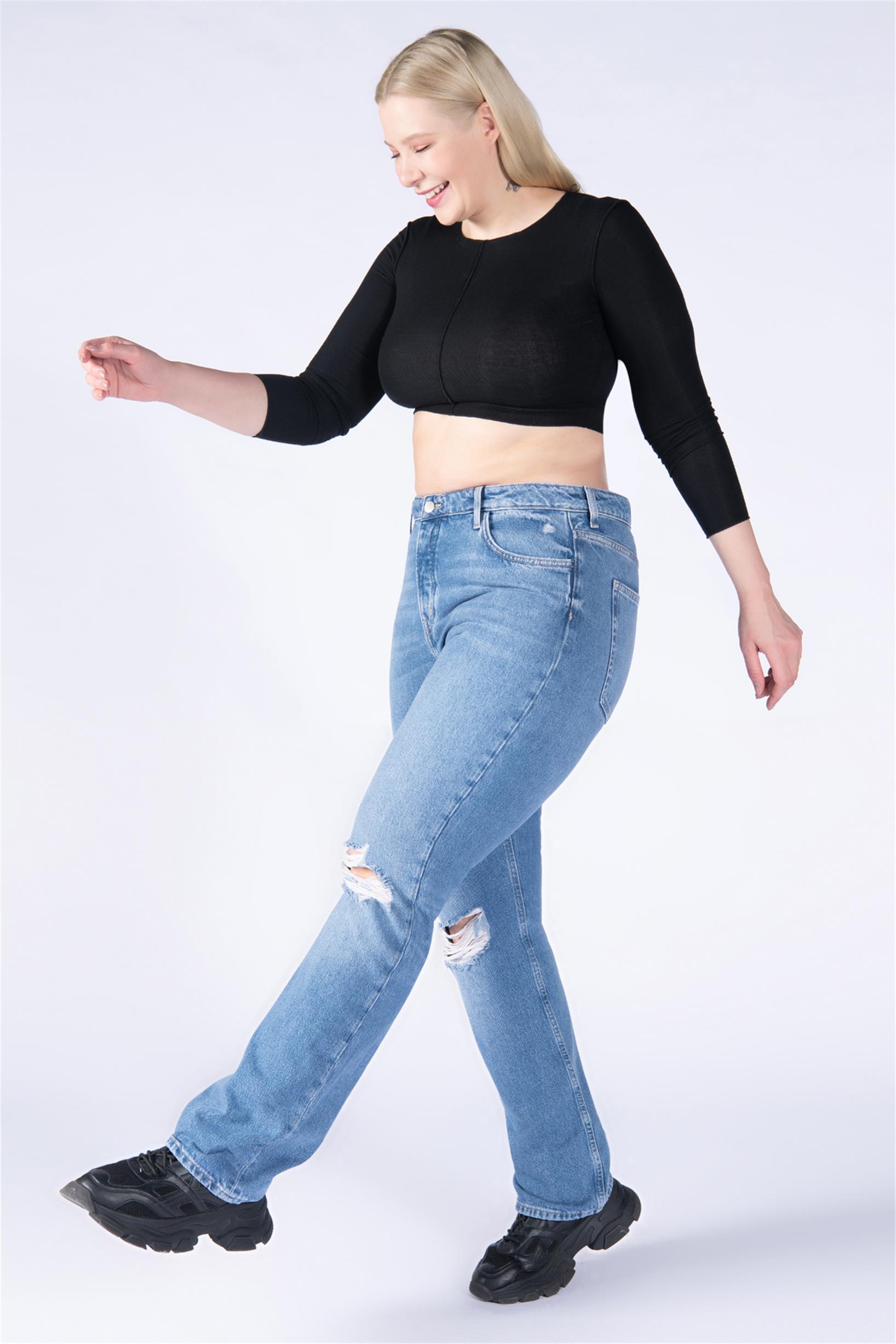Büyük Beden Mavi Yüksek Bel Diz Lazer Straight Jeans