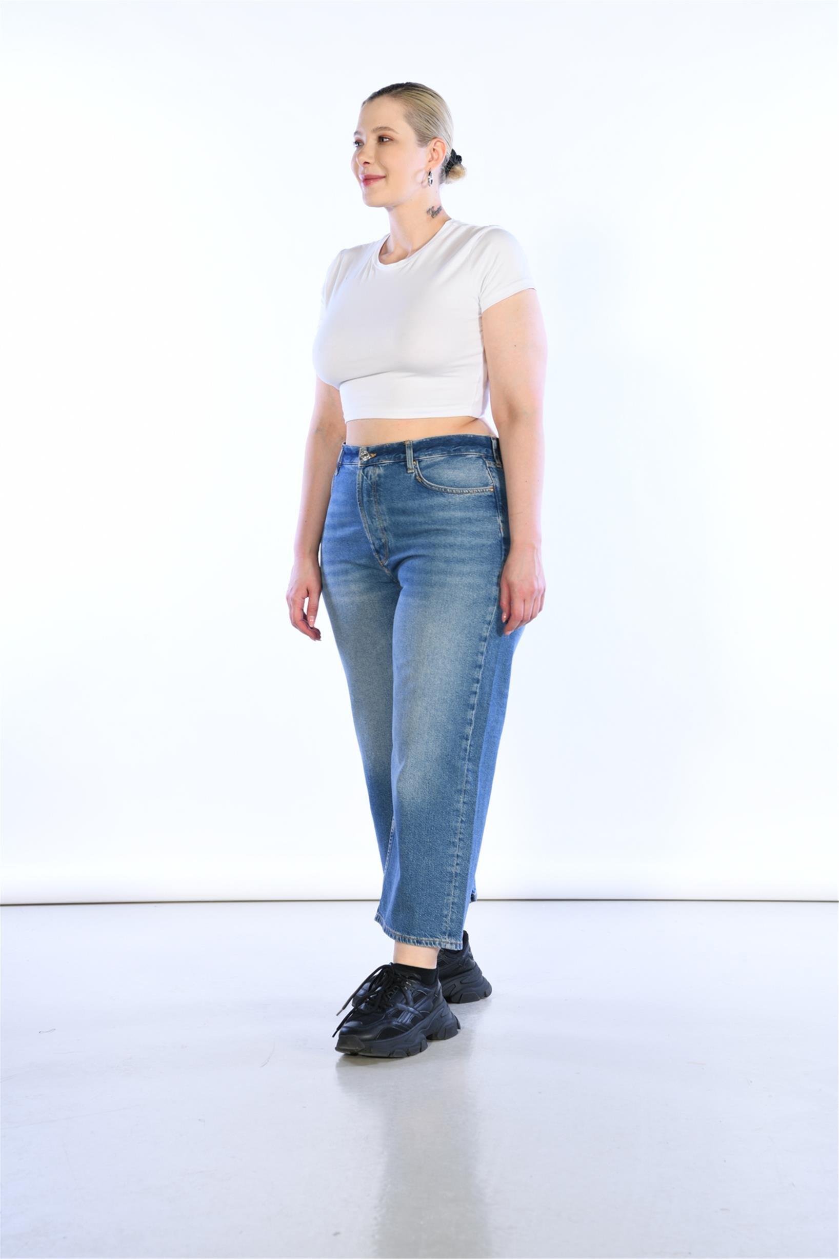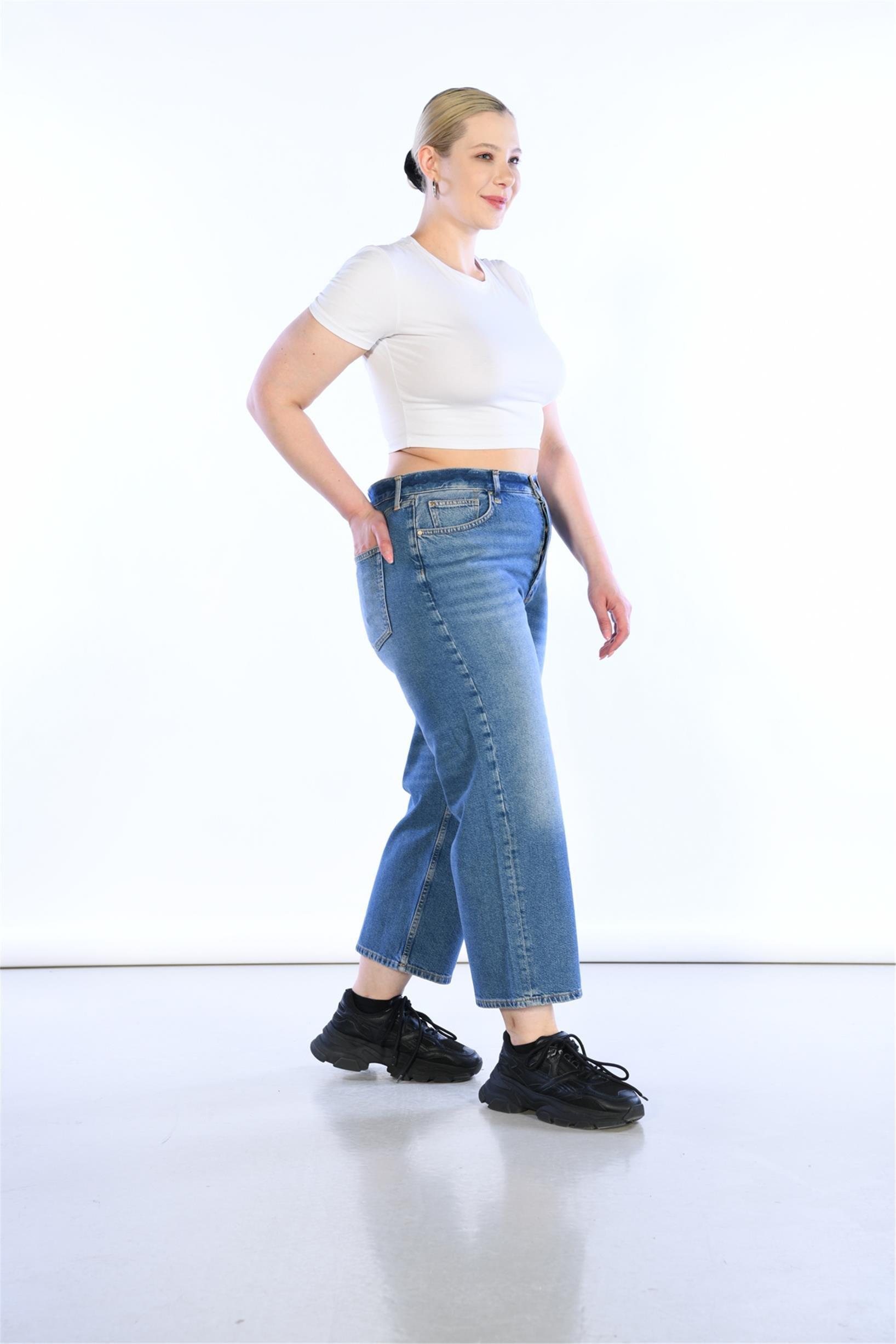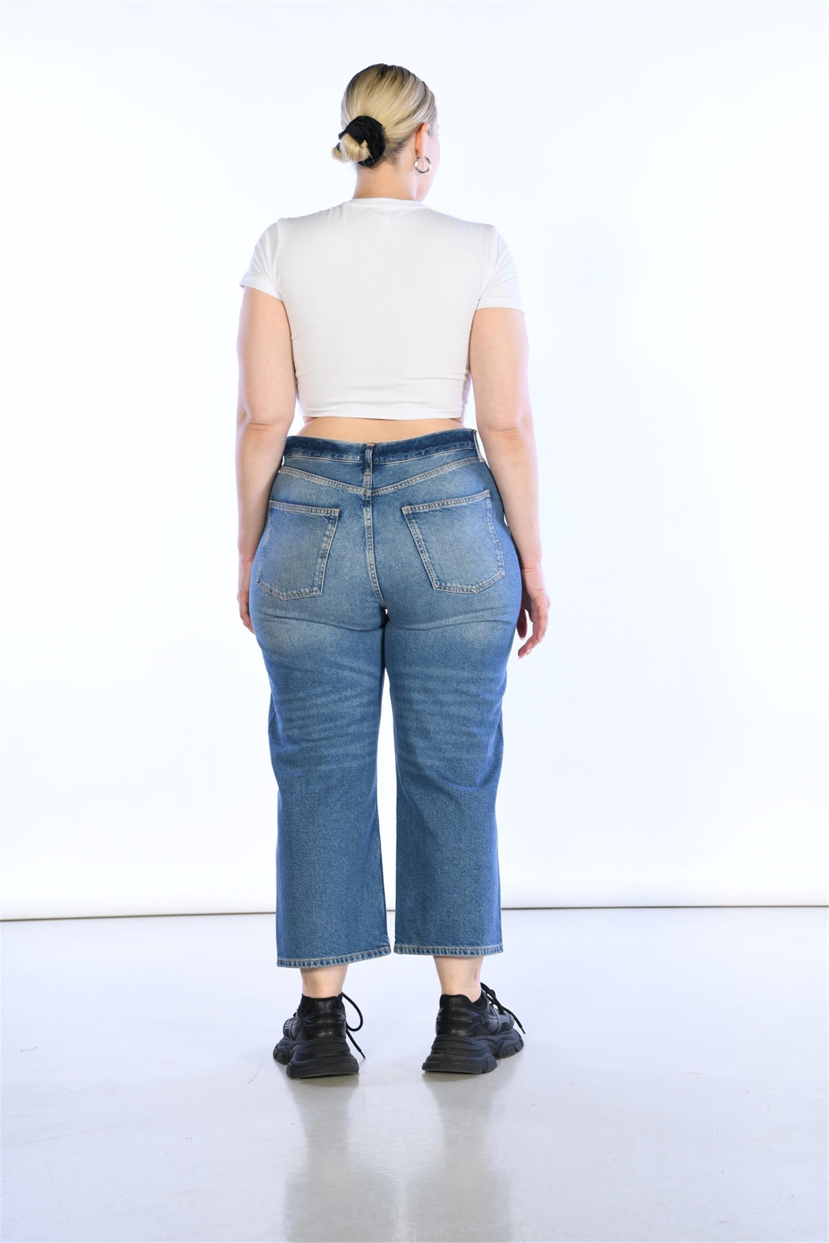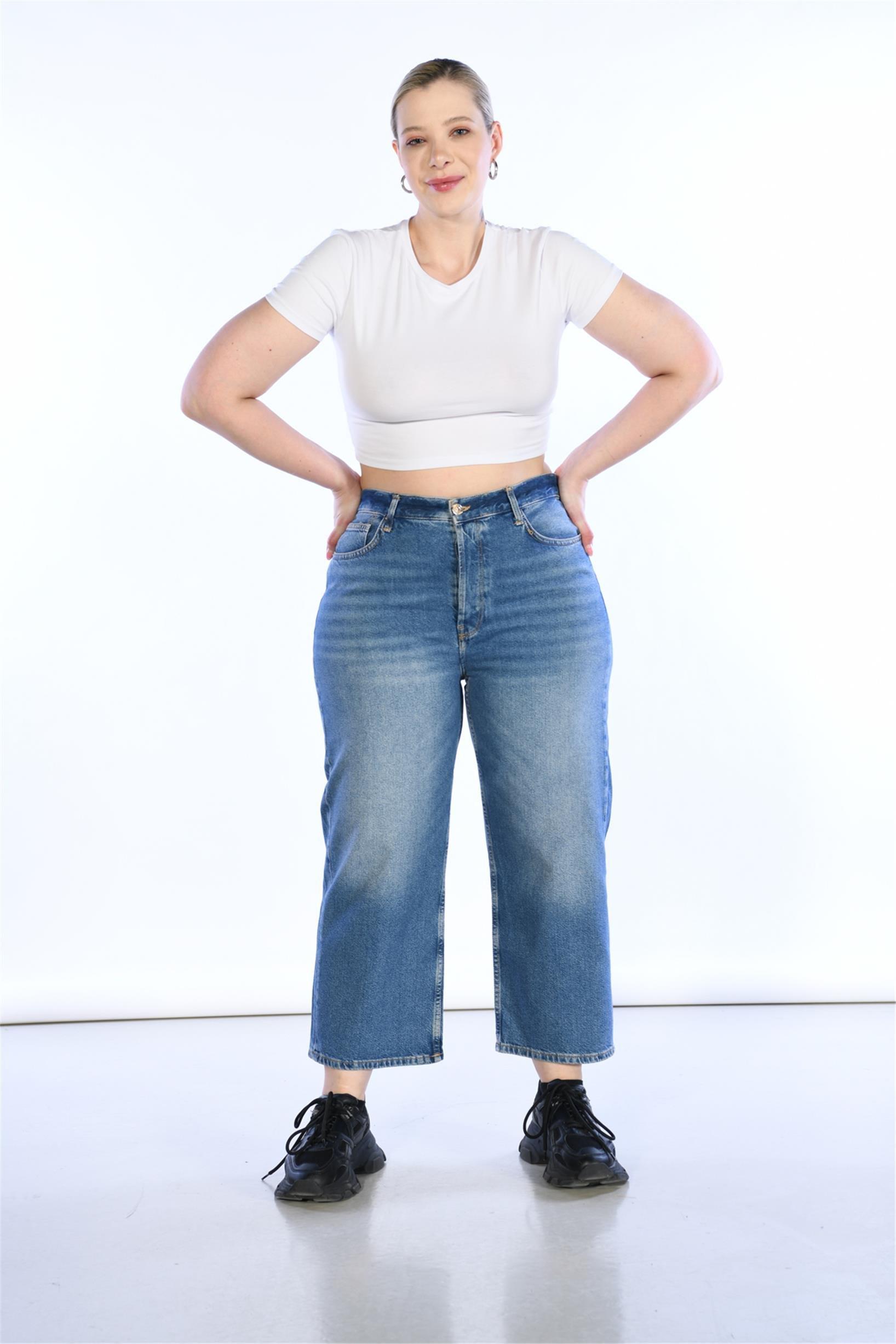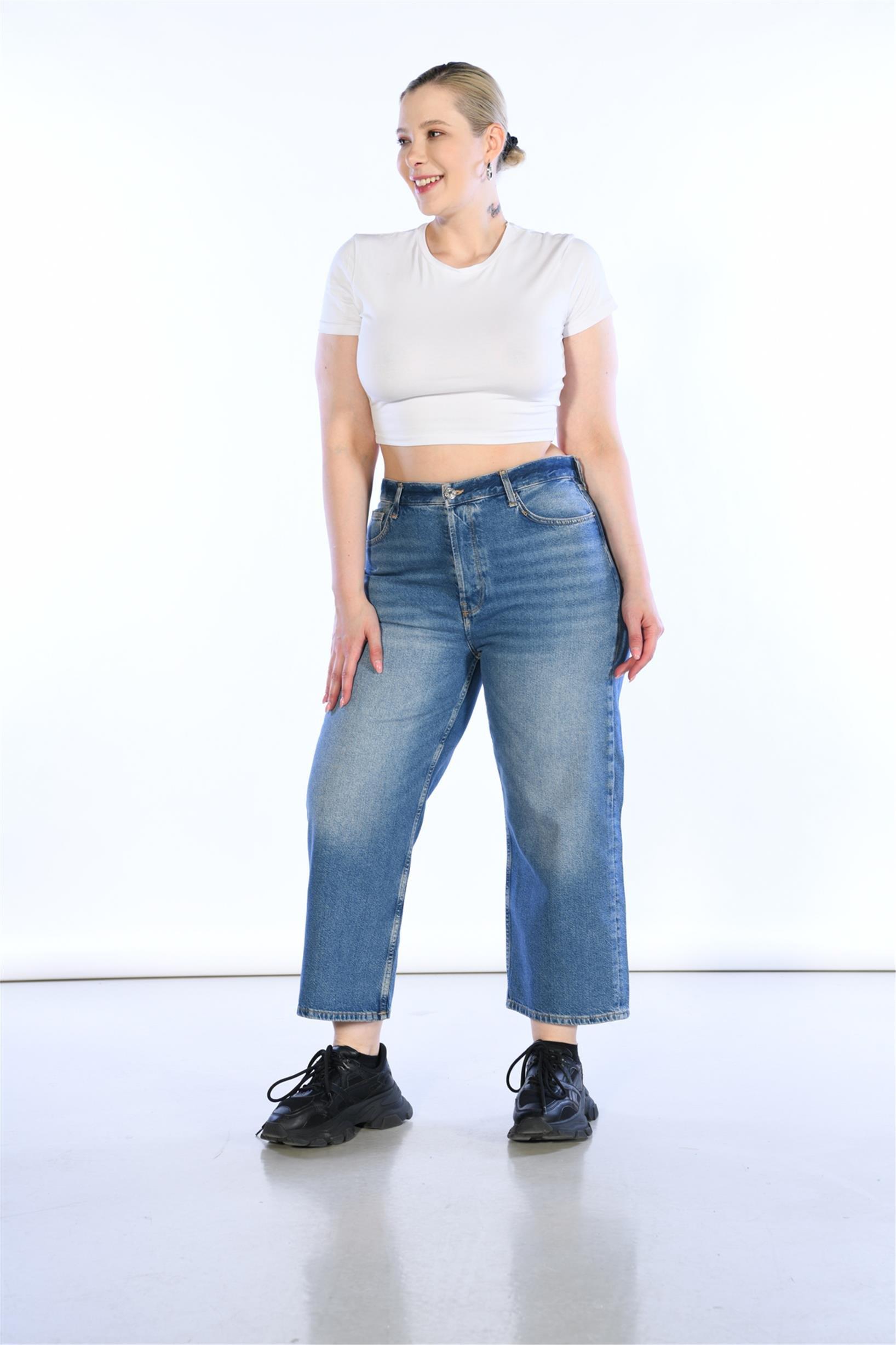 Büyük Beden Mavi Yüksek Bel Wideleg Jeans