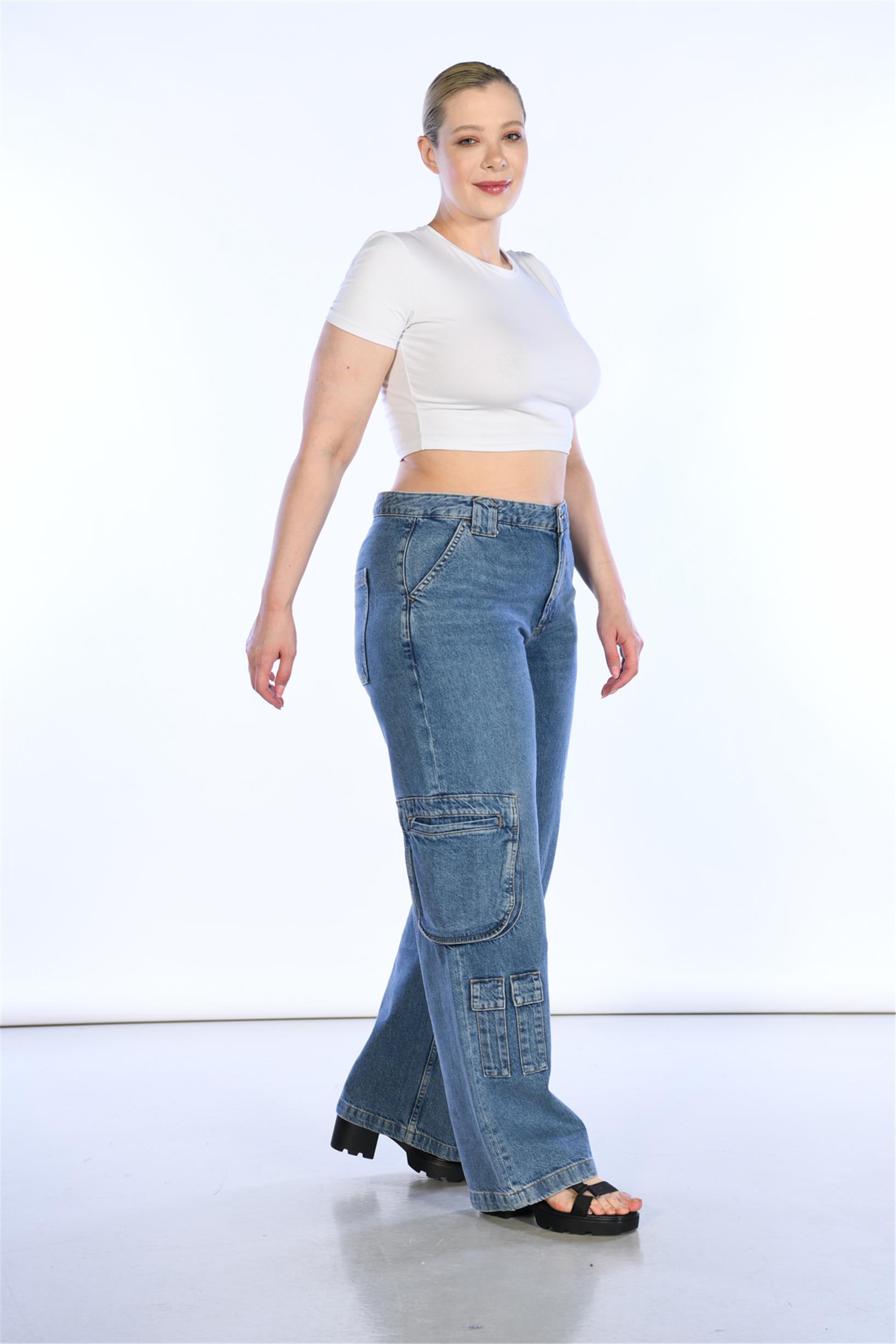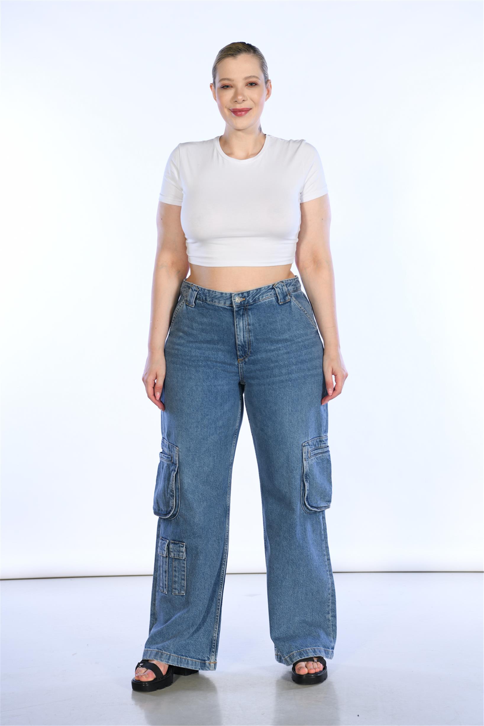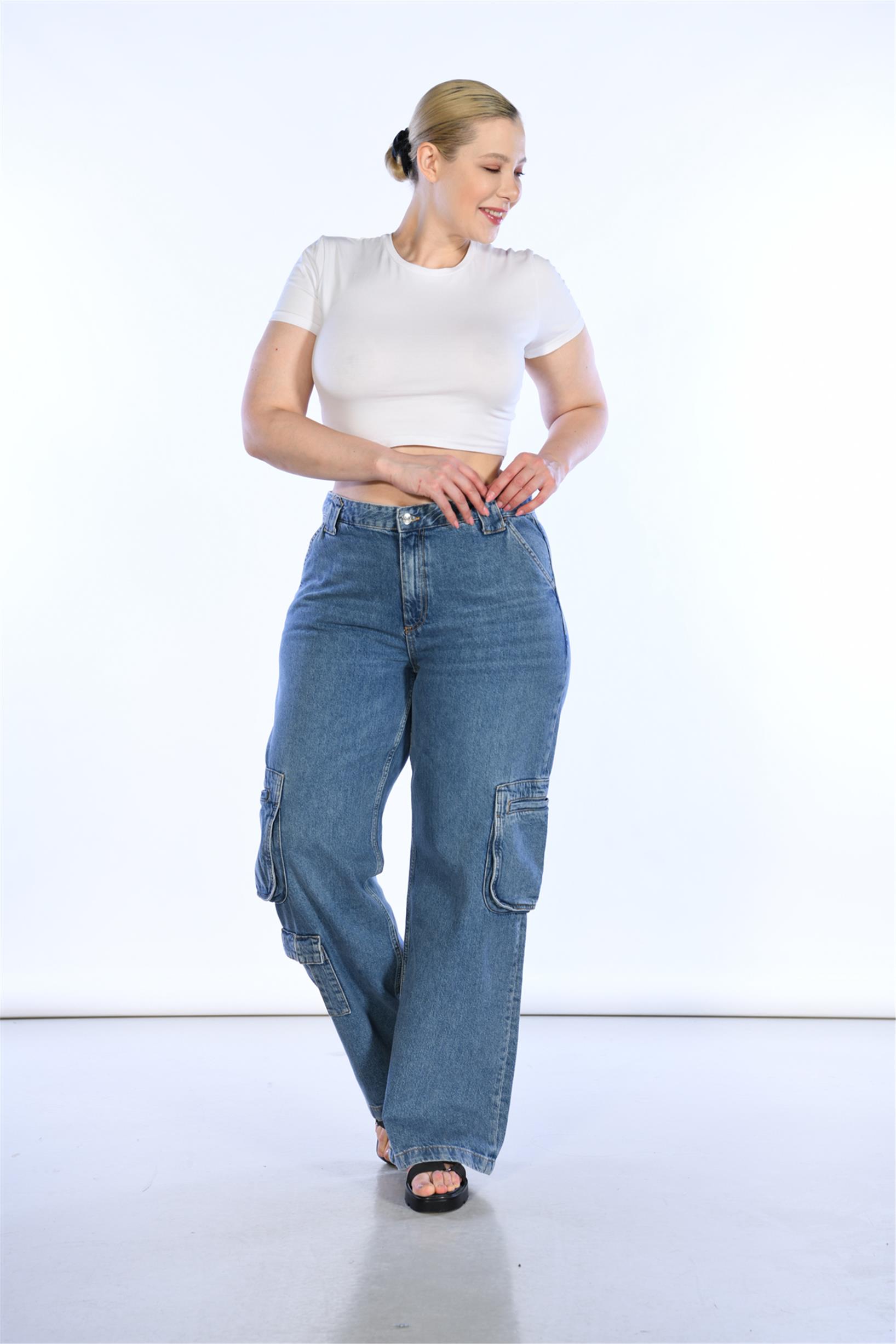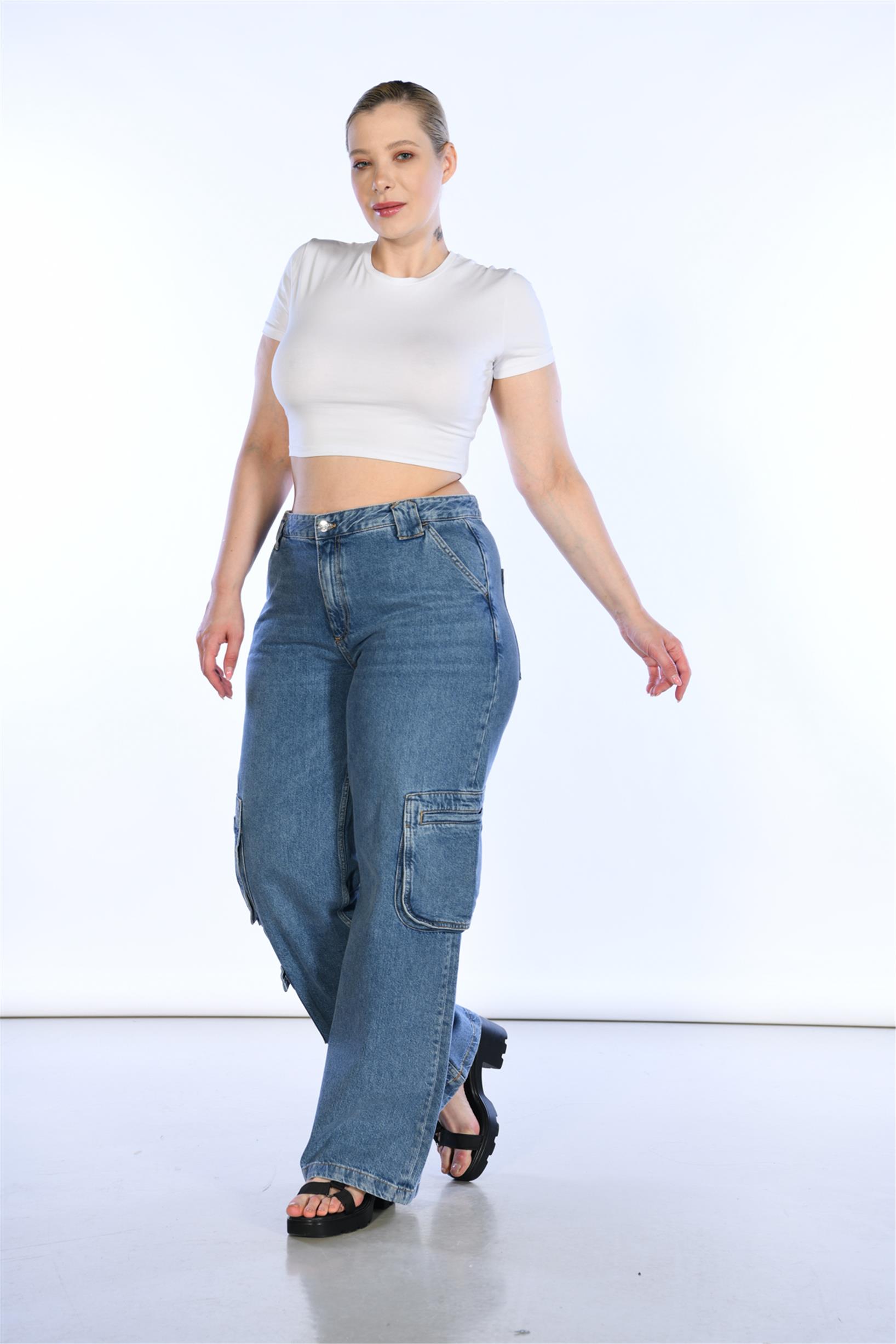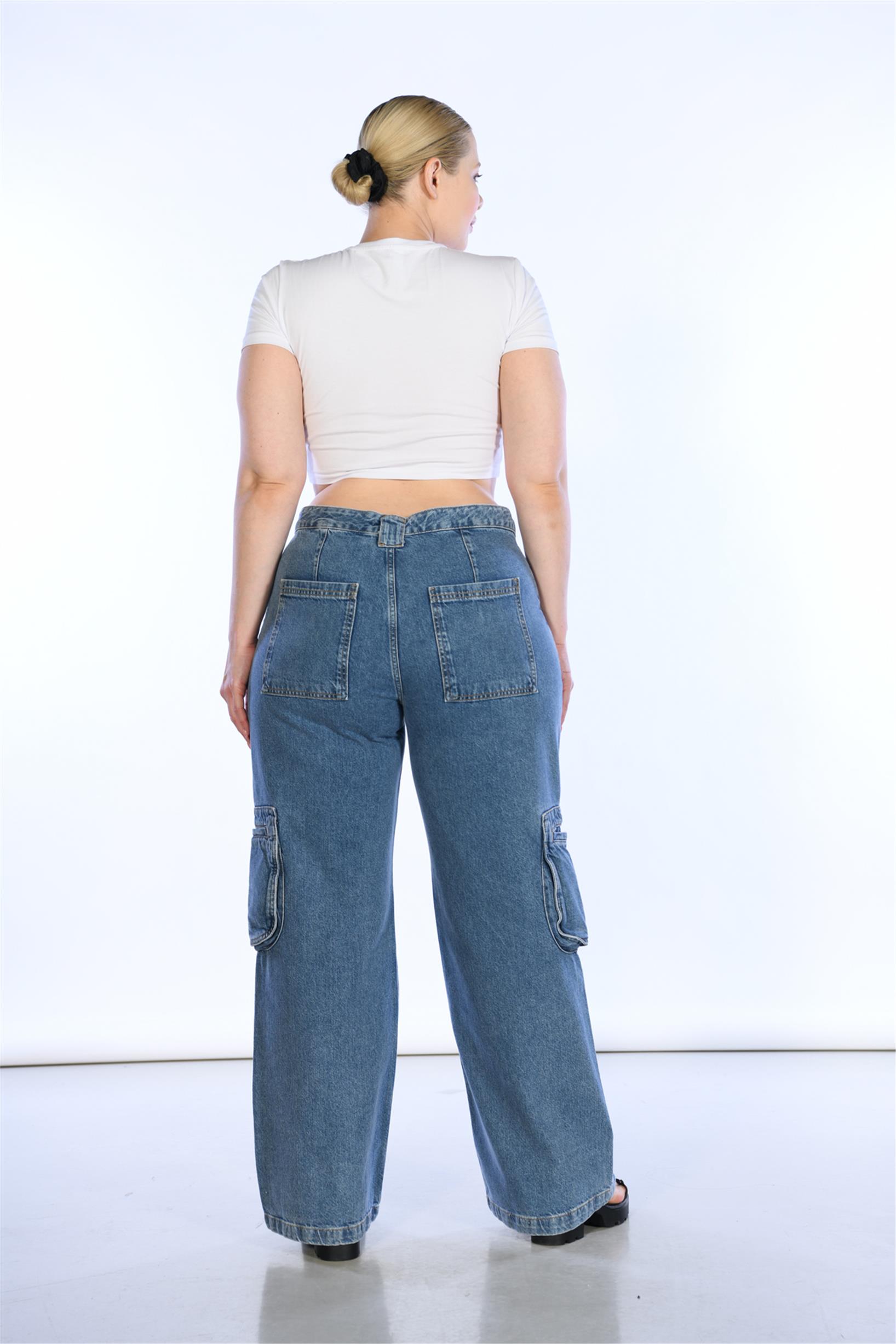 Büyük Beden Mavi Yüksek Bel Wideleg Kargo Denim Pantolon