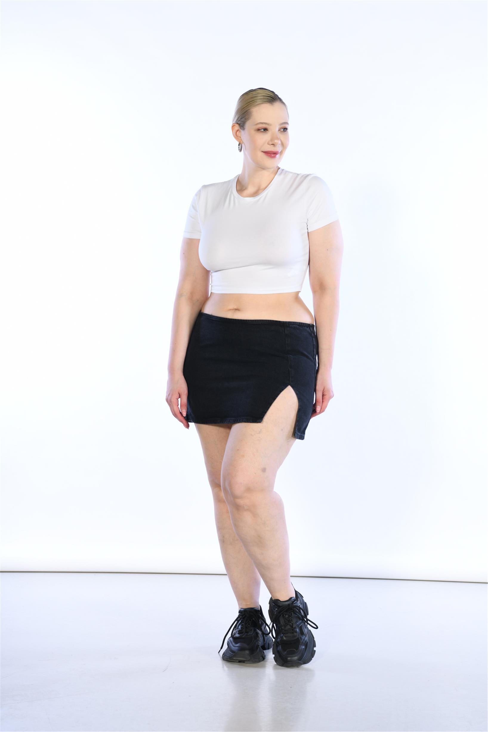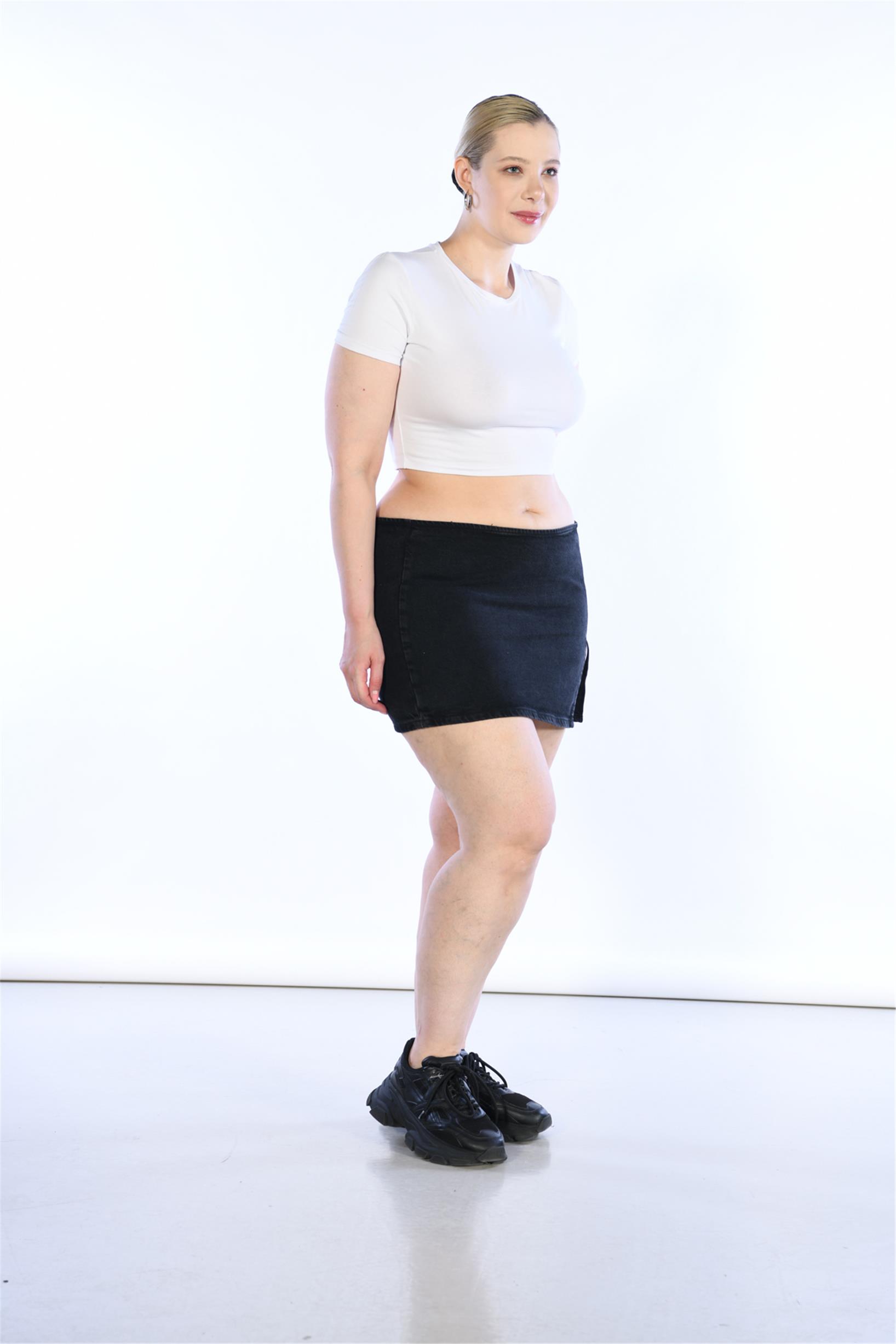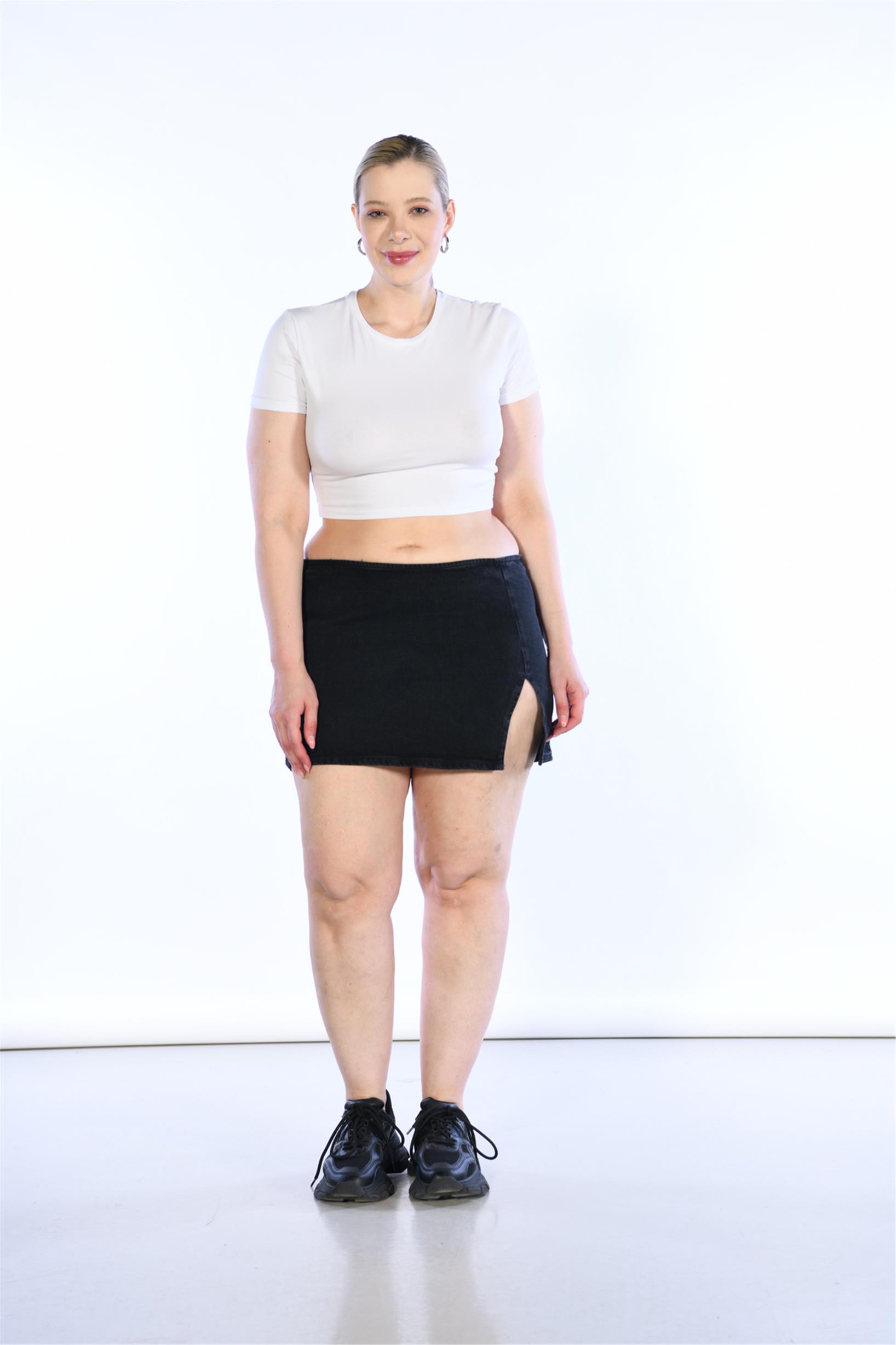 Büyük Beden Siyah Normal Bel Yırtmaç Detaylı Mini Kot Etek