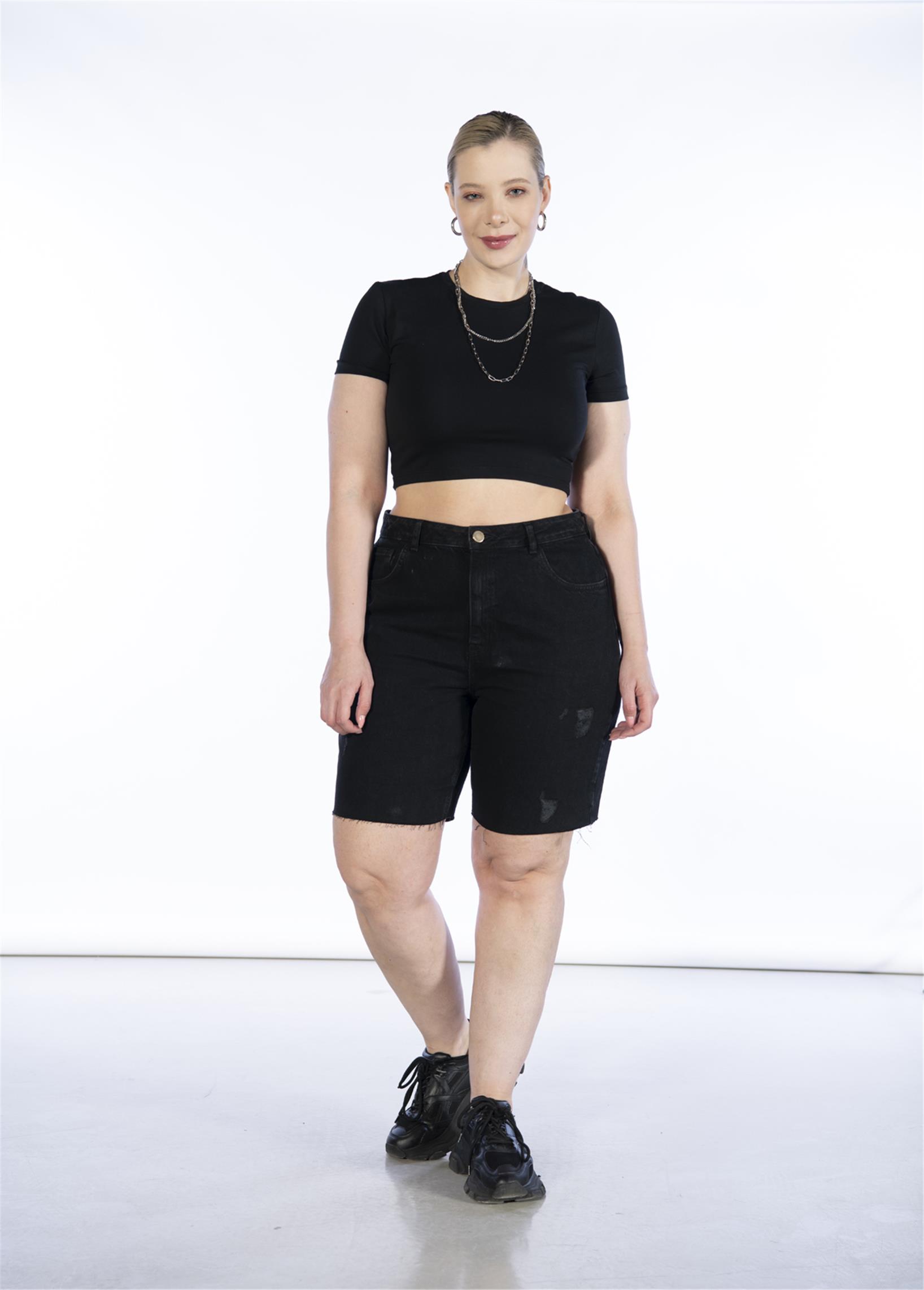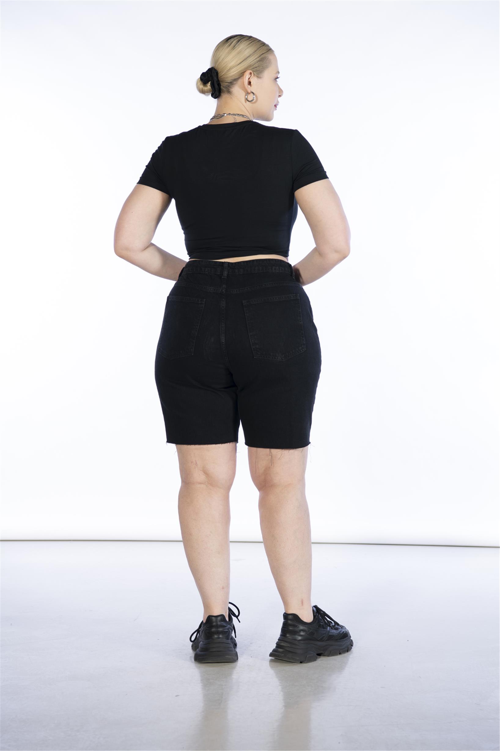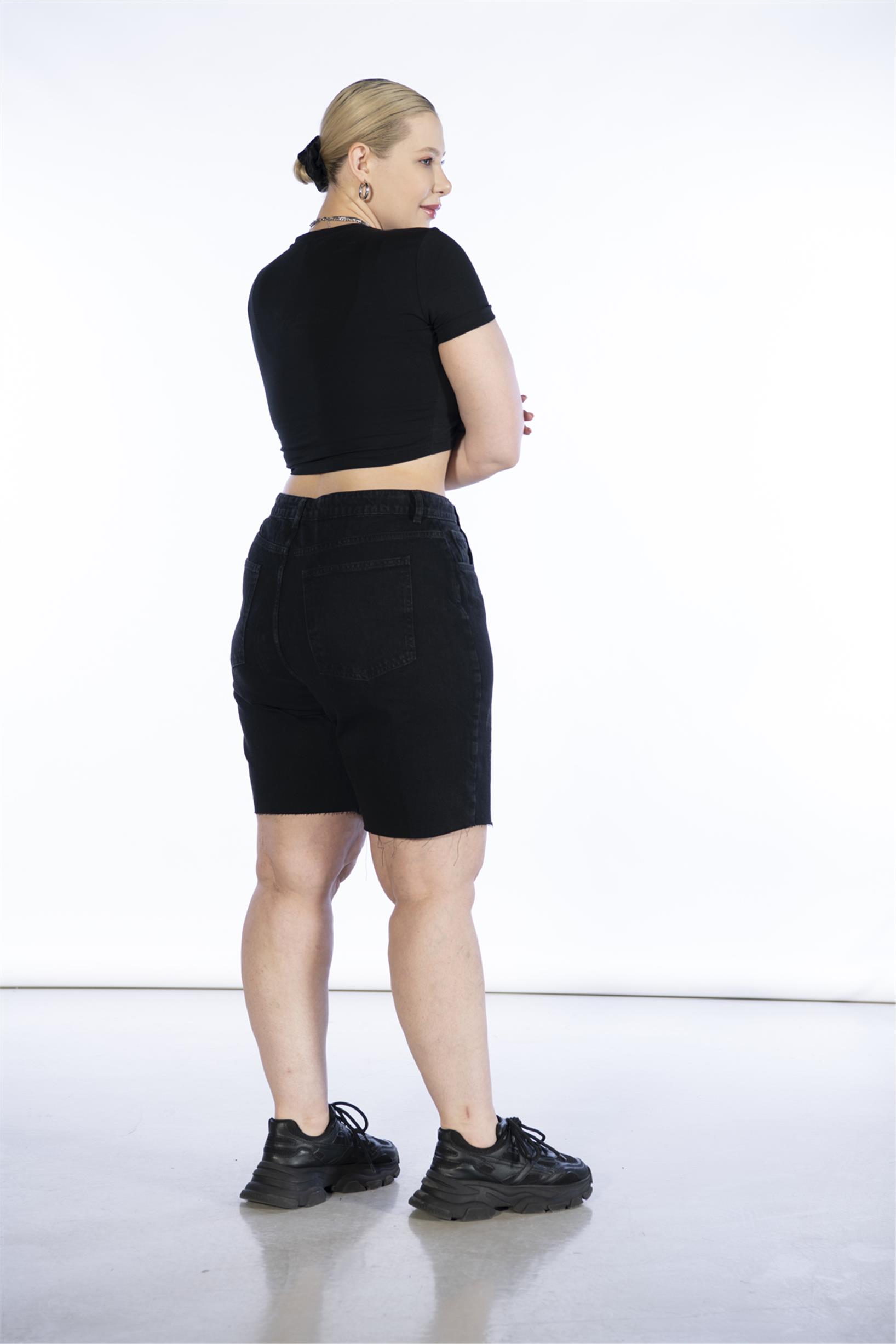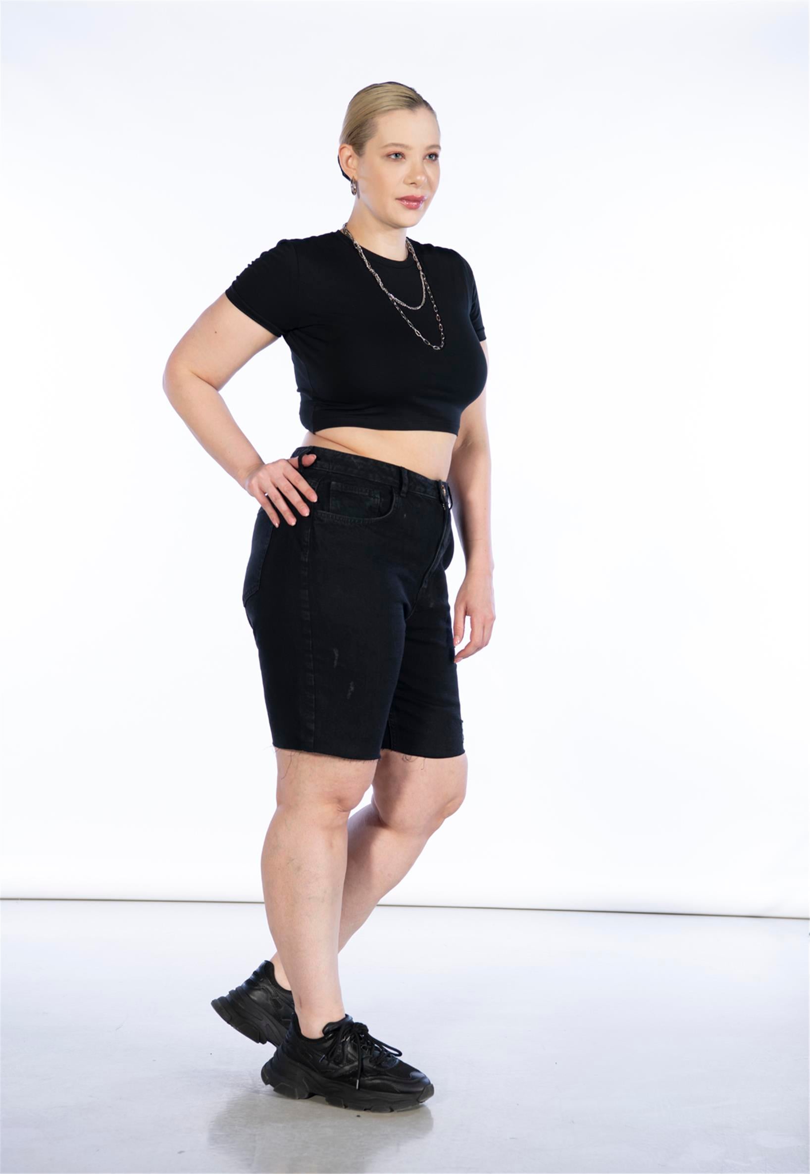 Büyük Beden Siyah Yüksek Bel Lazer Detaylı Bermuda Kot Şort