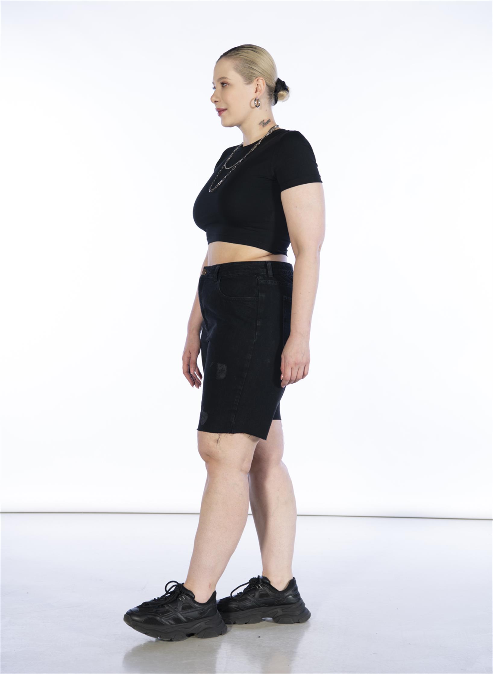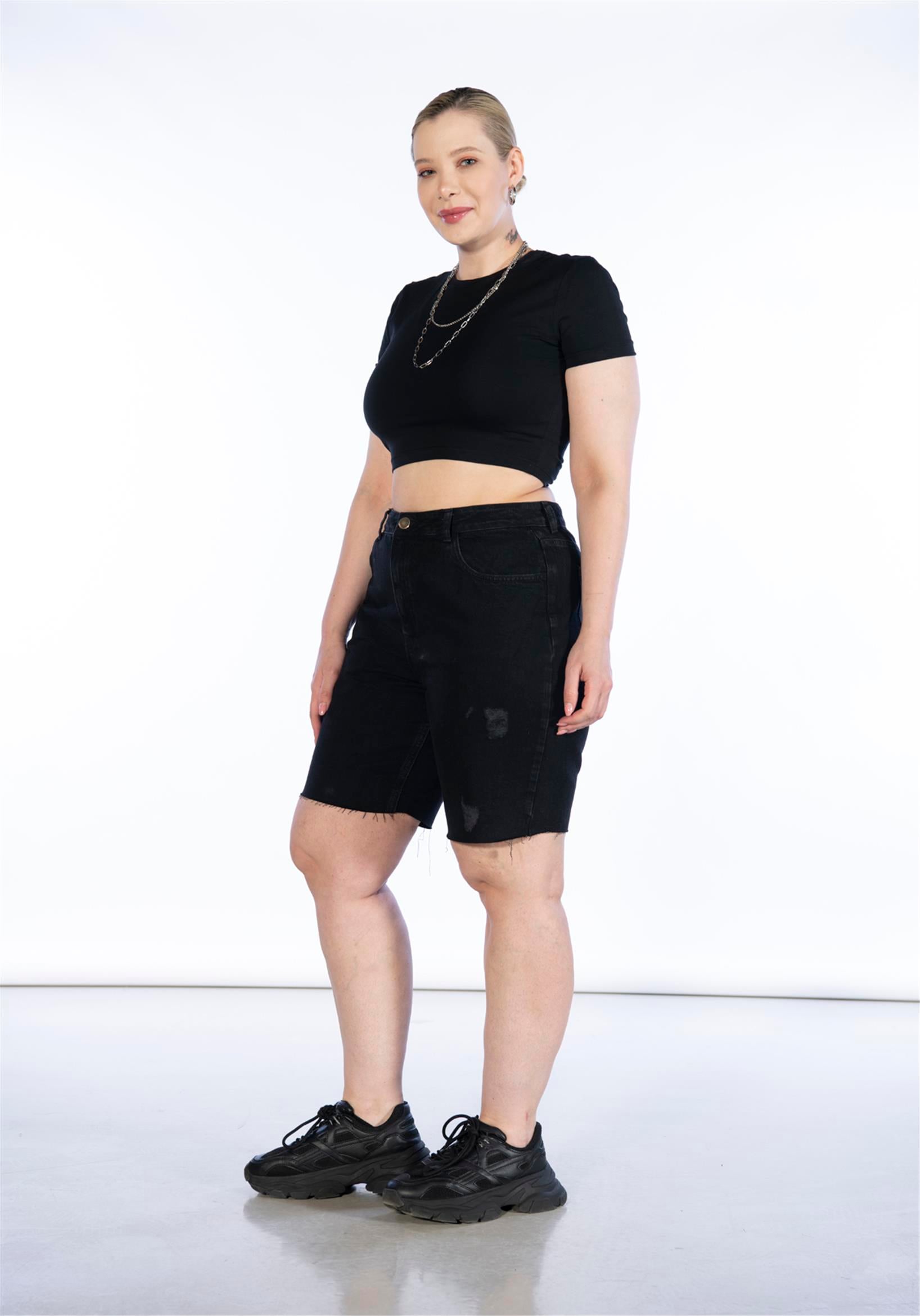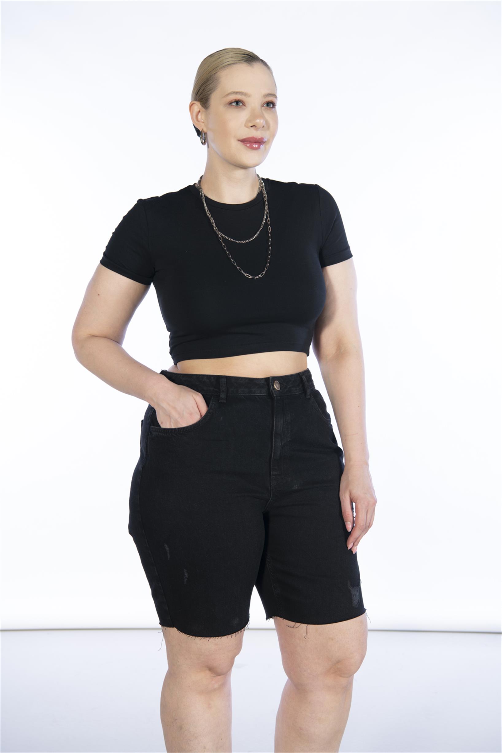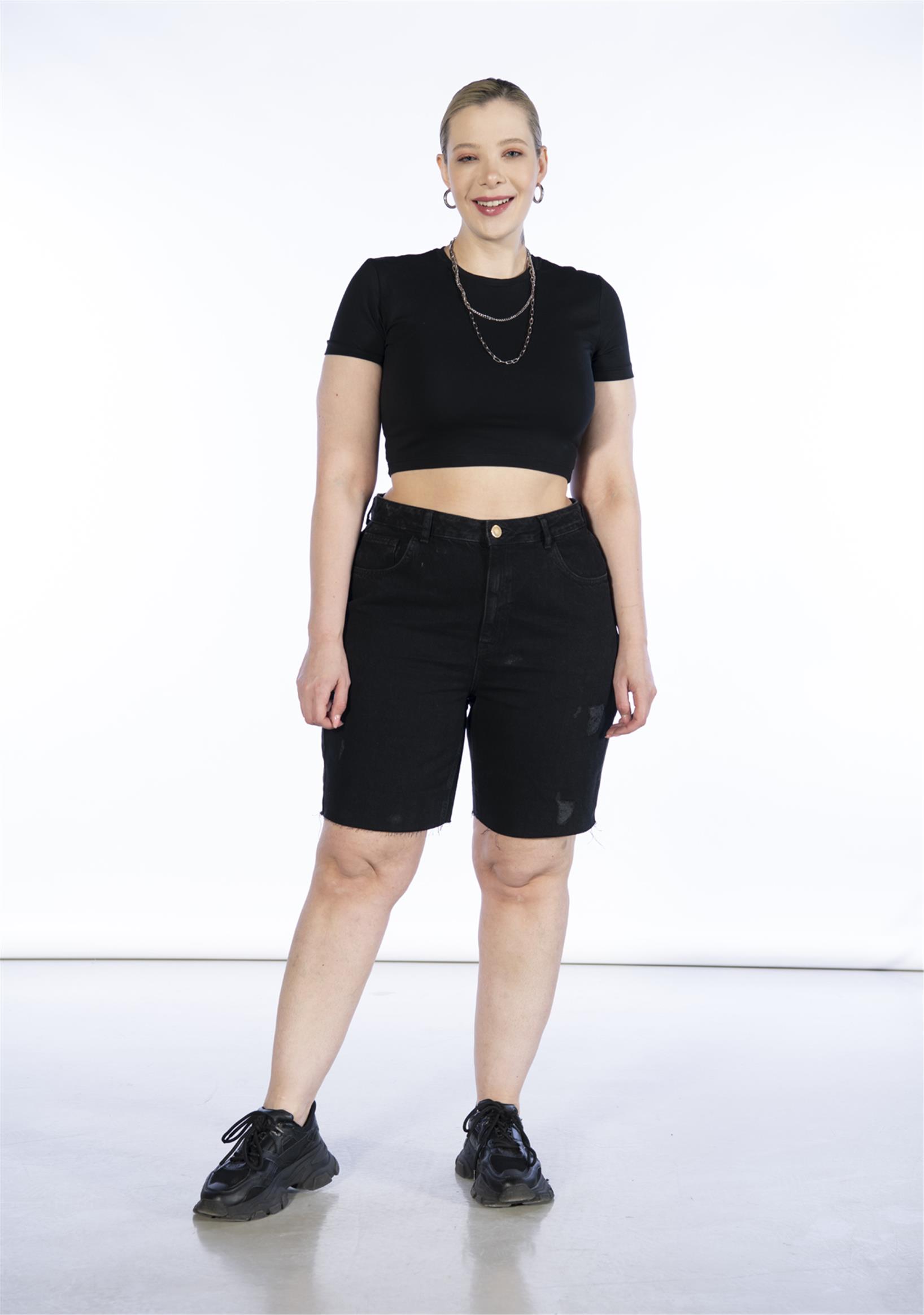 Büyük Beden Siyah Yüksek Bel Lazer Detaylı Bermuda Kot Şort
