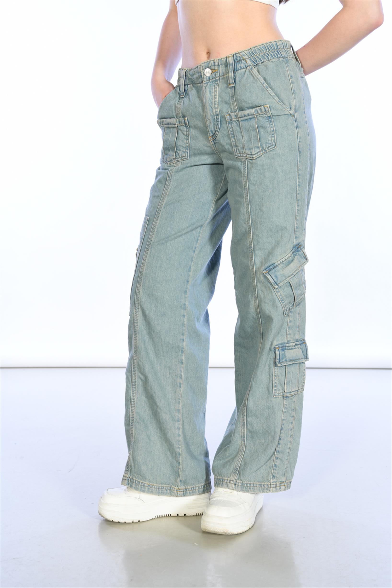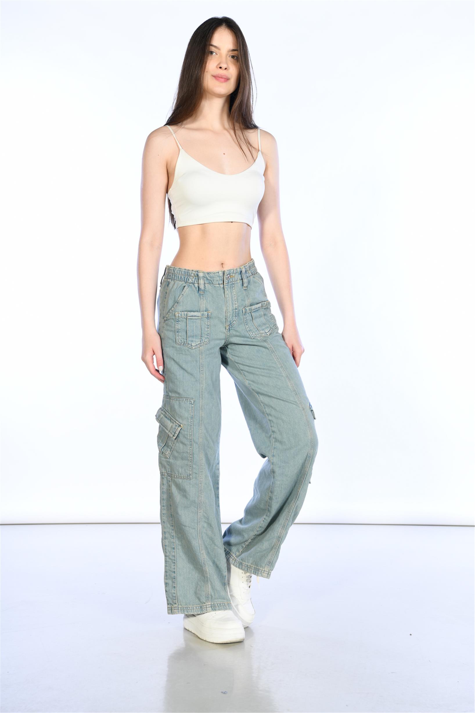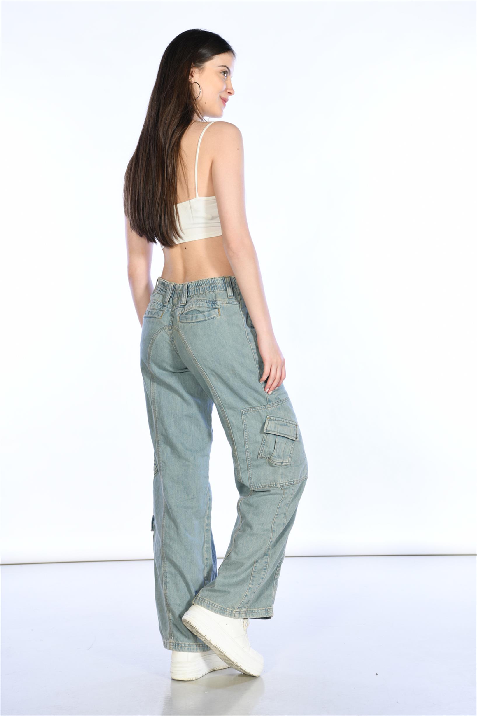 Buz Mavi Normal Bel Beli Lastikli Wideleg Kargo Pantolon