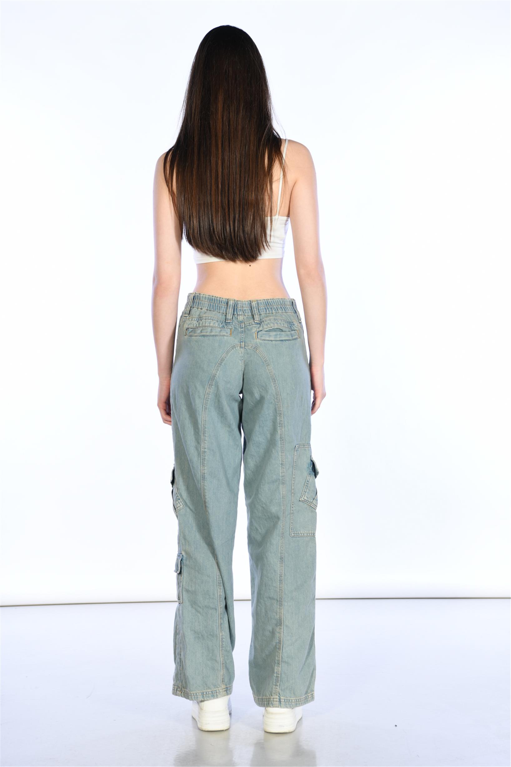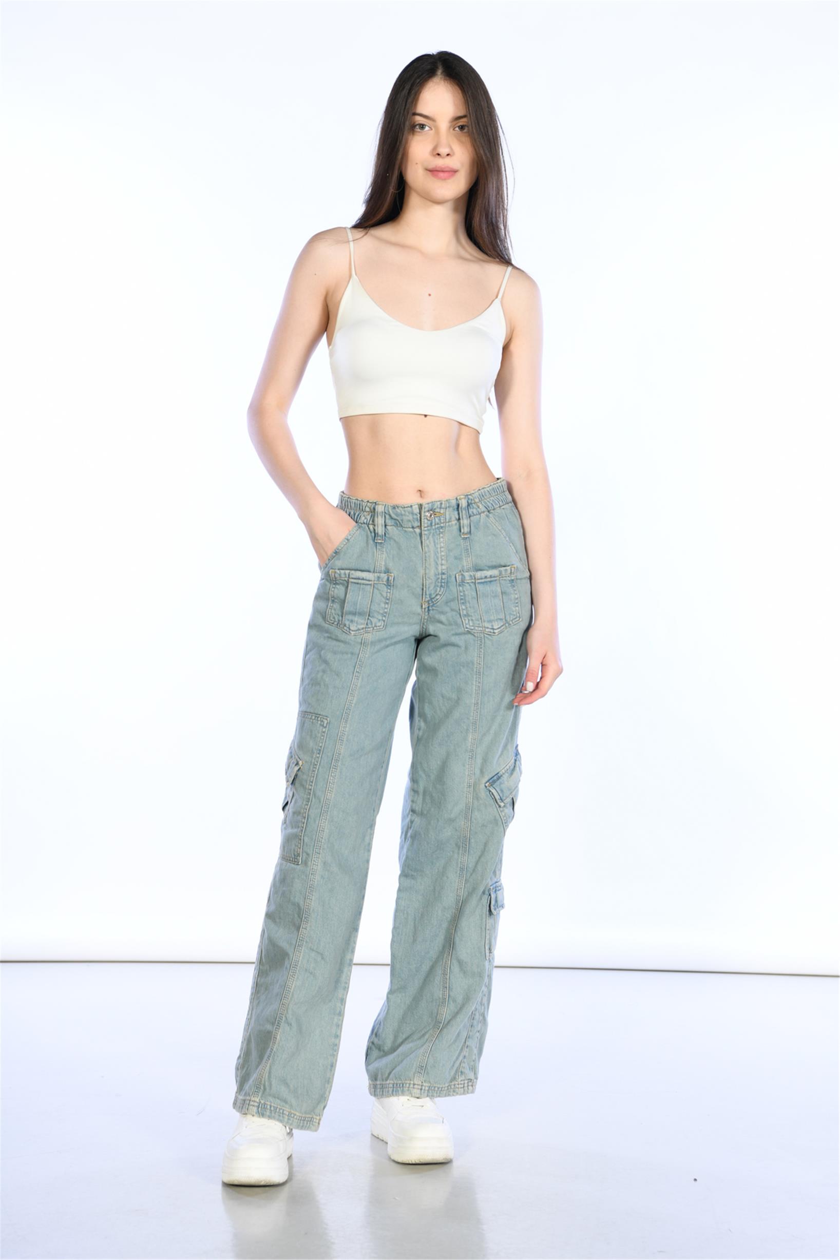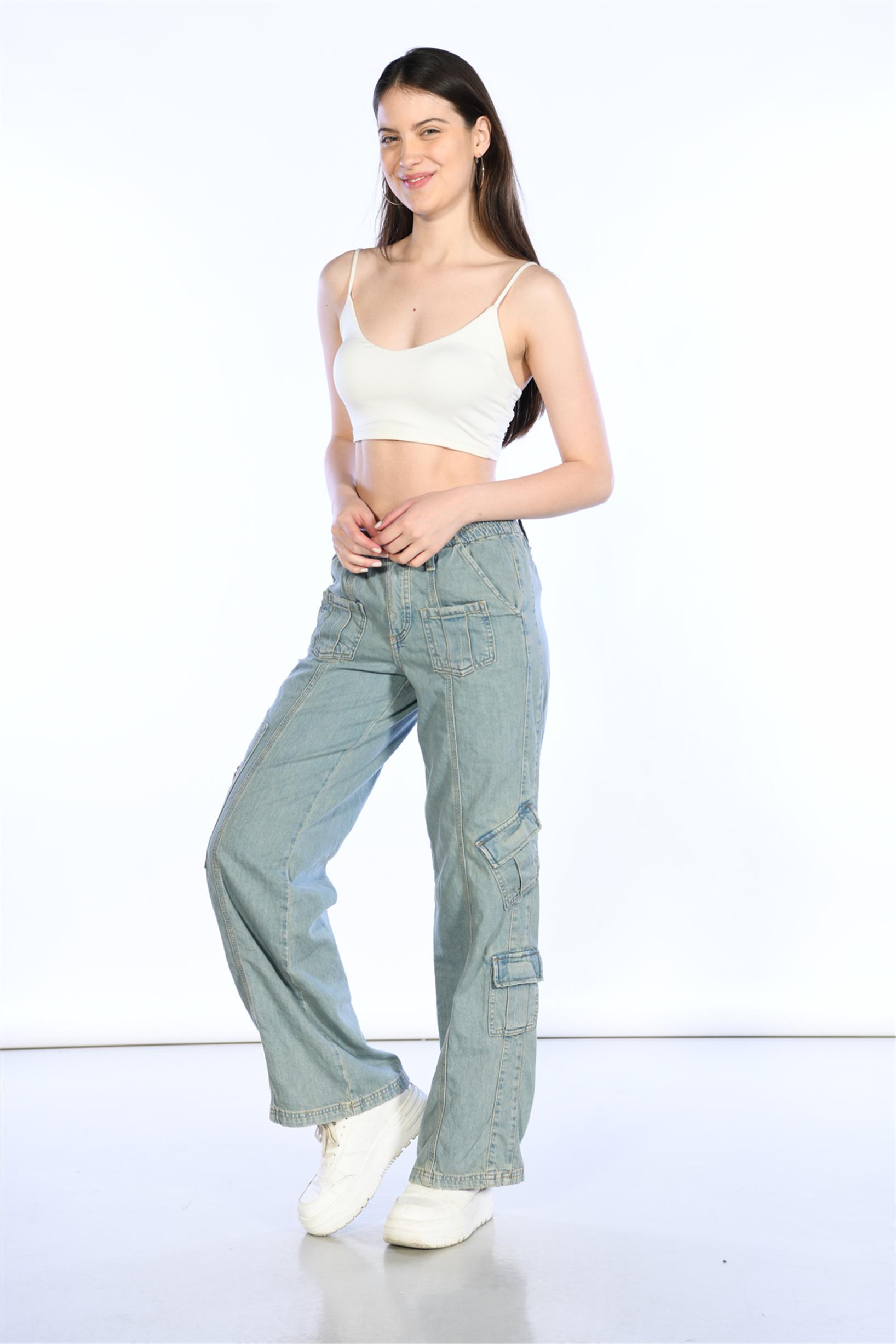 Buz Mavi Normal Bel Beli Lastikli Wideleg Kargo Pantolon