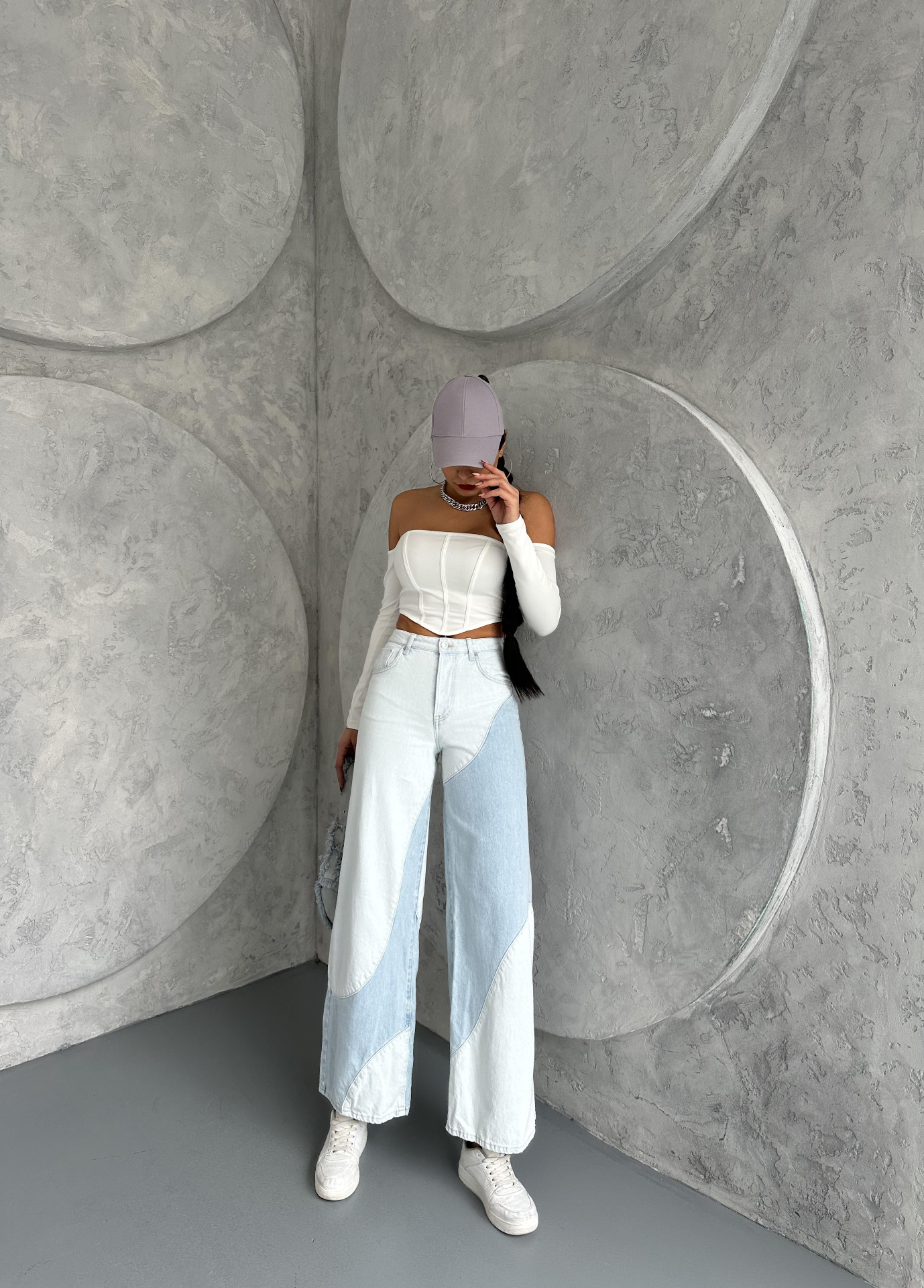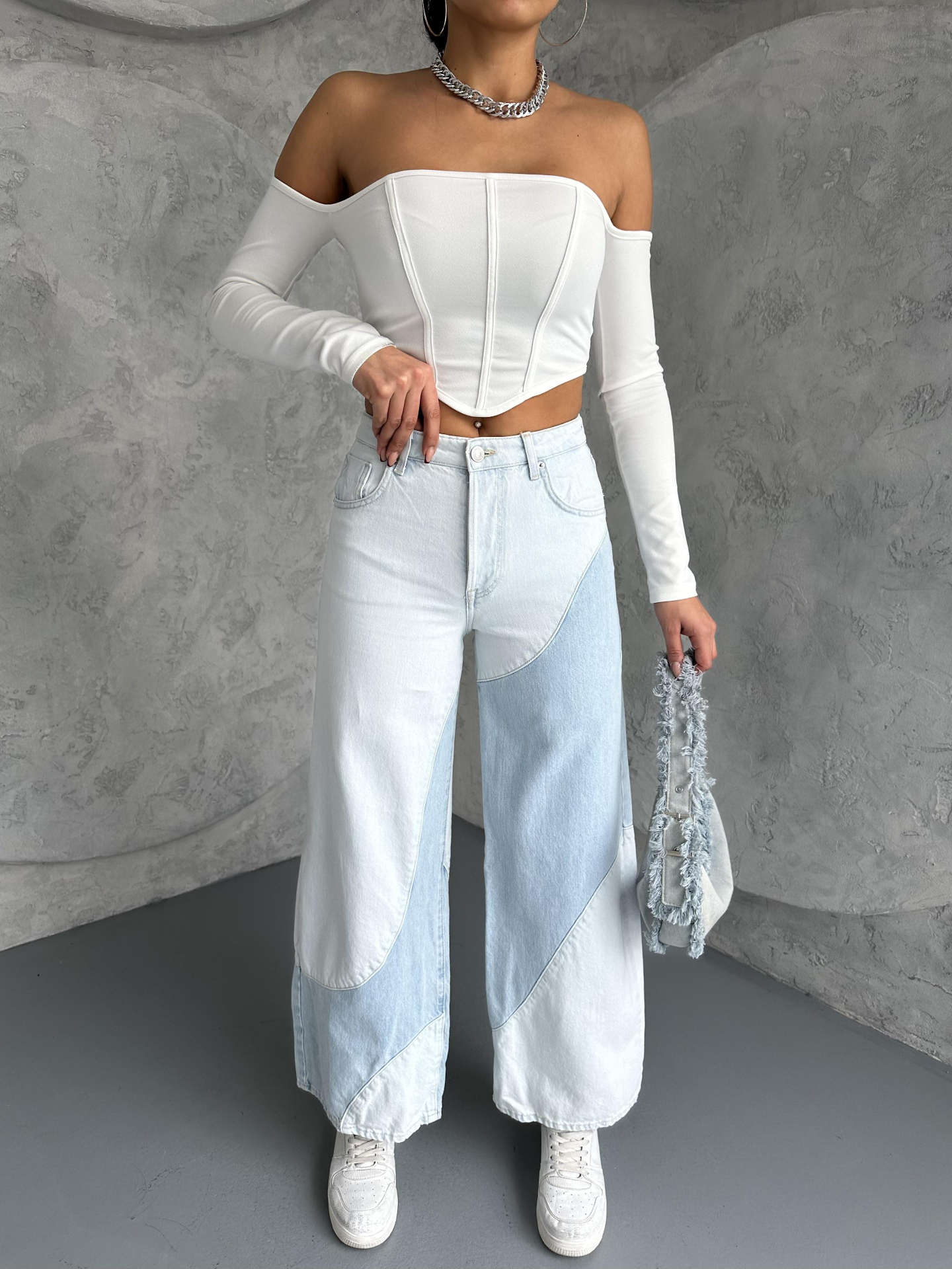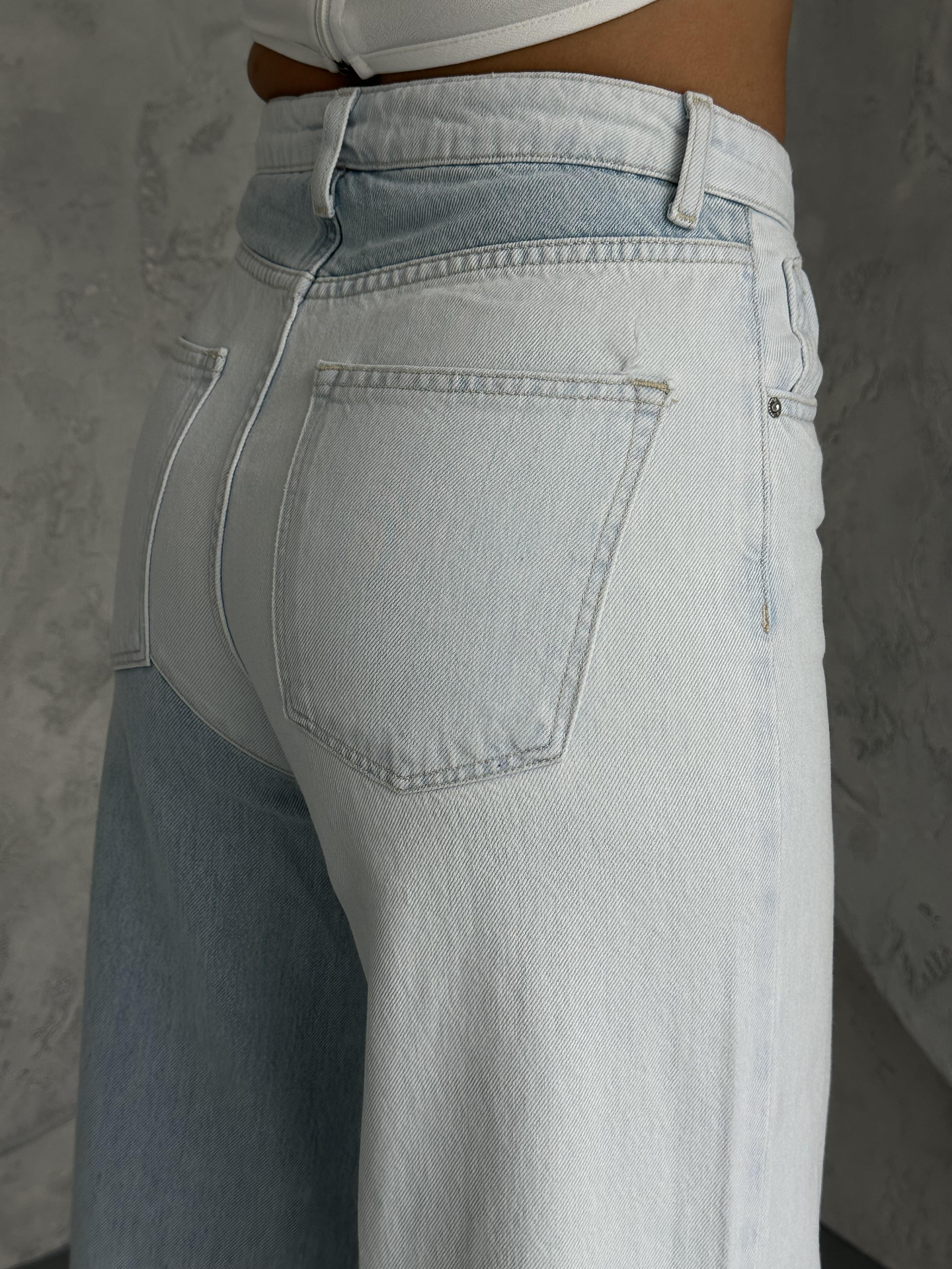 Buz Mavisi Çift Renk Detaylı Wide Leg Jeans