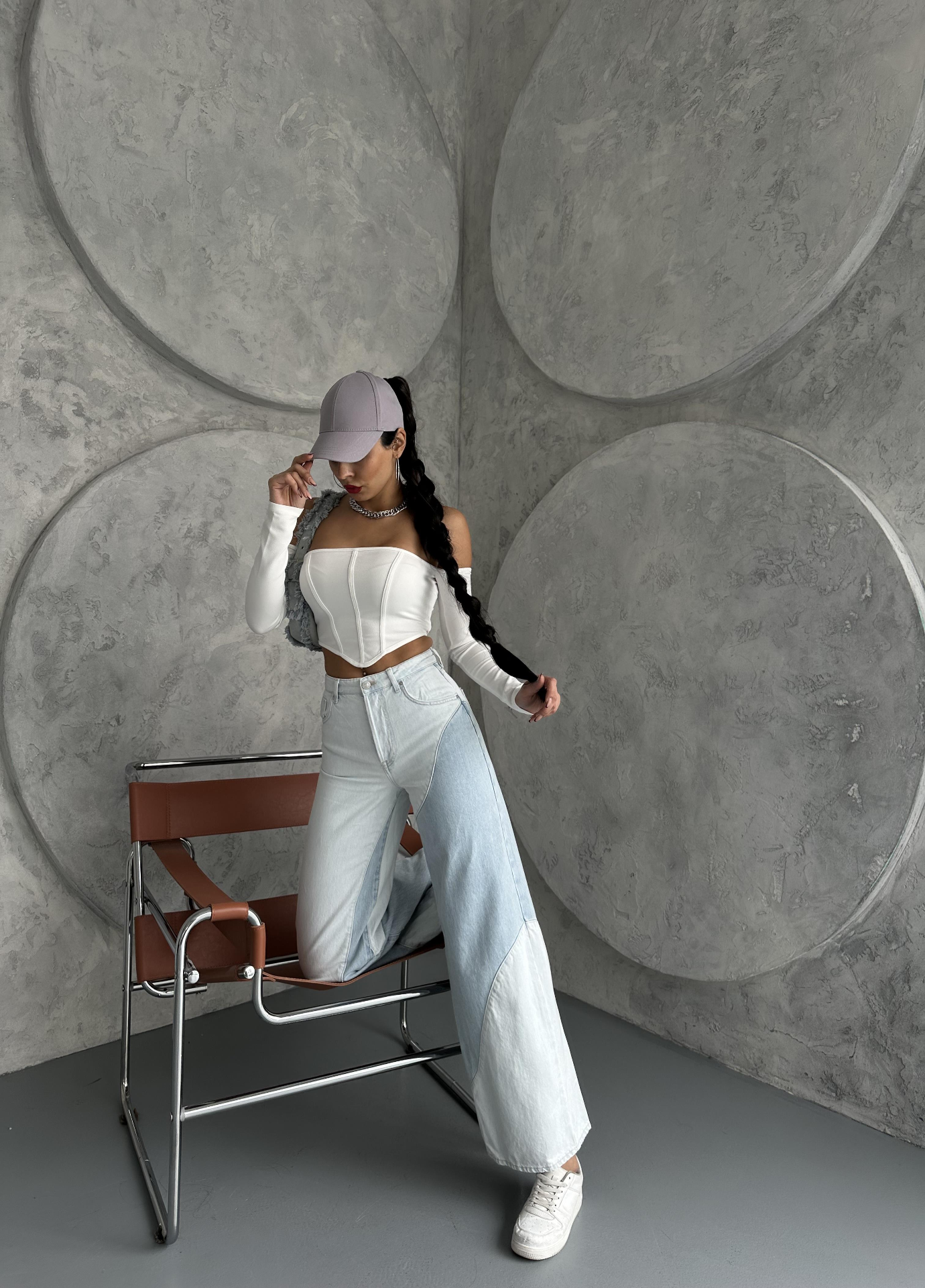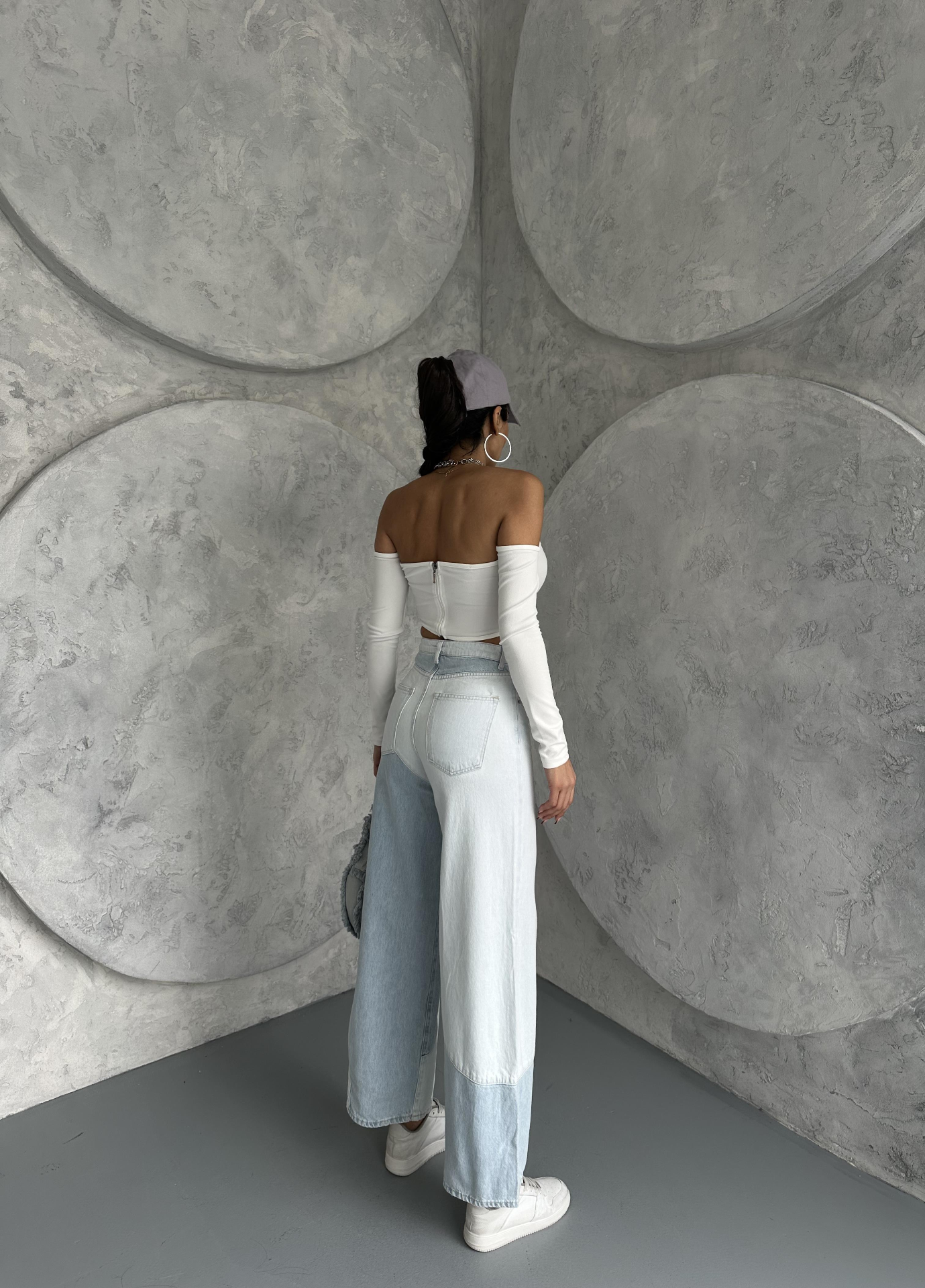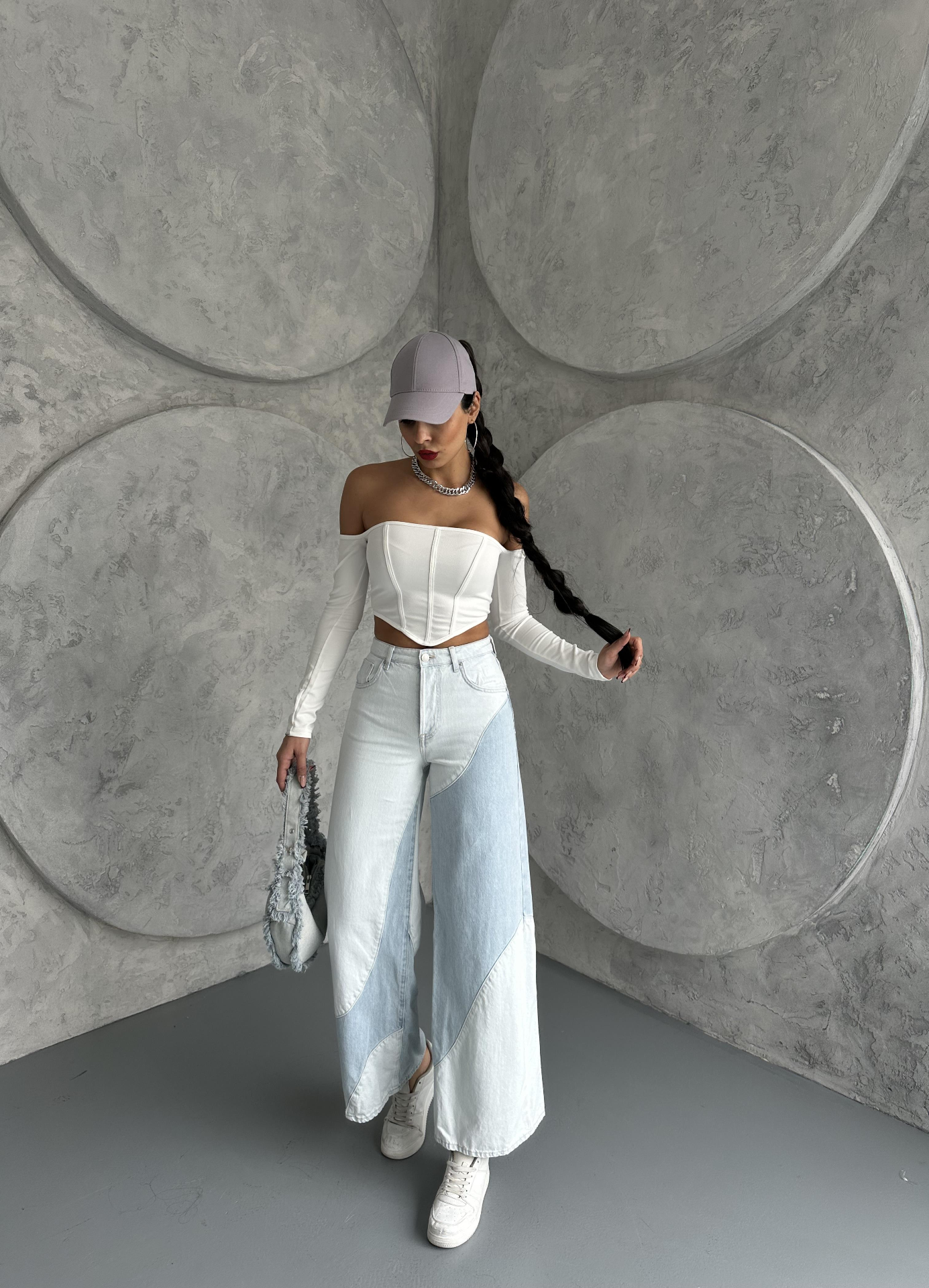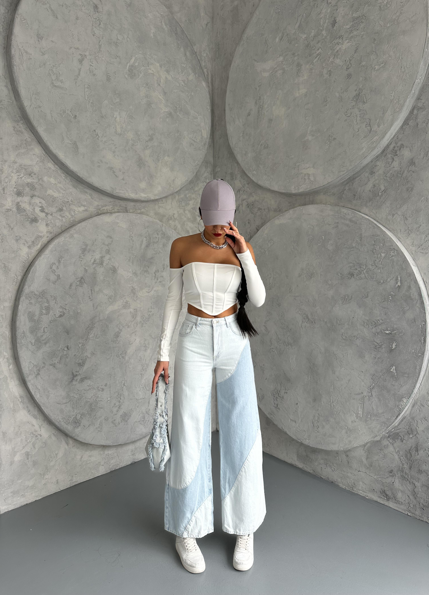 Buz Mavisi Çift Renk Detaylı Wide Leg Jeans