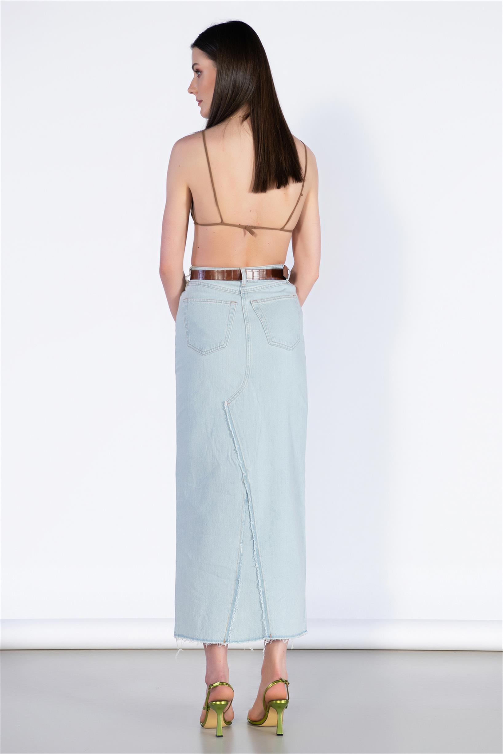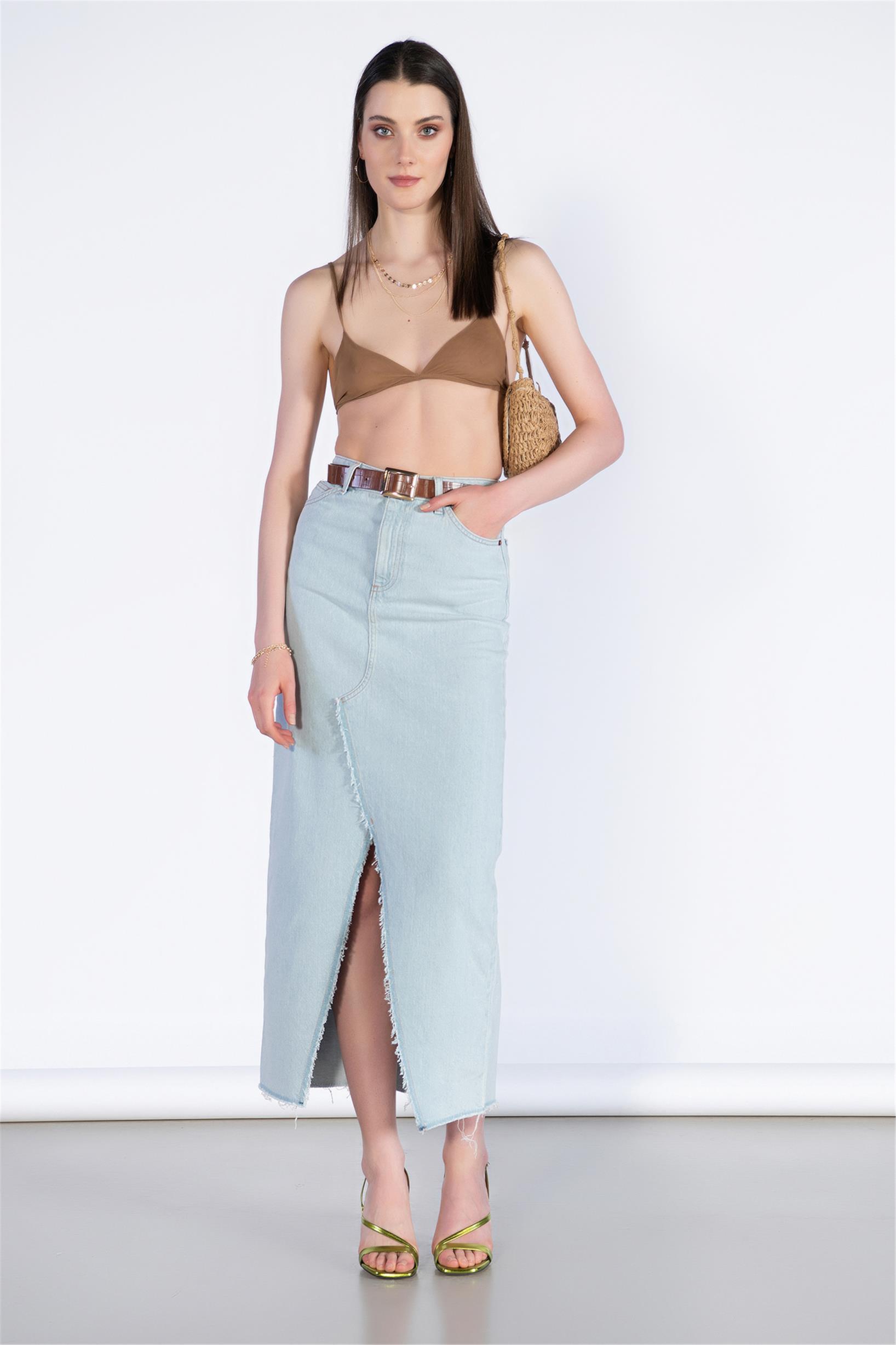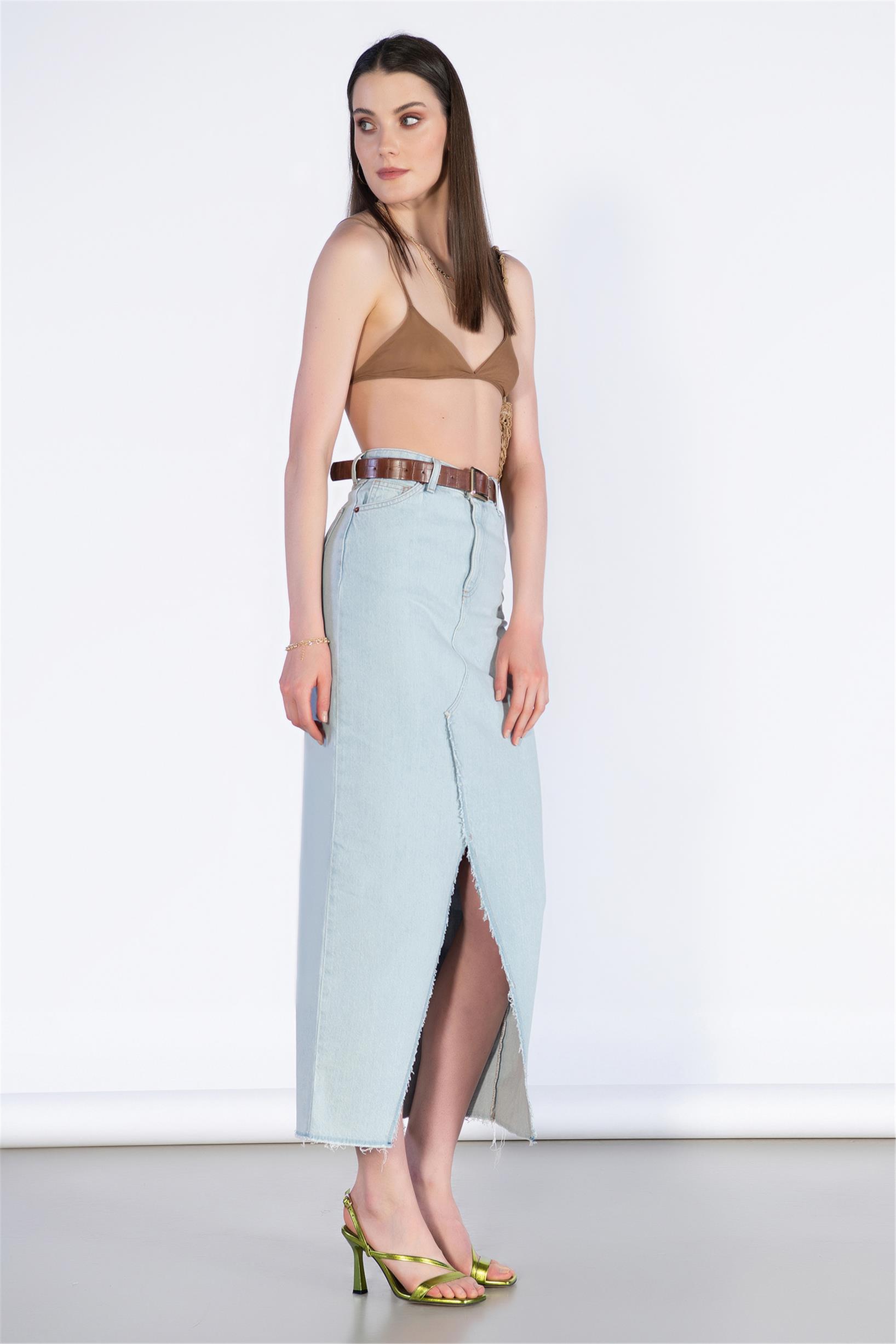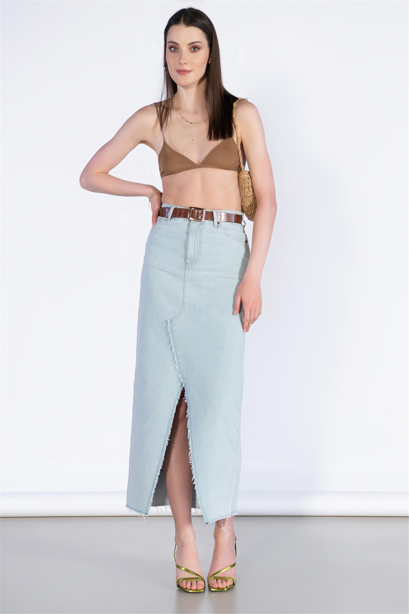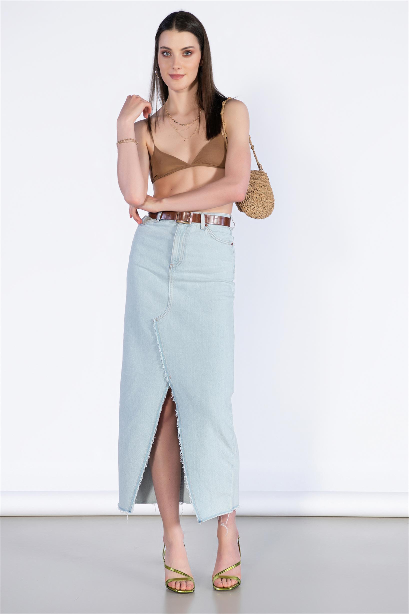 Buz Mavisi Yüksek Bel Ön Yırtmaç Detay Midi Boy Kot Etek