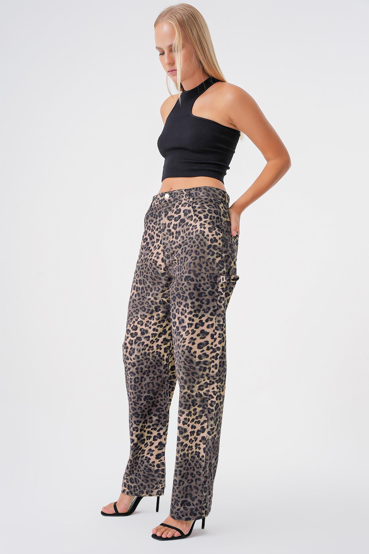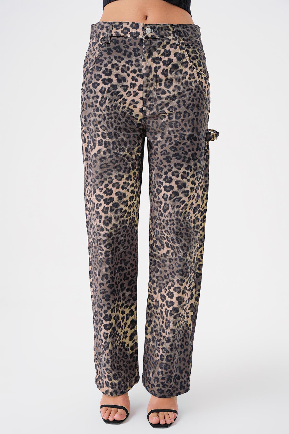 Çok Renkli Leopar Desenli Carpenter Detayli Wide Leg Jean
