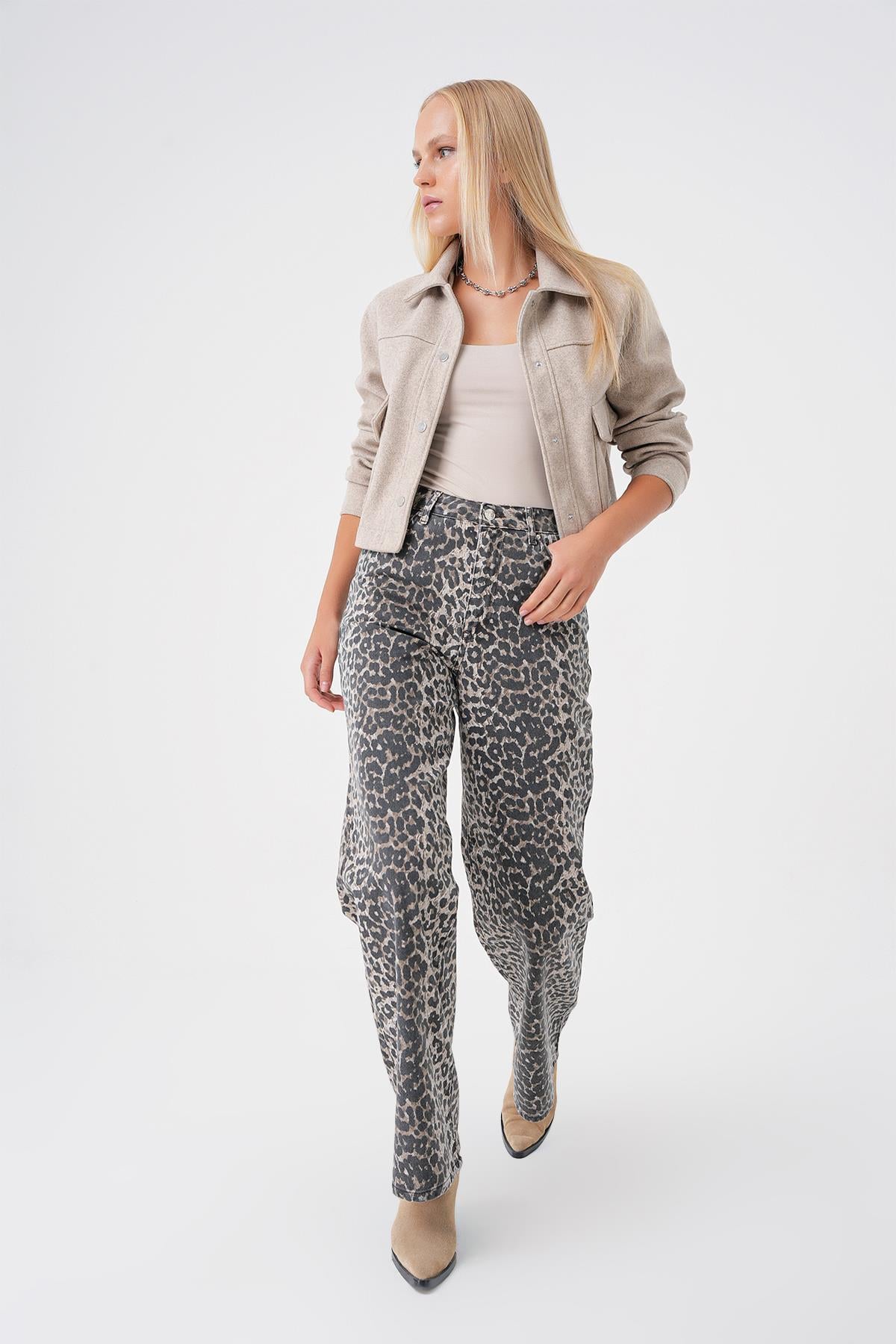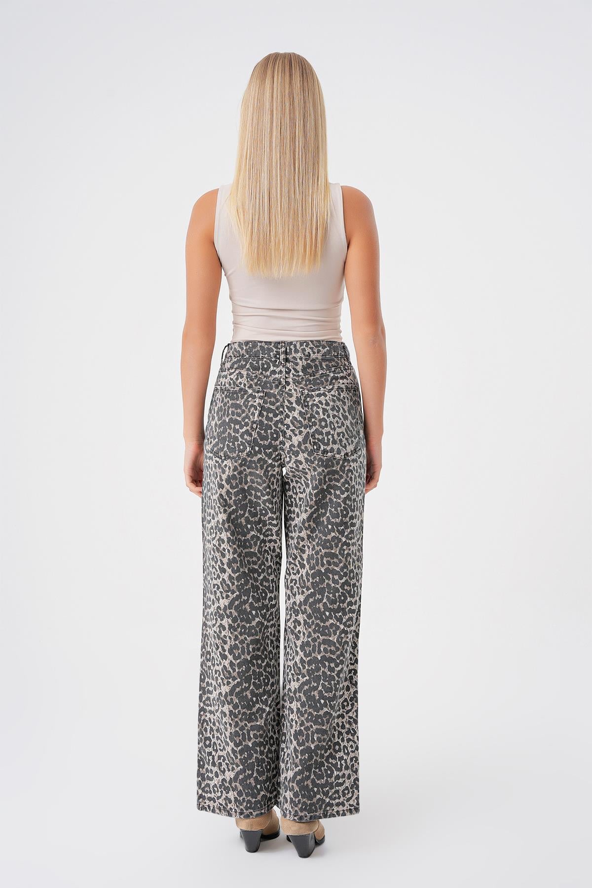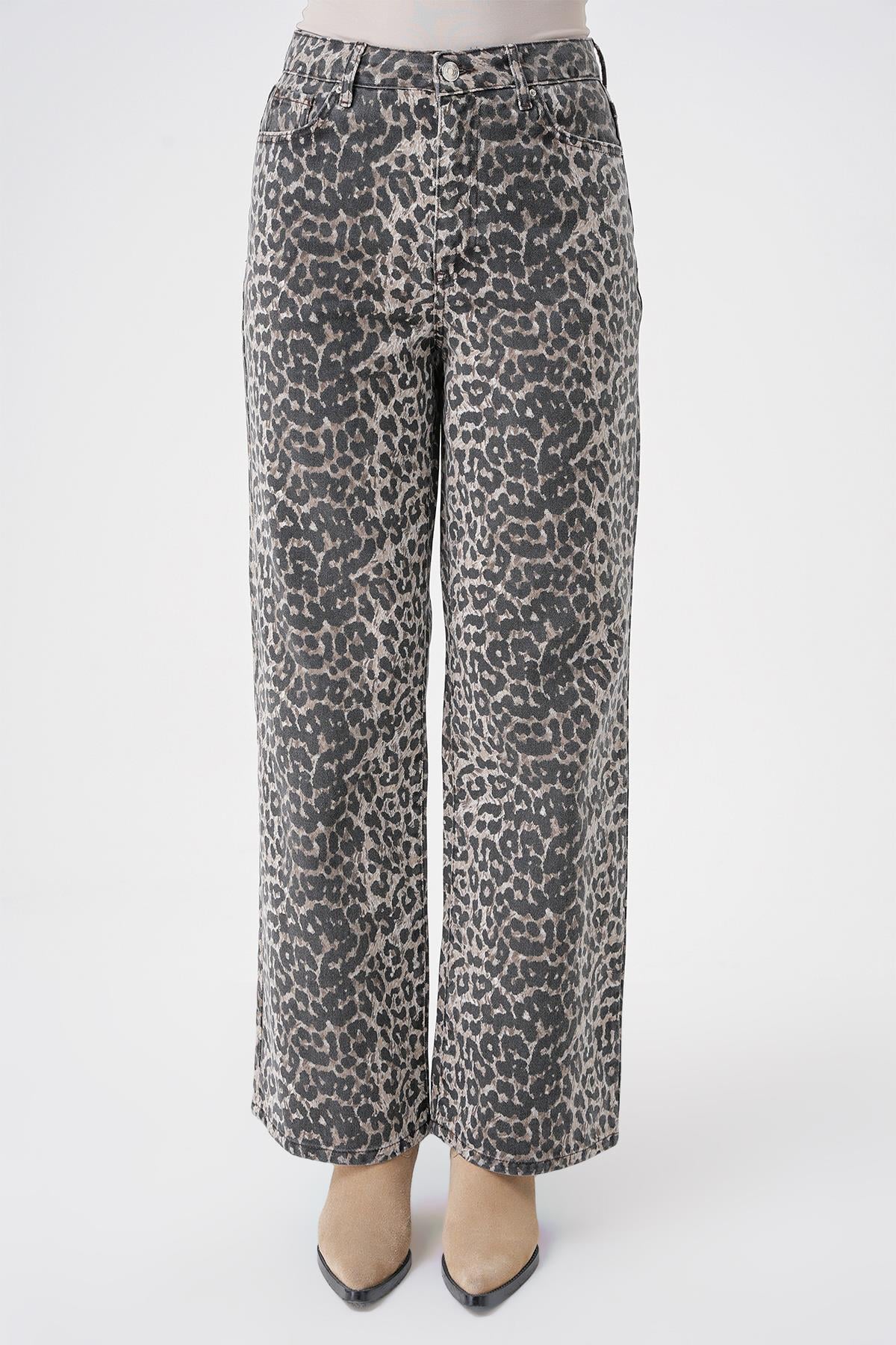 Çok Renkli Leopar Desenli Eskitme Wide Leg Jean