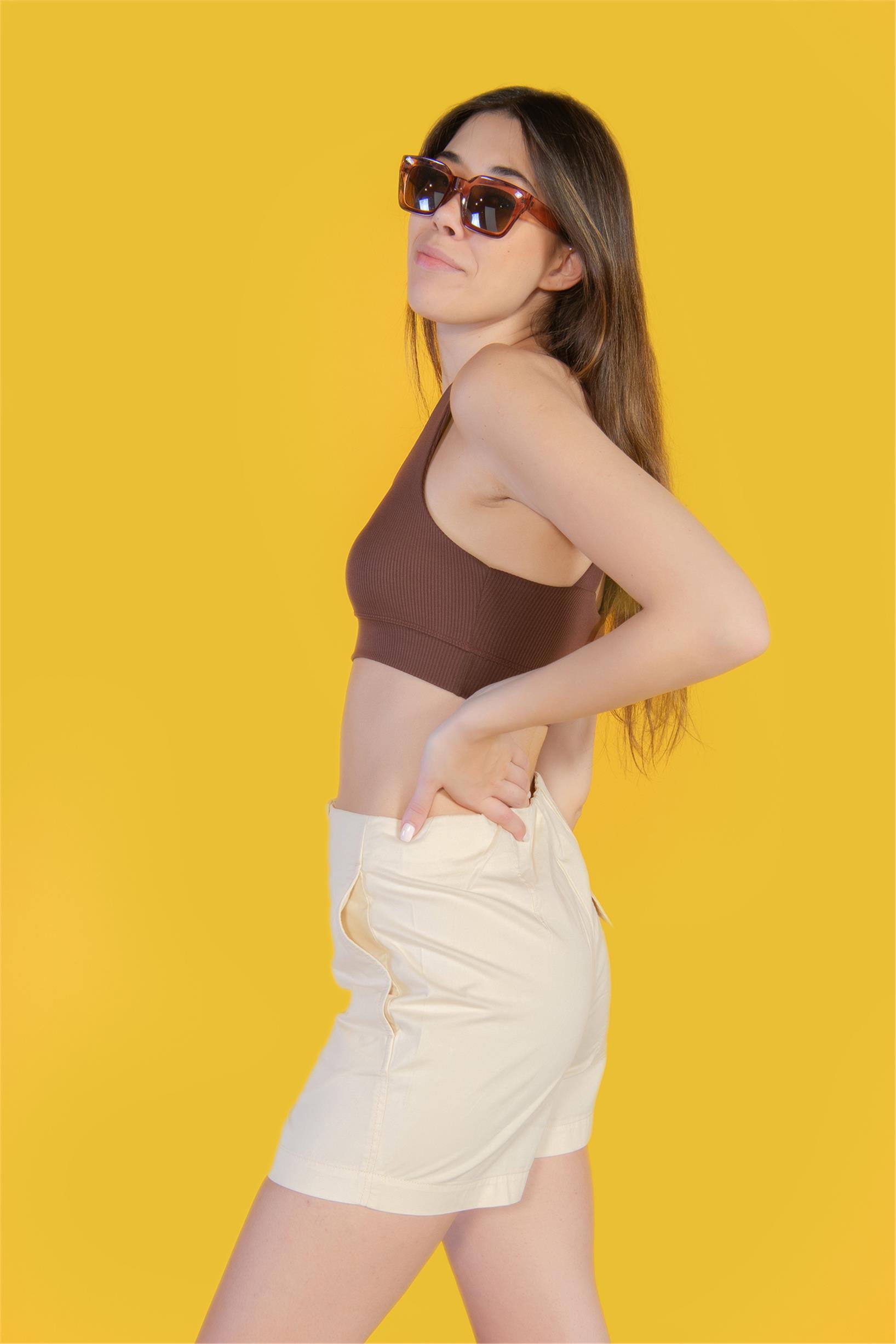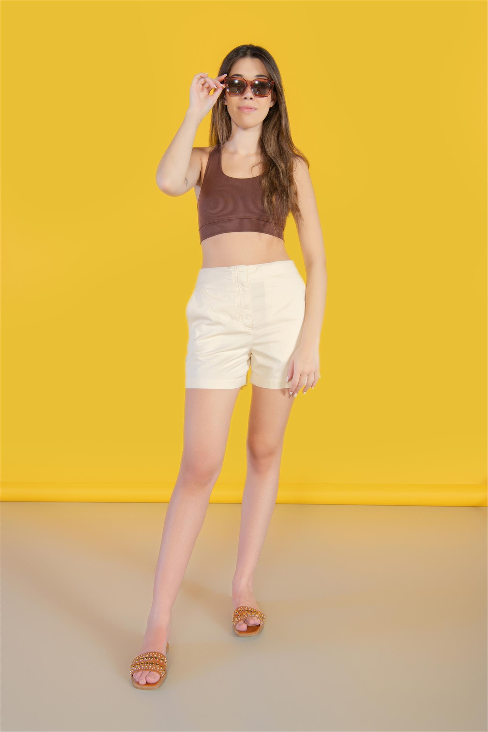 Ekru Yüksek Bel Bermuda Kumaş Şort