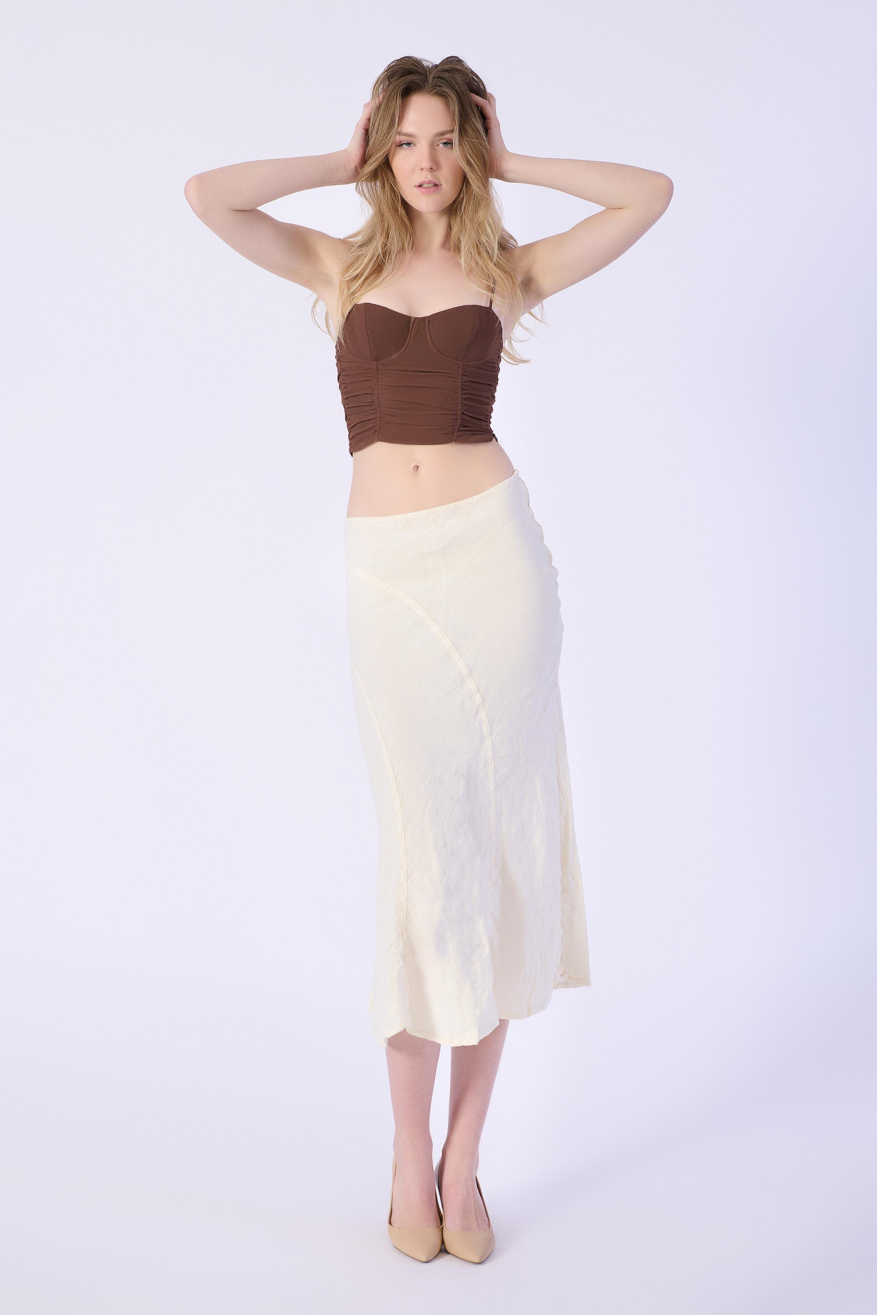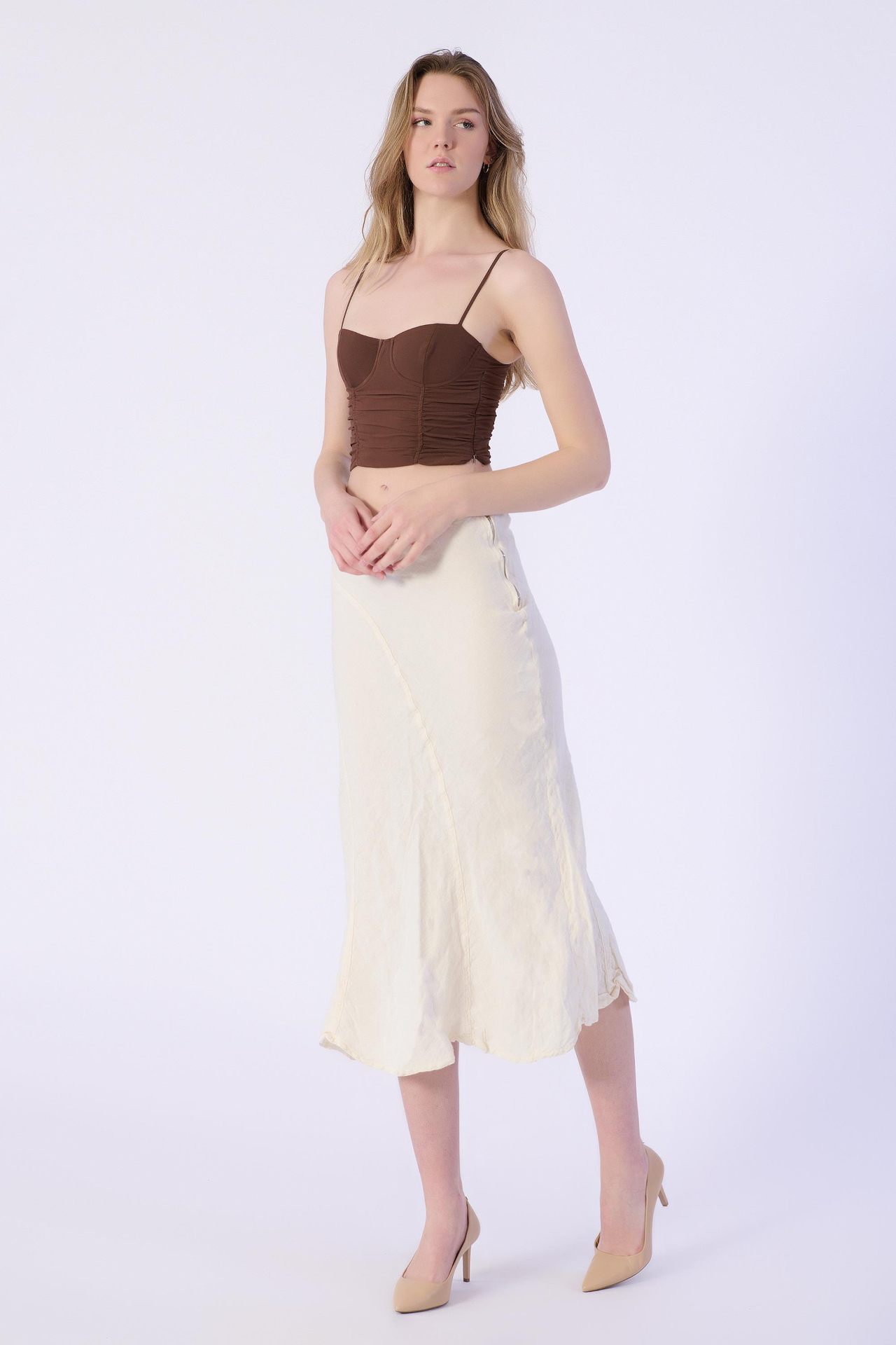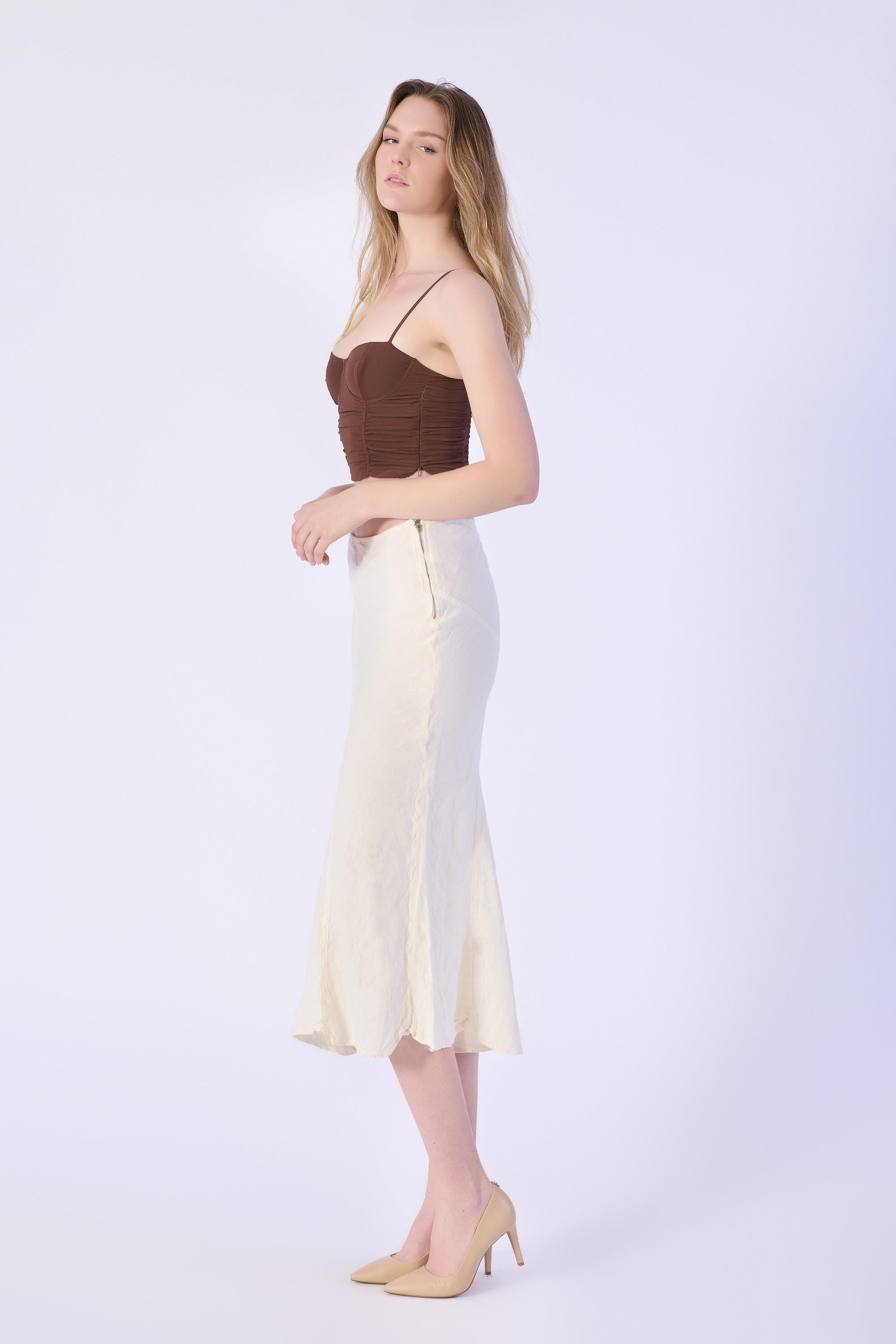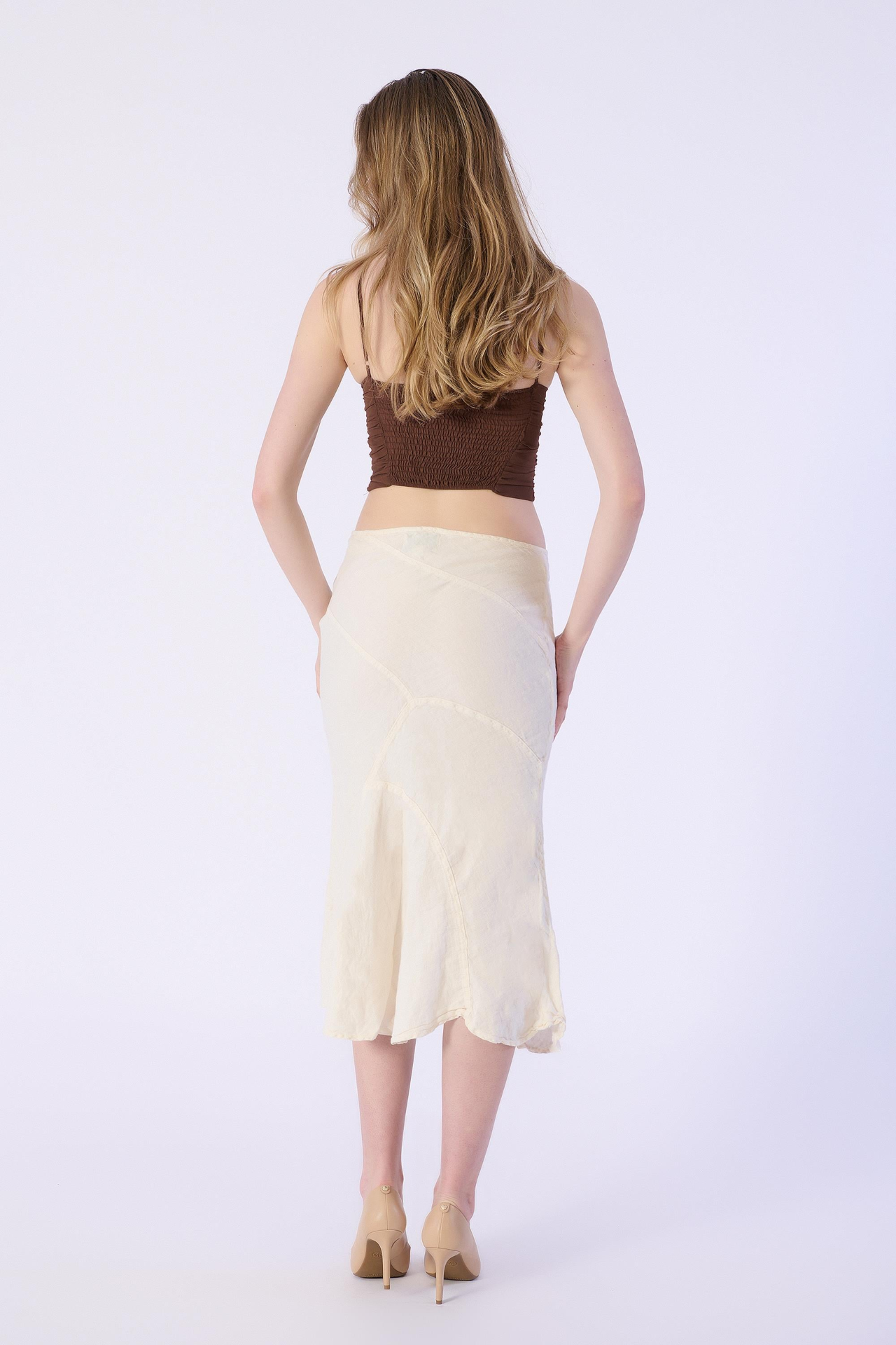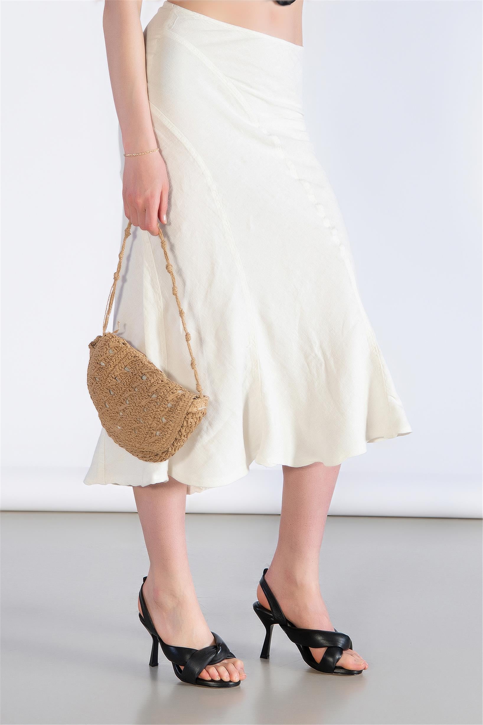 Ekru Yüksel Bel Midi Boy Kloş Keten Etek