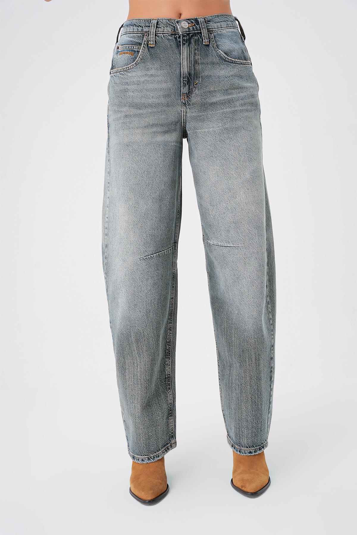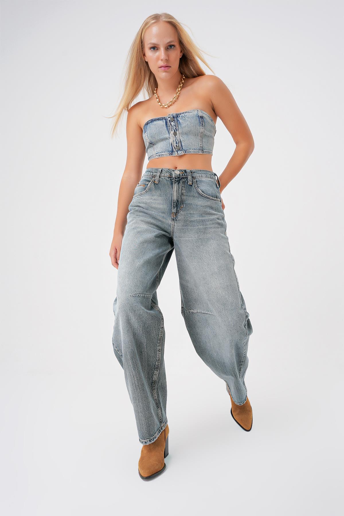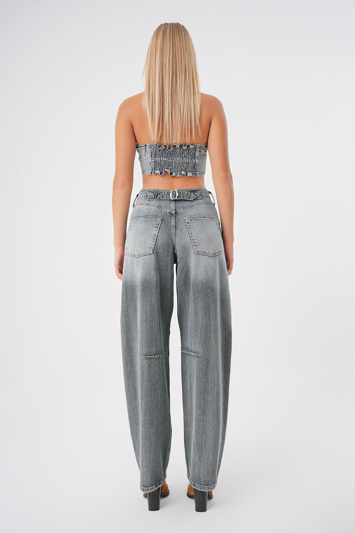 Gri Mavi Ayarlanabilir Tokali Yuksek Bel Baggy Skater Jean