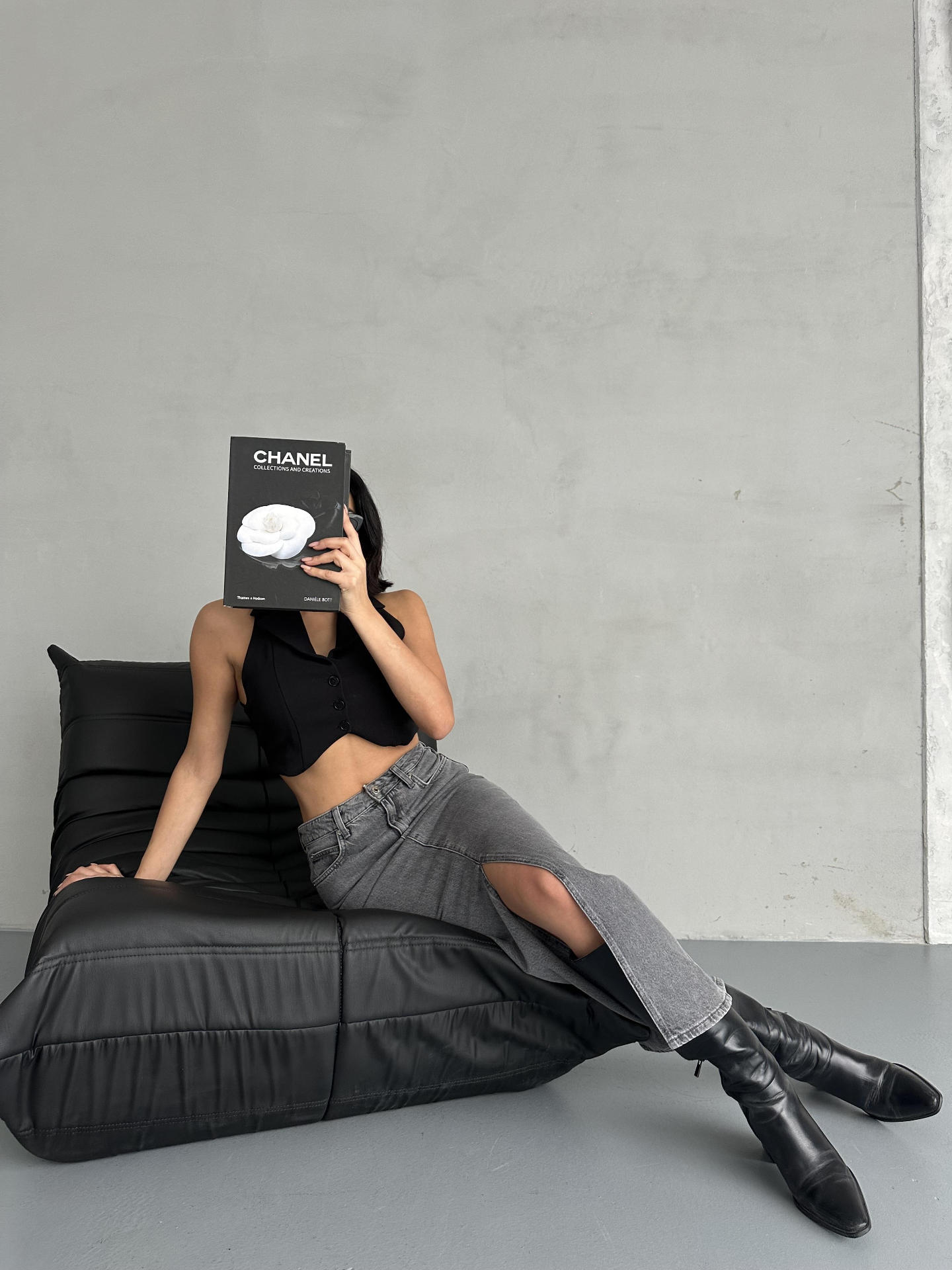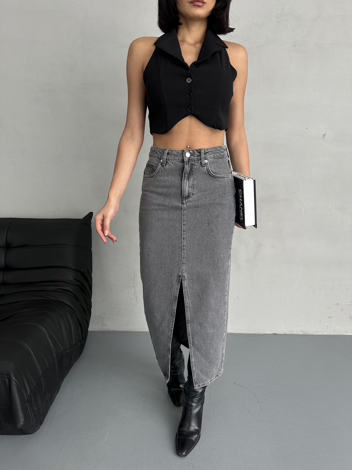 Gri Ön Yırtmaç Detaylı Jean Etek