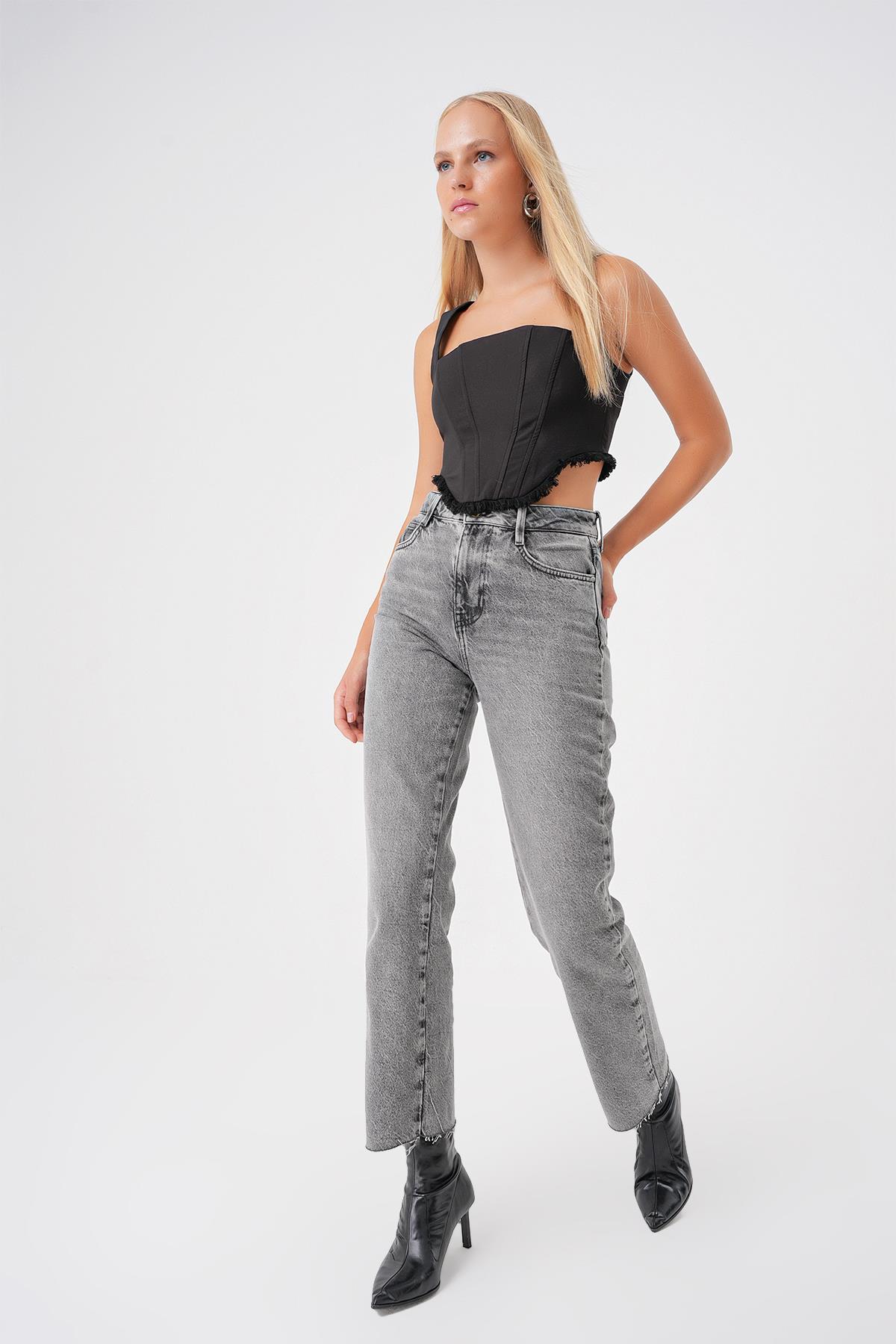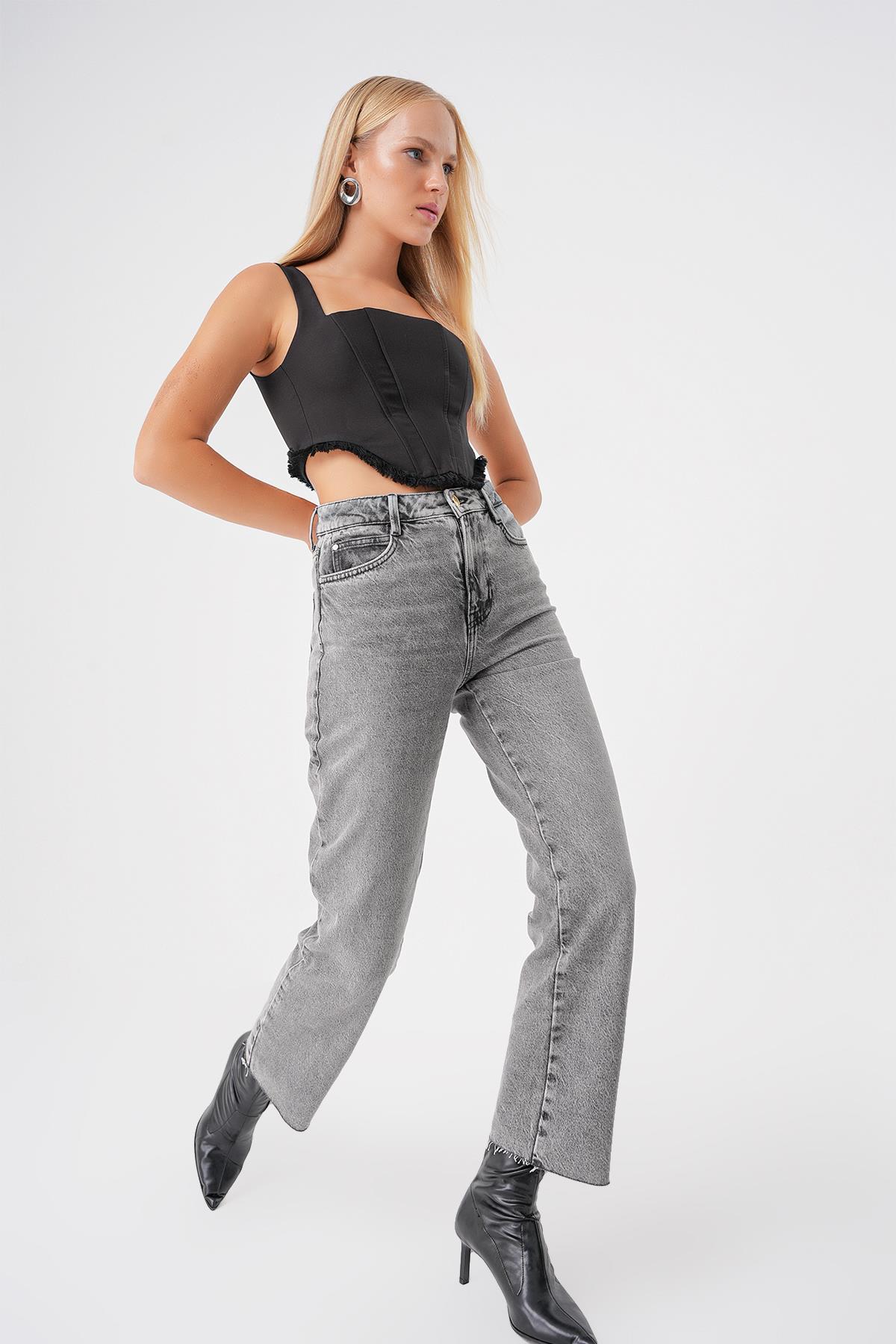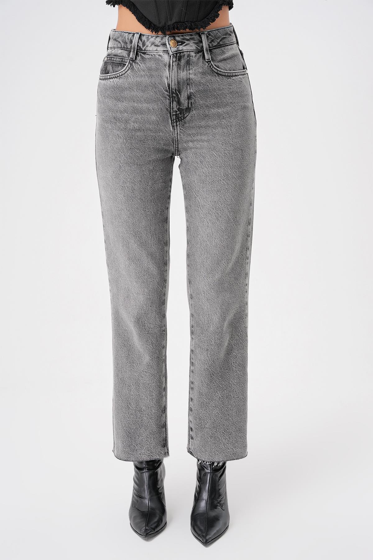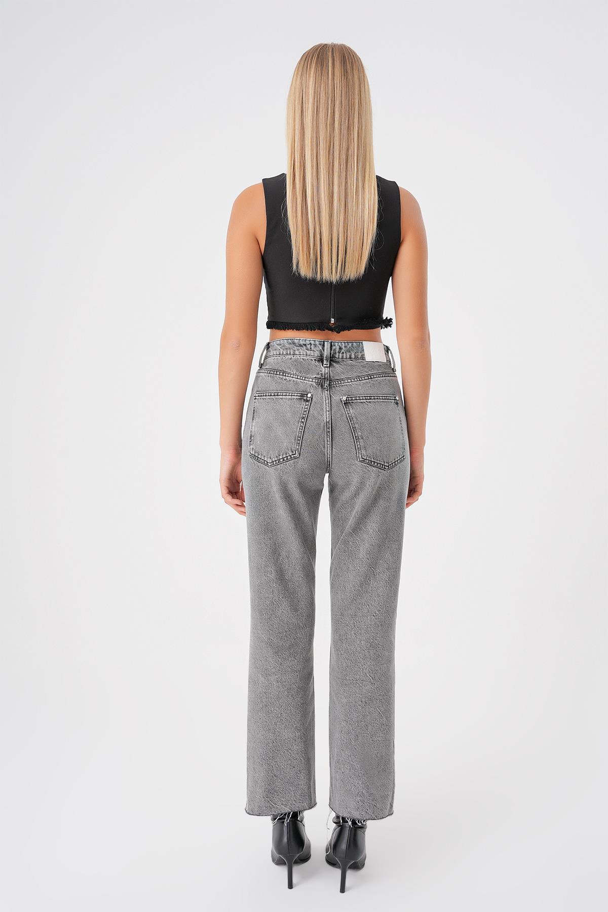 Gri Yüksek Bel Paça Detayli Straight Fit Jean