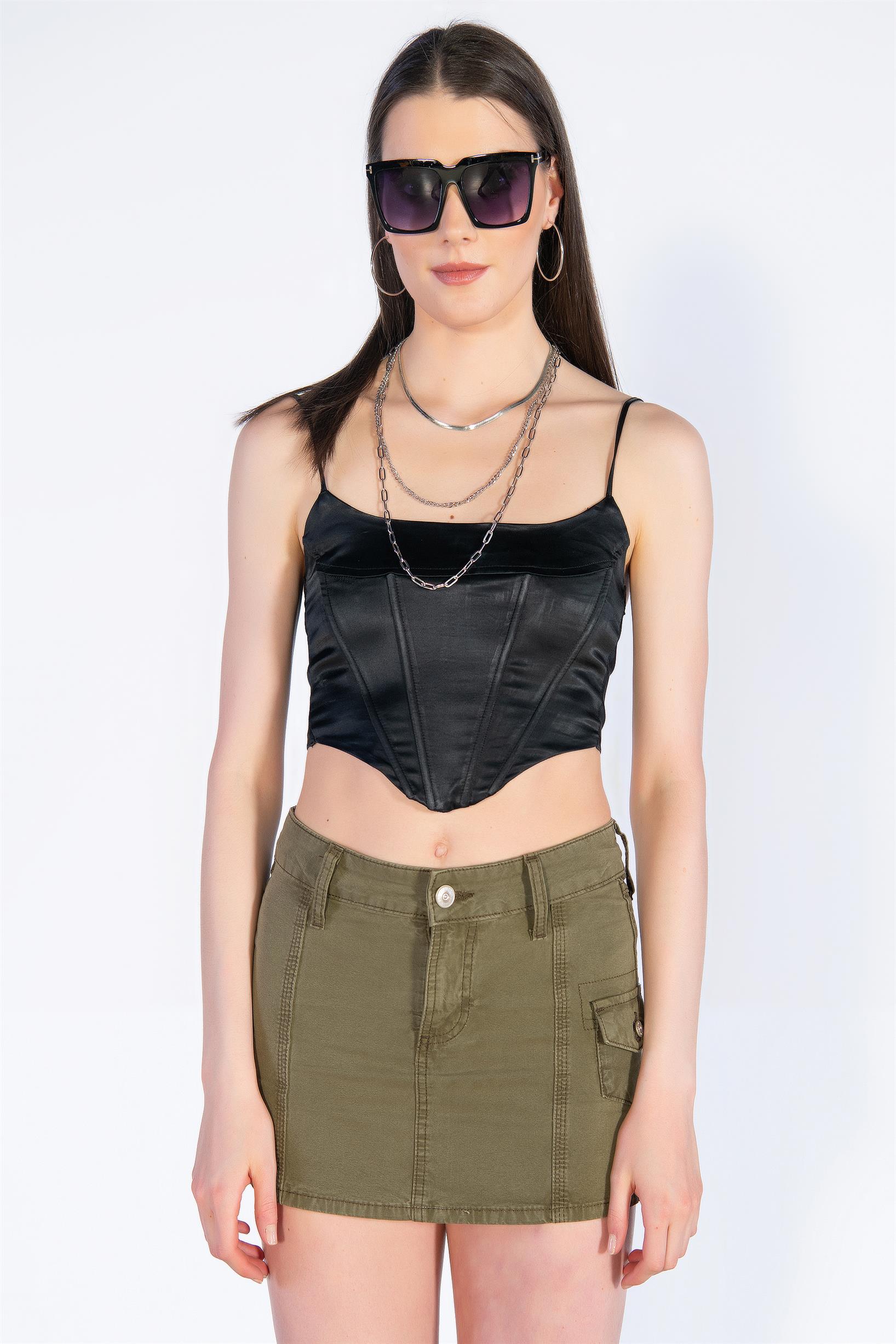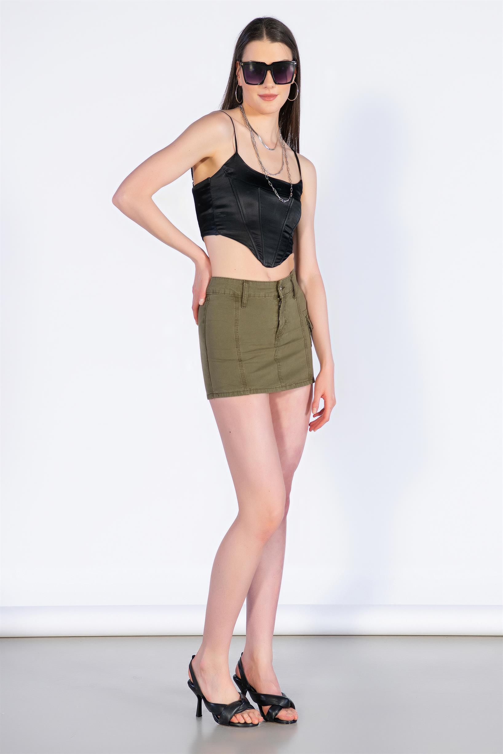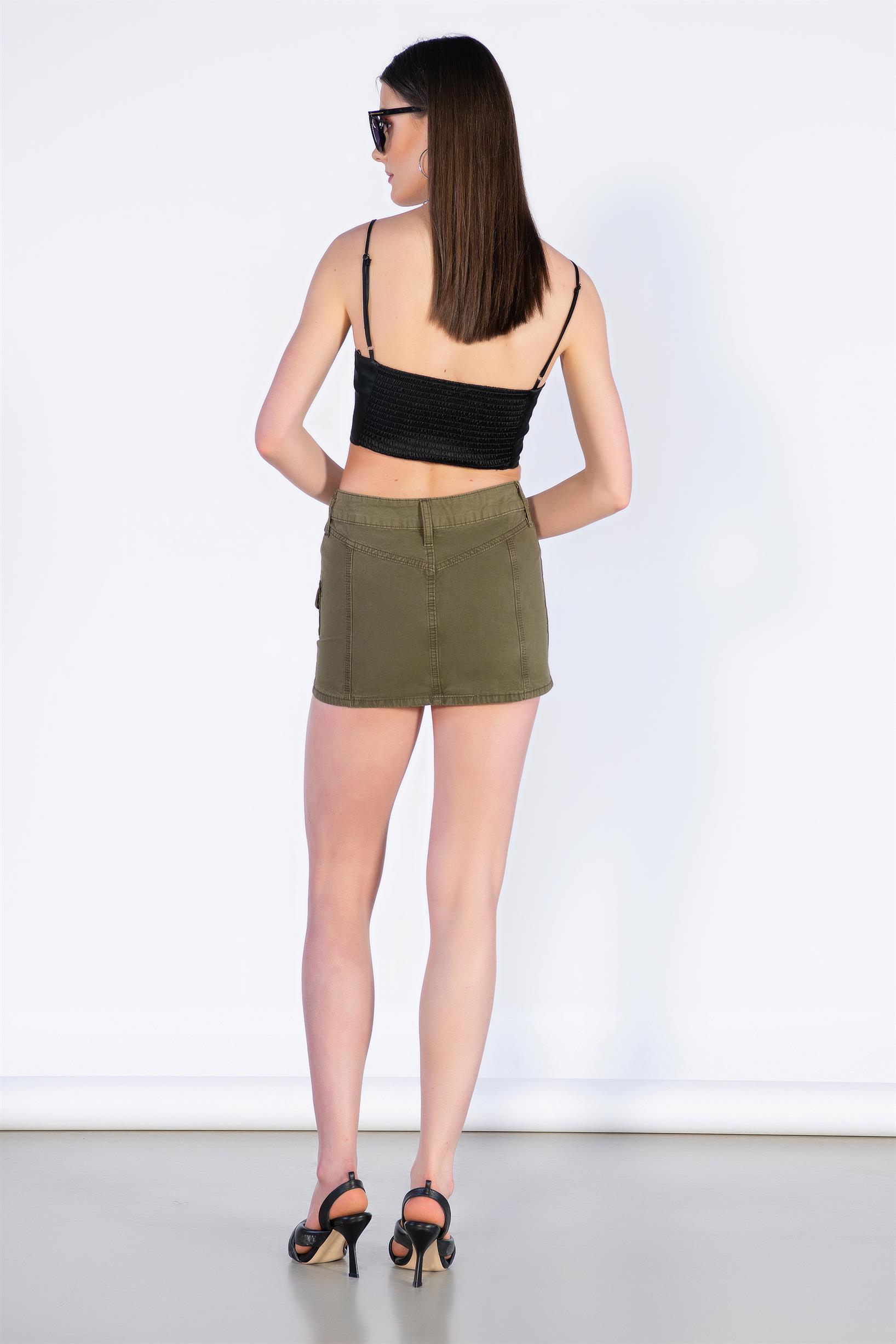 Haki Düşük Bel Denim Mini Kargo etek