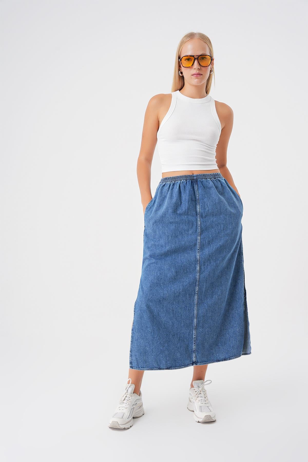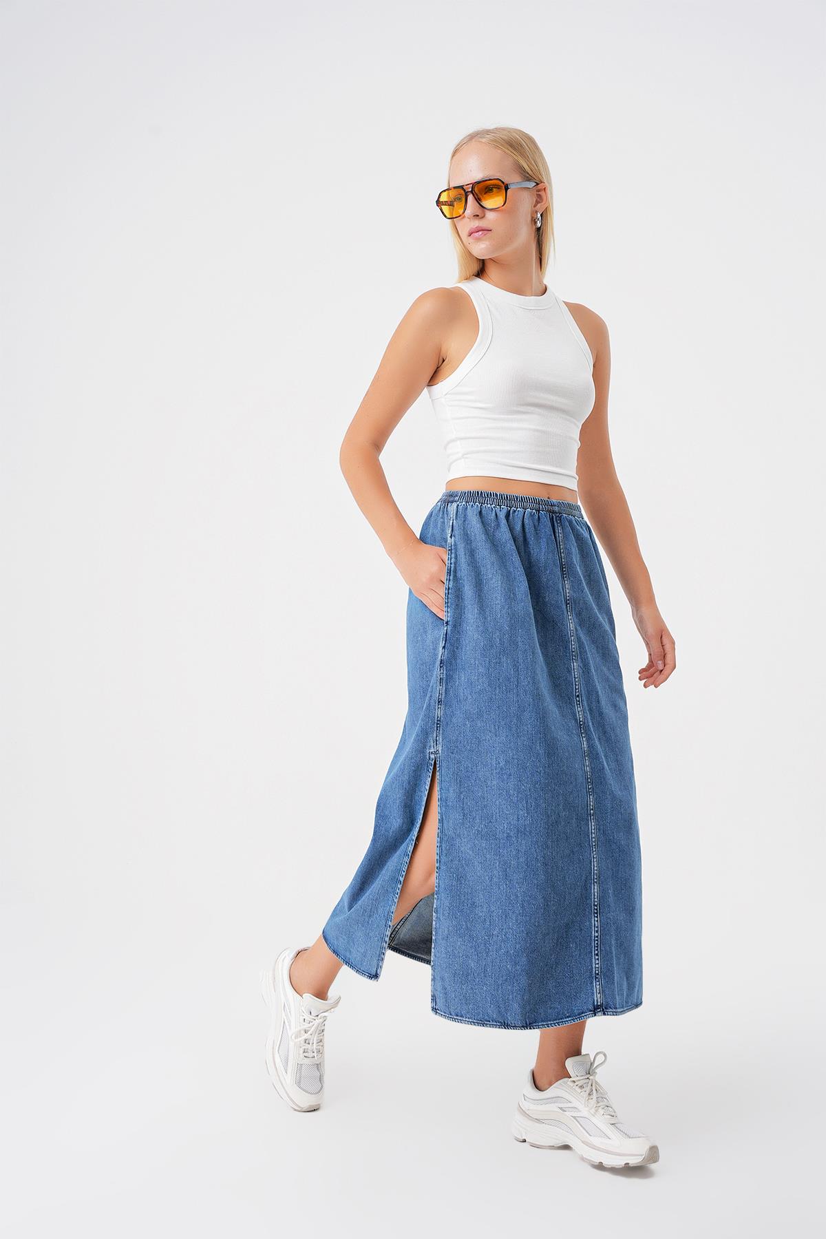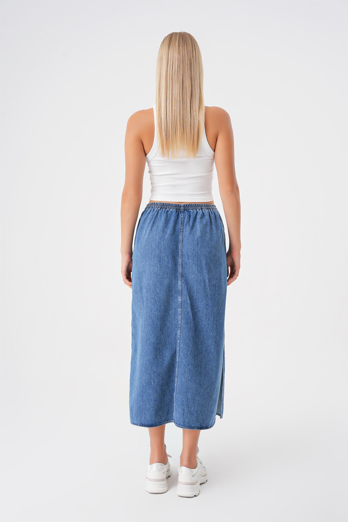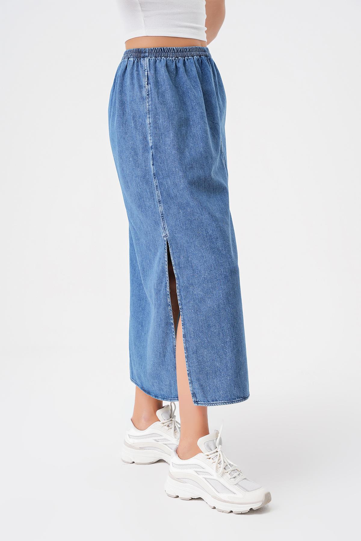 İndigo Beli Lastikli Yırtmaçlı Midi Denim Etek