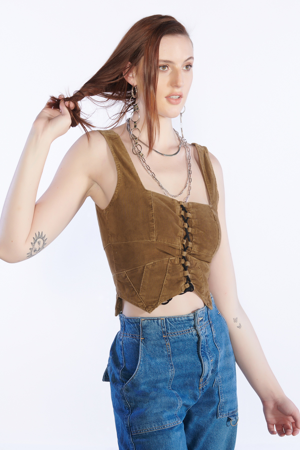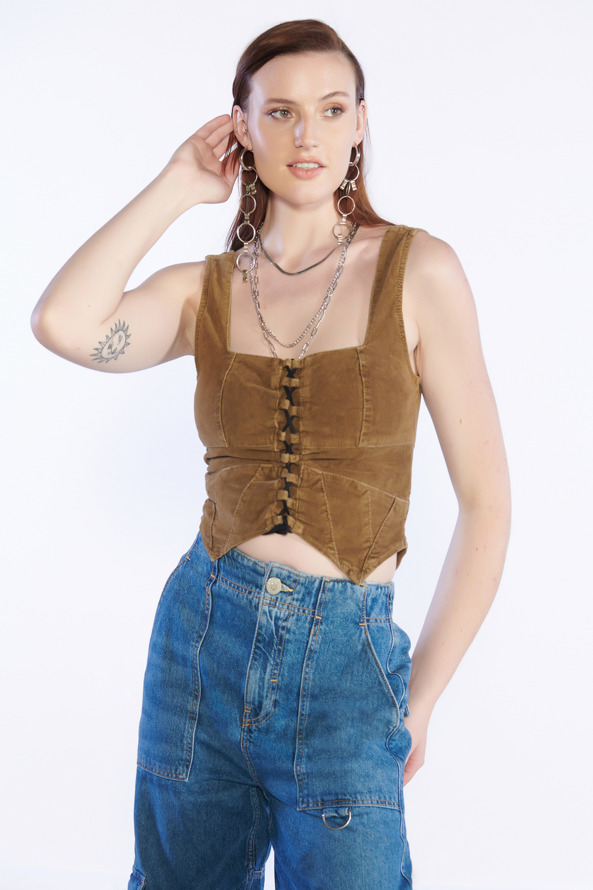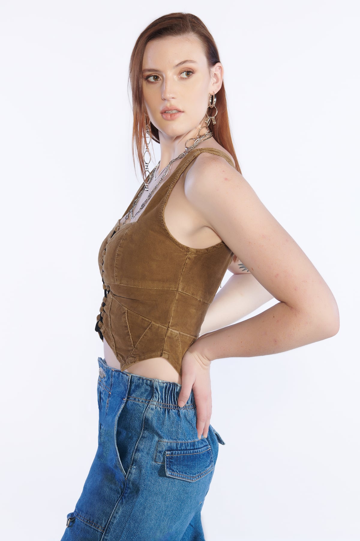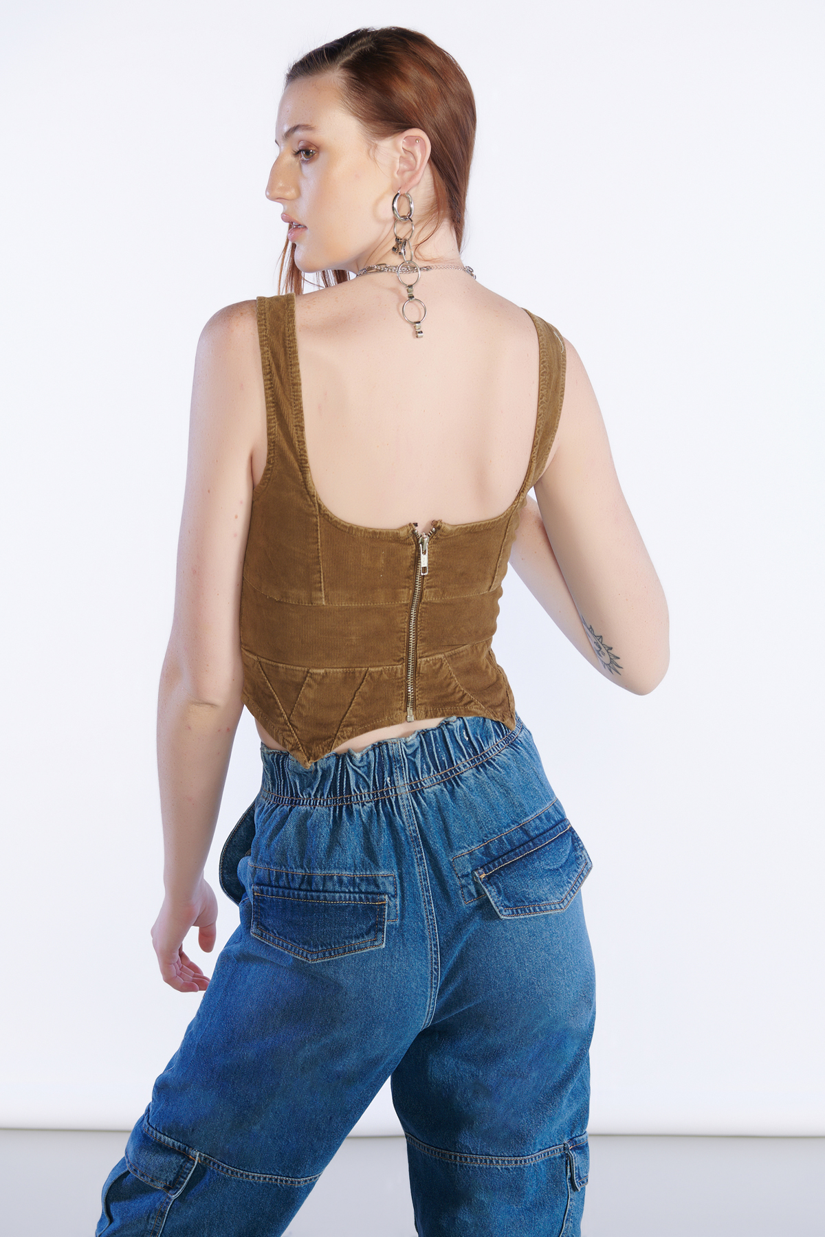 Kahverengi Bağcık ve Fermuar Kapamalı Askılı Kadife Bustiyer