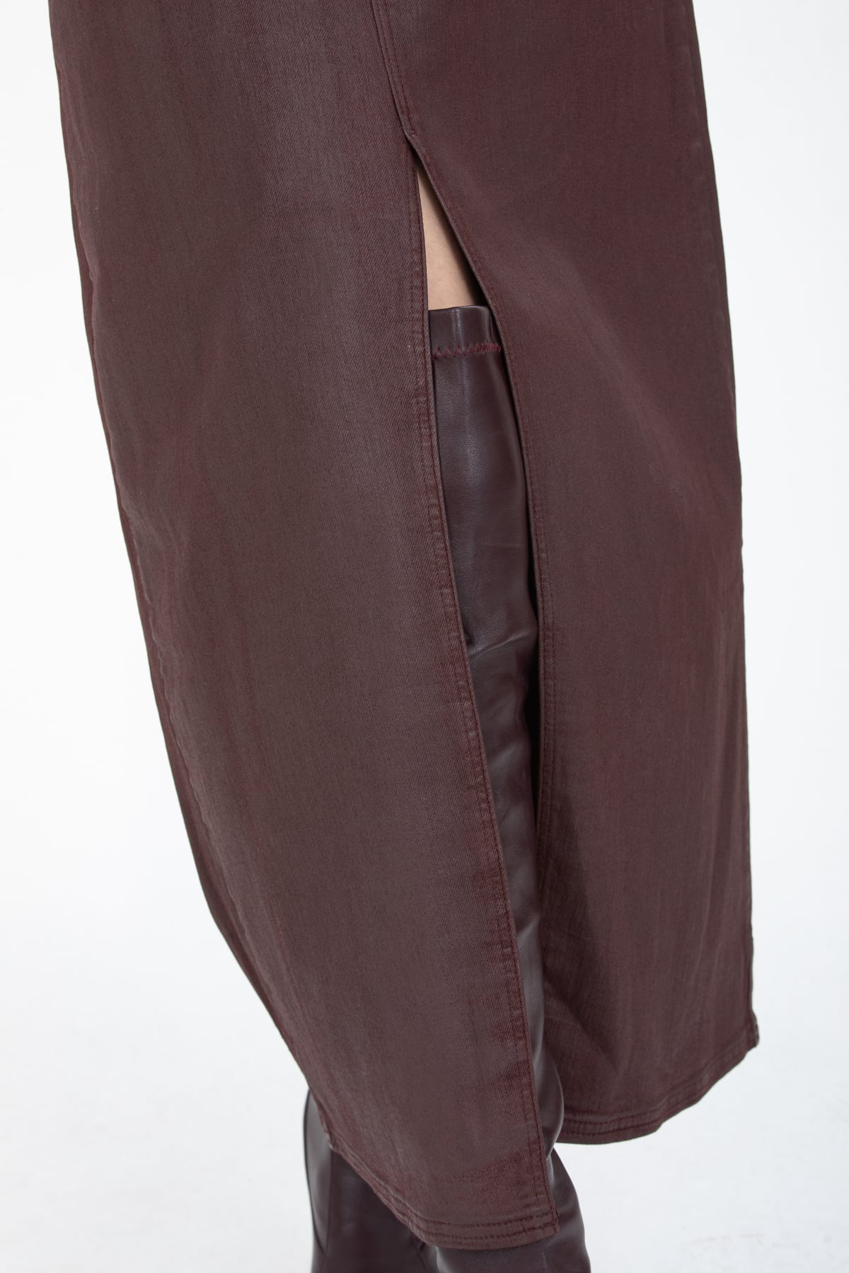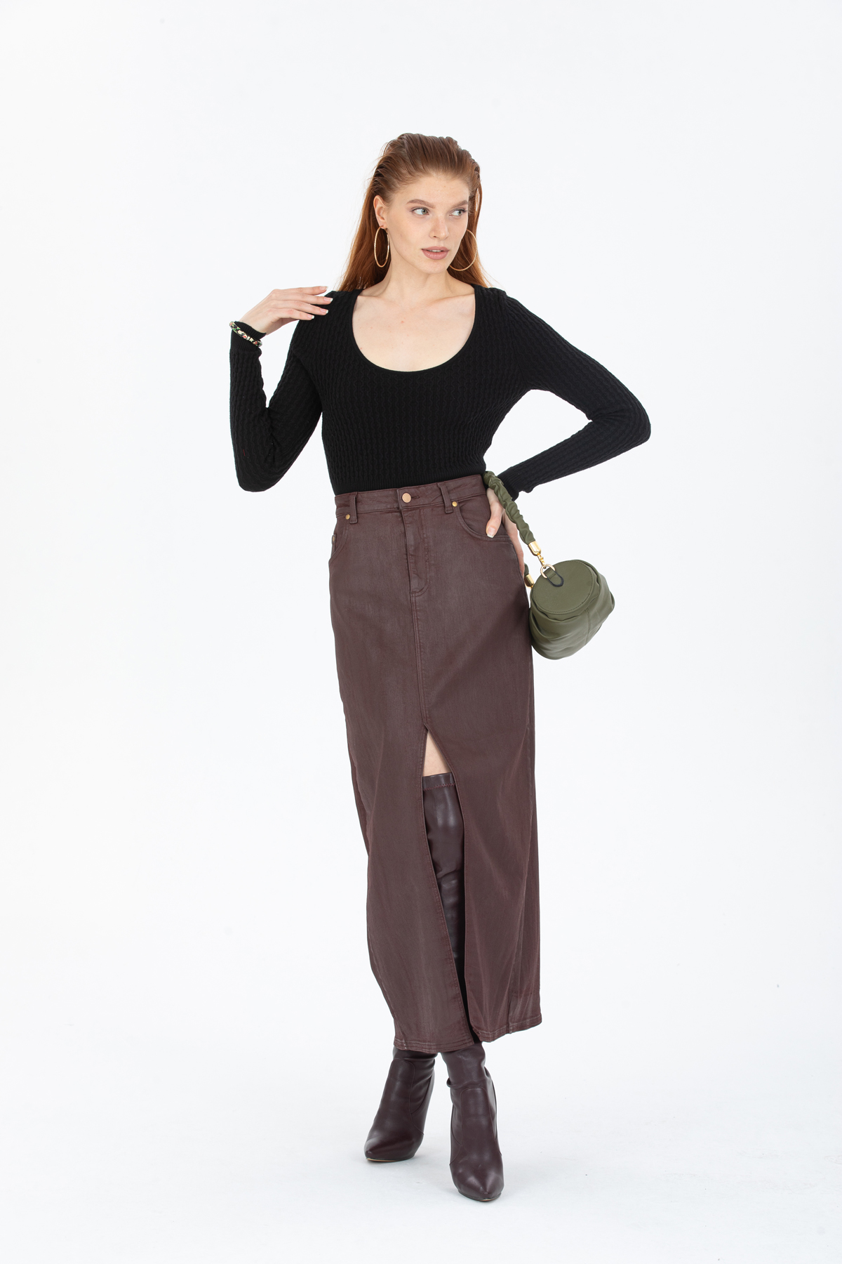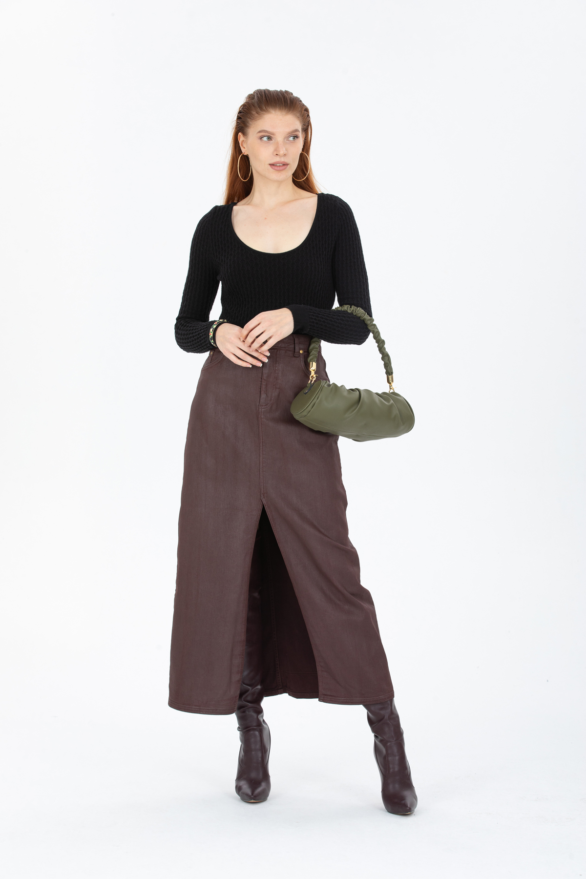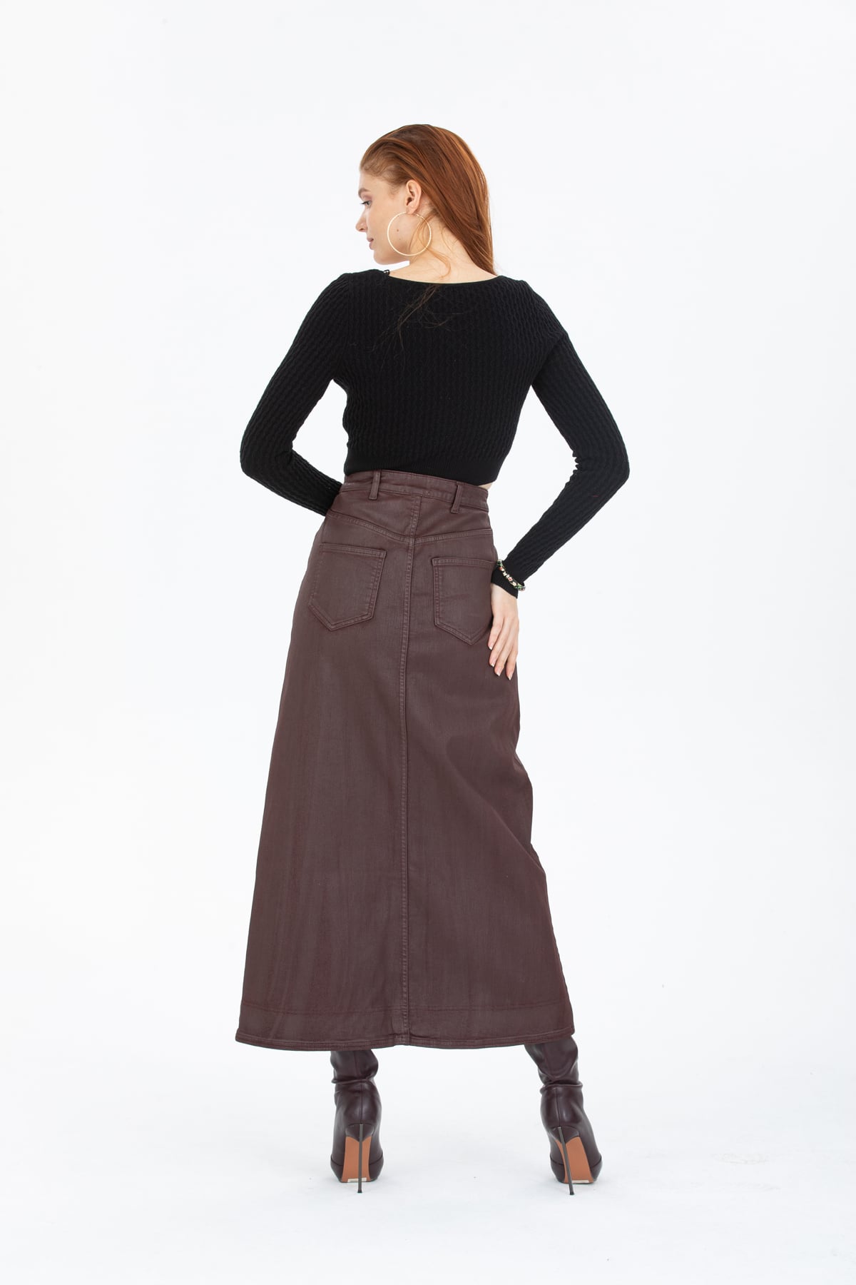 Kahverengi Mum Kaplama Denim Yırtmaçlı Detaylı Etek