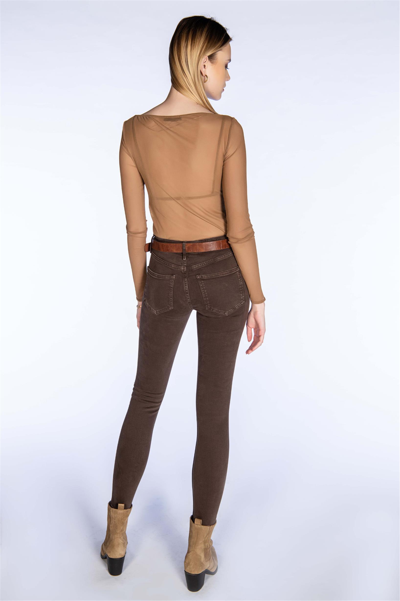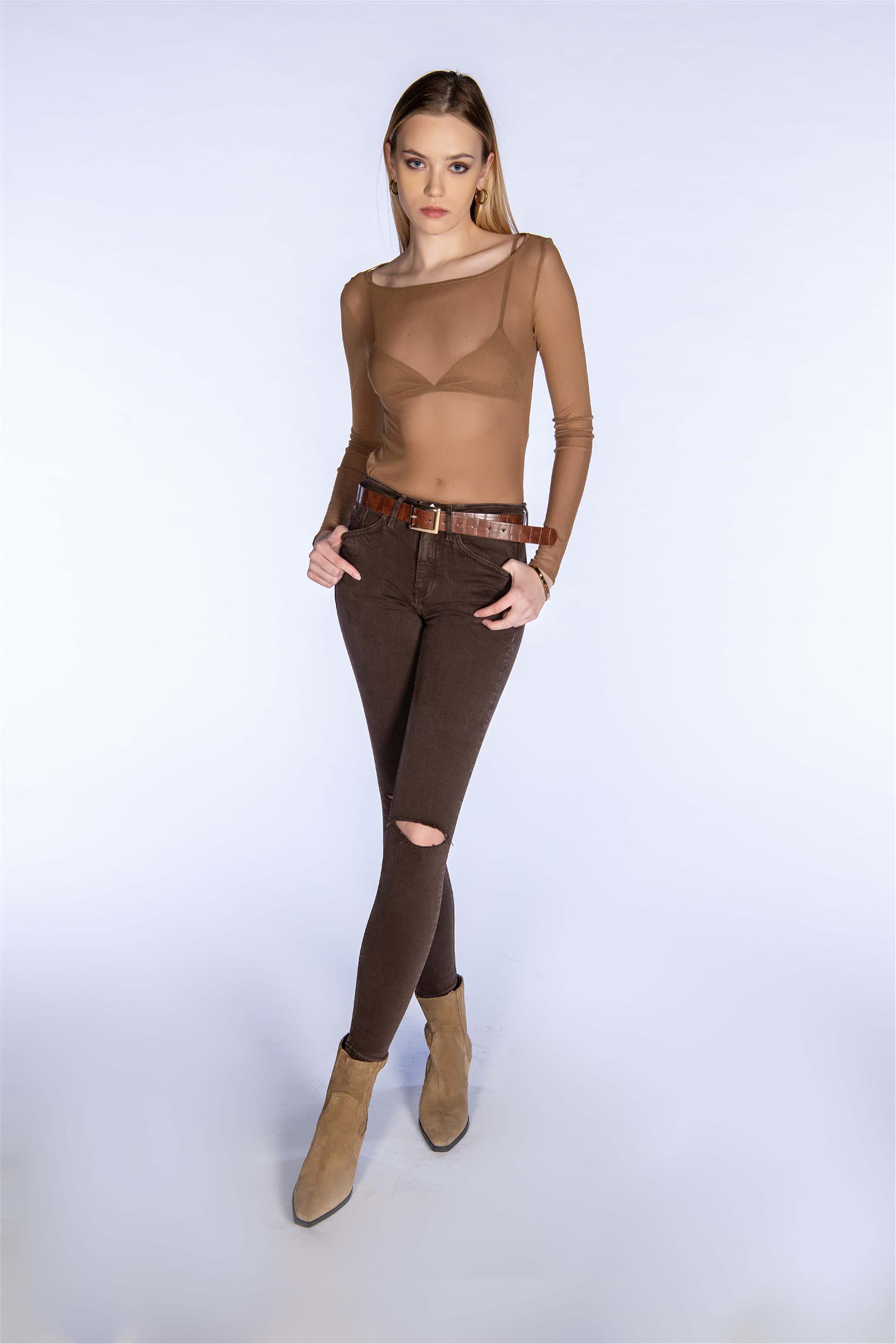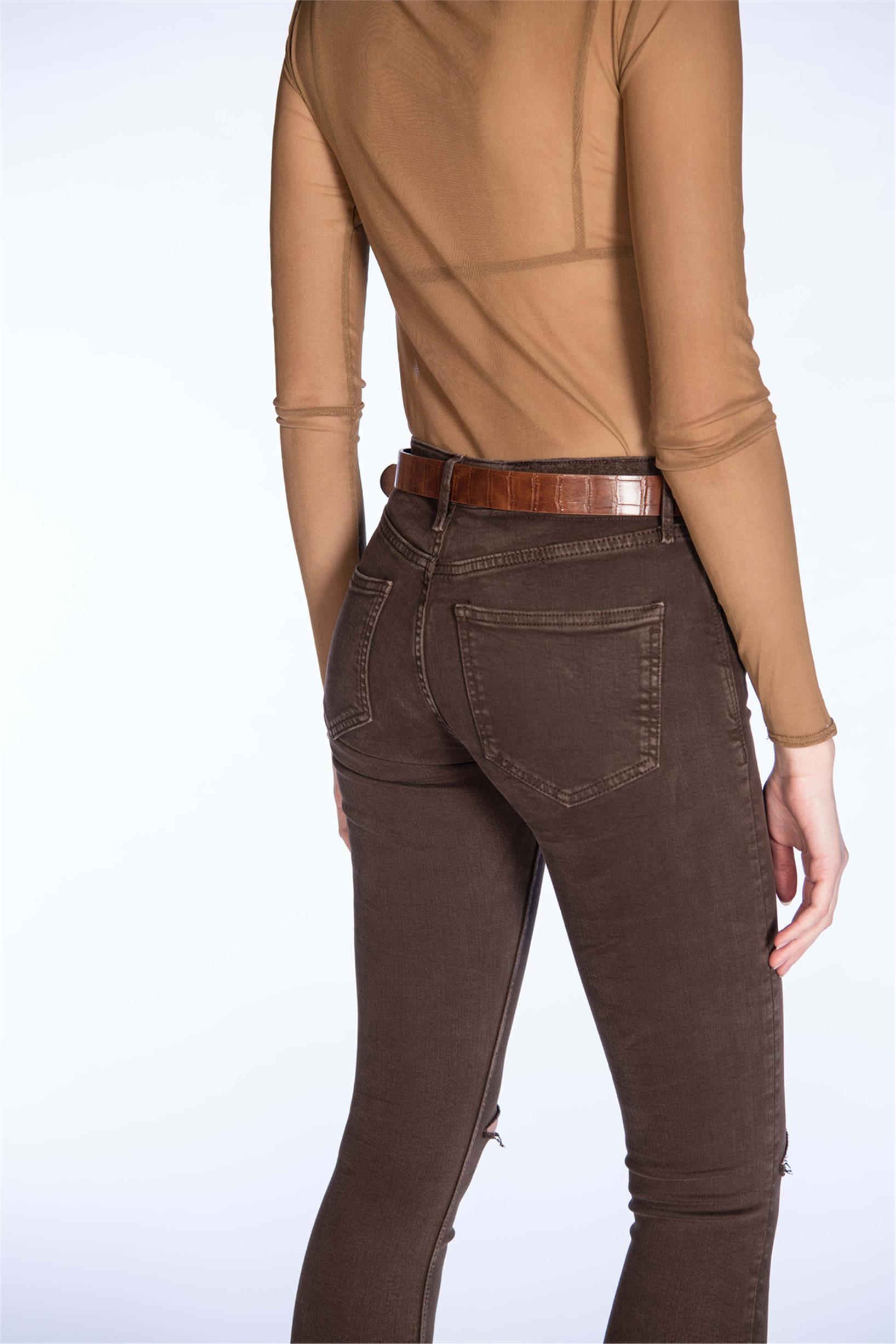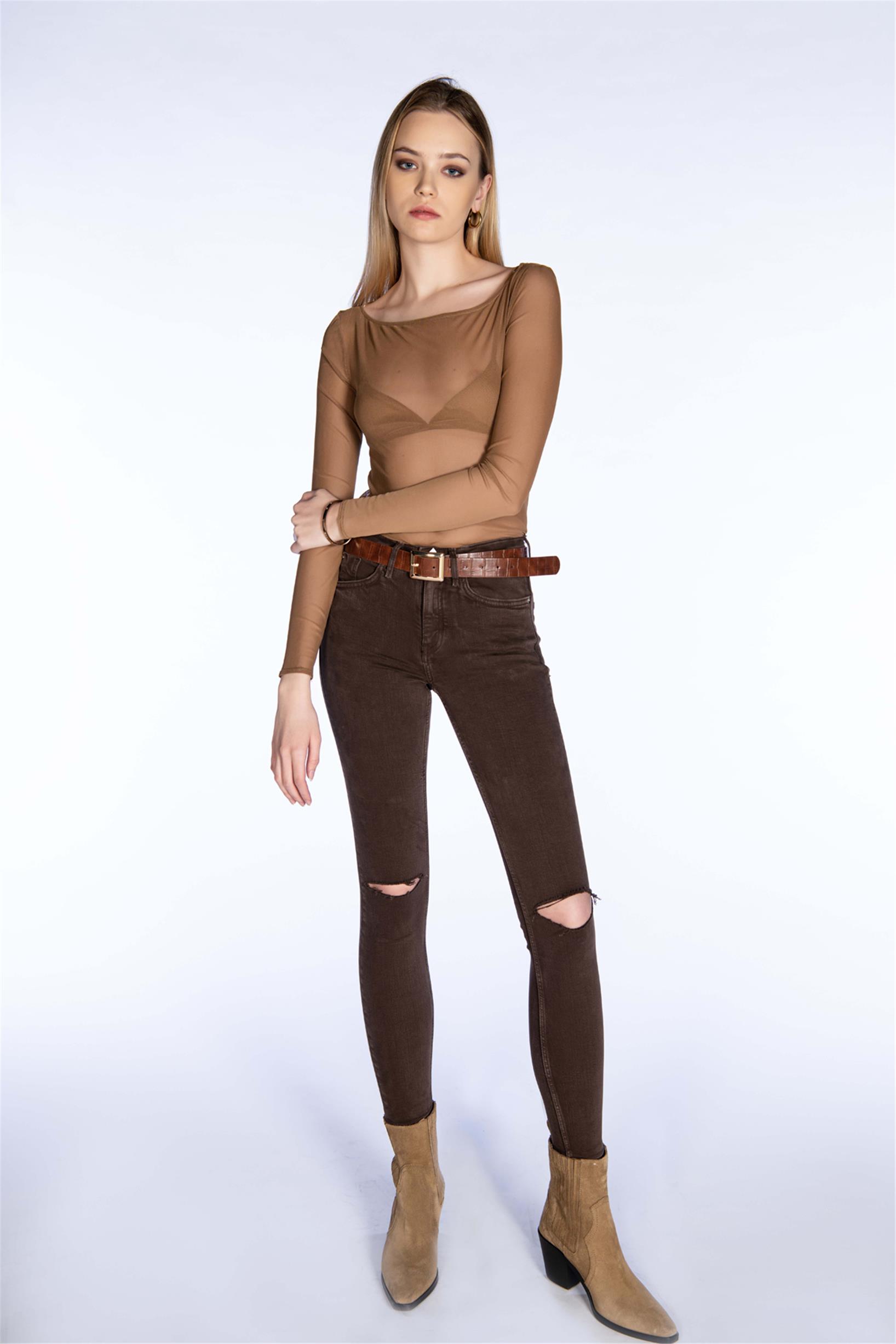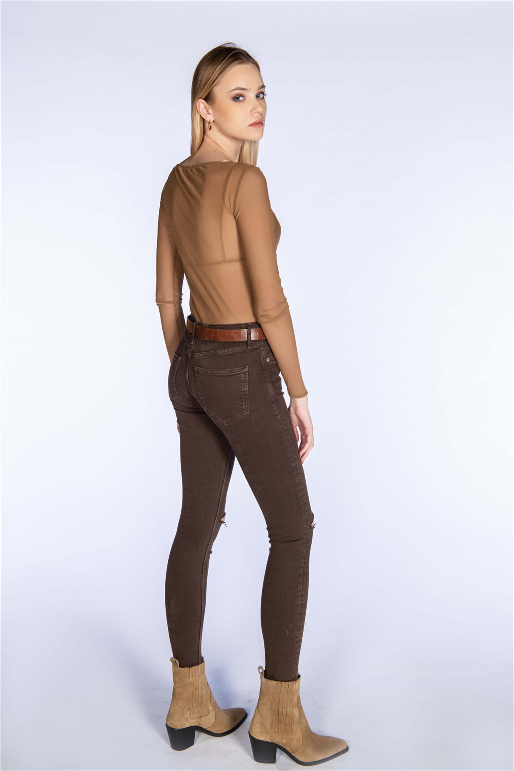 Kahverengi Yüksek Bel Diz Kesik Skinny Jeans