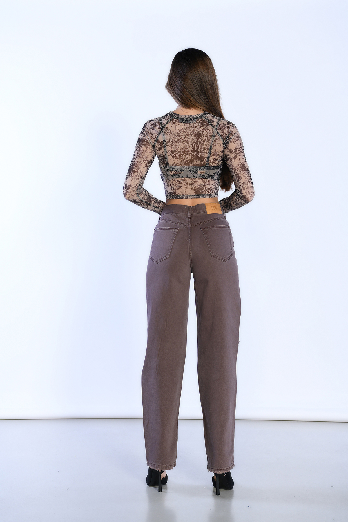Kahverengi Yüksek Bel Lazer Detaylı Wide Leg Jeans