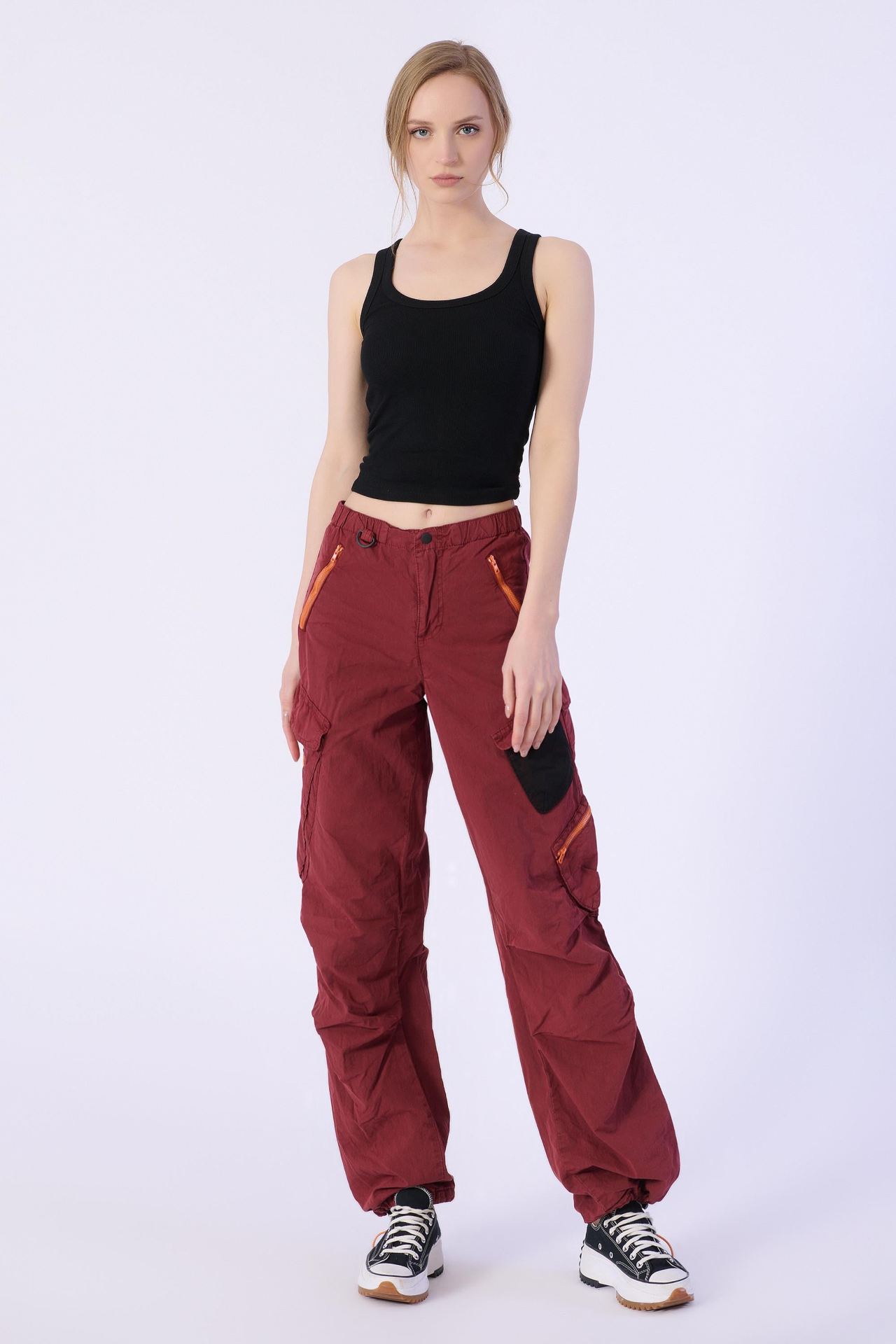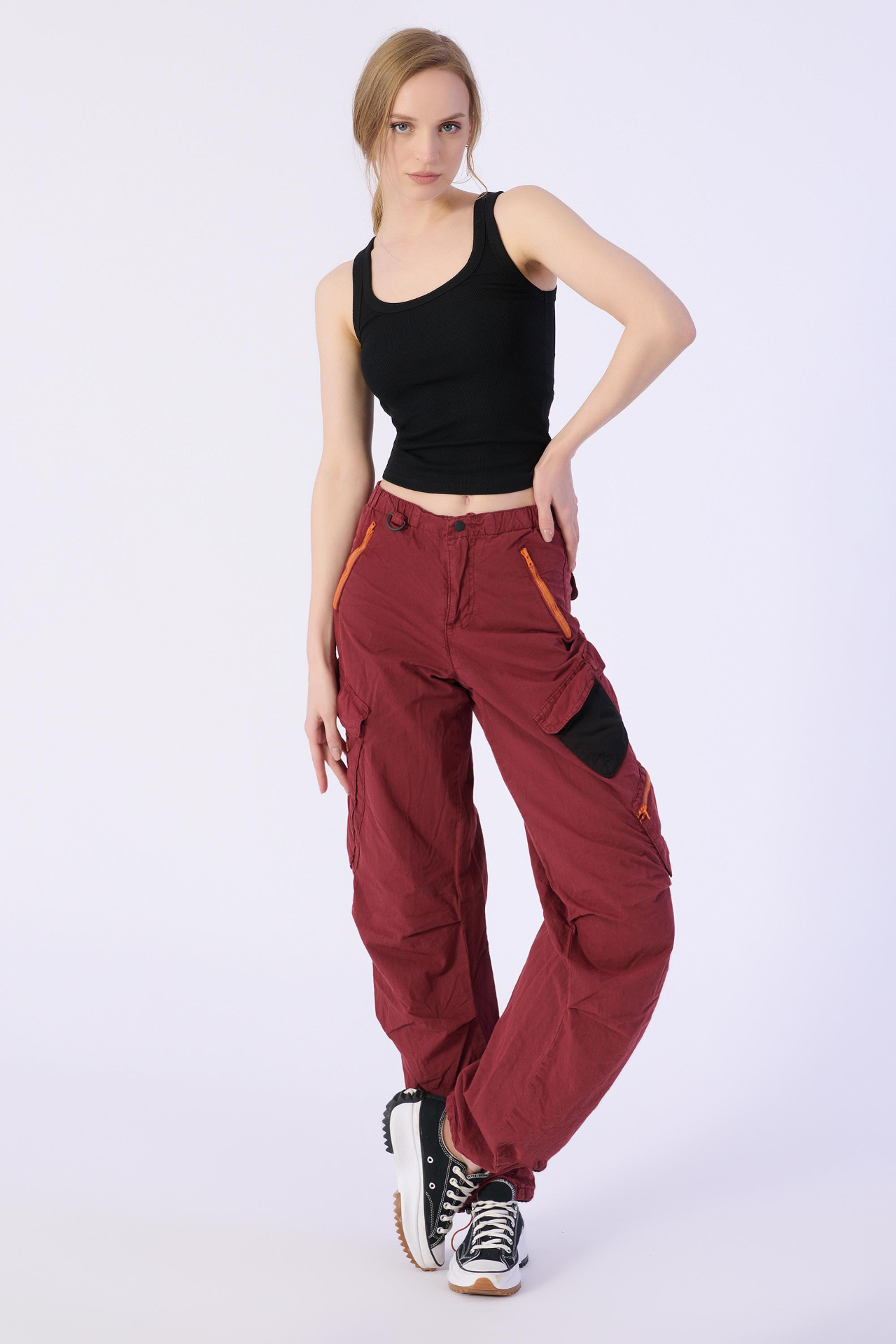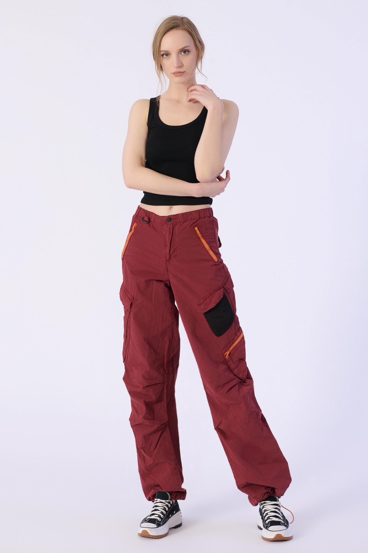 Kırmızı Stoperli ve Büzgülü Paraşüt Kargo Pantolon