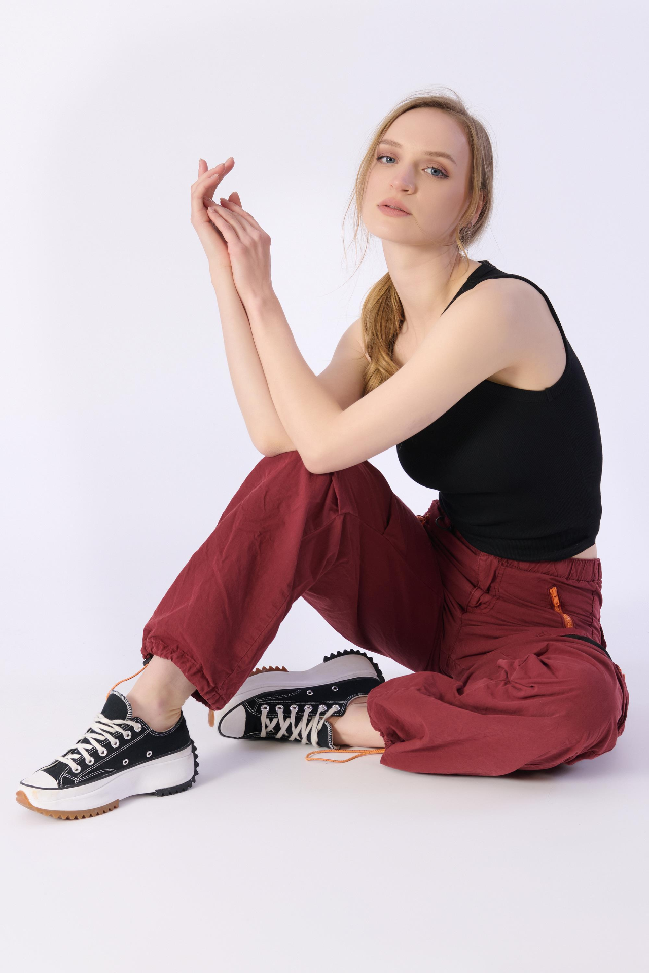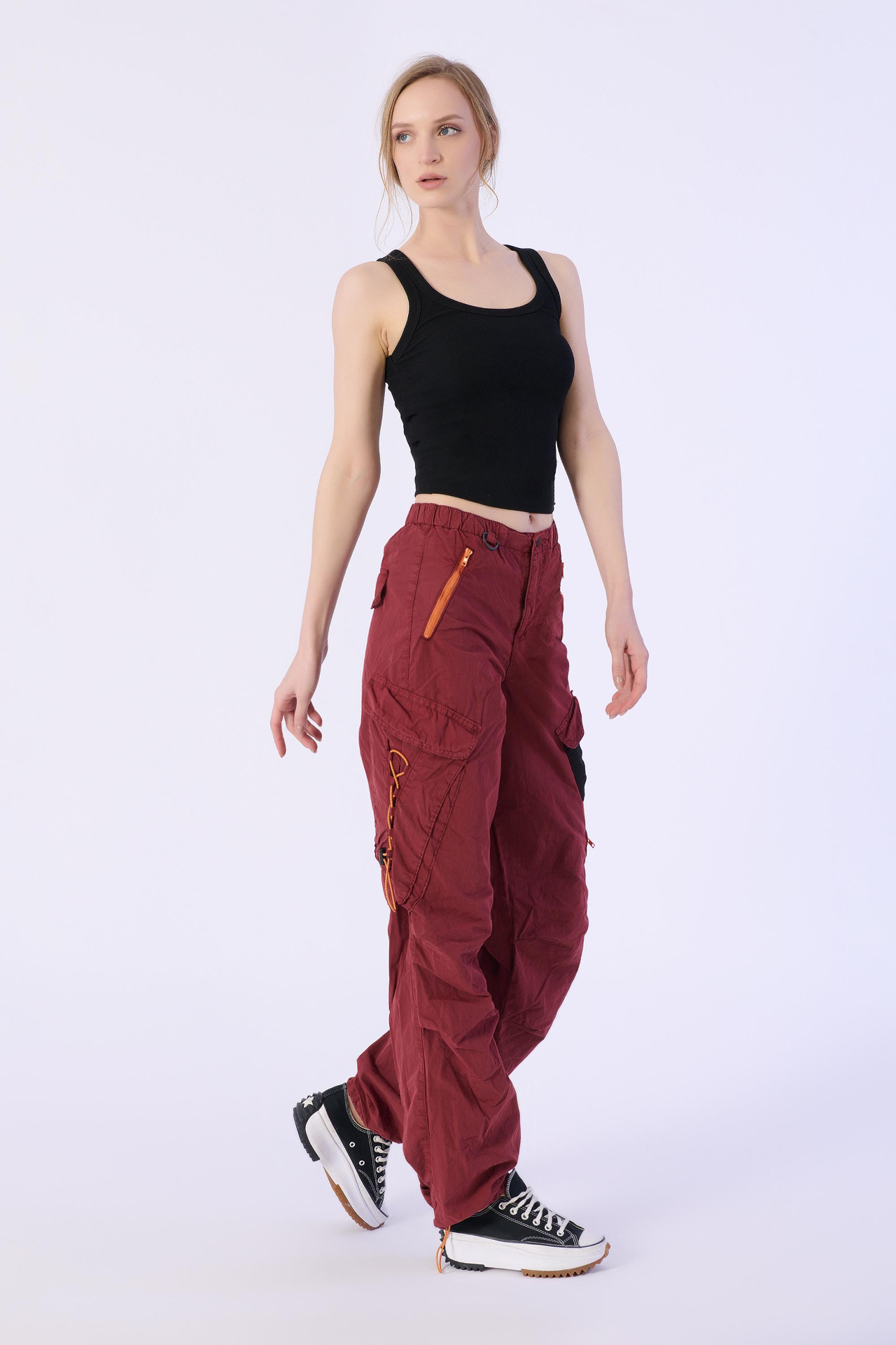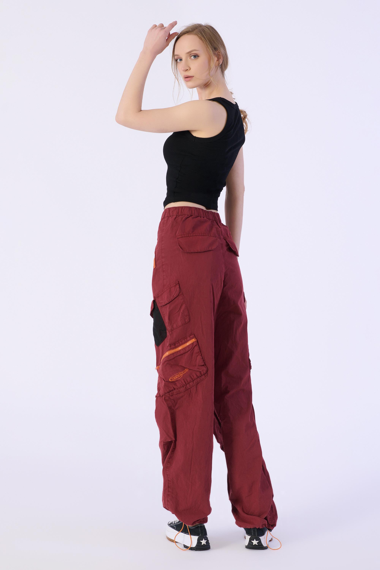Kırmızı Stoperli ve Büzgülü Paraşüt Kargo Pantolon