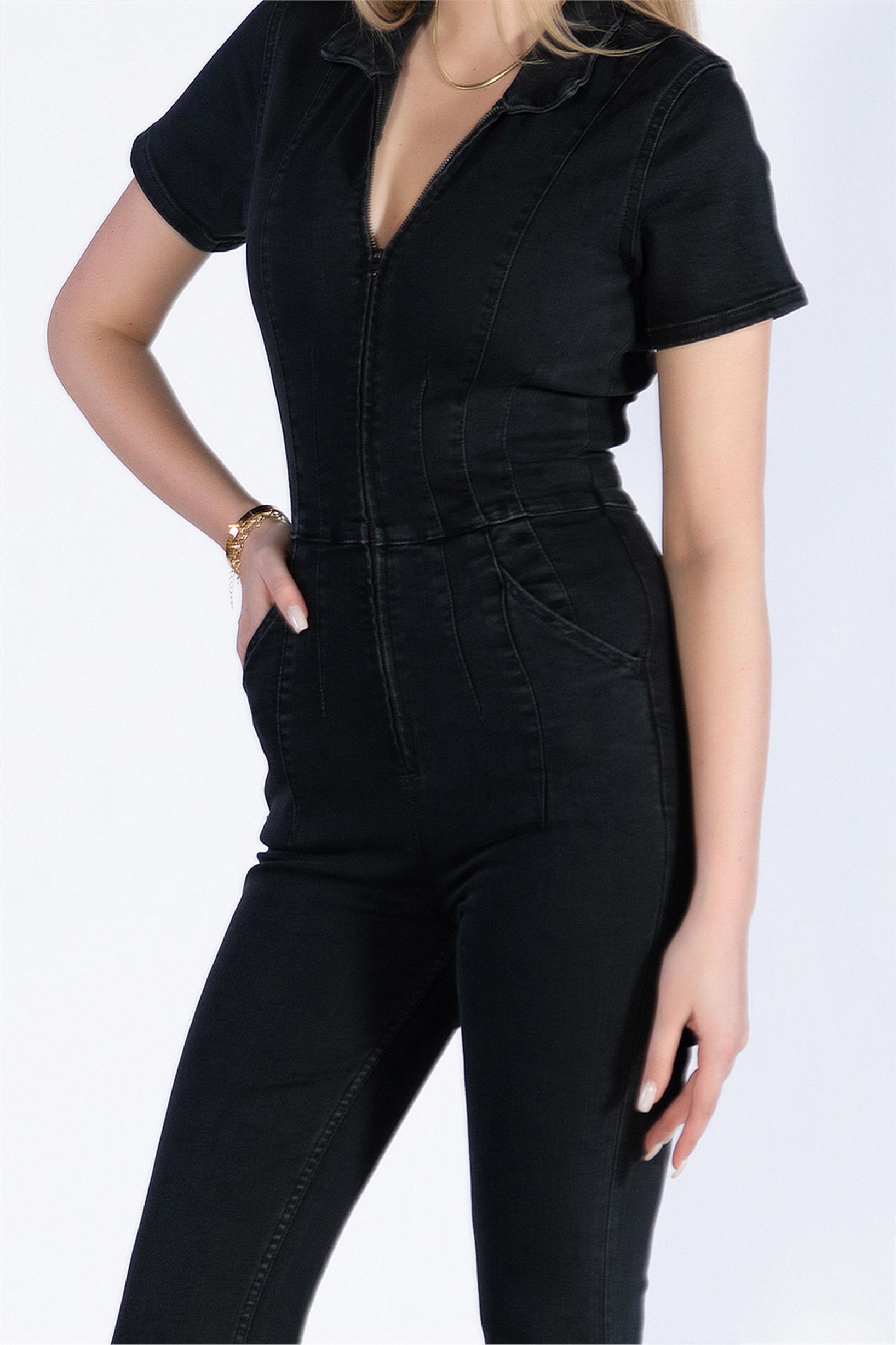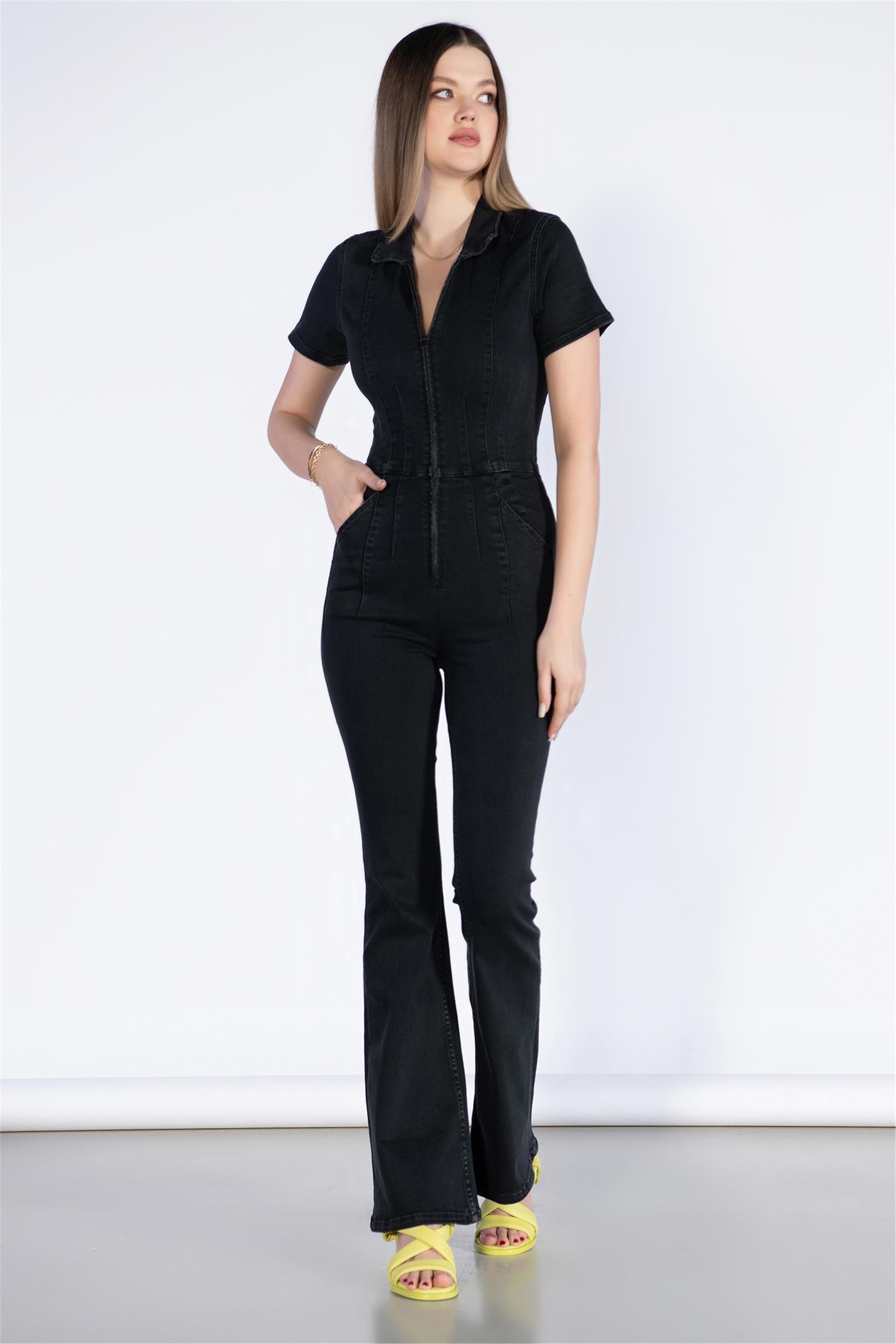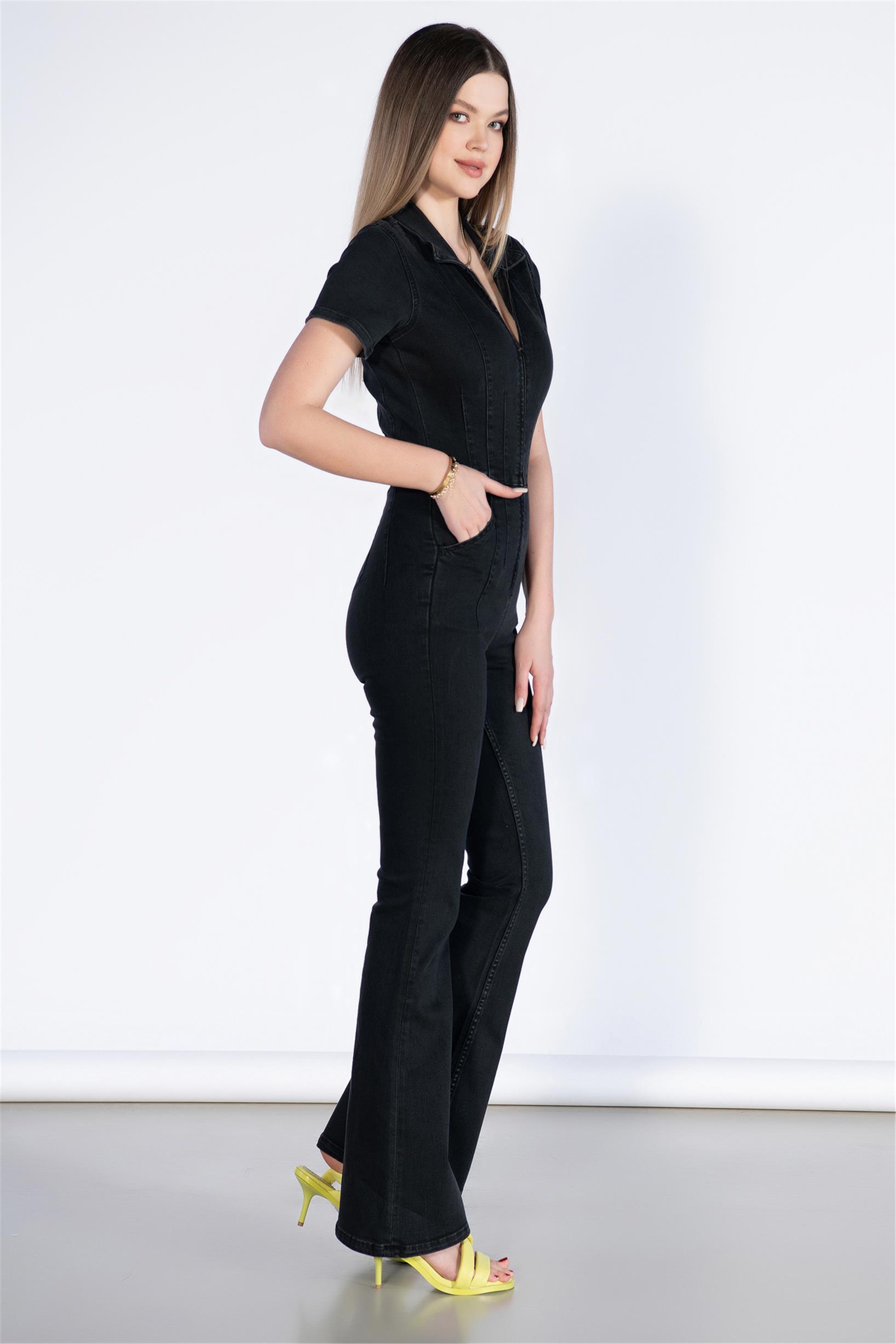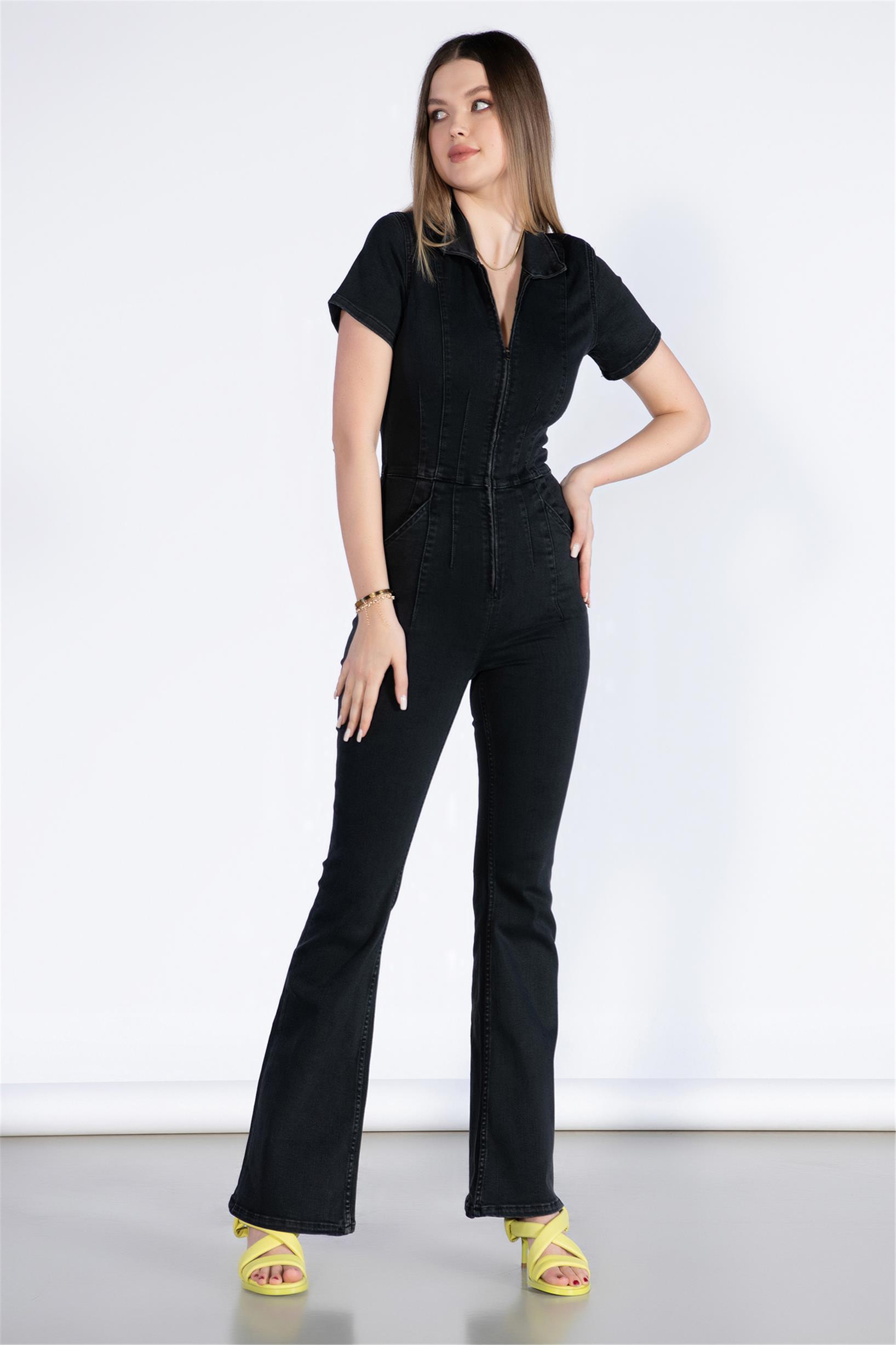 Kısa Kol Flare Paça Denim Tulum
