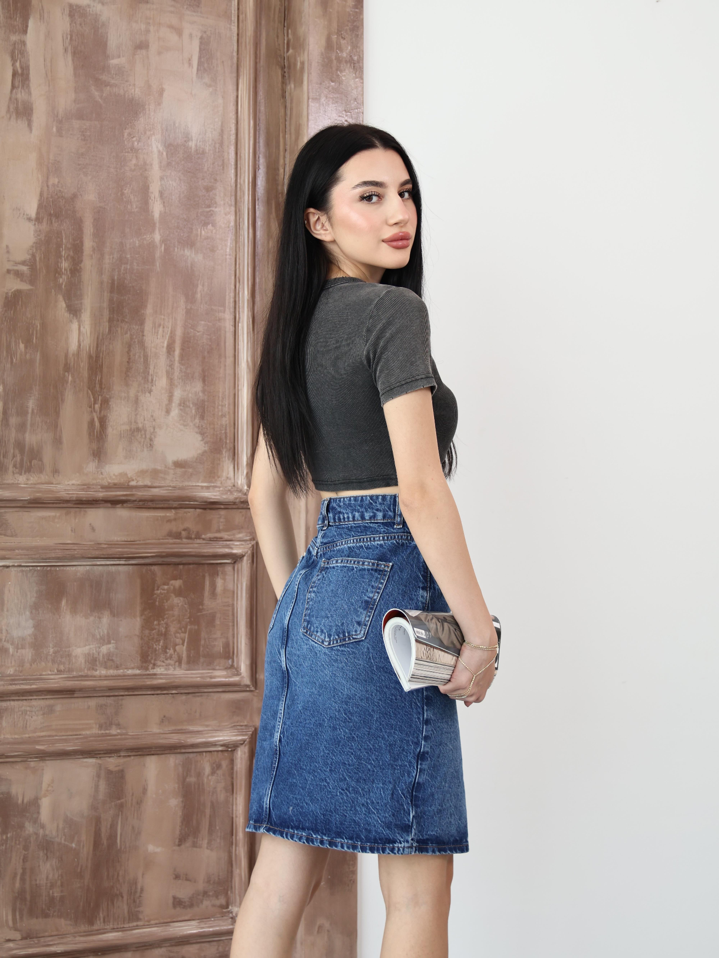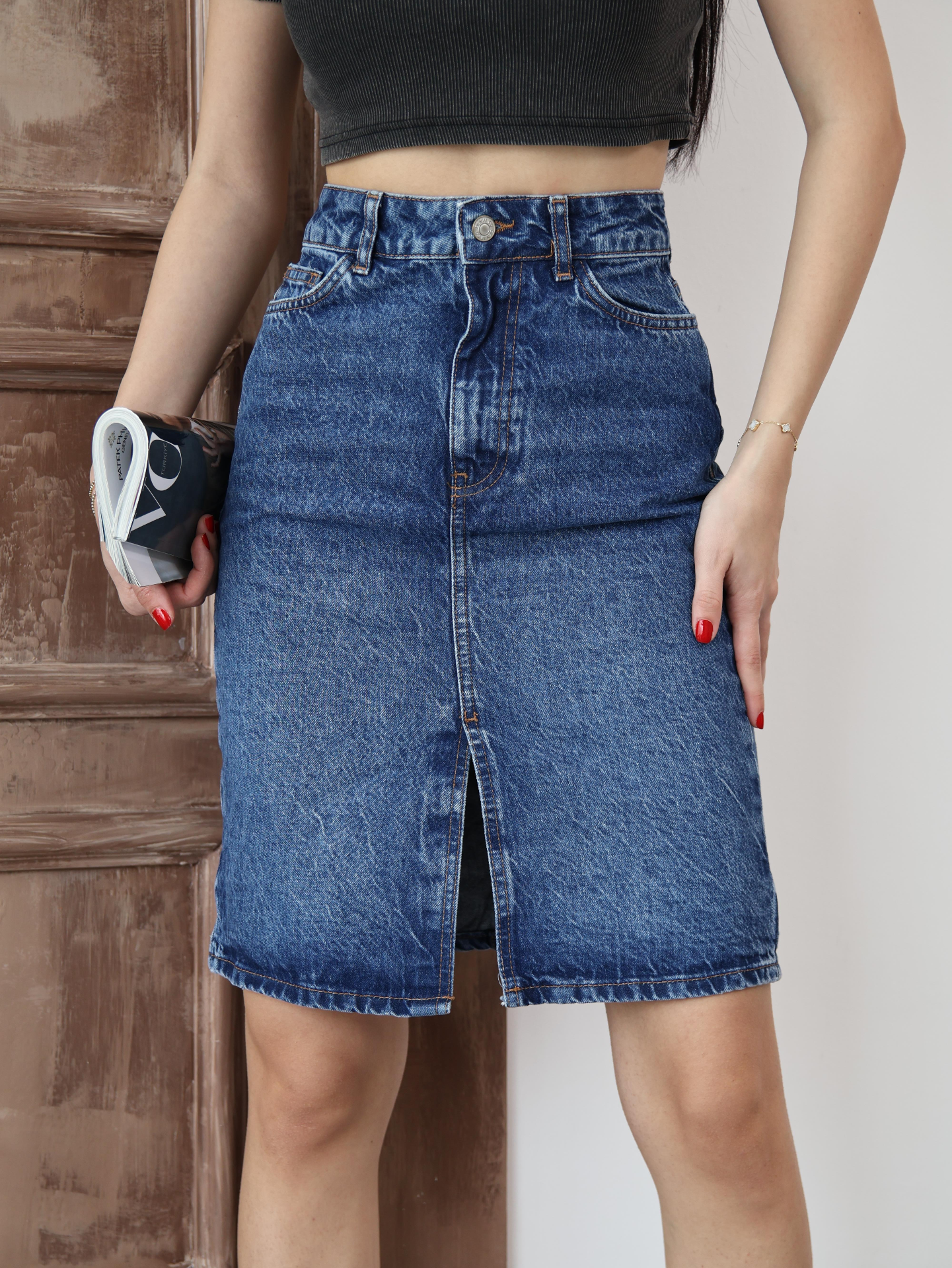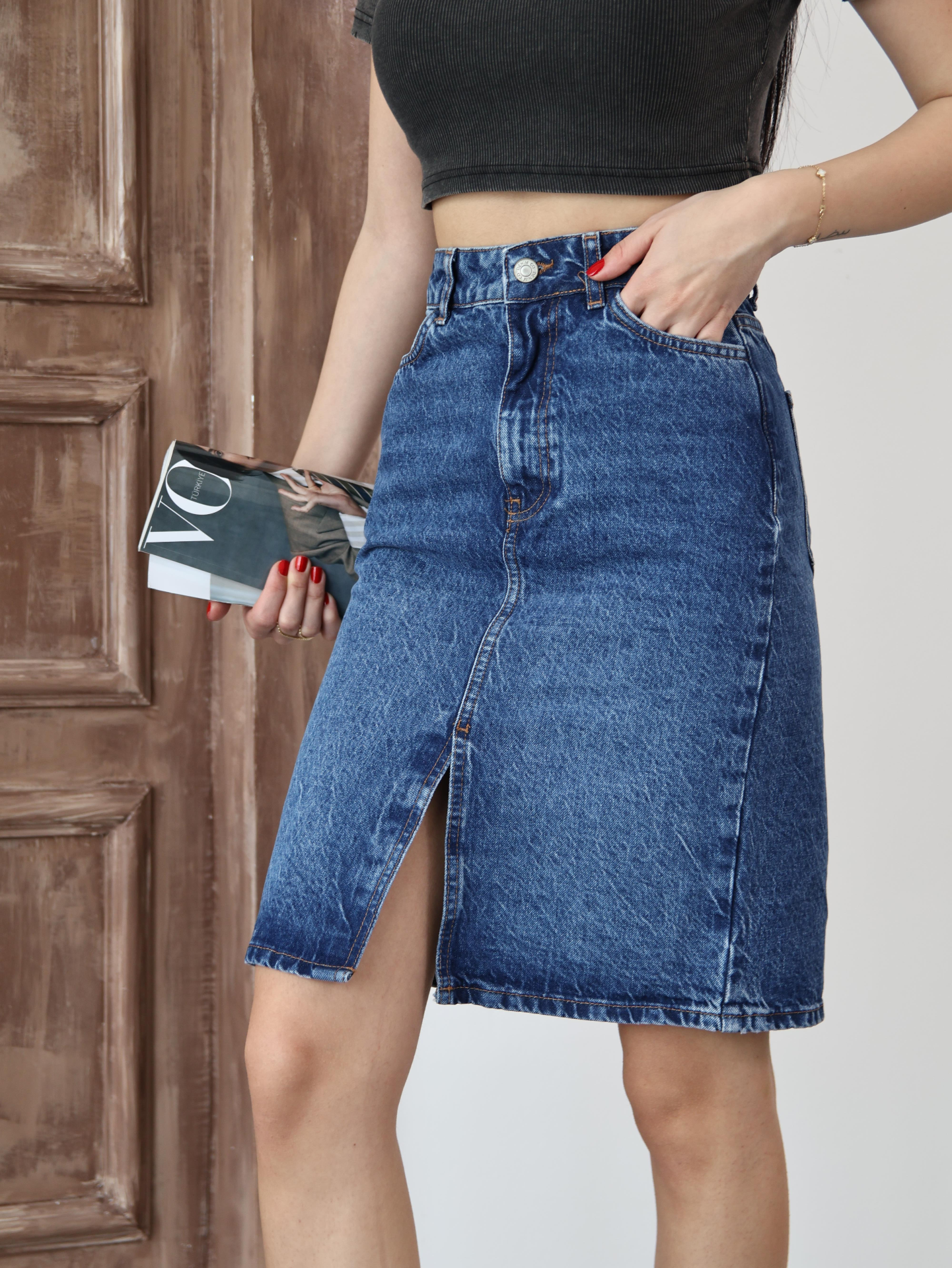 Koyu Mavi Yırtmaçlı Kot Etek