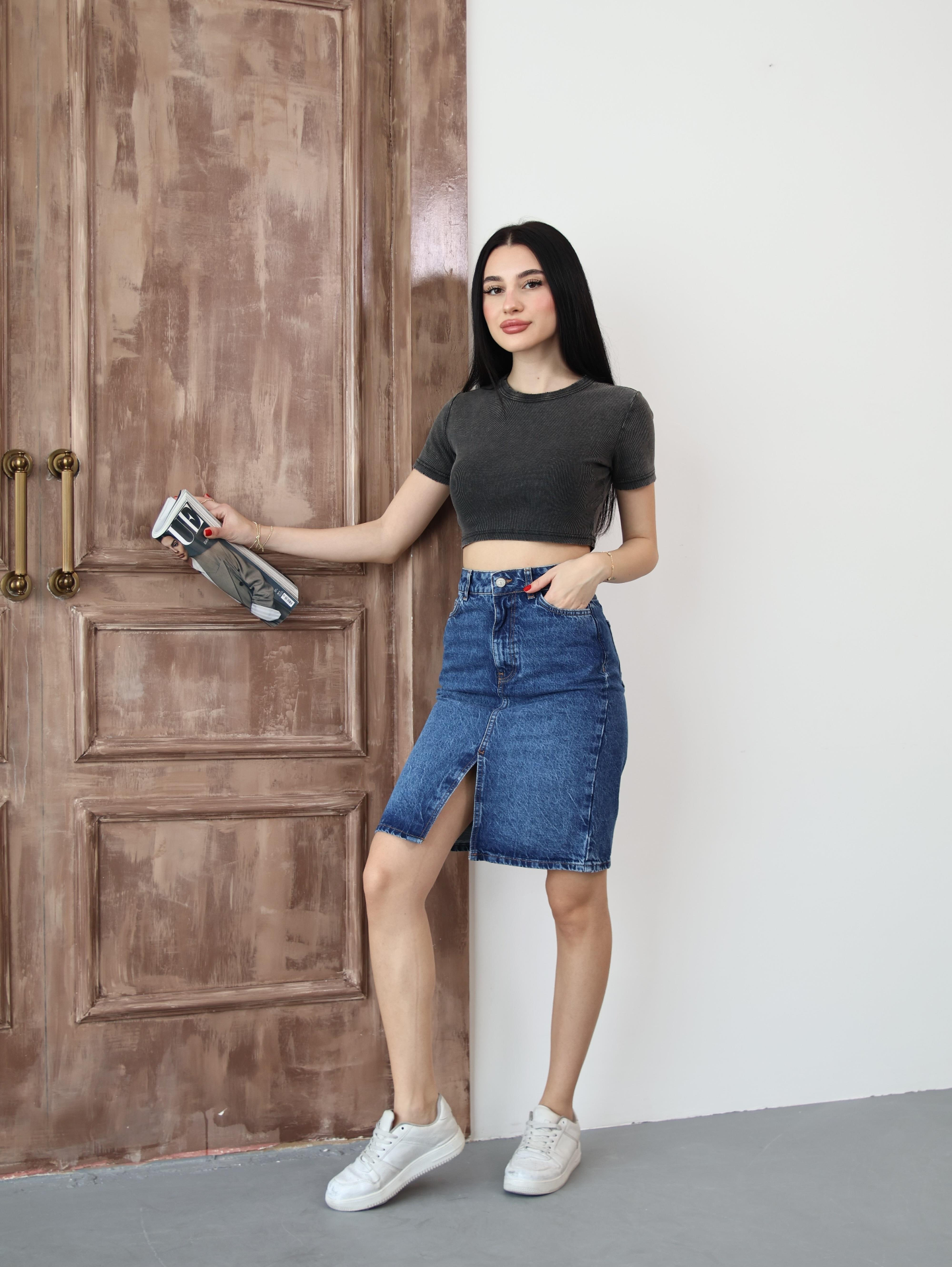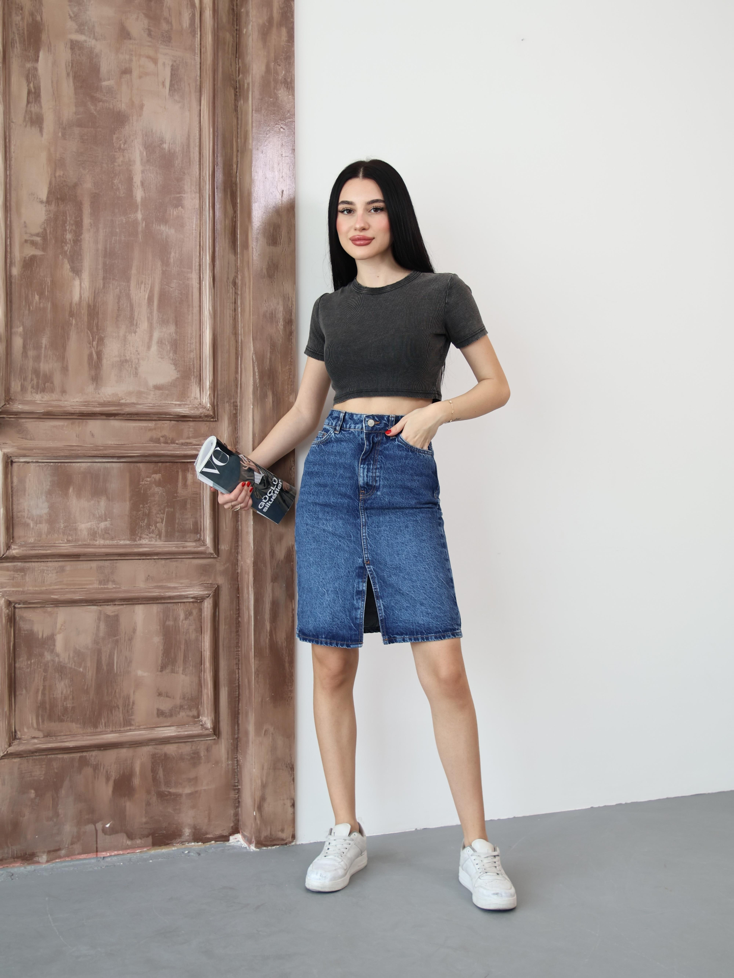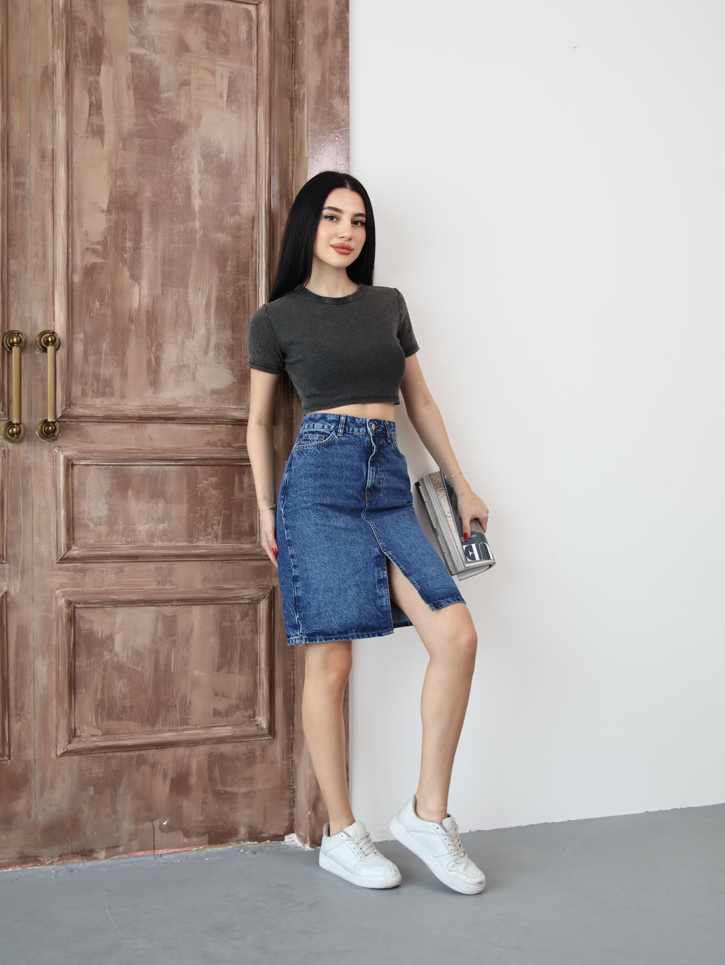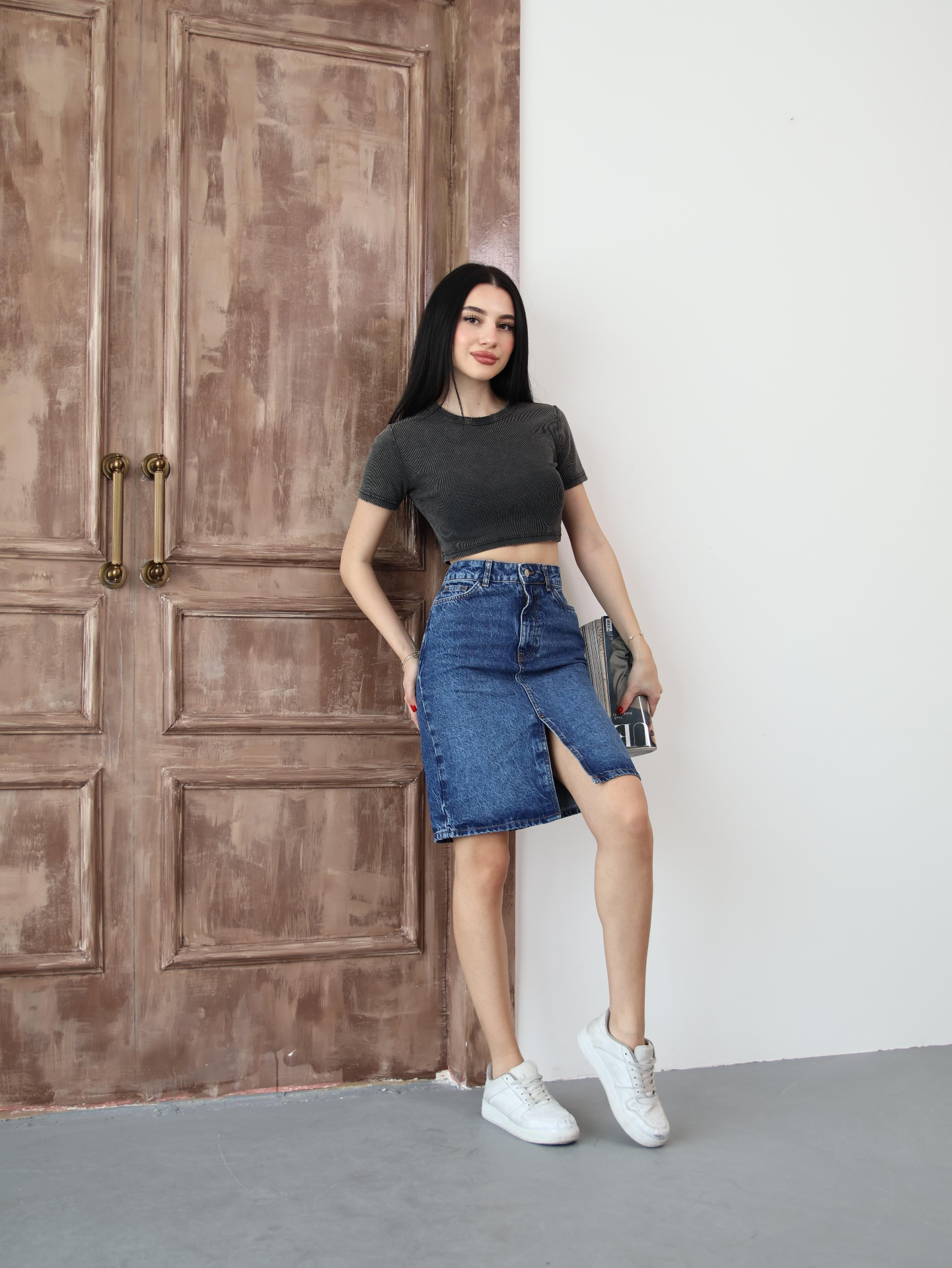 Koyu Mavi Yırtmaçlı Kot Etek