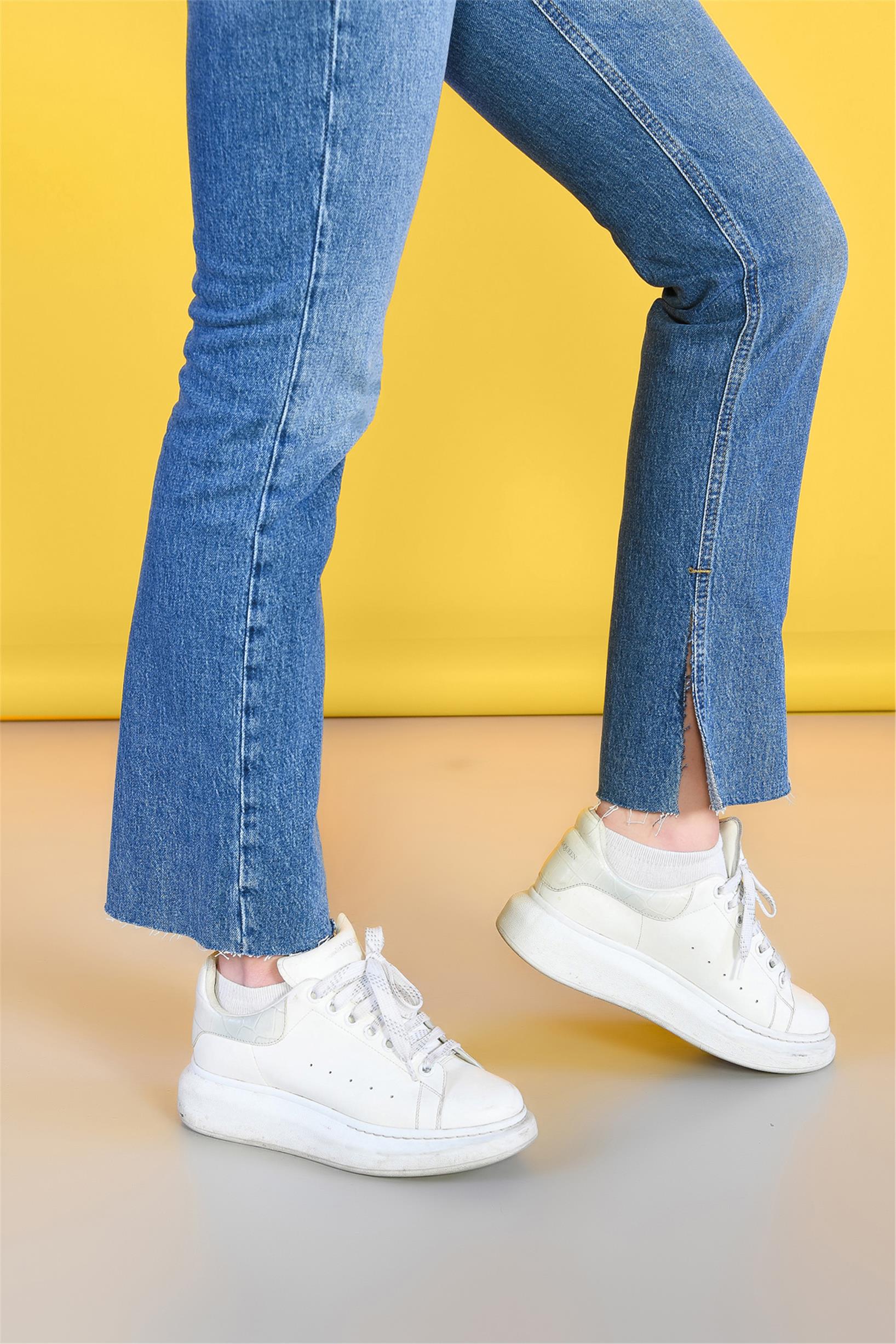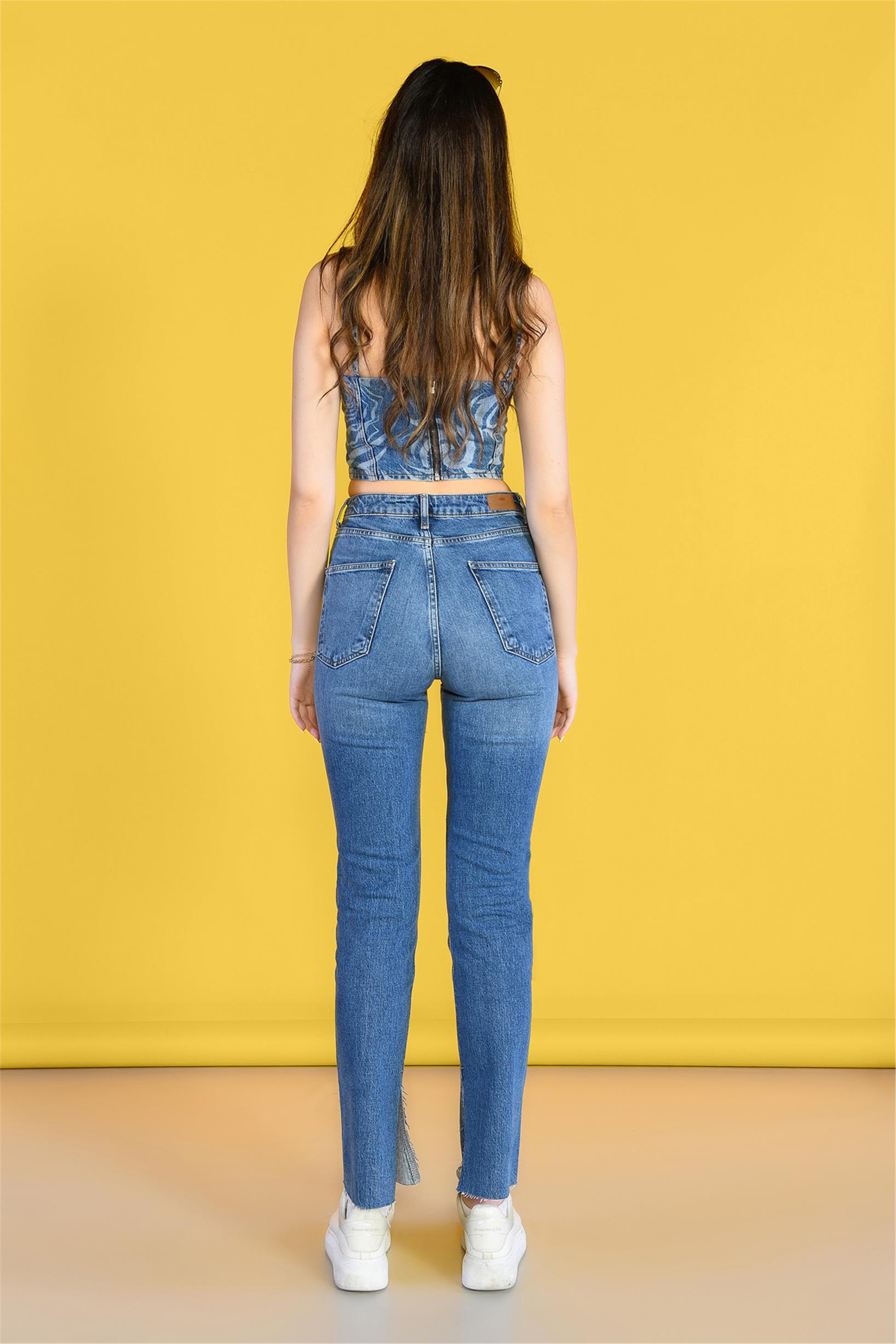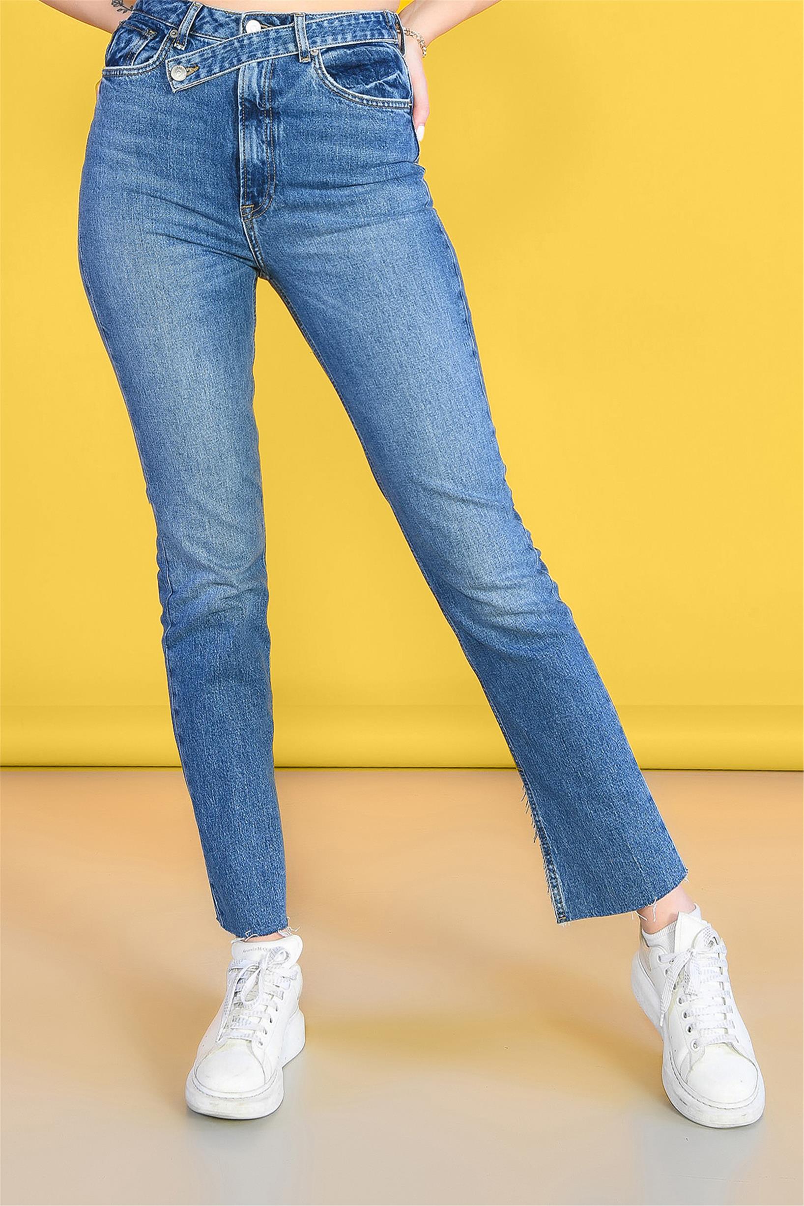 Koyu Mavi Yüksek Bel Kemer Detaylı Wideleg Jeans
