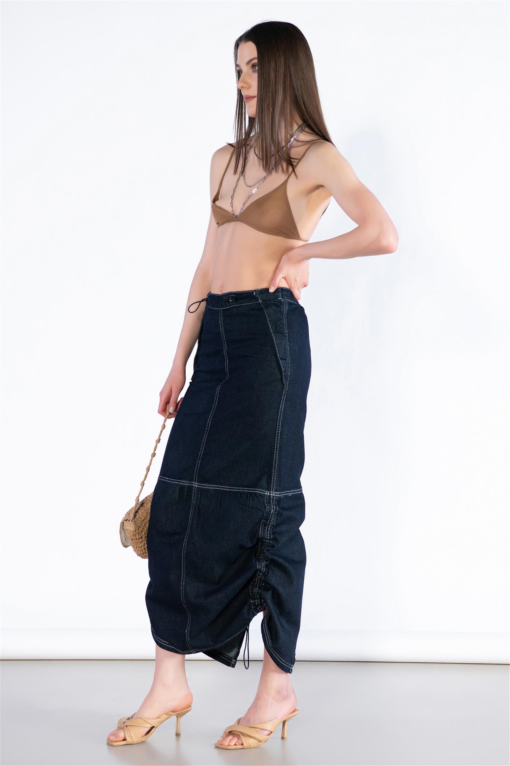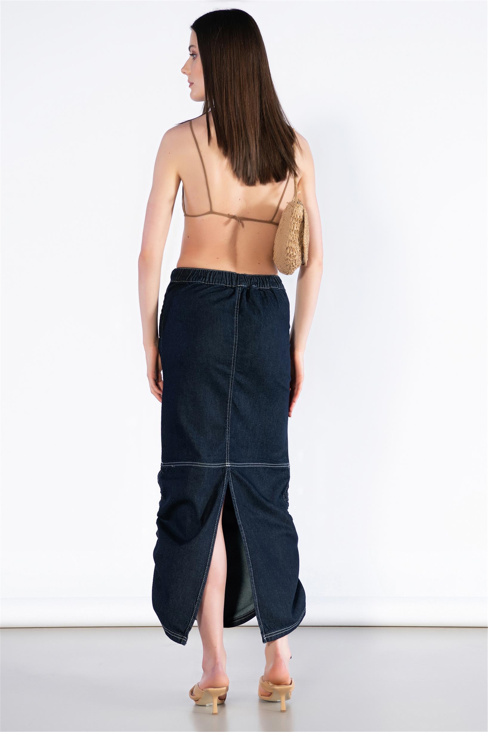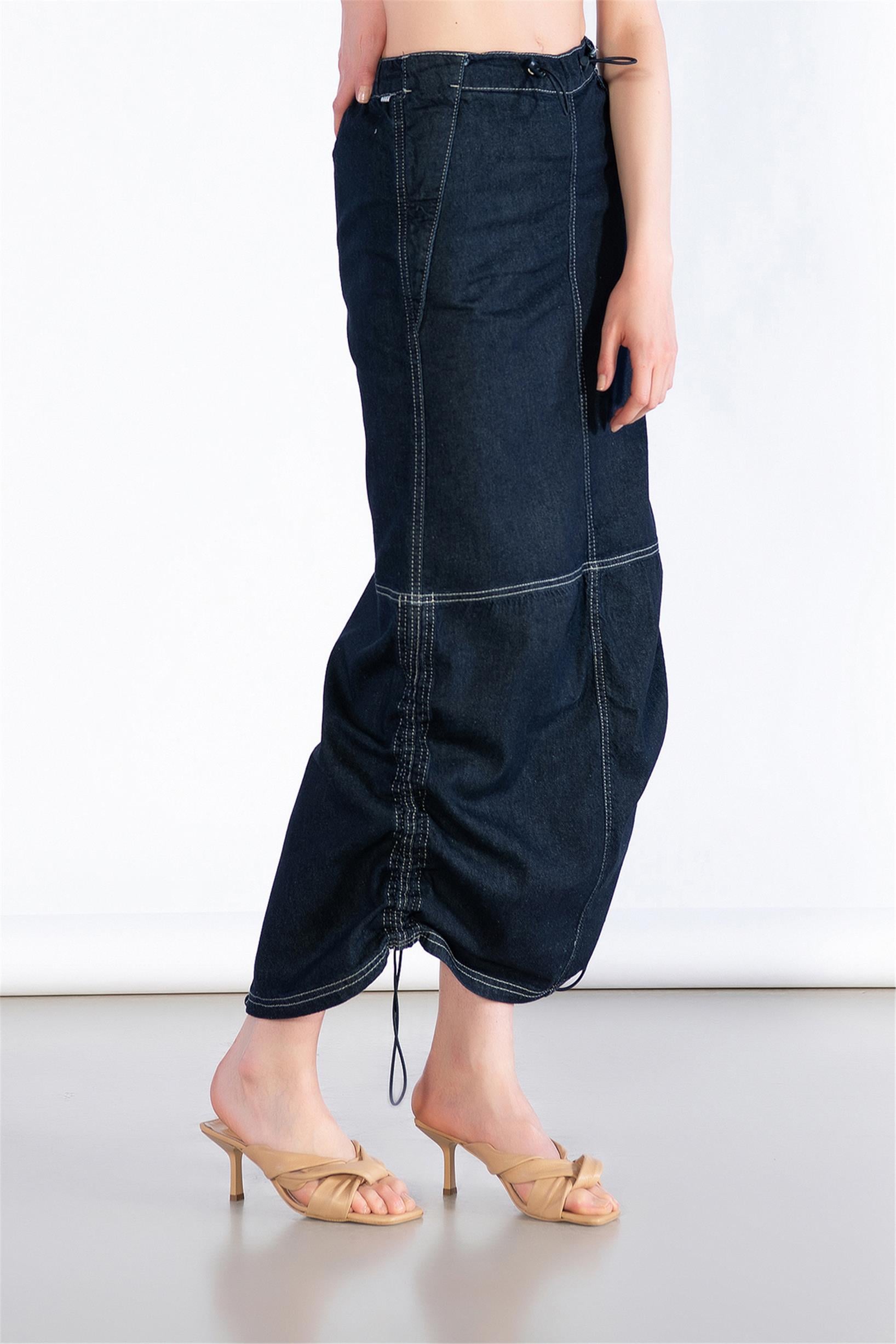 Lacivert Stoperli Arka Yırtmaç Detay Midi Boy Paraşüt Etek