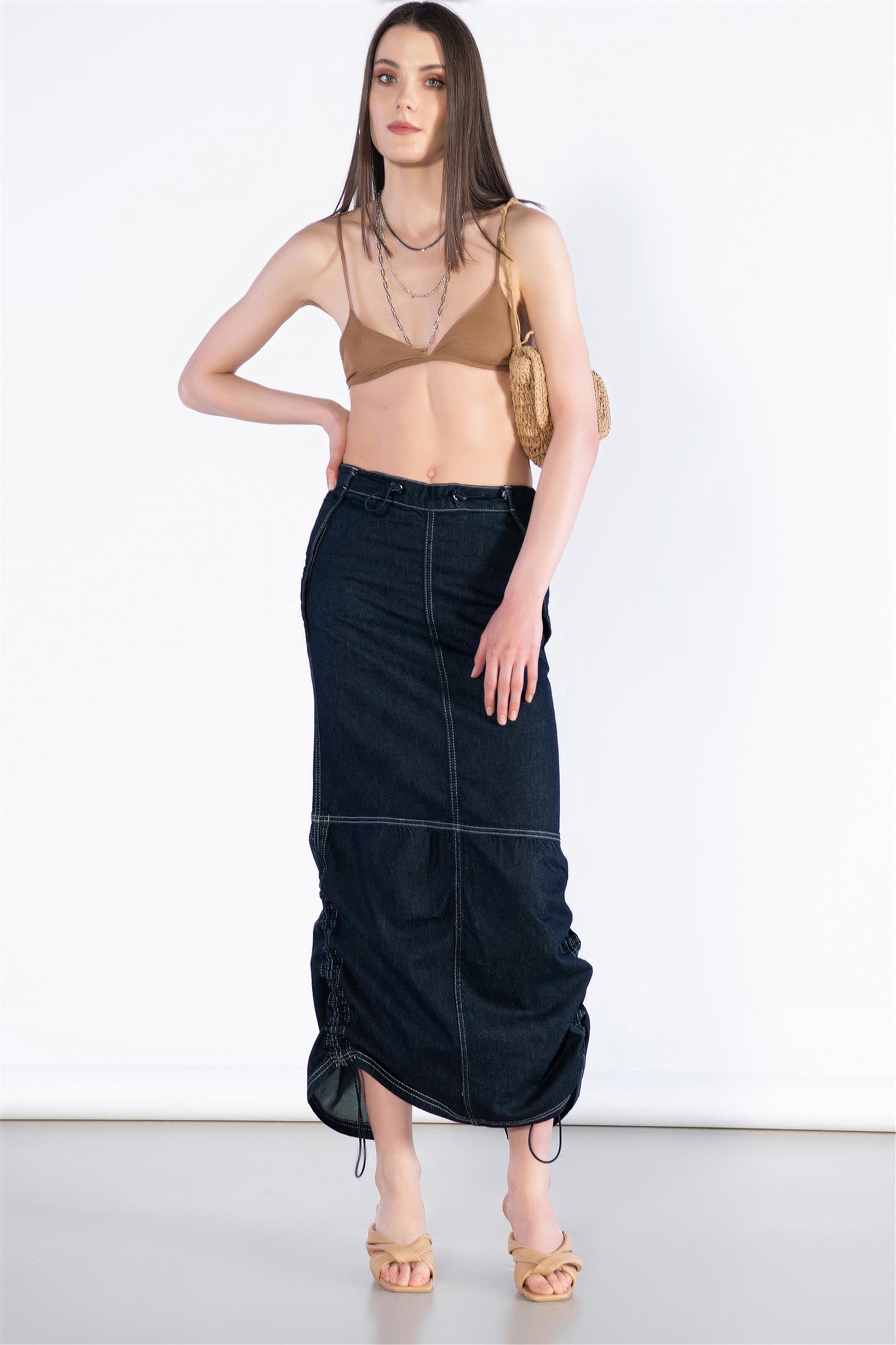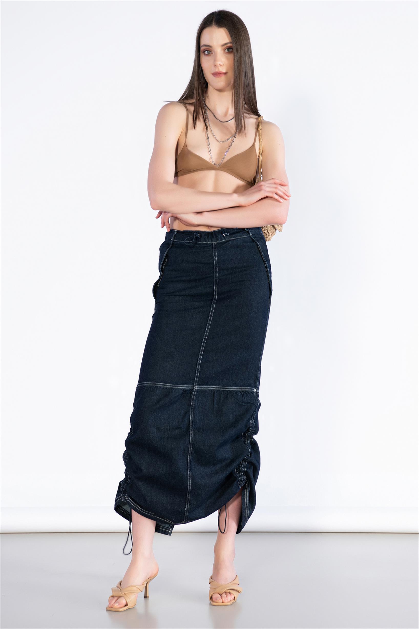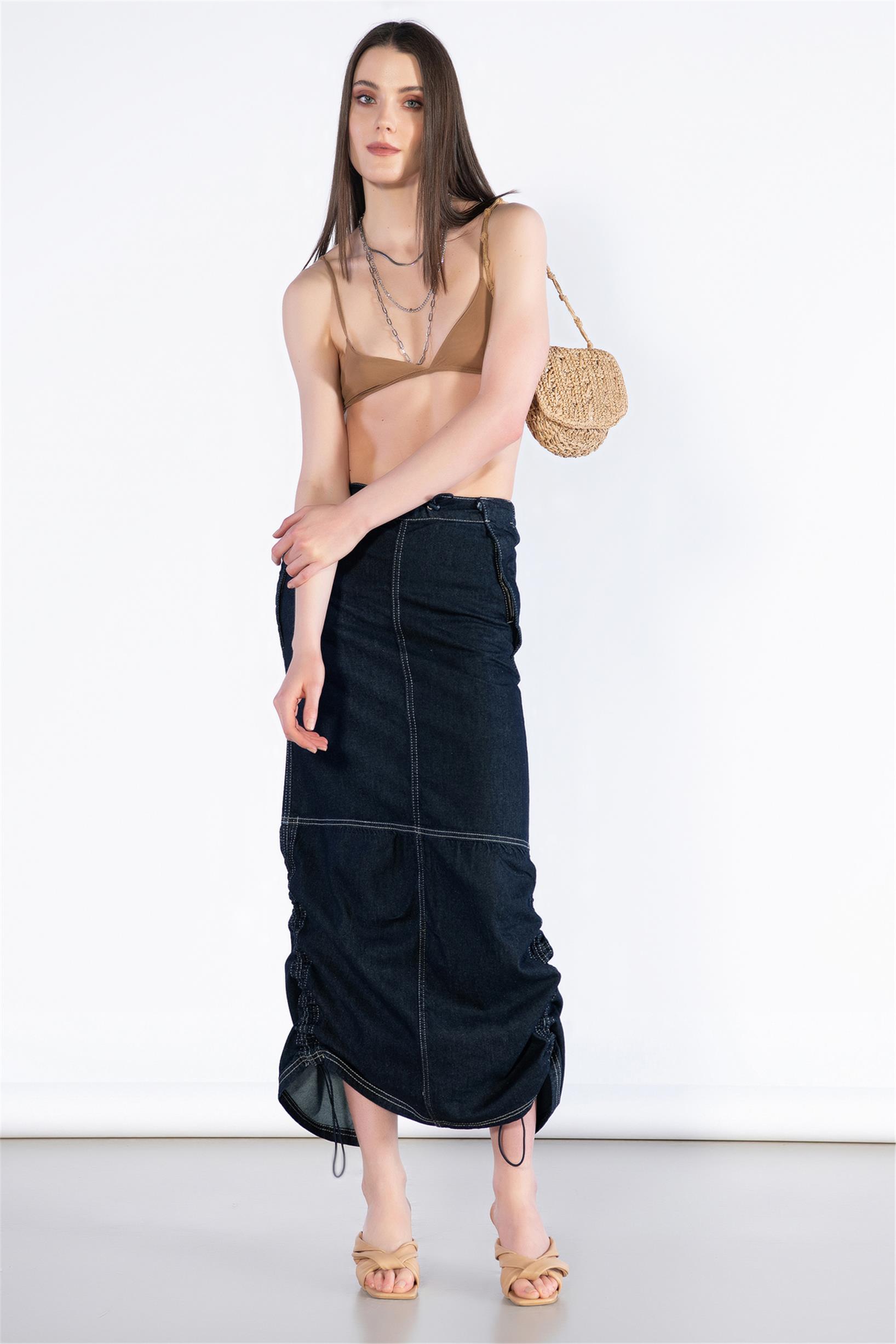 Lacivert Stoperli Arka Yırtmaç Detay Midi Boy Paraşüt Etek