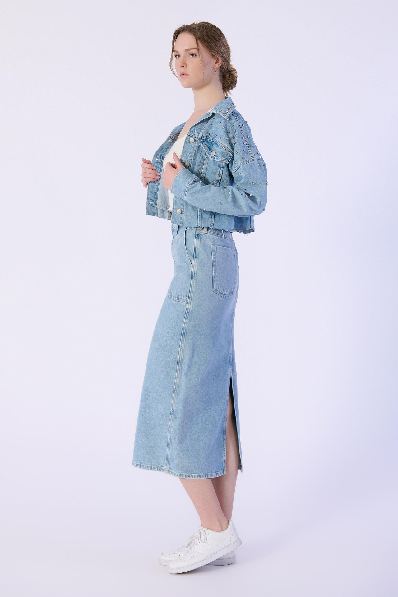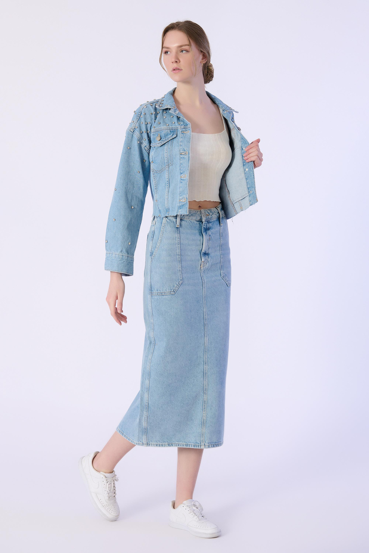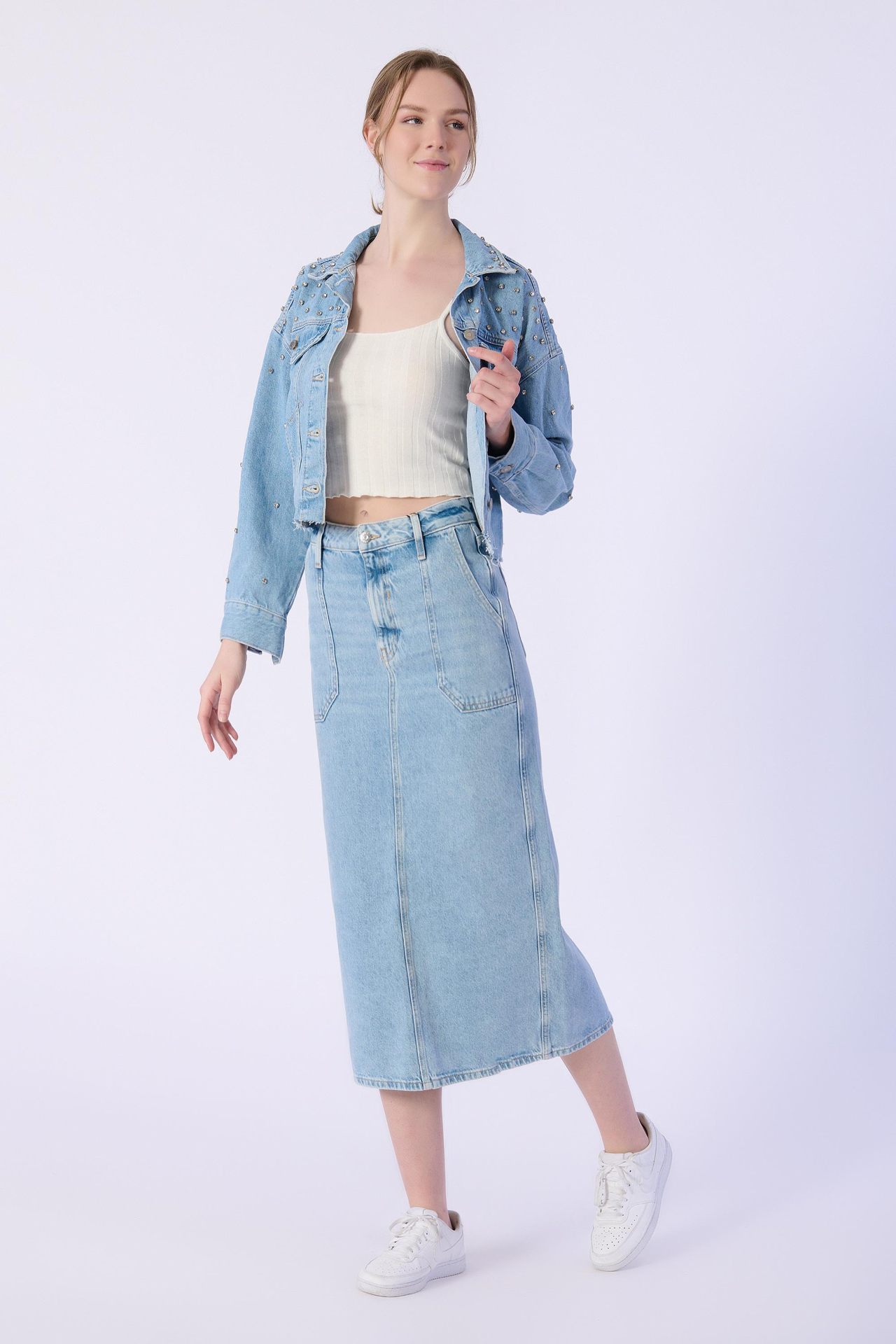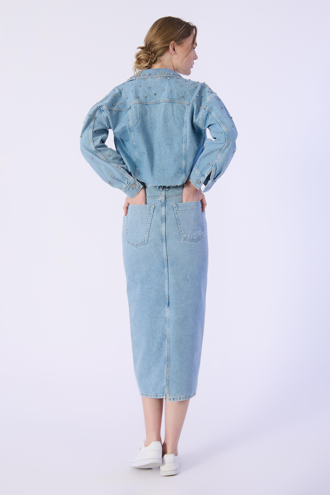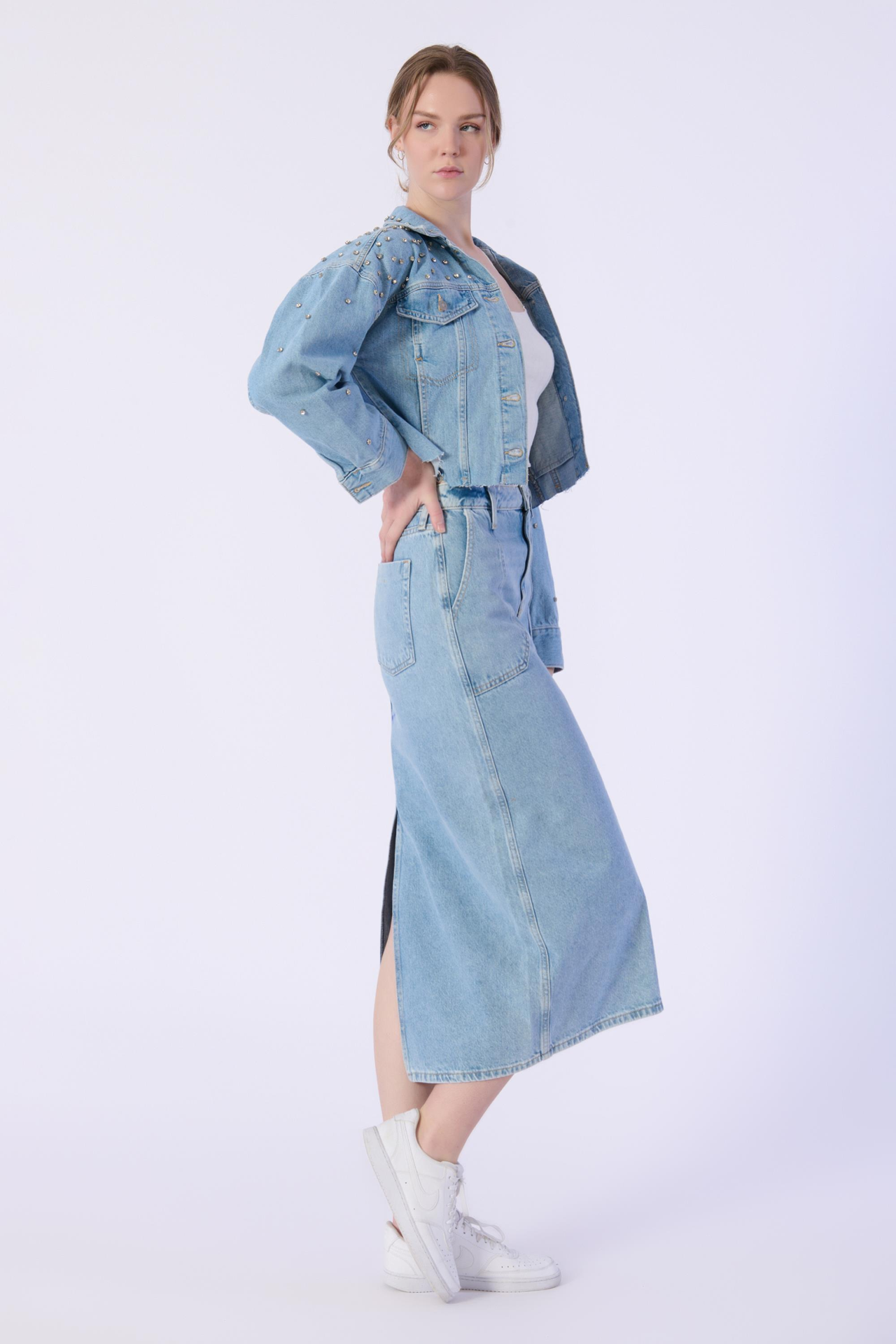 Mavi Arka Yırtmaç Detaylı Denim Etek
