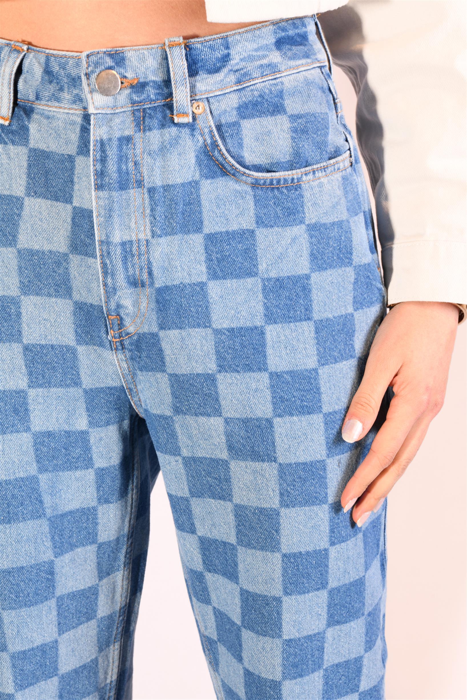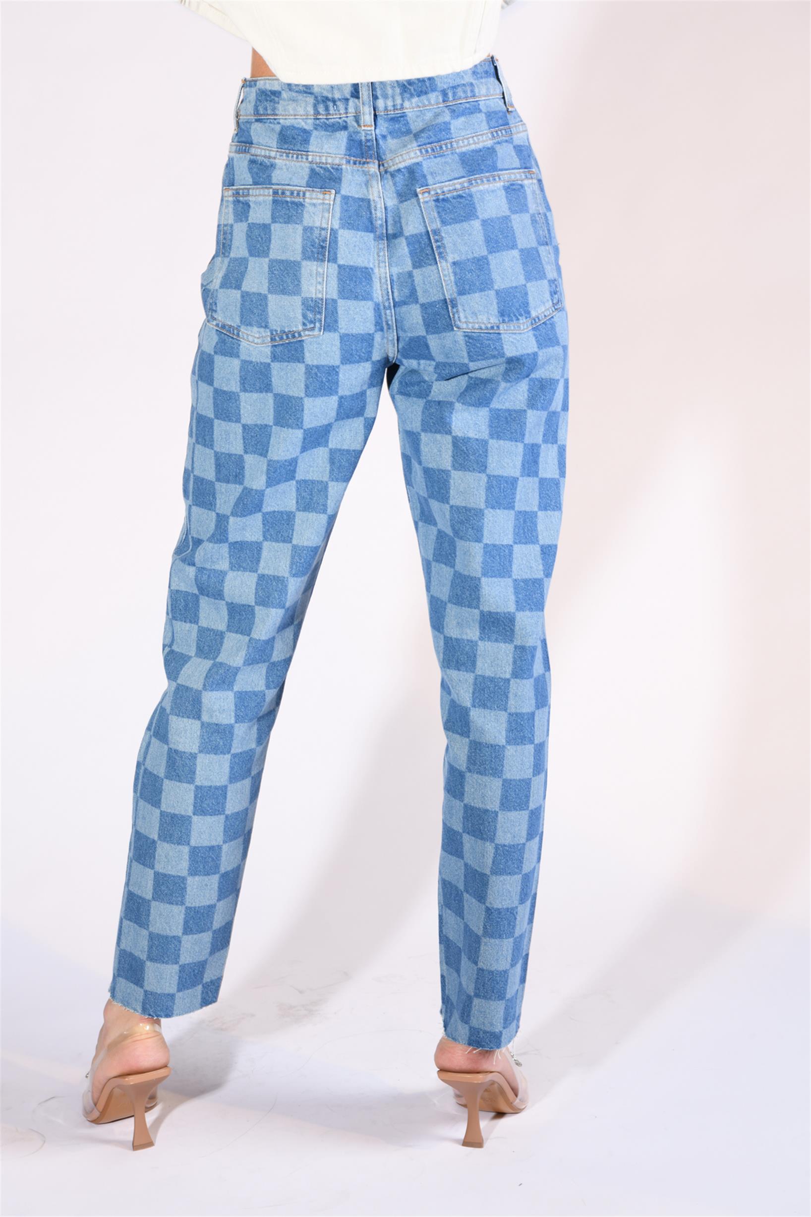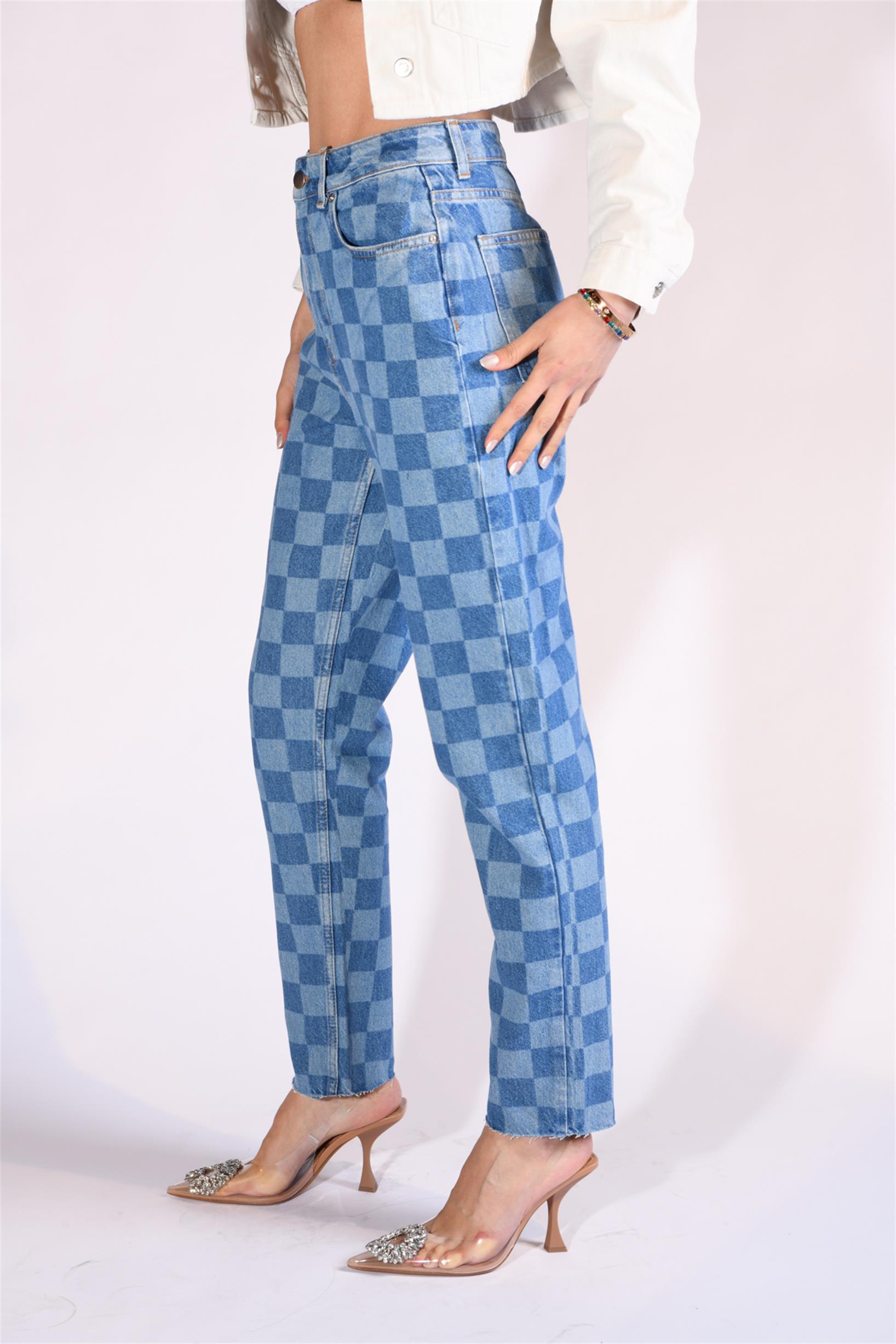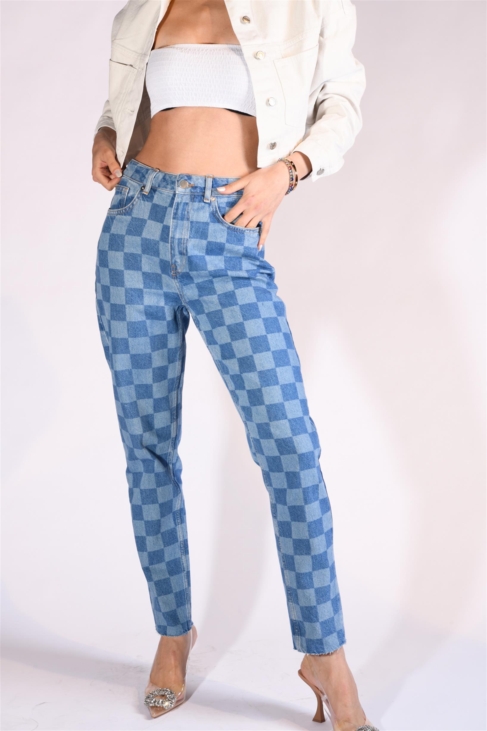 Mavi Dama Desenli Yüksek Bel Mom Fit Jeans