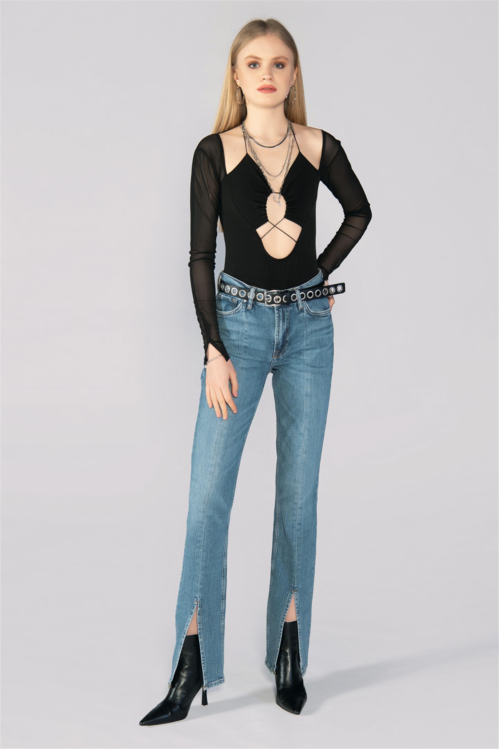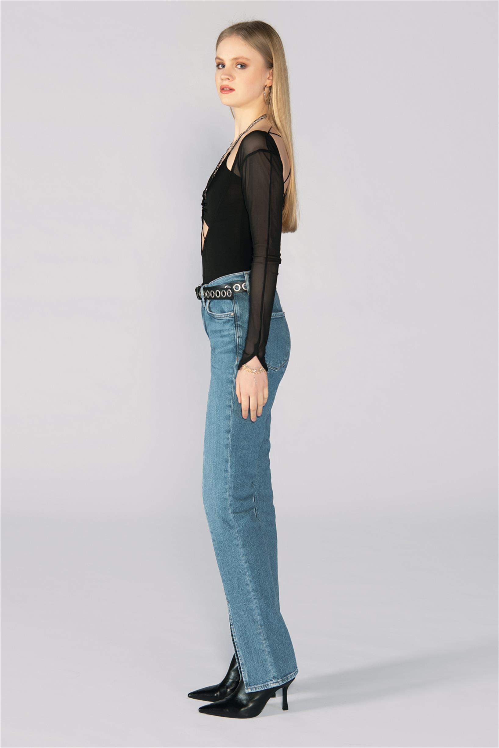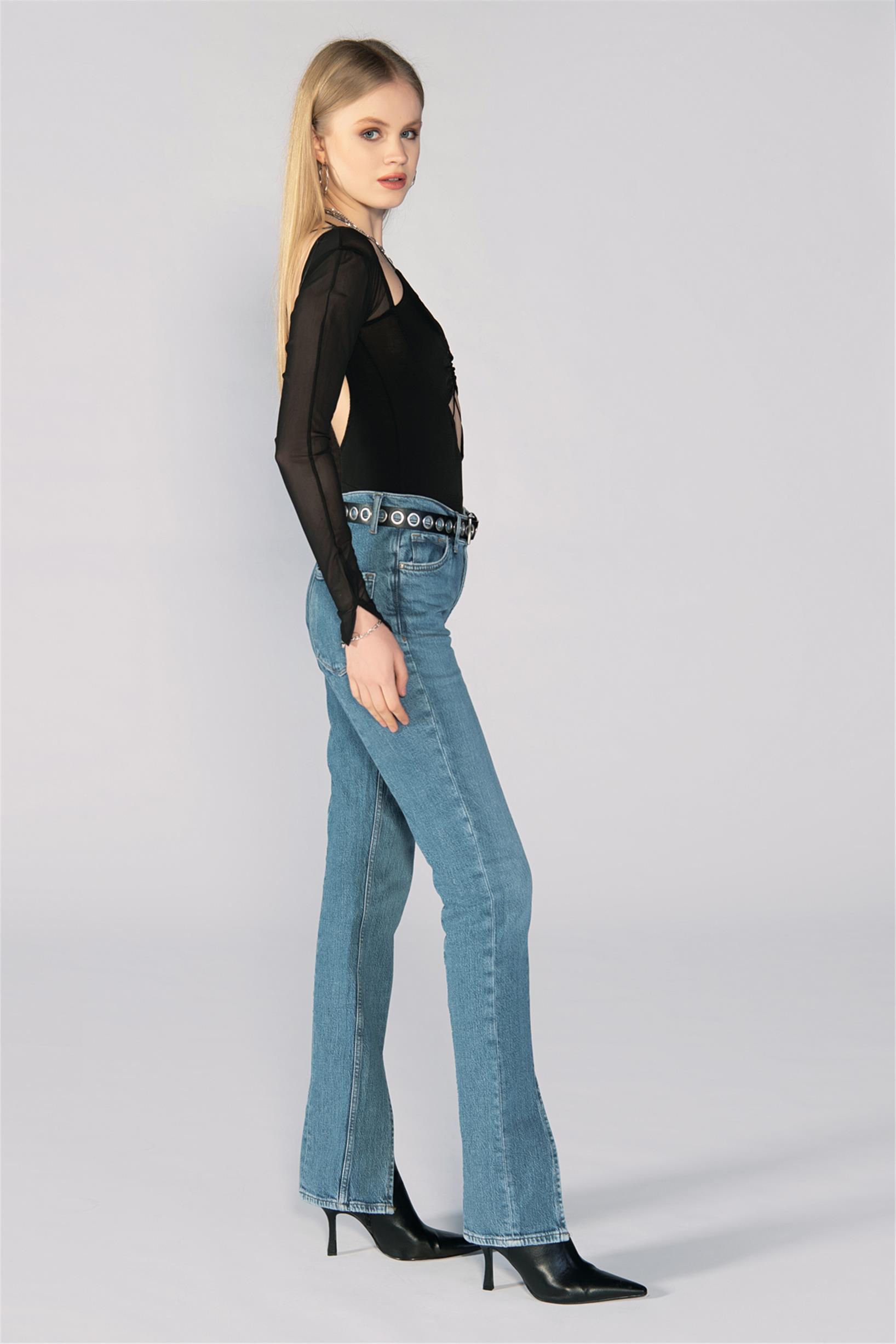 Mavi Normal Bel Paça Yırtmaçlı Straight Jeans