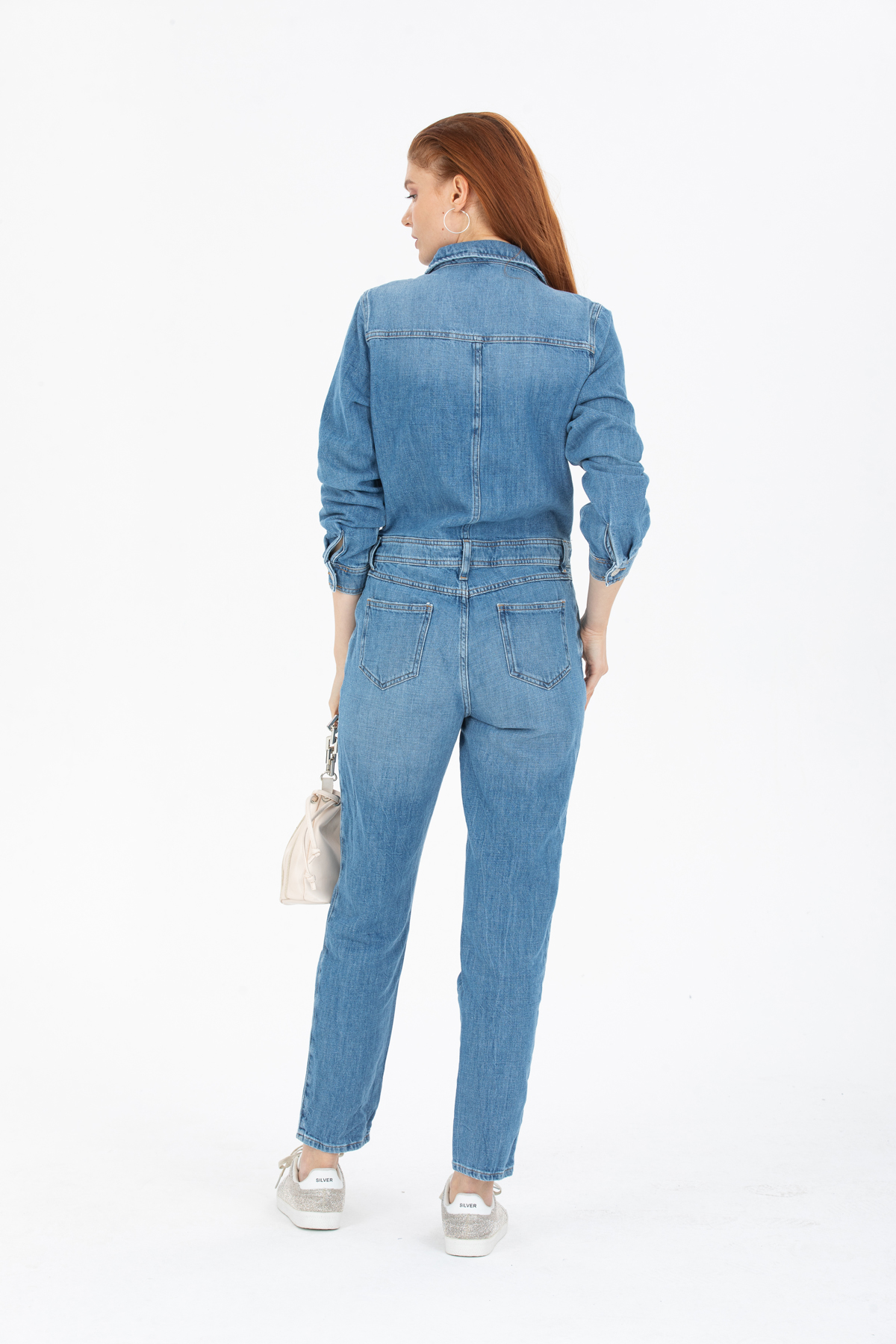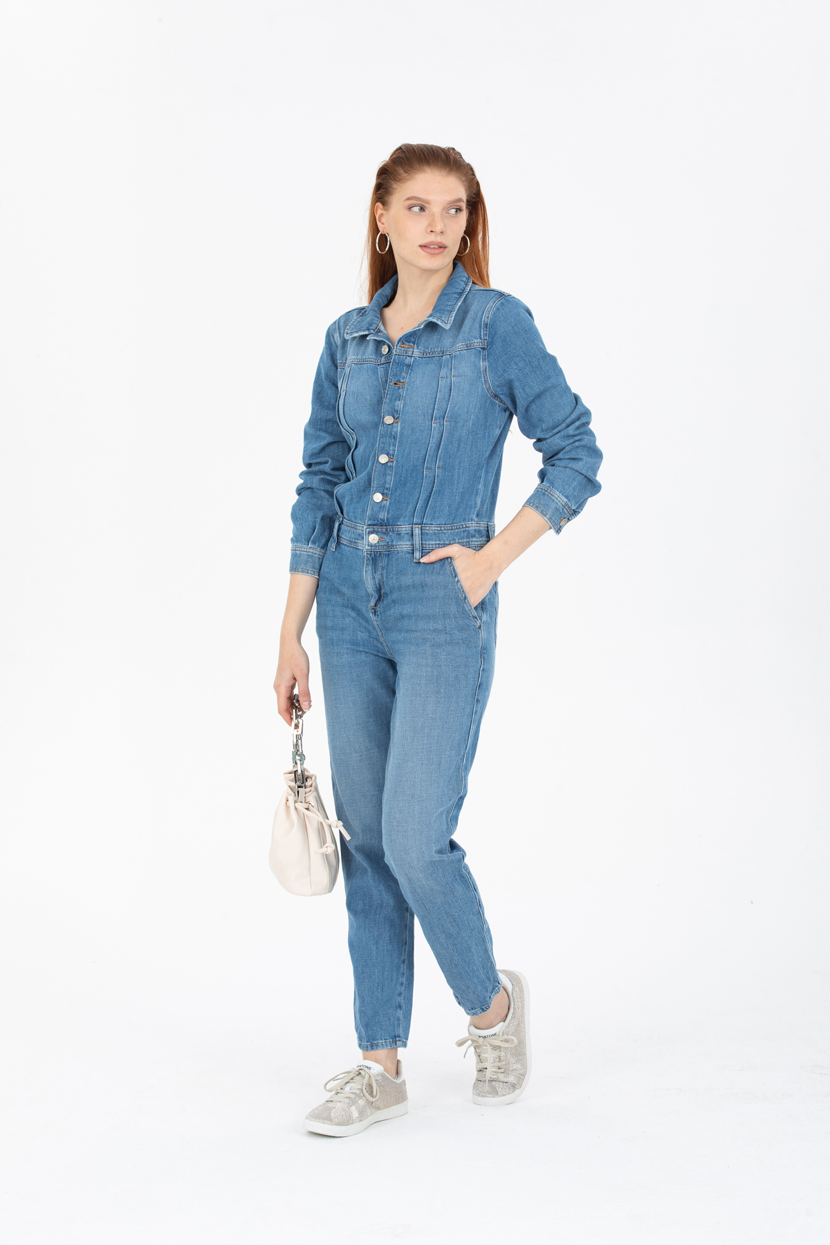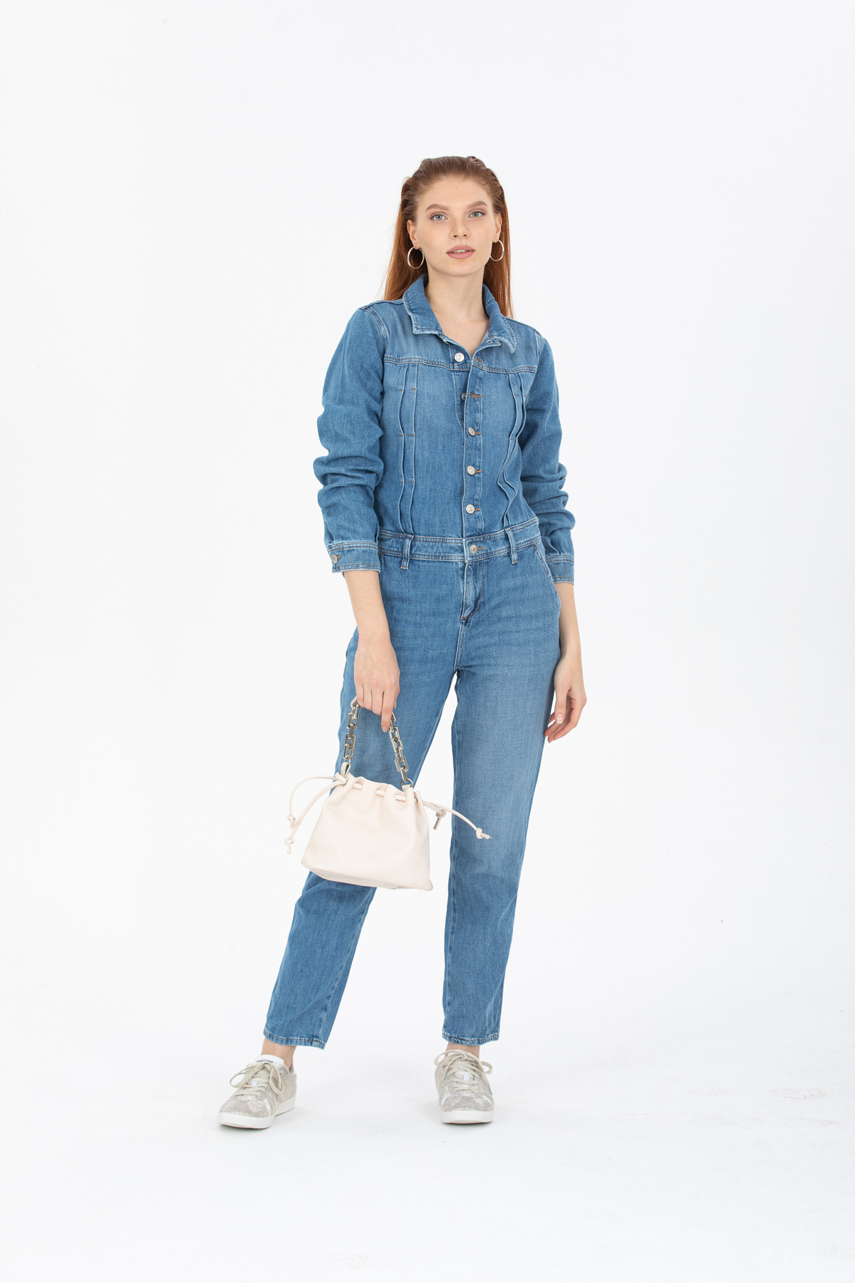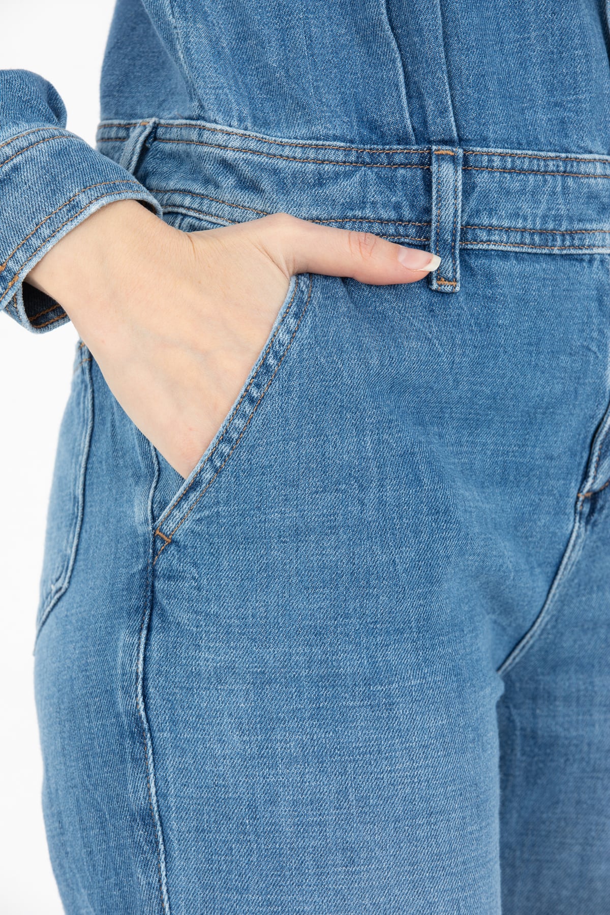 Mavi Ön Dikiş Detaylı Denim Tulum