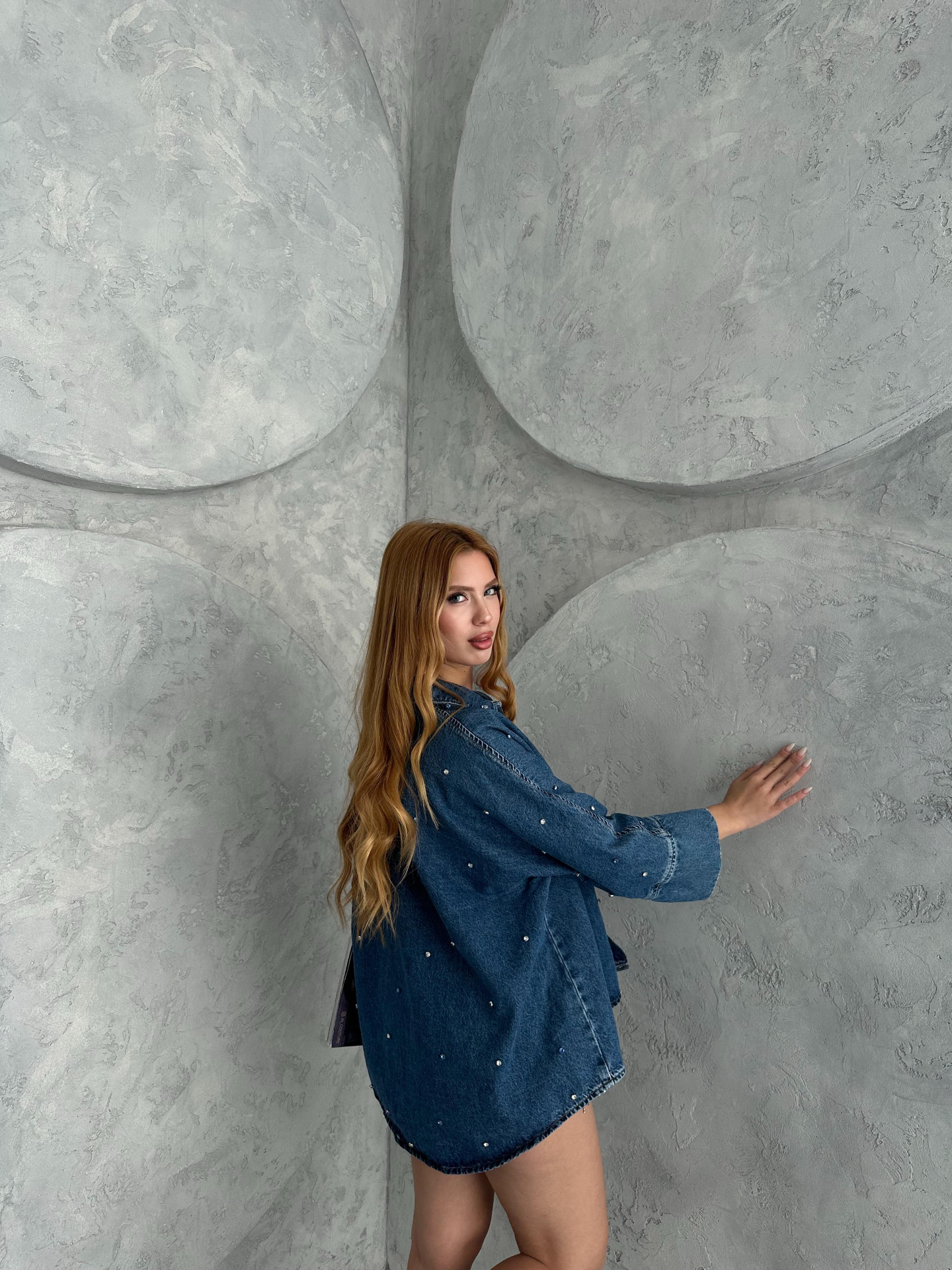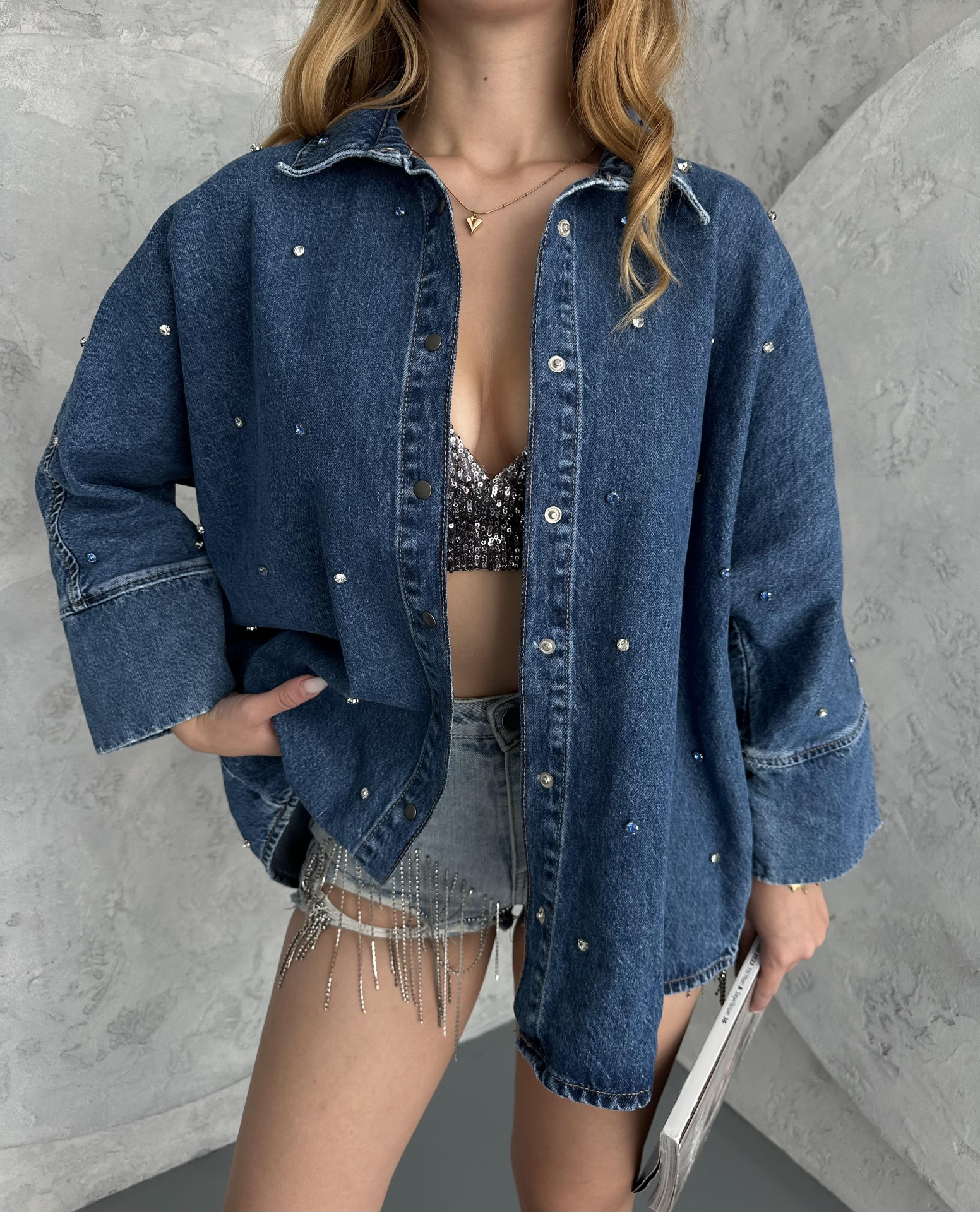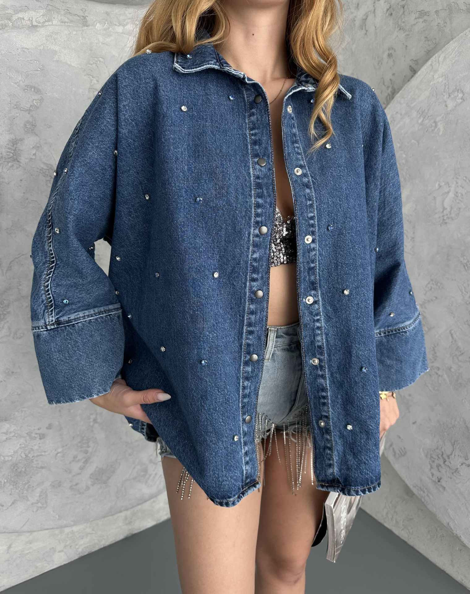 Mavi Taş Süslemelı Oversize Demim Gömlek