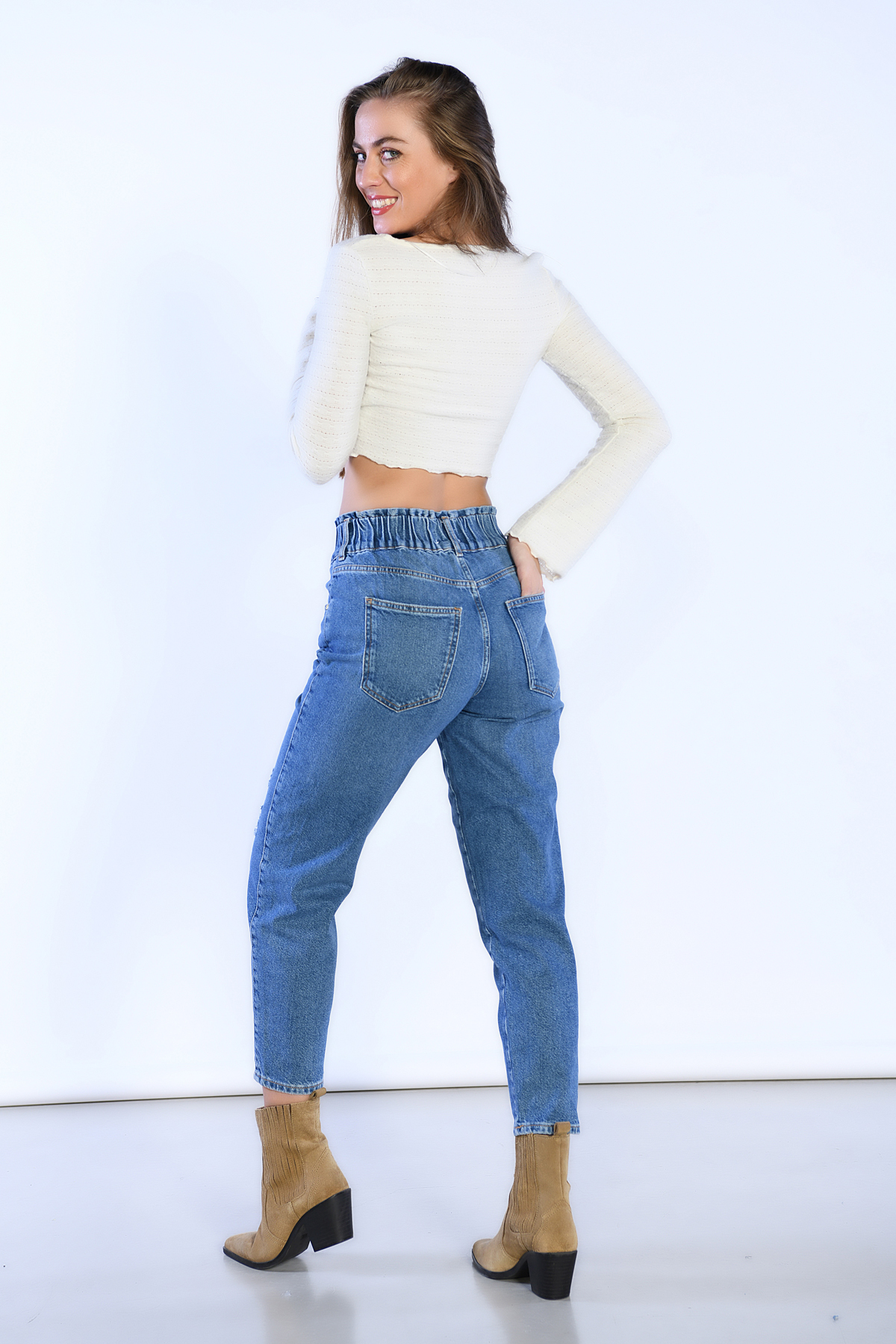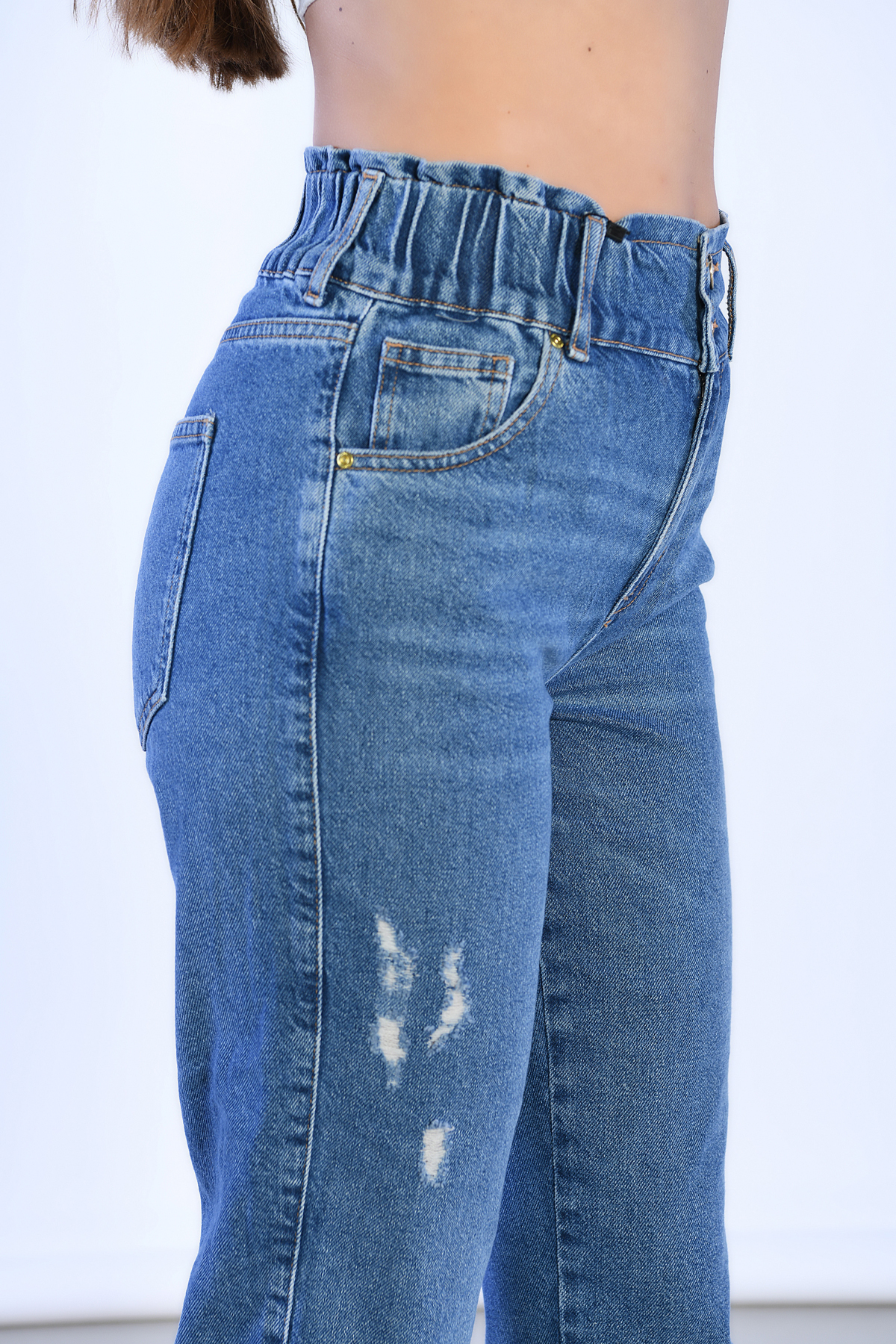 Mavi Yüksek Bel Belden Lastik ve Lazer Detaylı Mom Jeans