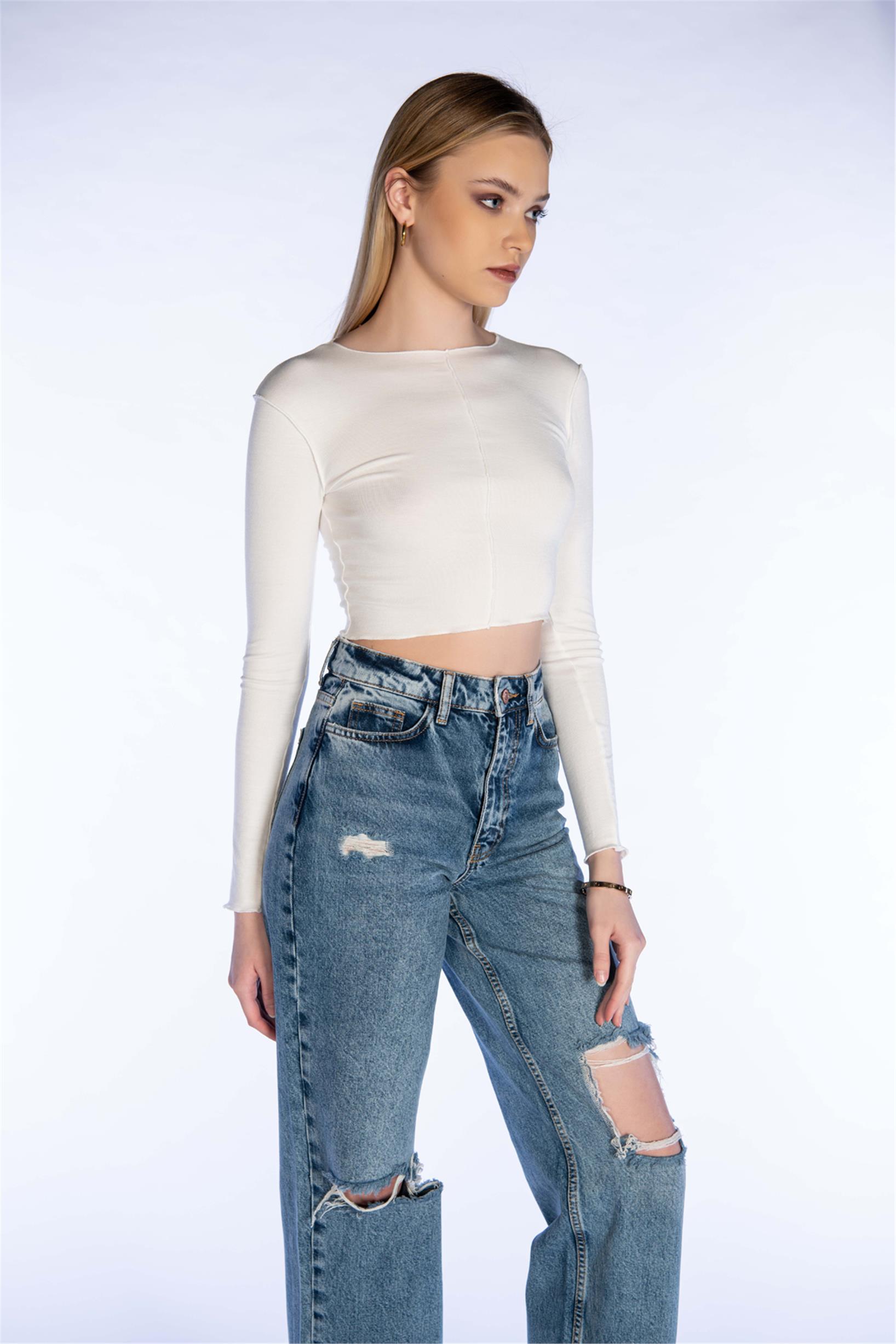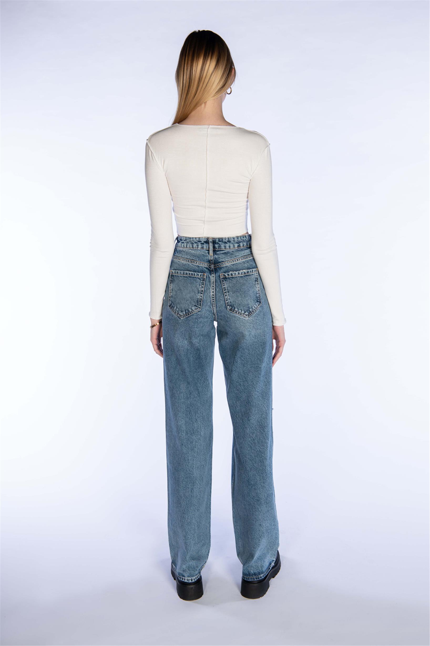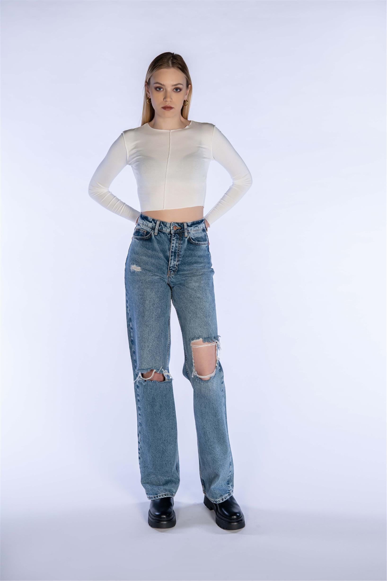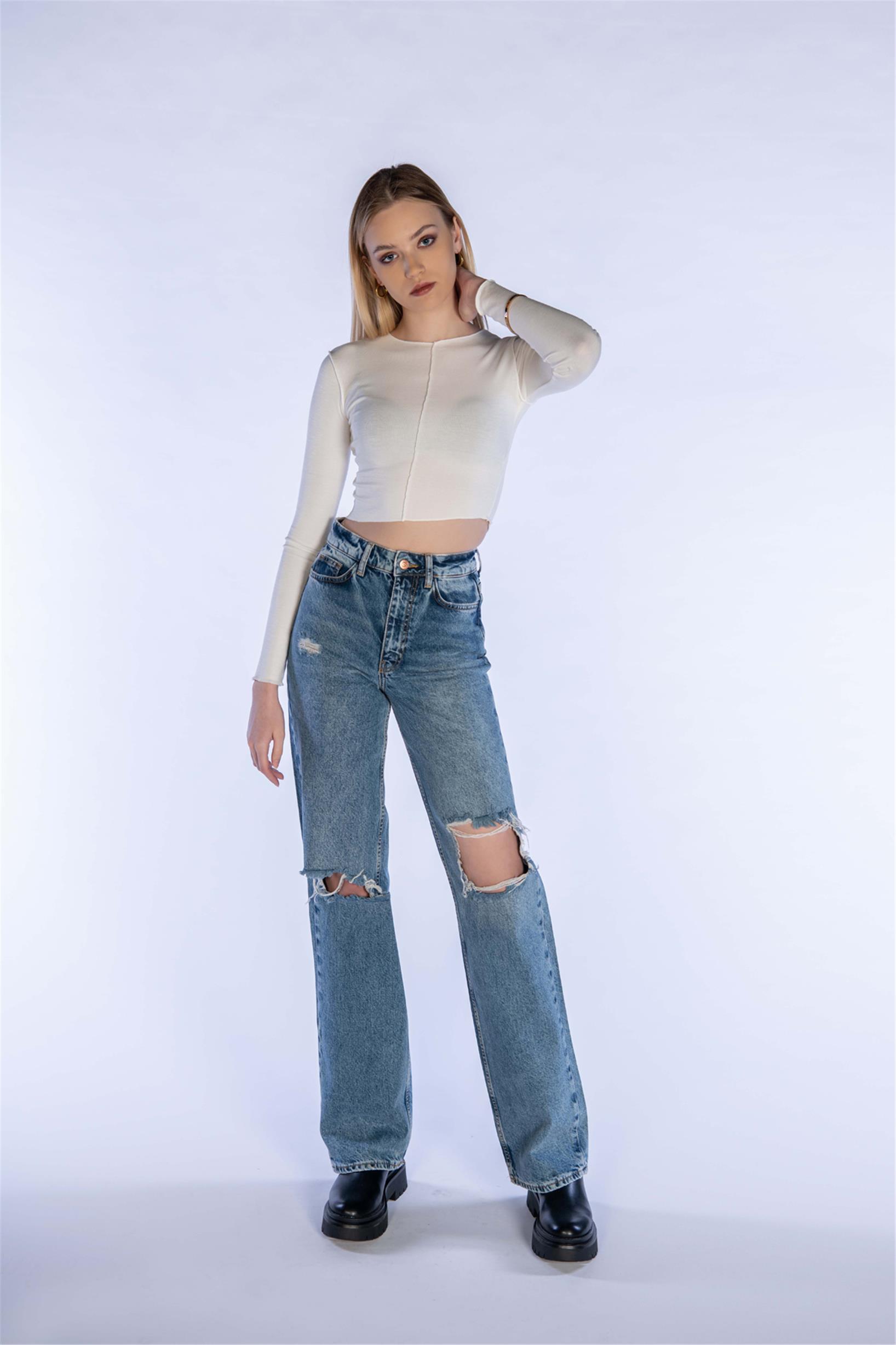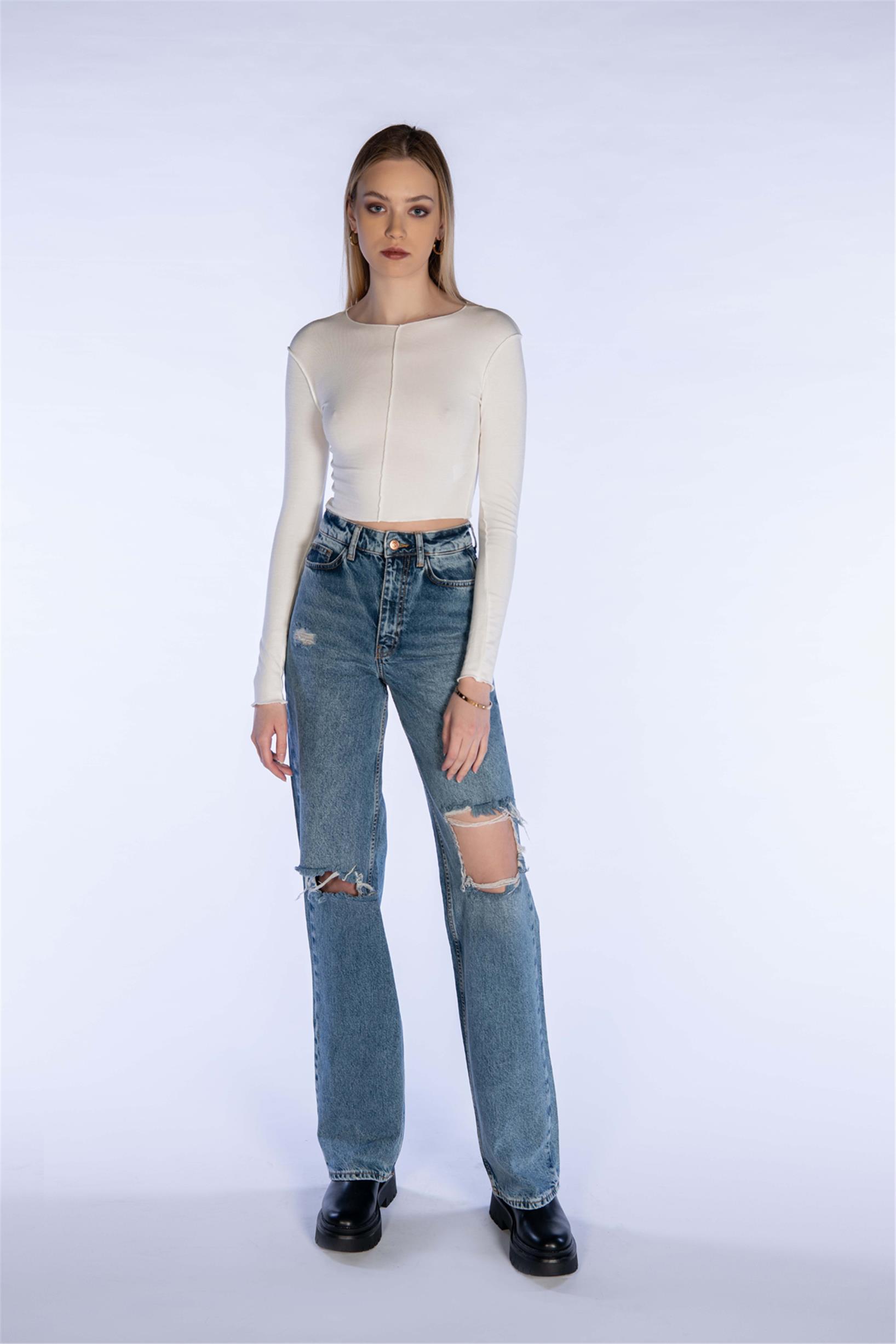 Mavi Yüksek Bel Diz Lazer Detaylı Mom Jeans