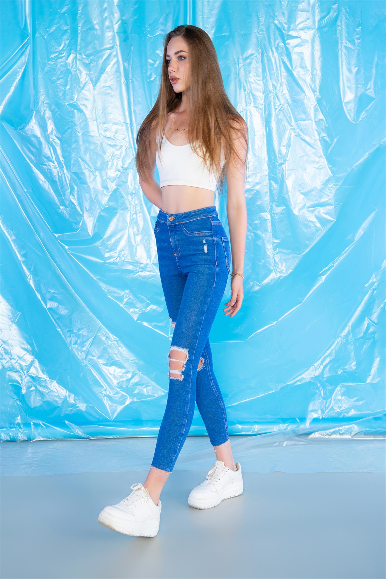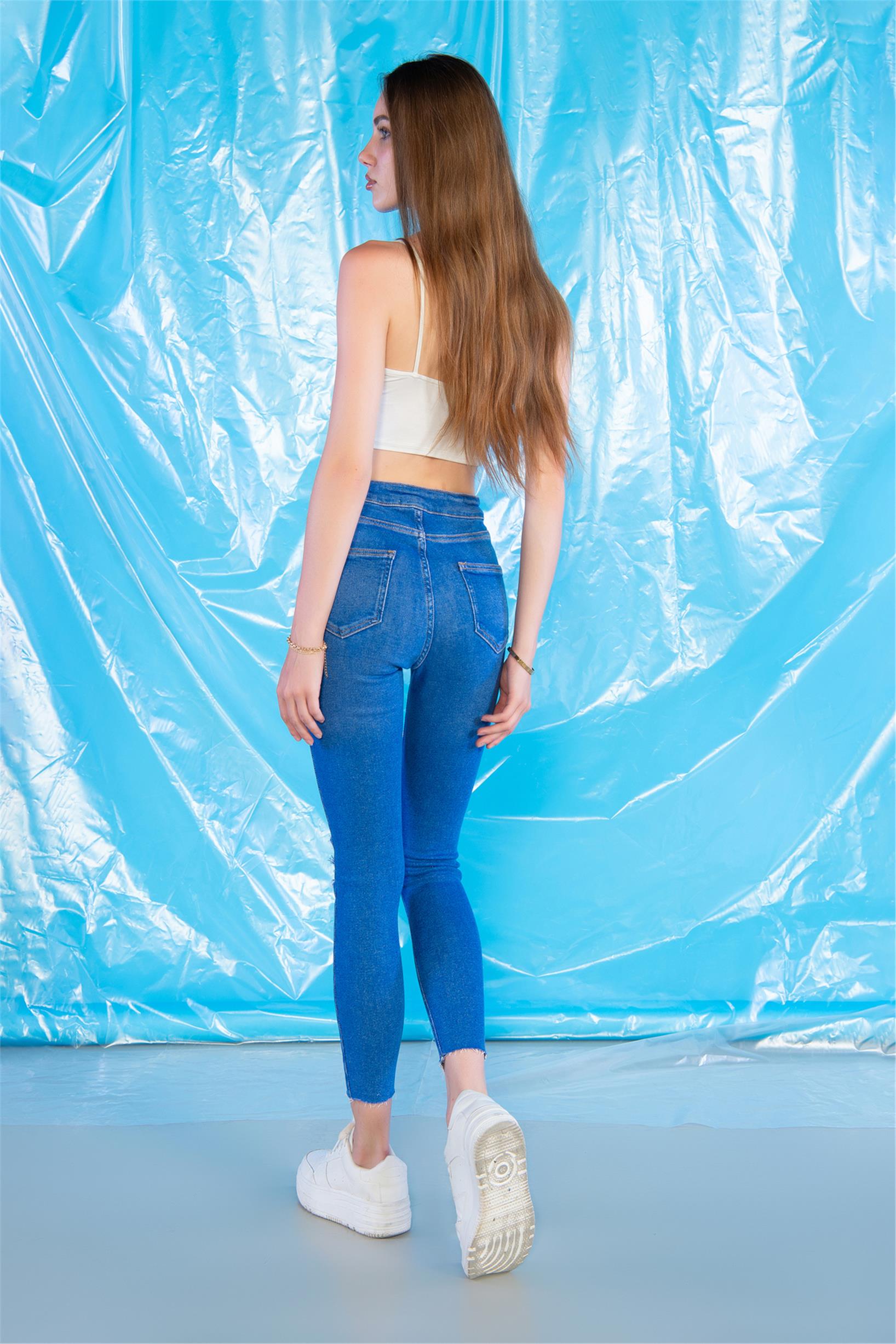 Mavi Yüksek Bel Diz Lazer Detaylı Skinny Jeans