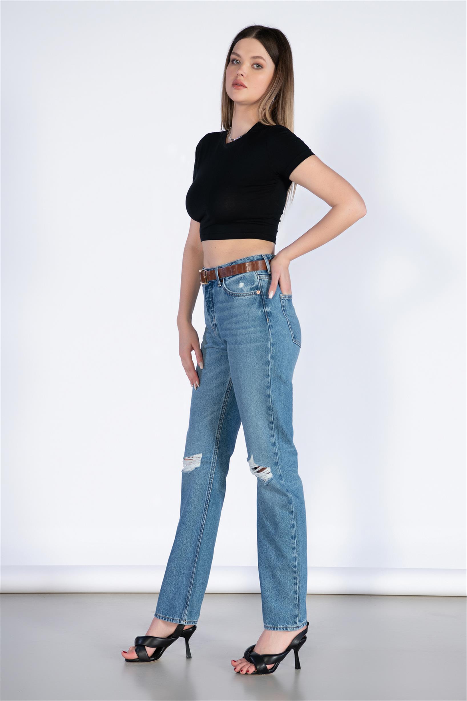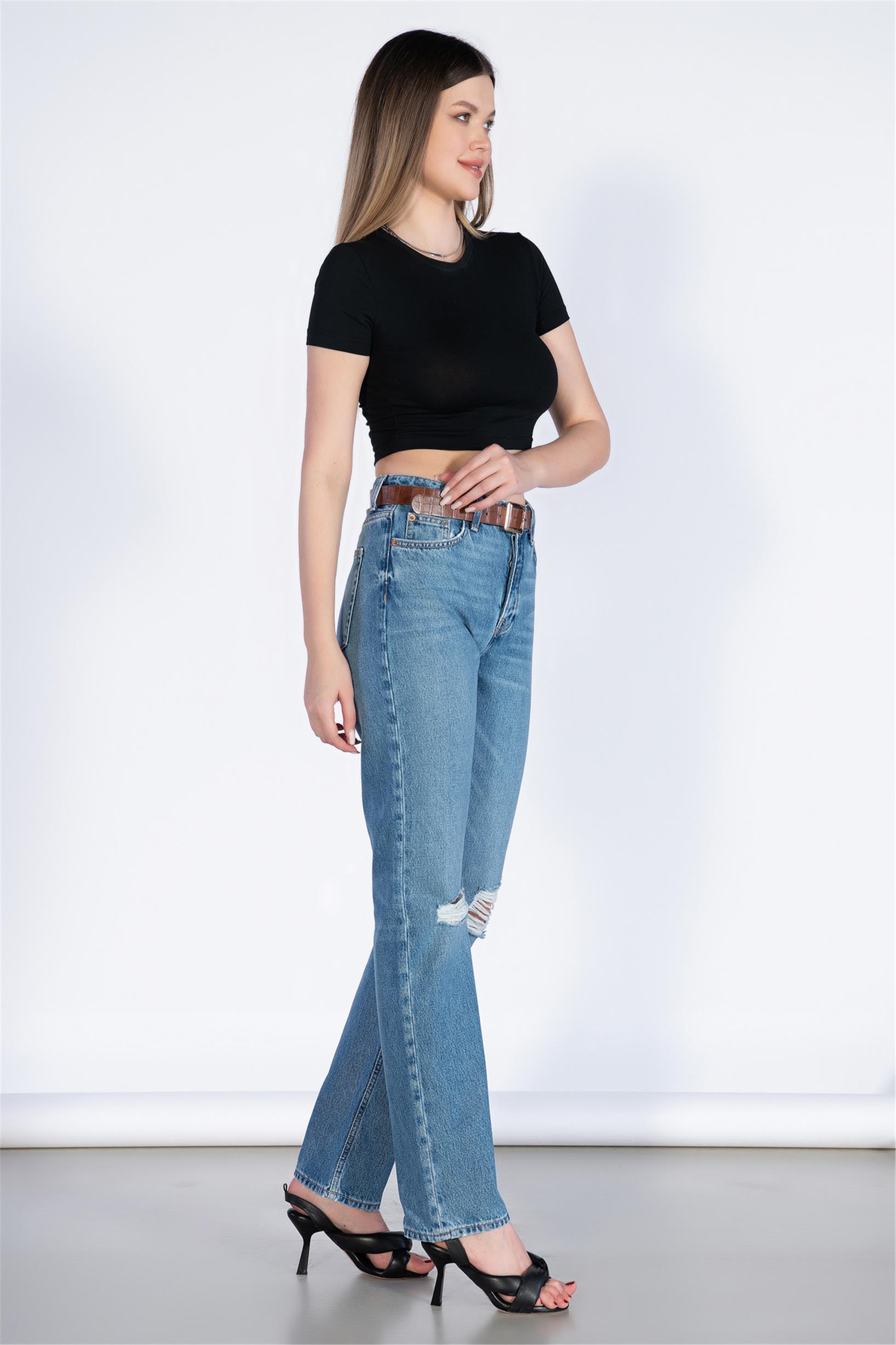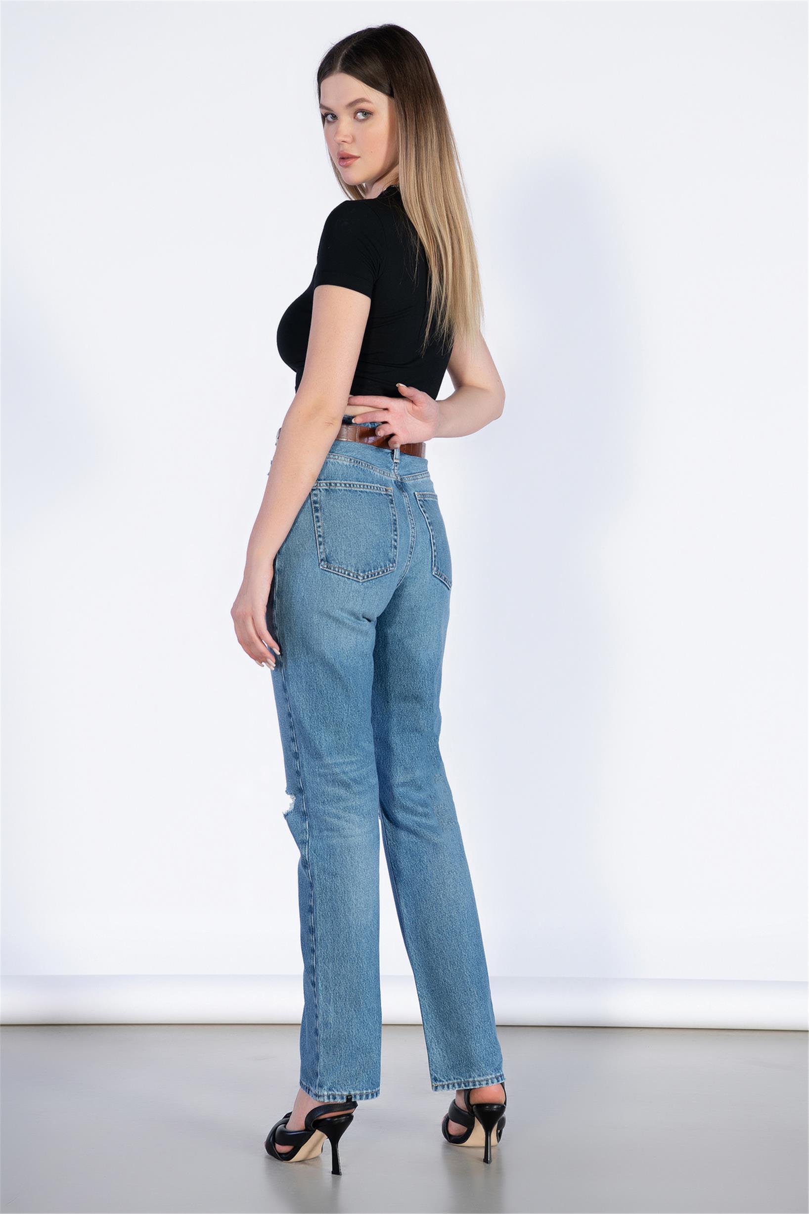 Mavi Yüksek Bel Diz Lazer Straight Jeans