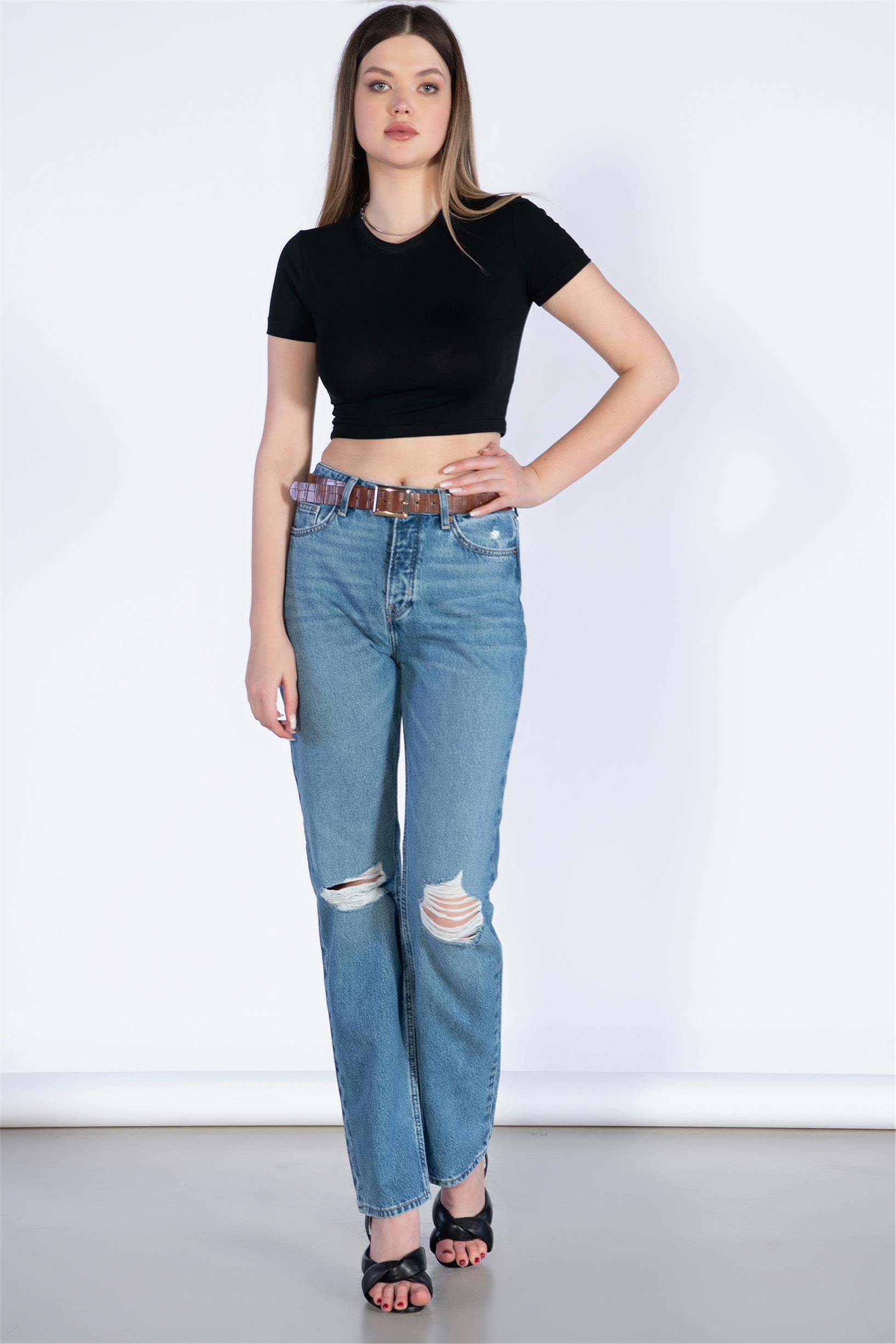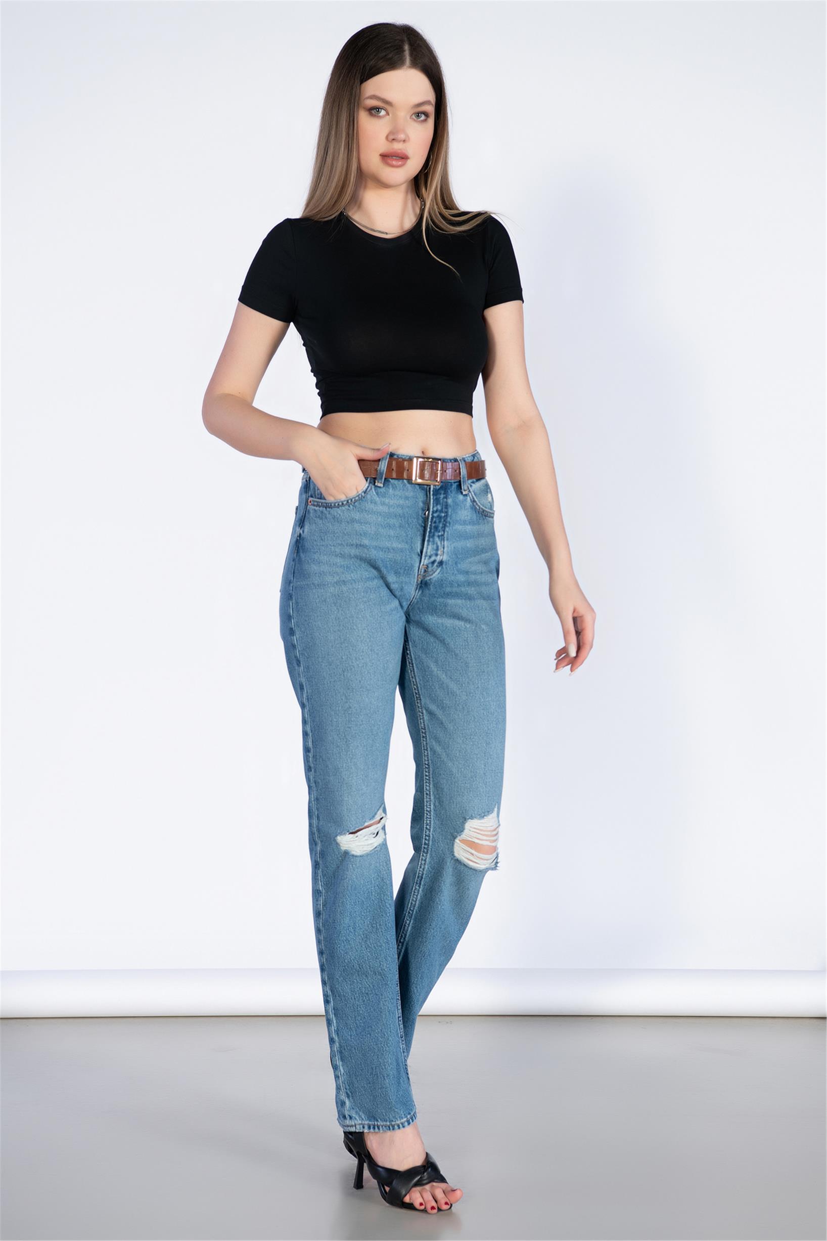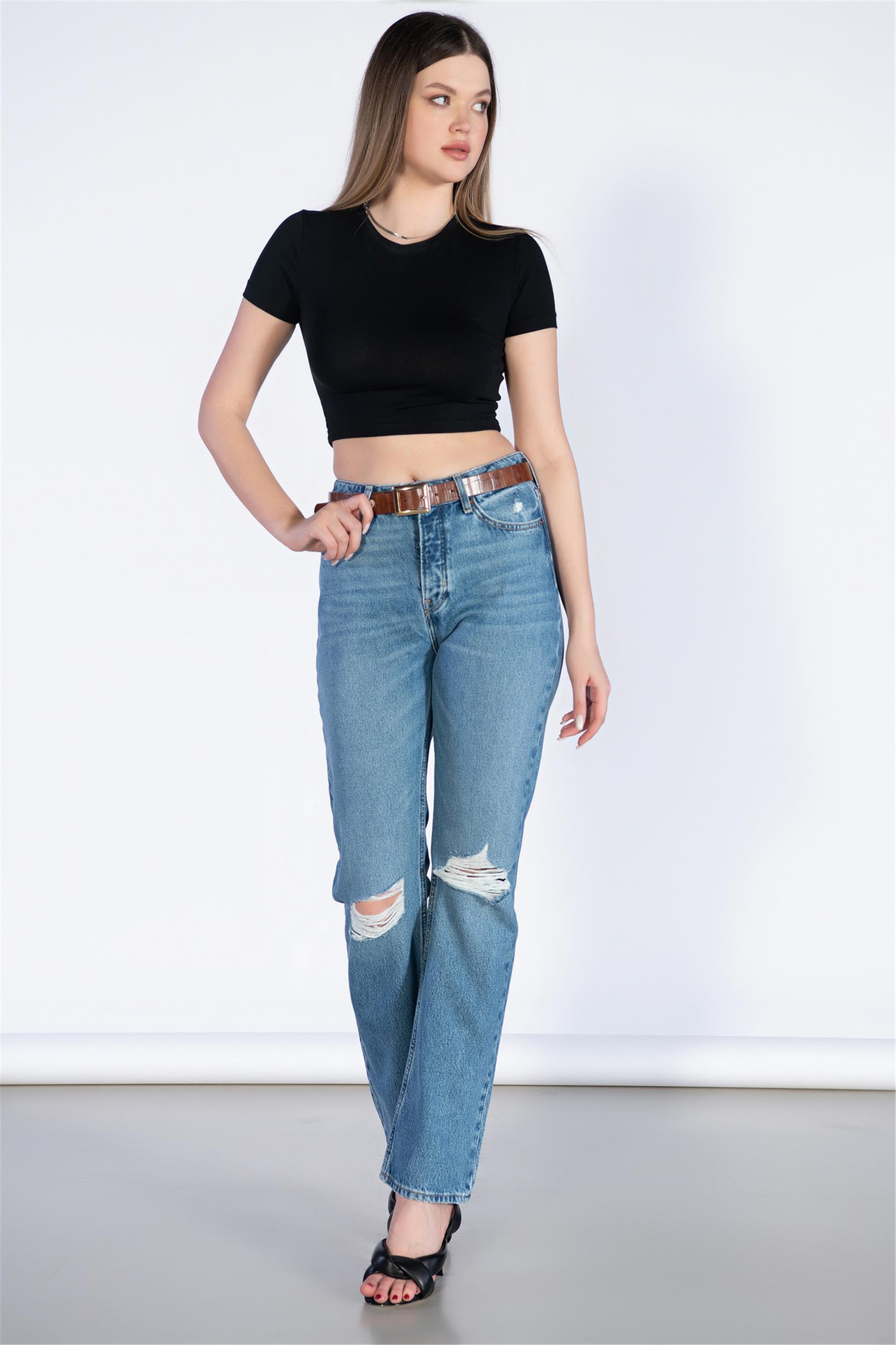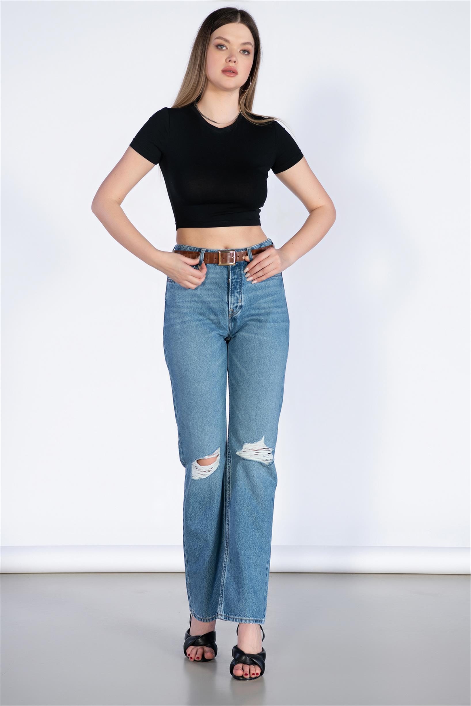 Mavi Yüksek Bel Diz Lazer Straight Jeans