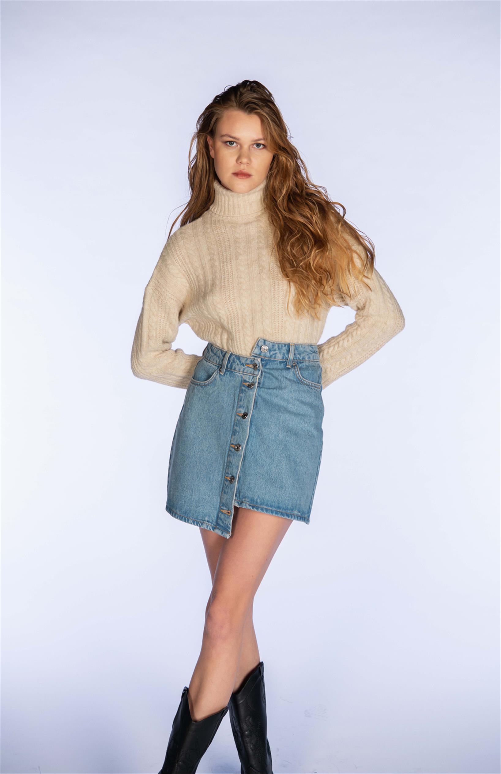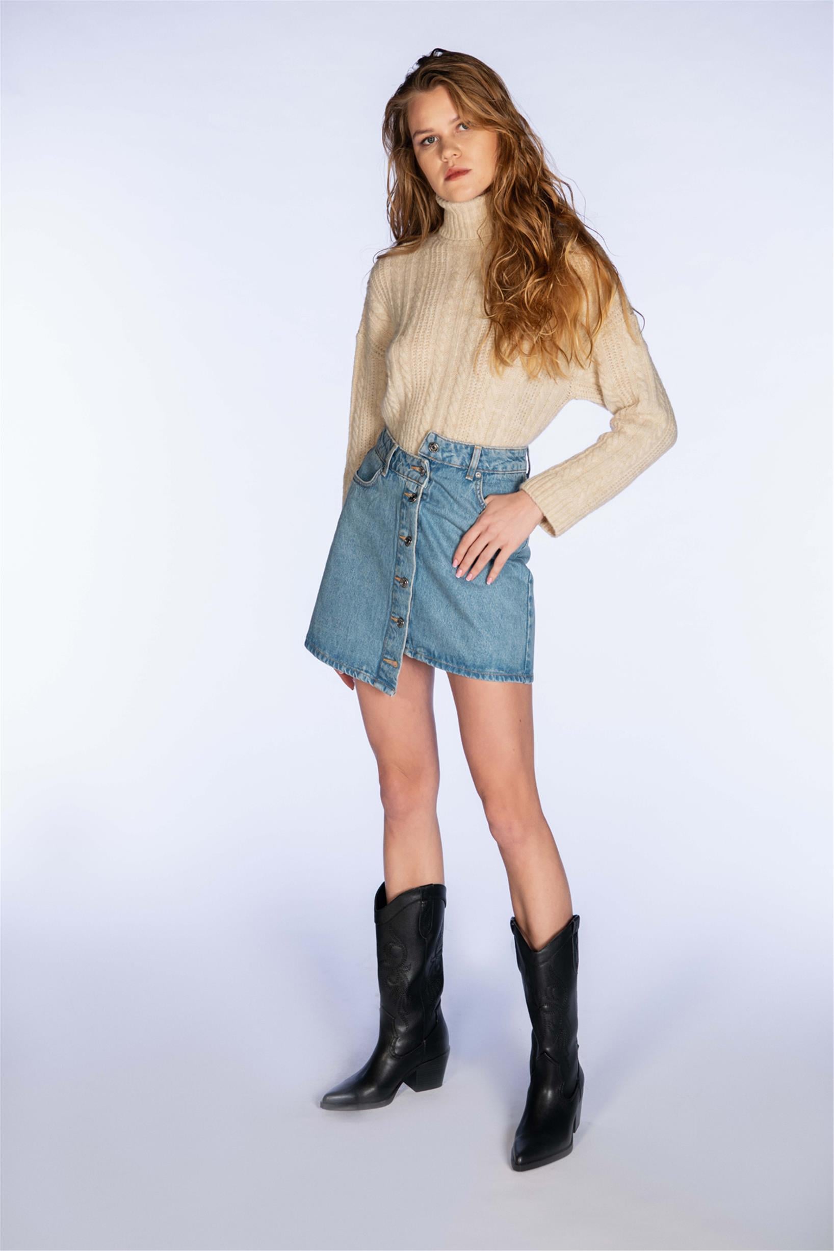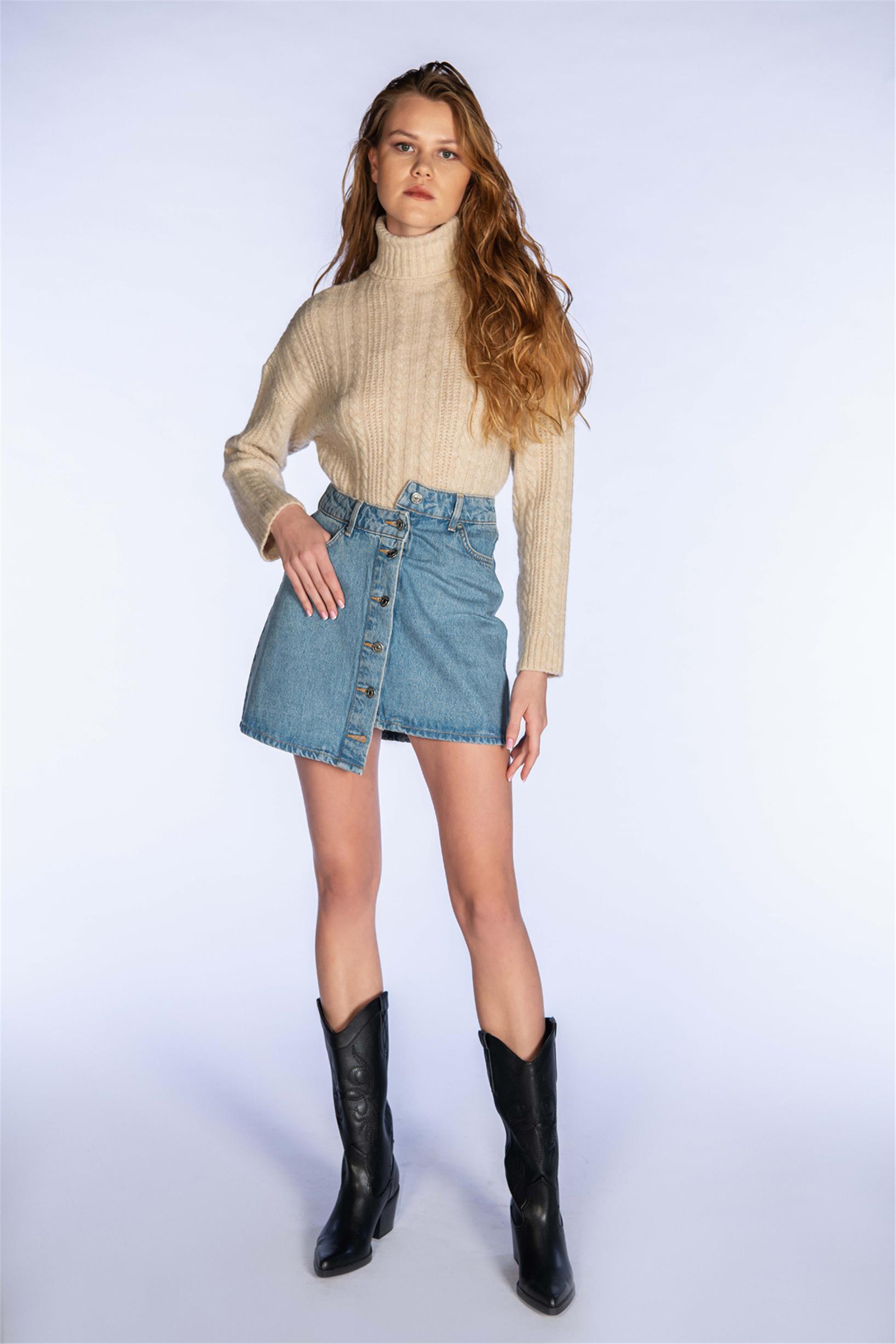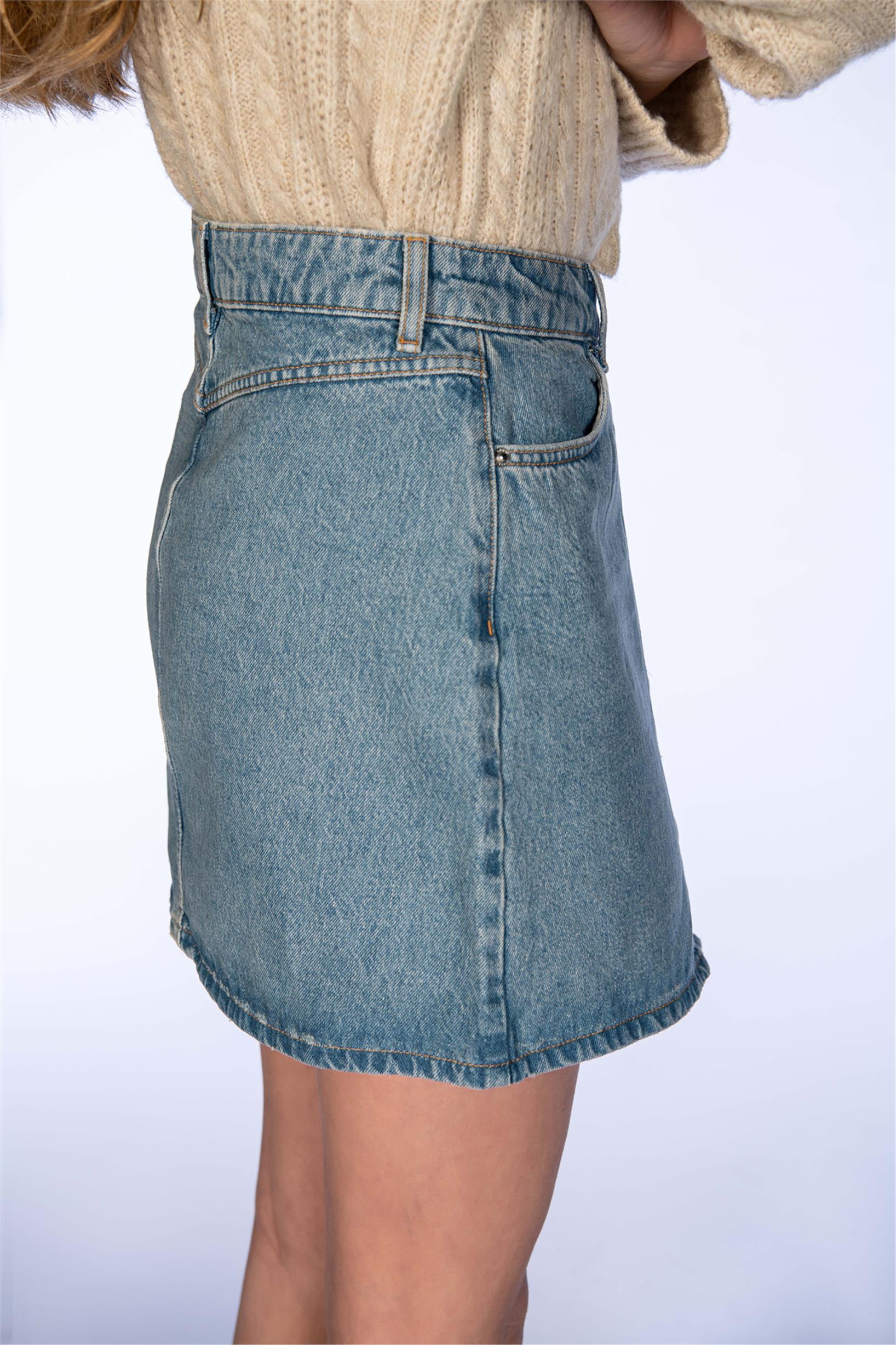Mavi Yüksek Bel Düğmeli Denim Mini Etek