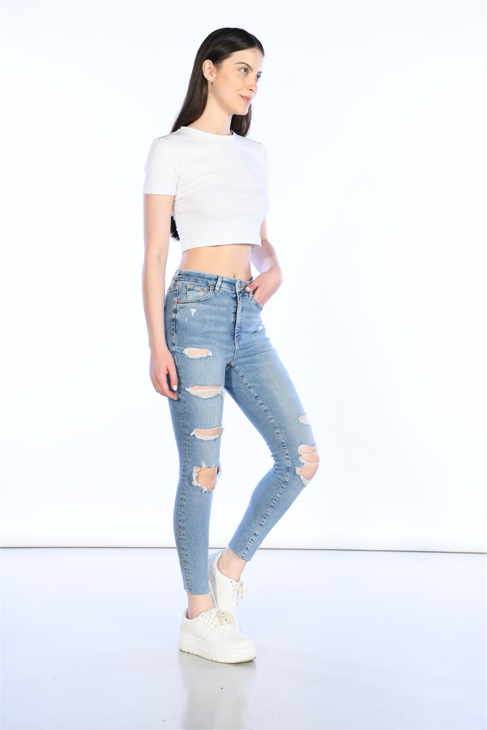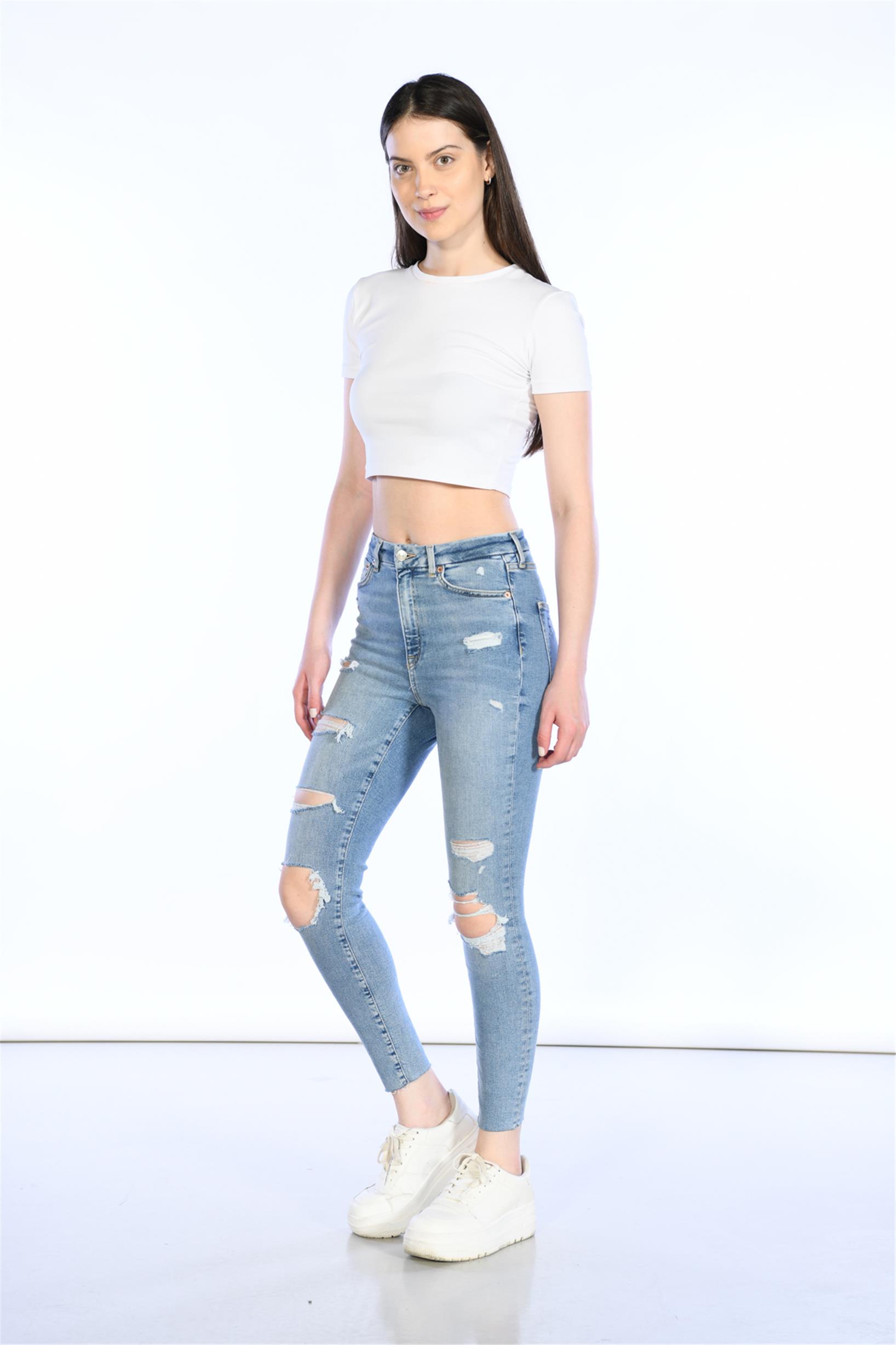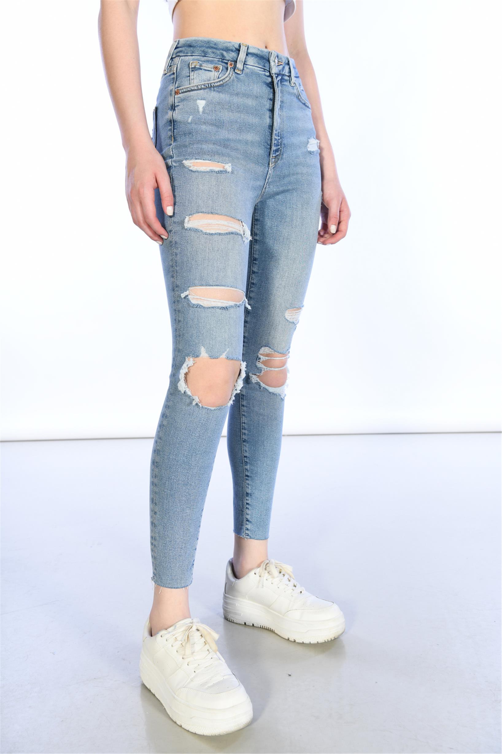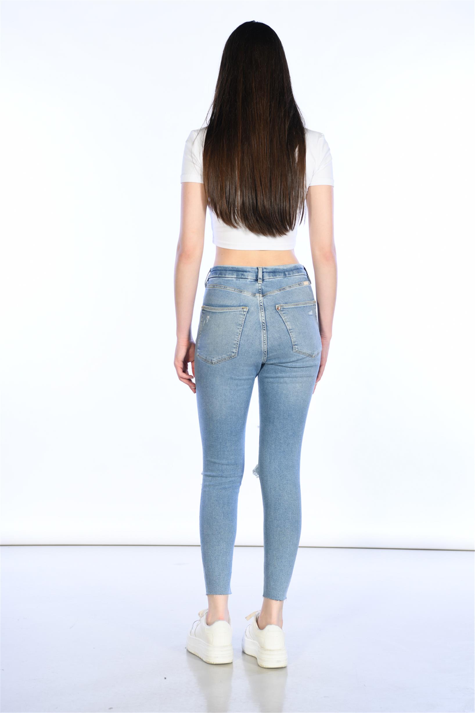 Mavi Yüksek Bel Lazer Detaylı Skinny Jeans