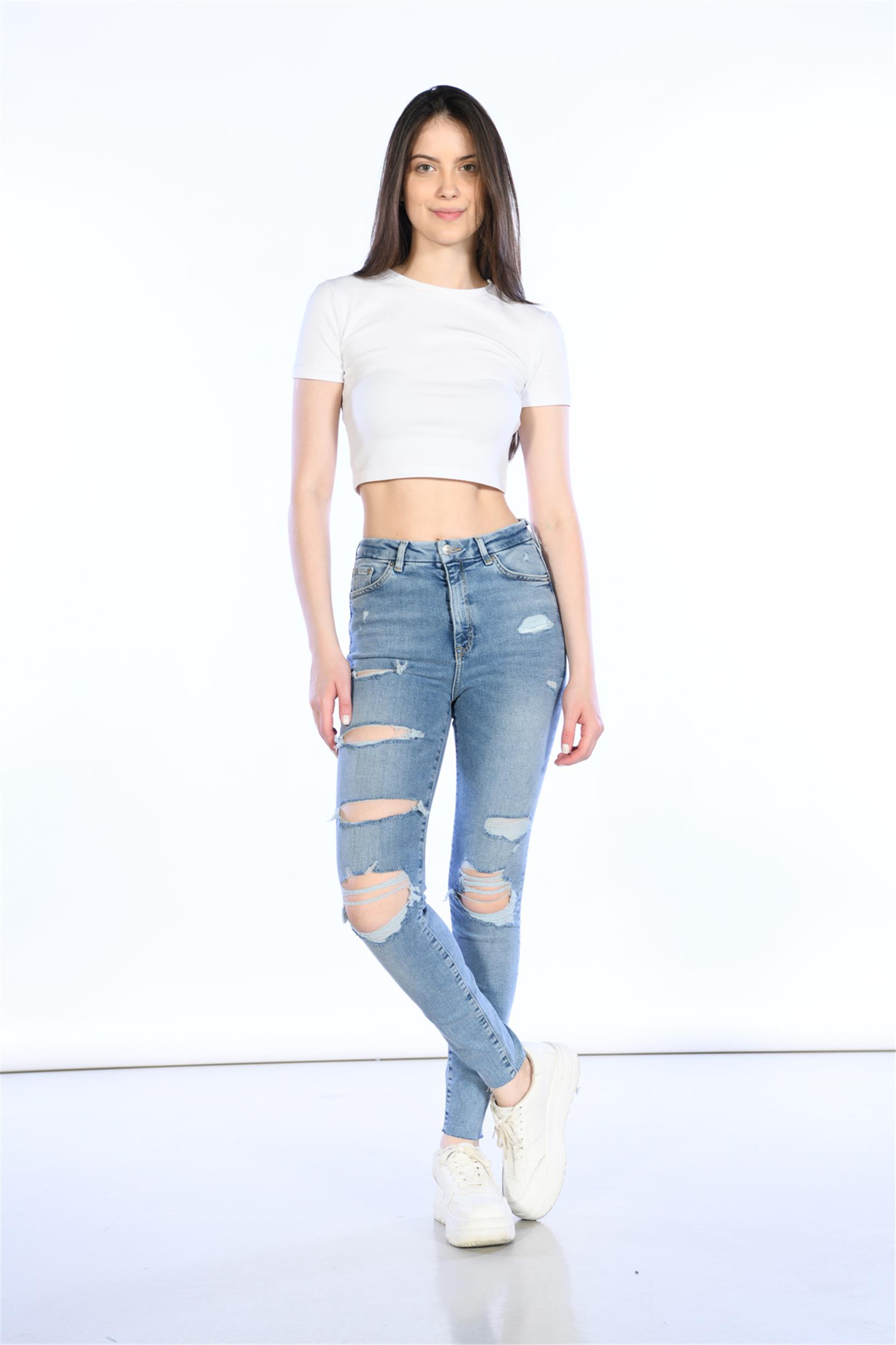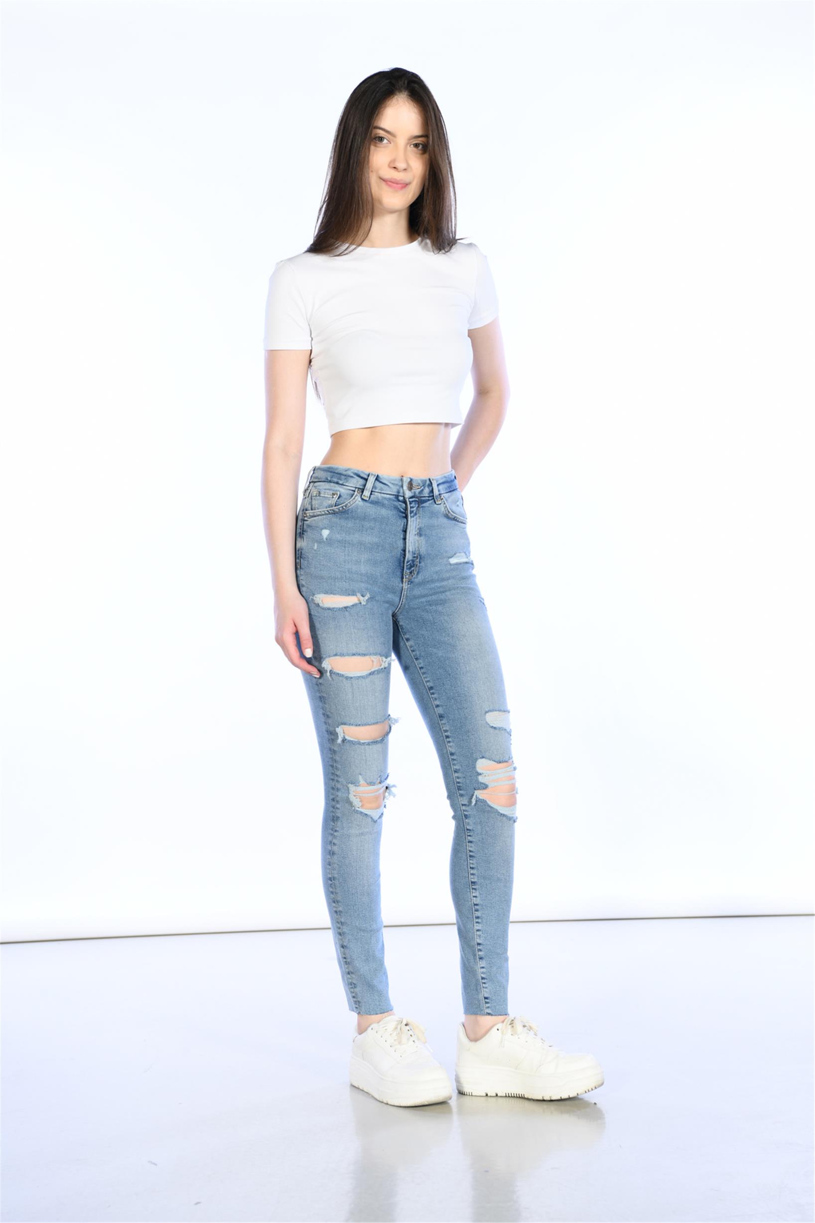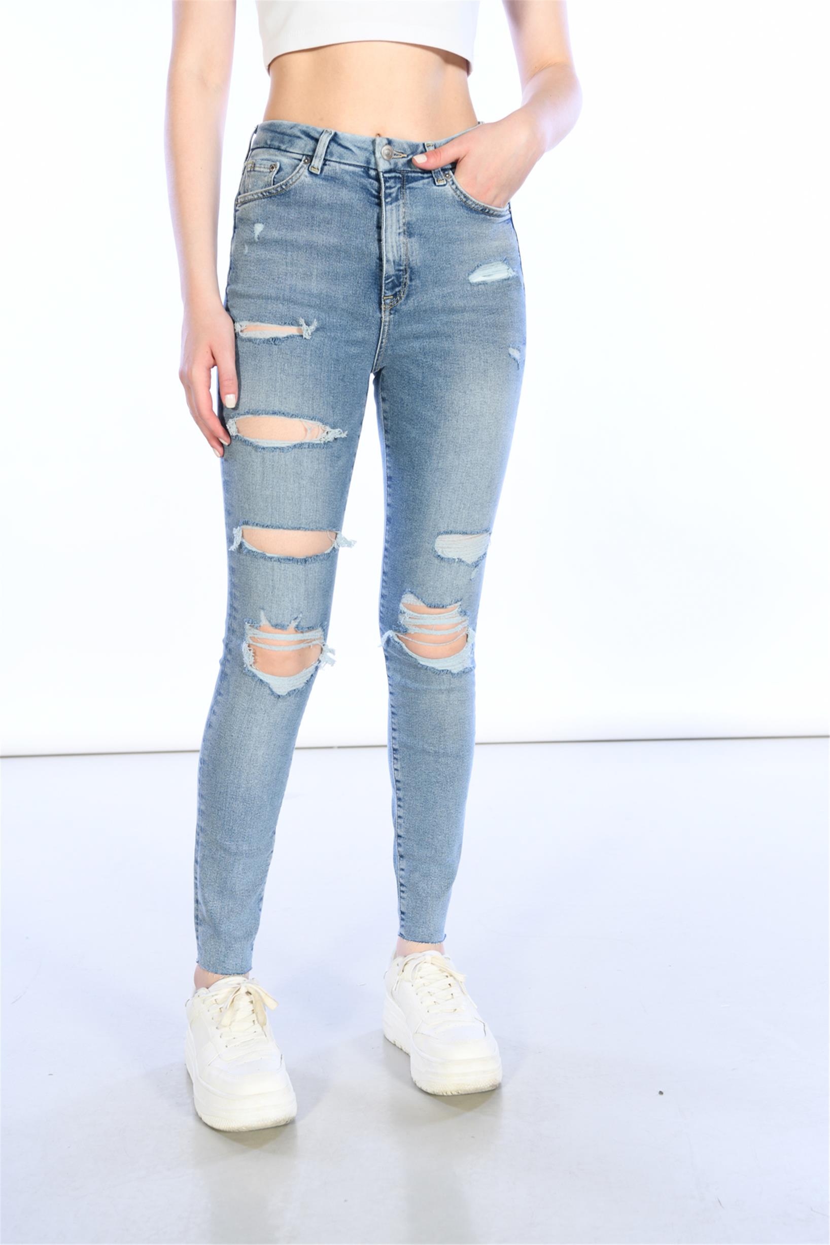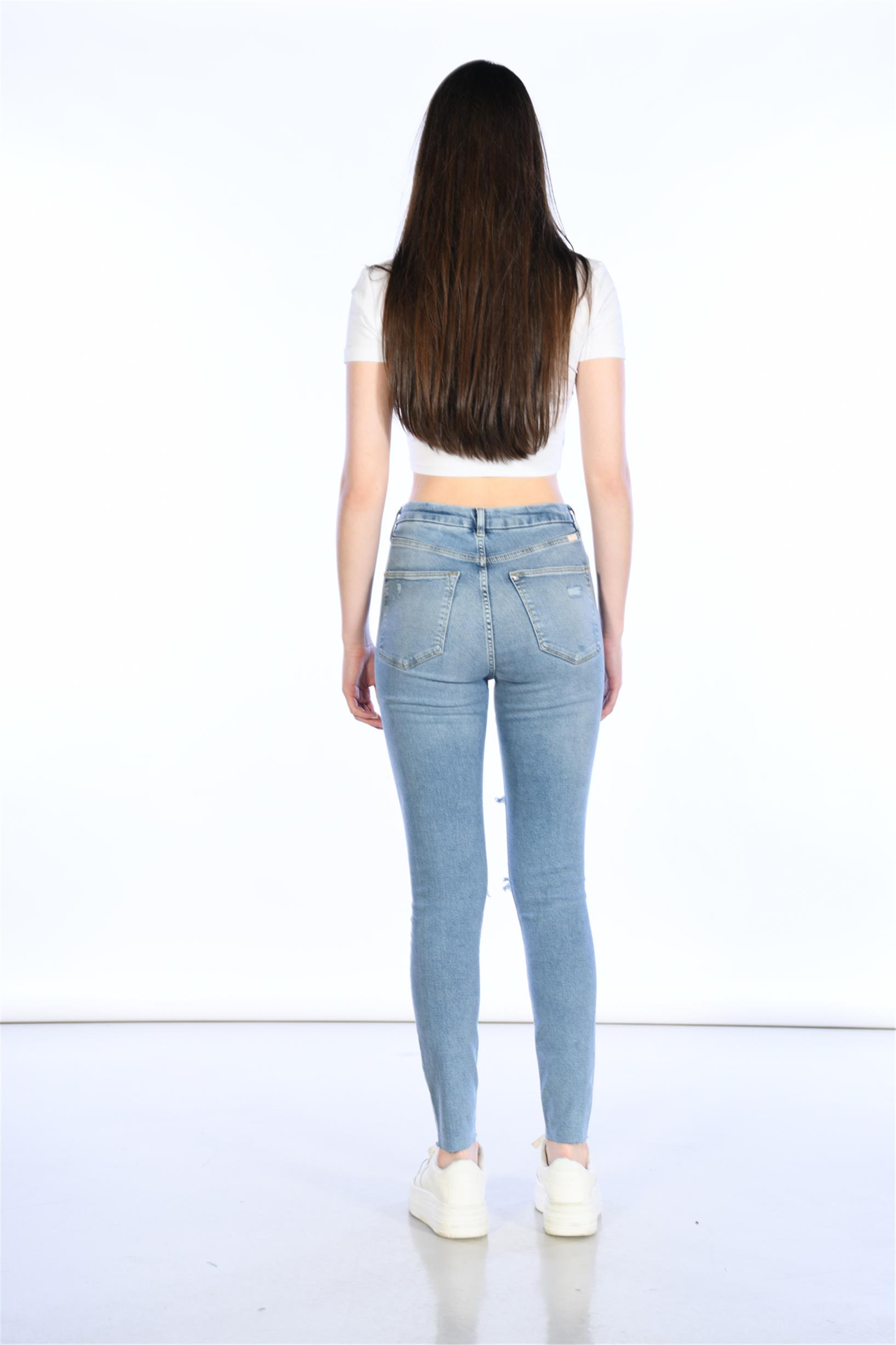 Mavi Yüksek Bel Lazer Detaylı Skinny Jeans