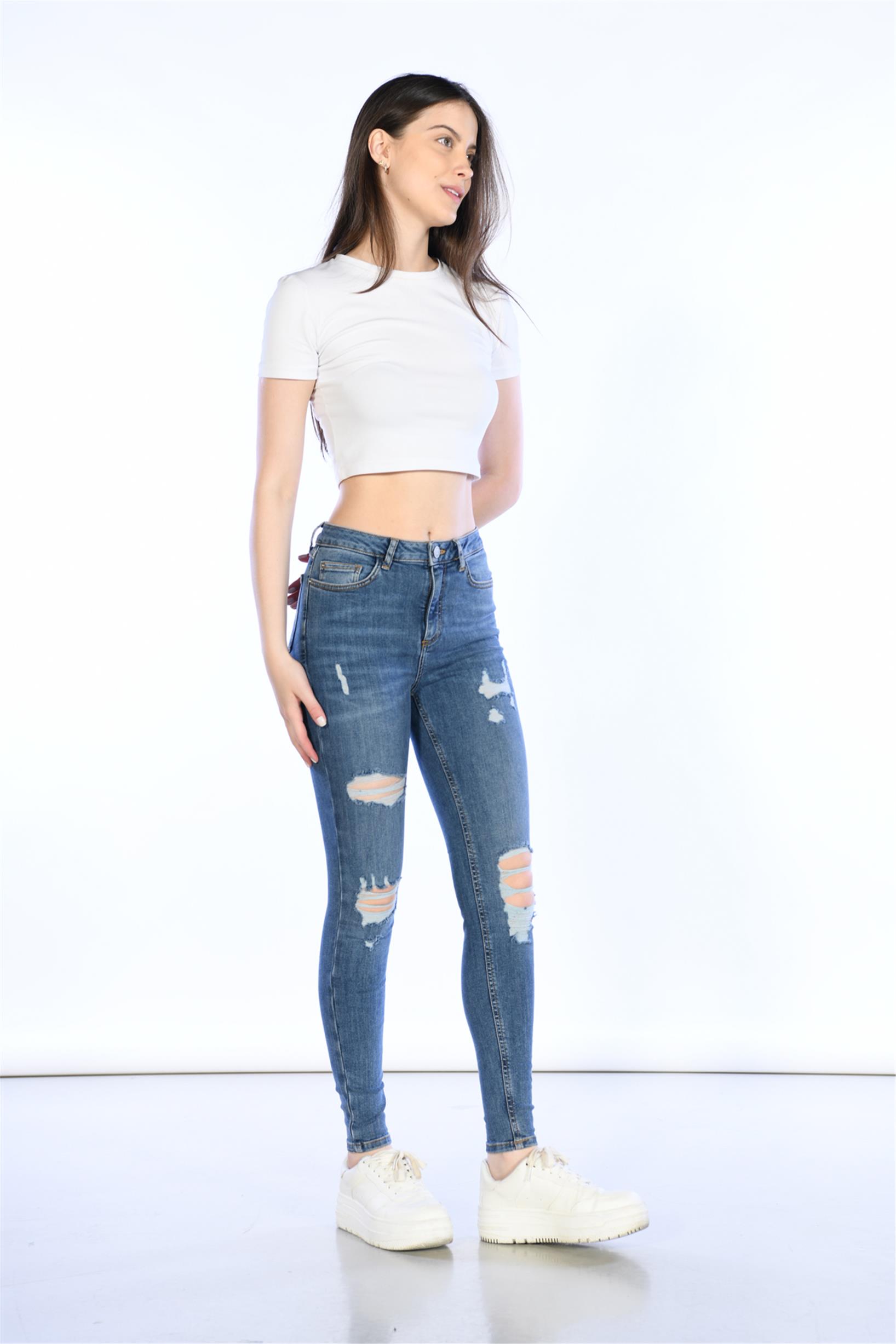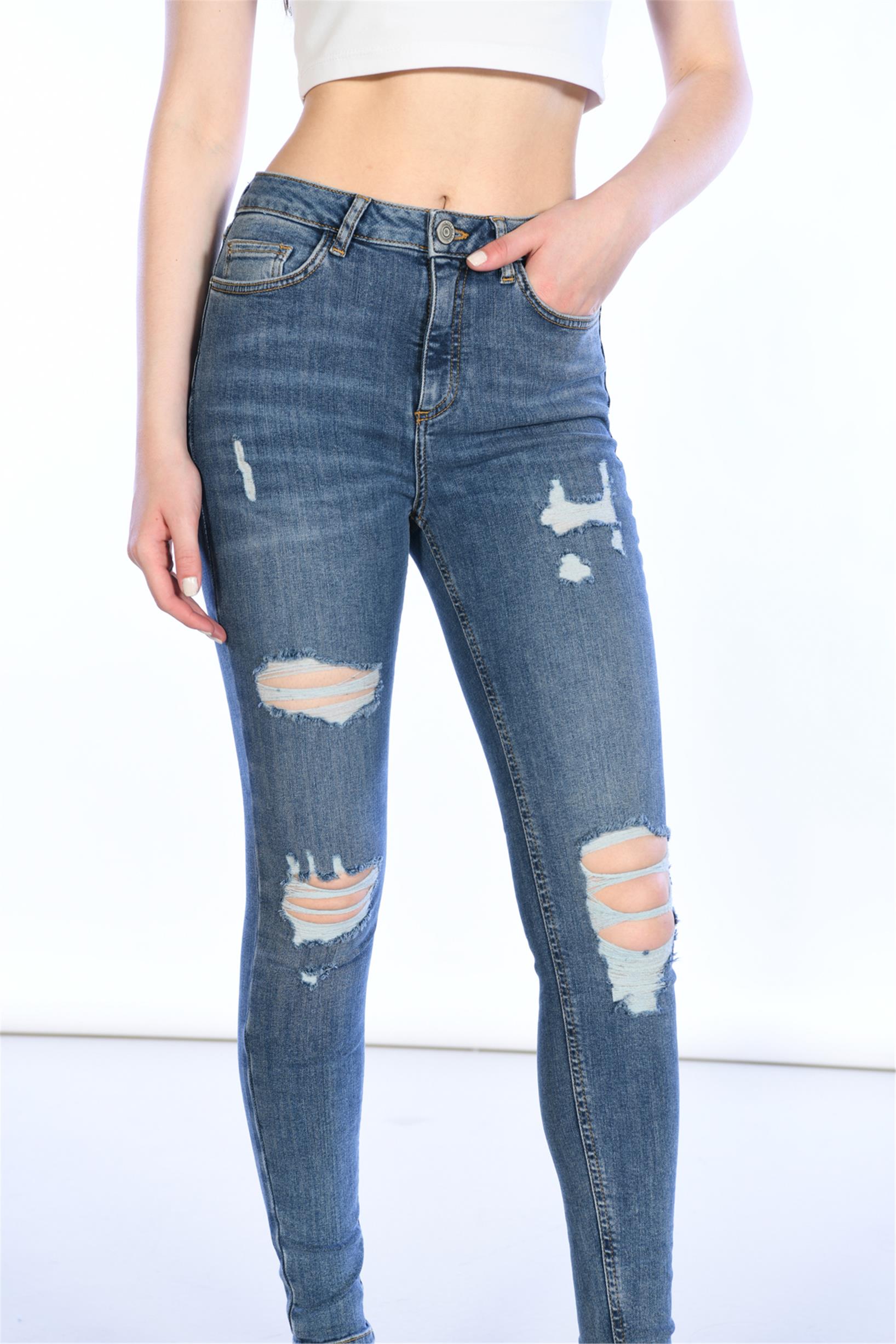 Mavi Yüksek Bel Lazer Detaylı Skinny Jeans